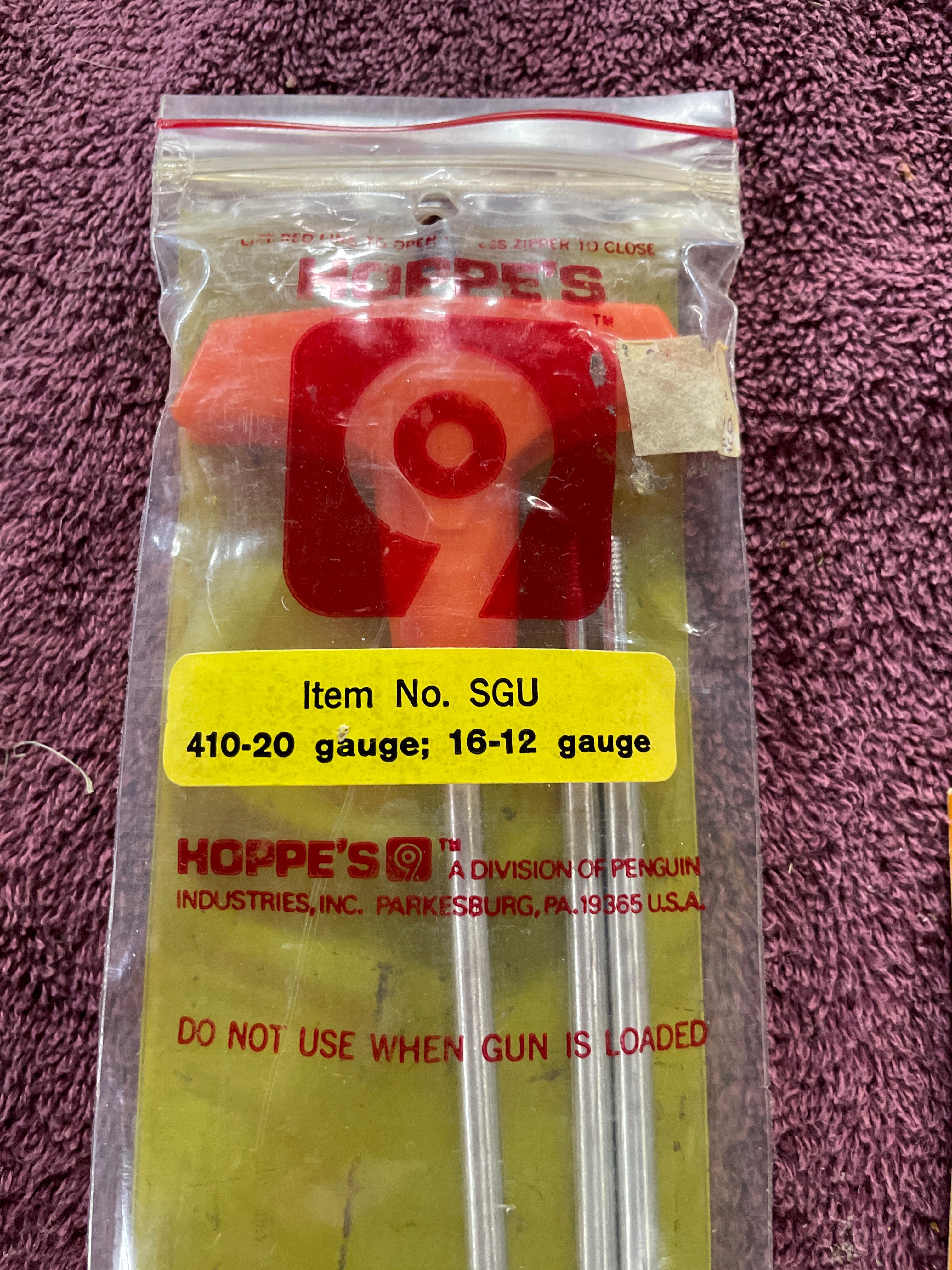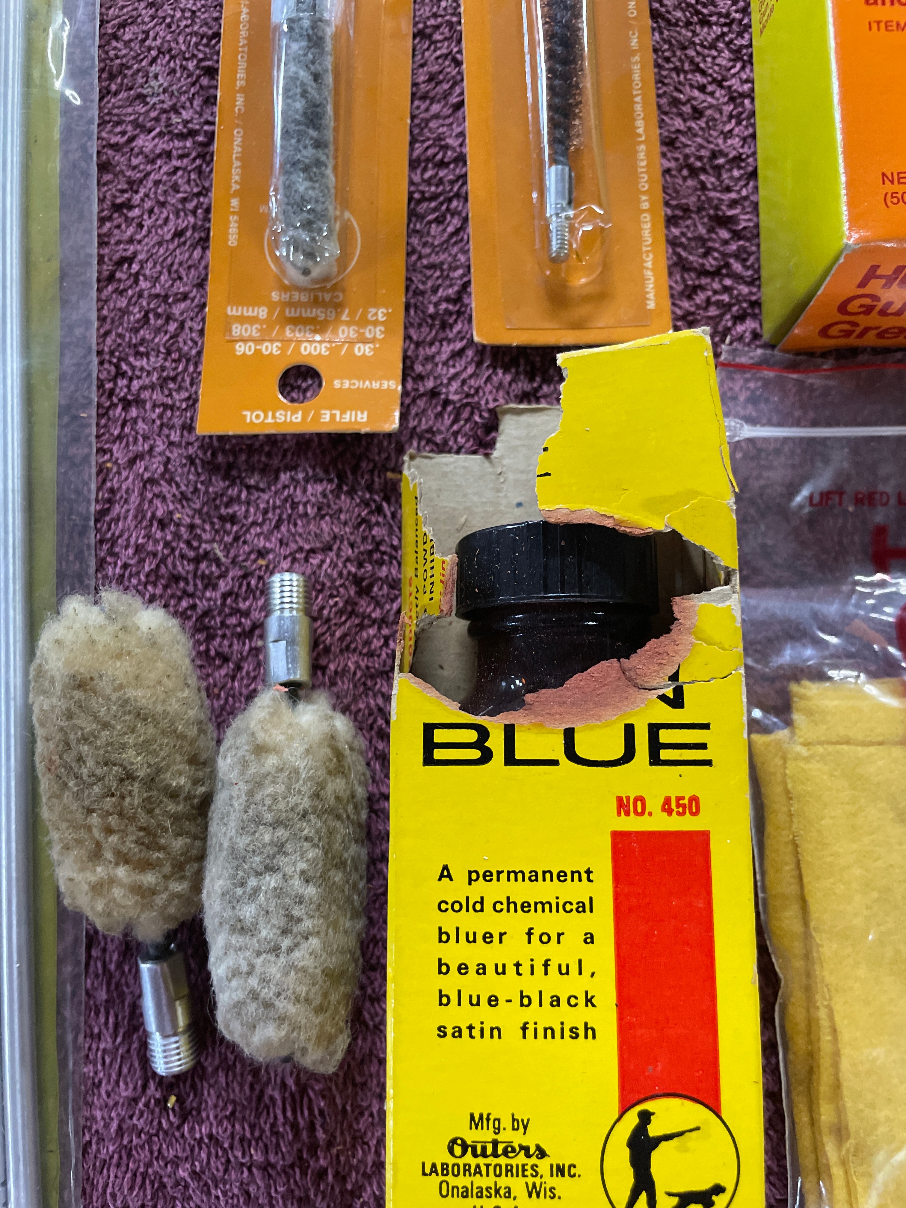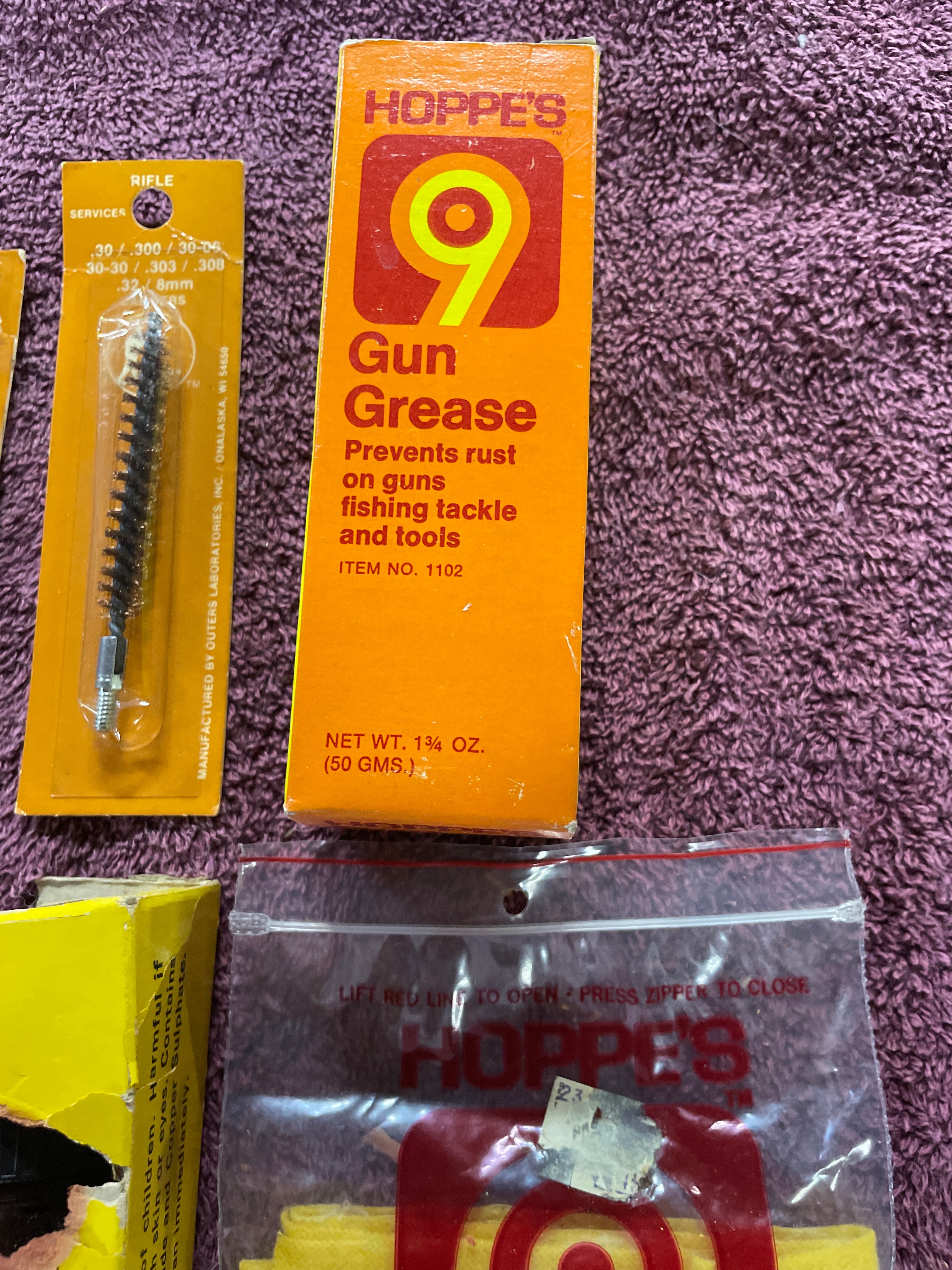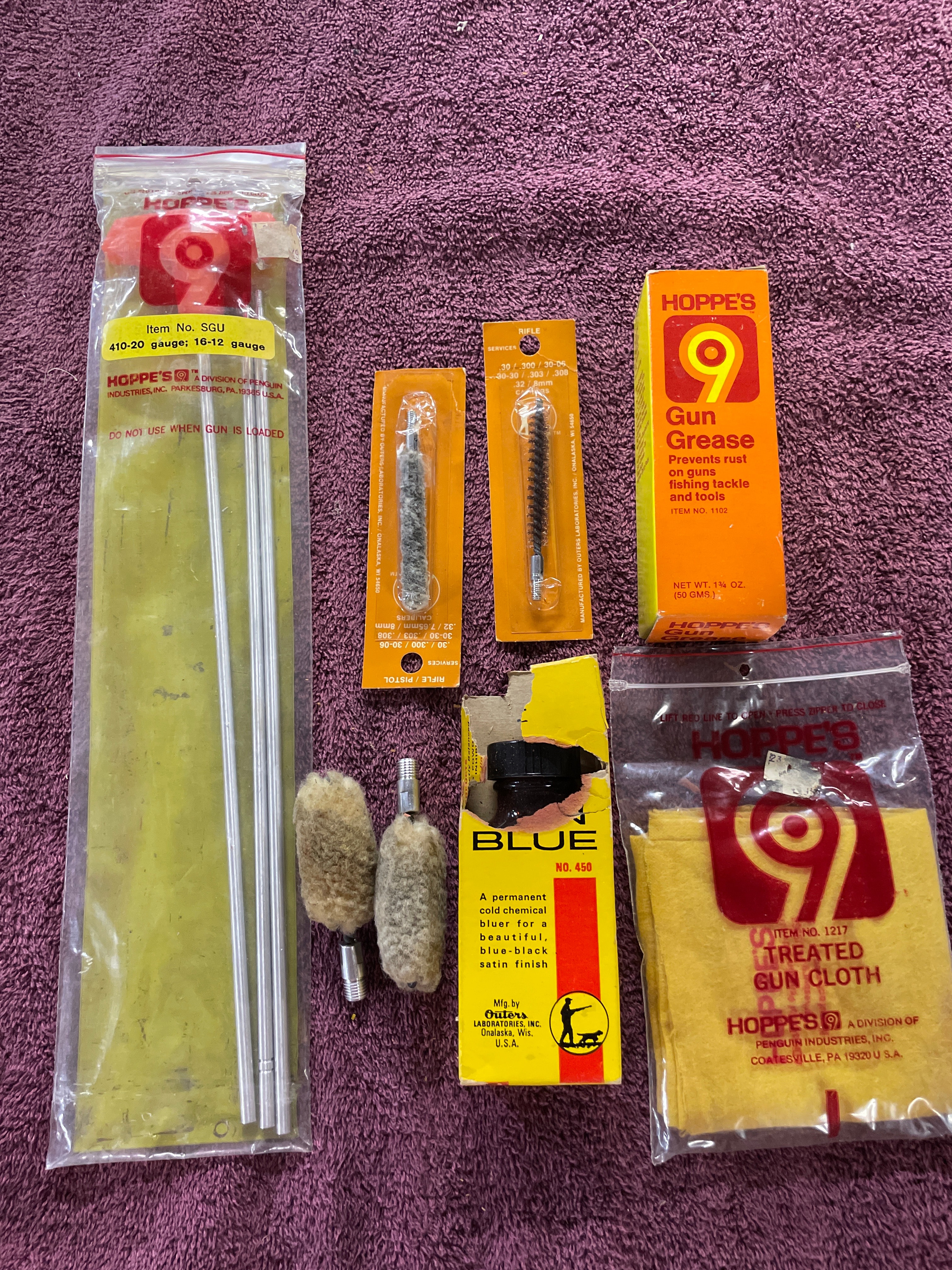 A collection of Hoppe’s gun cleaning supplies including rods (410-20 gauge; 16-12 gauge), bore brushes, Hoppe’s 9 gun grease (1¾ oz.), Outers No. 450 gun blue, and a Hoppe’s 9 treated gun cloth.