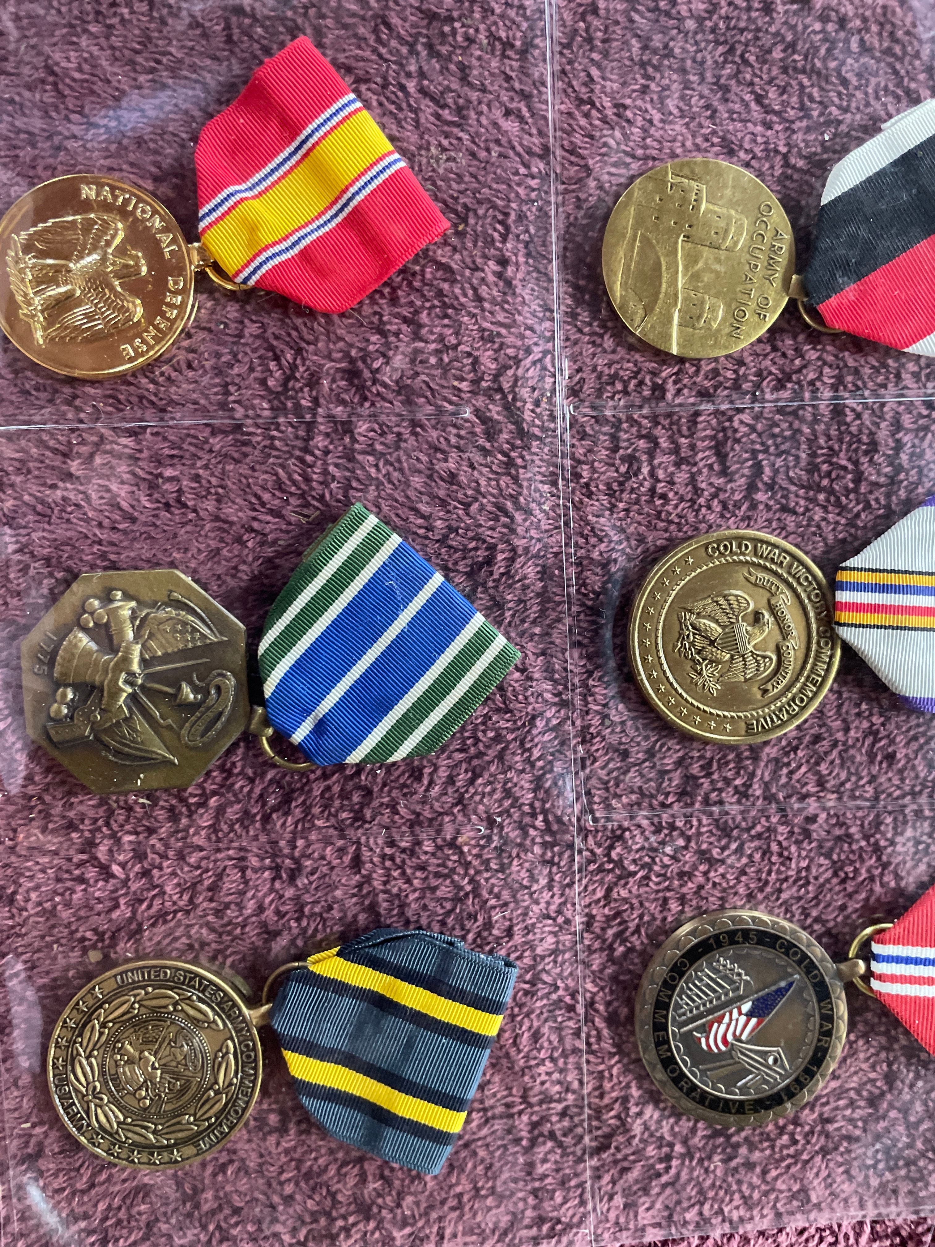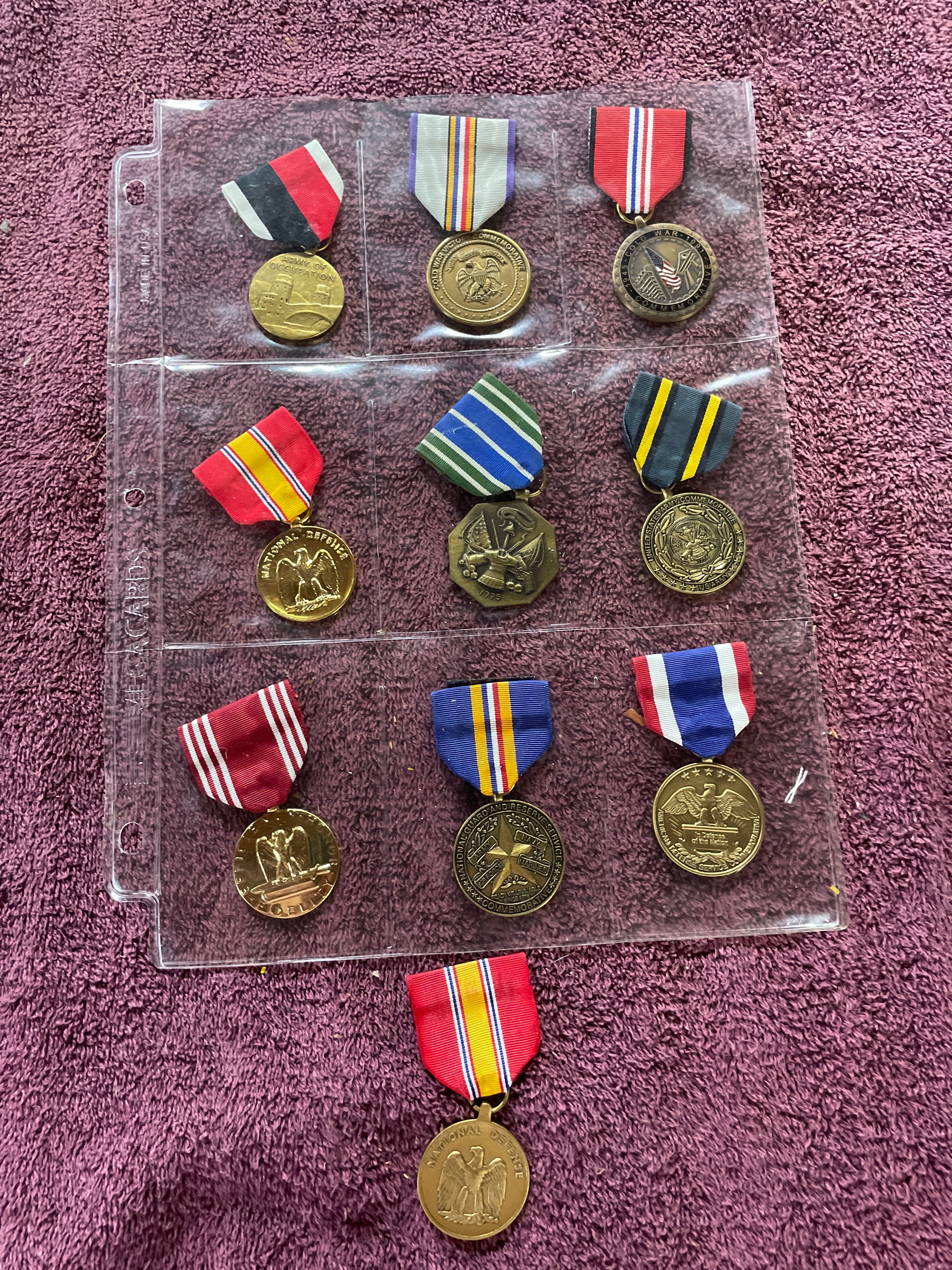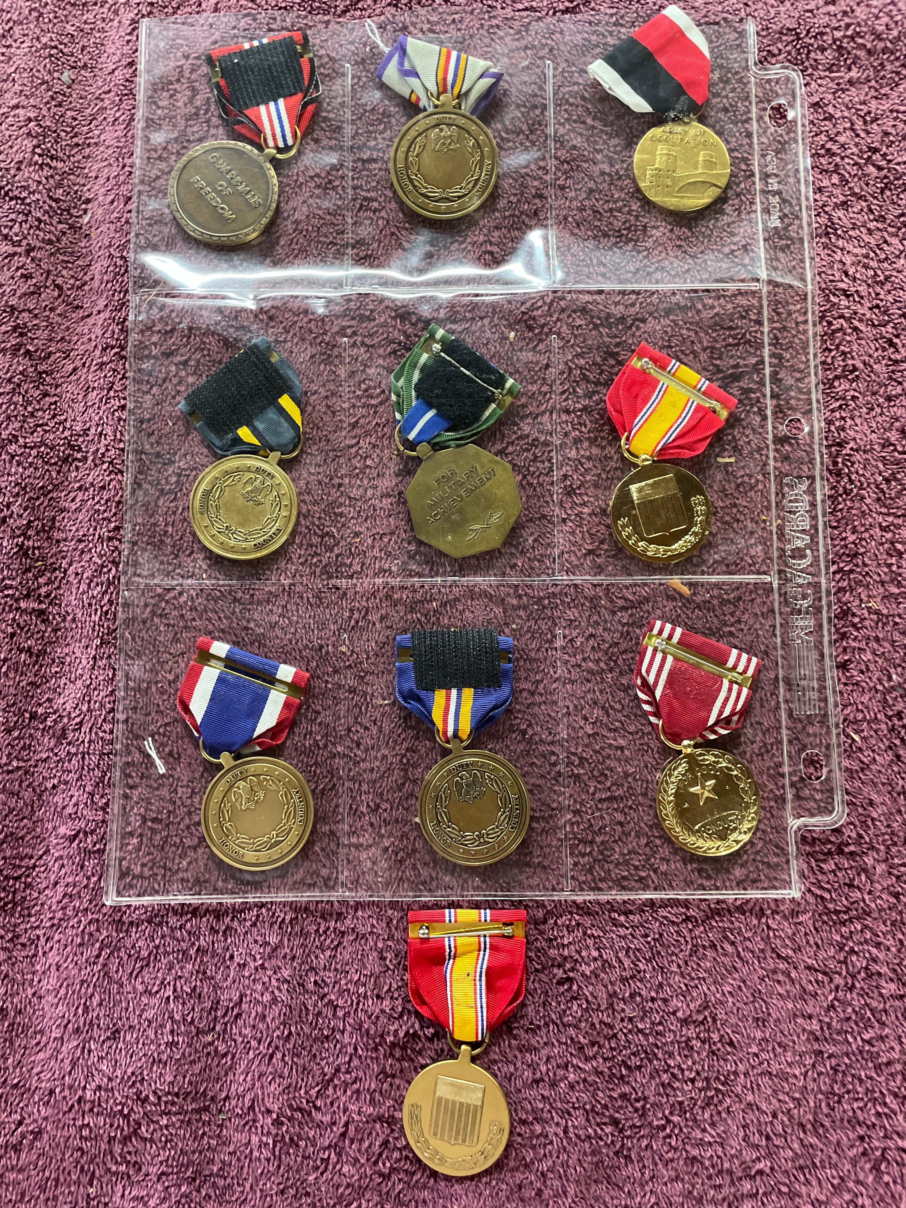 A collection of thirteen US military medals, each with a bronze medallion and a colorful ribbon, displayed in a plastic holder.