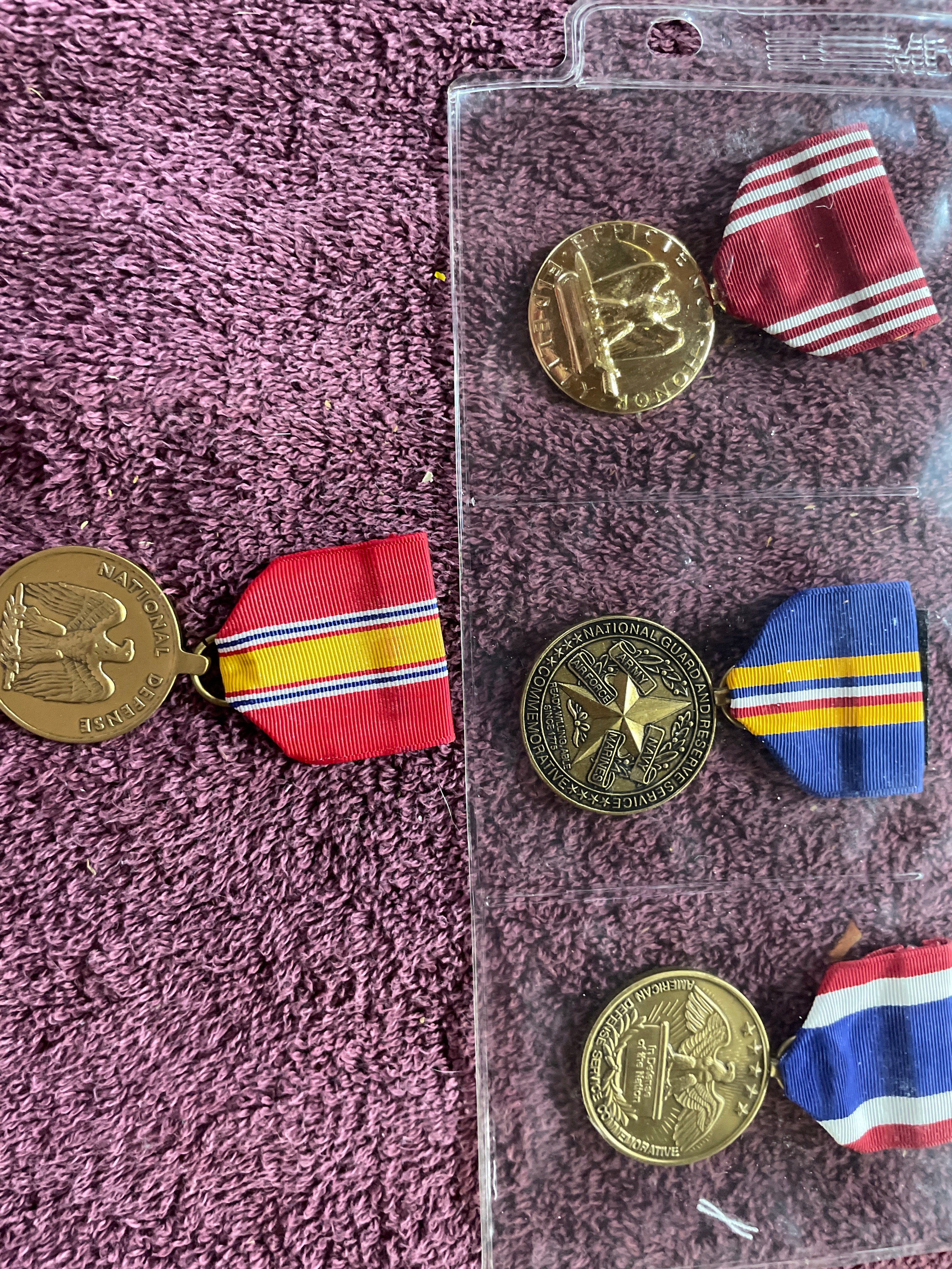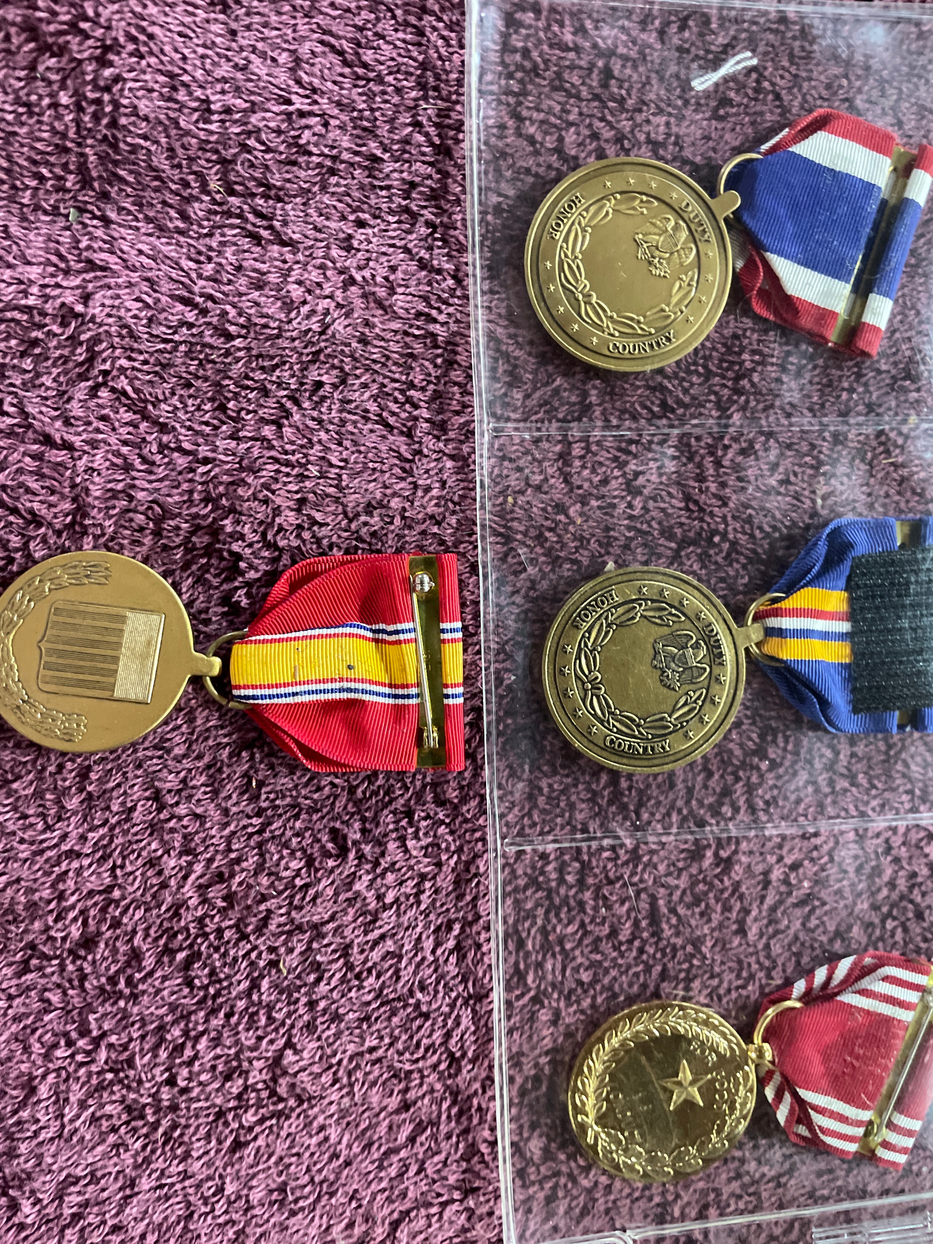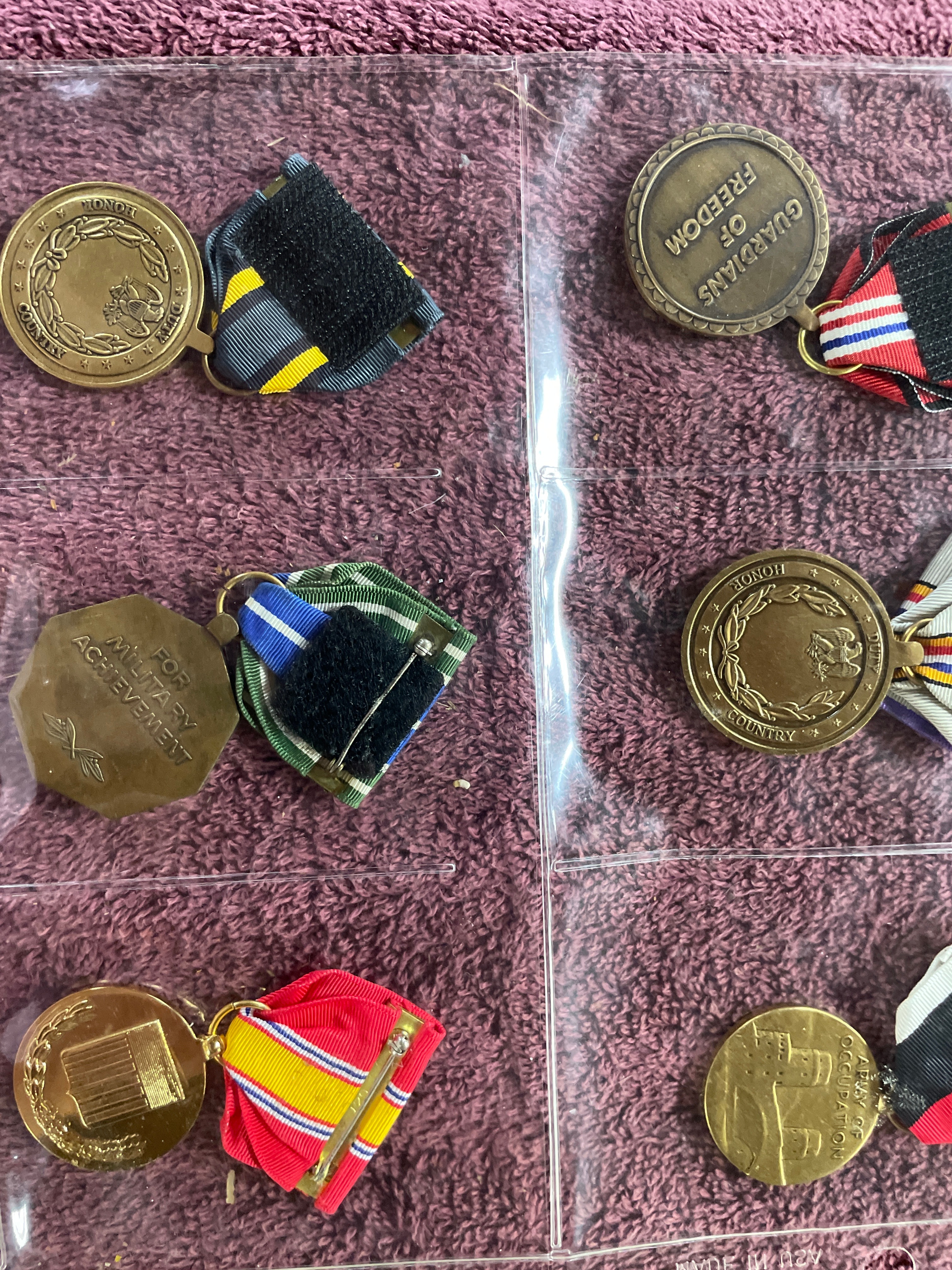 A collection of thirteen US military medals, each with a bronze medallion and a colorful ribbon, displayed in a plastic holder.