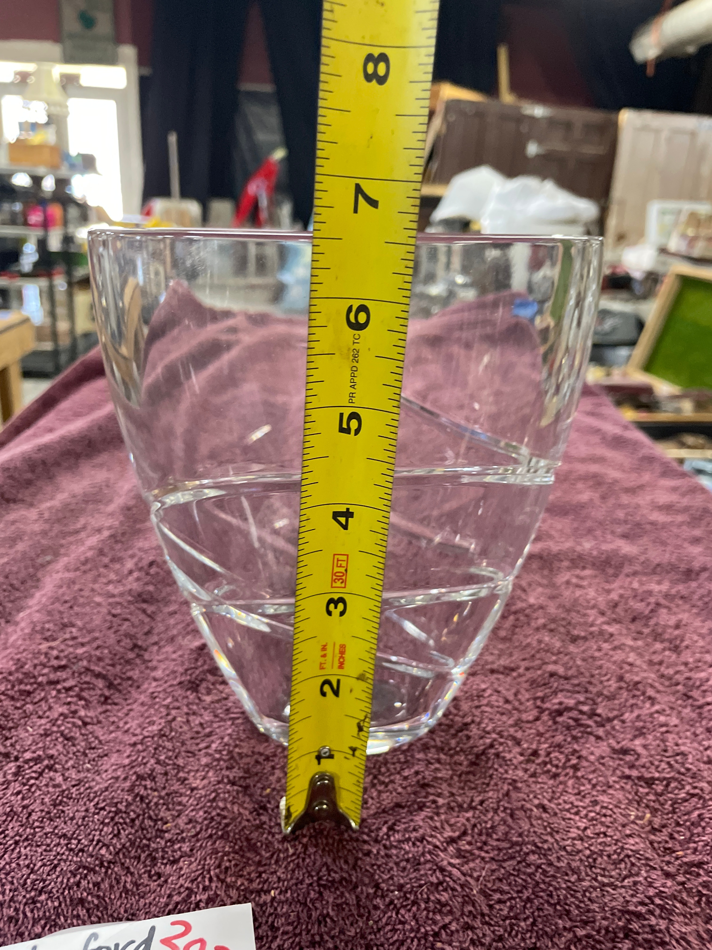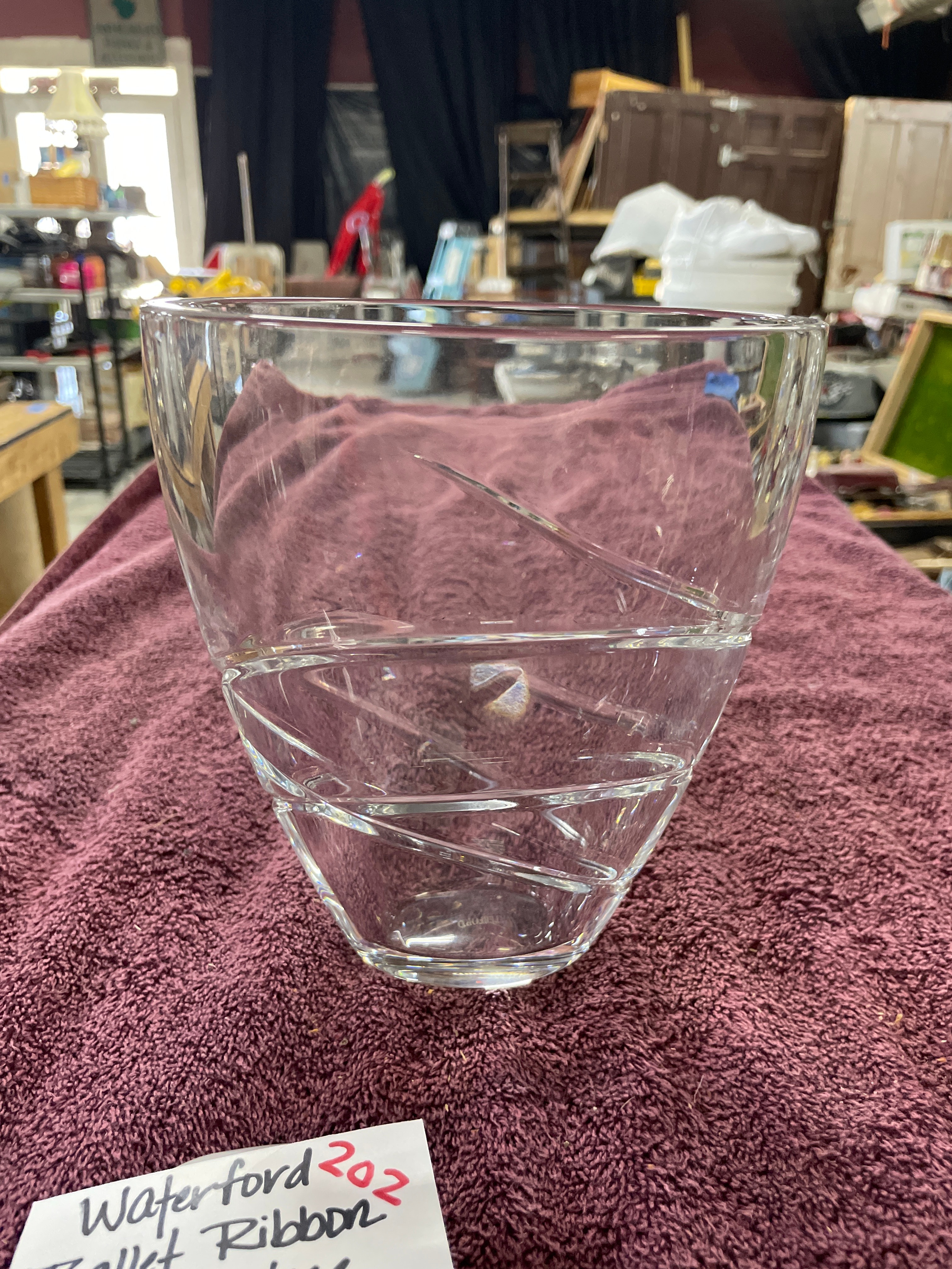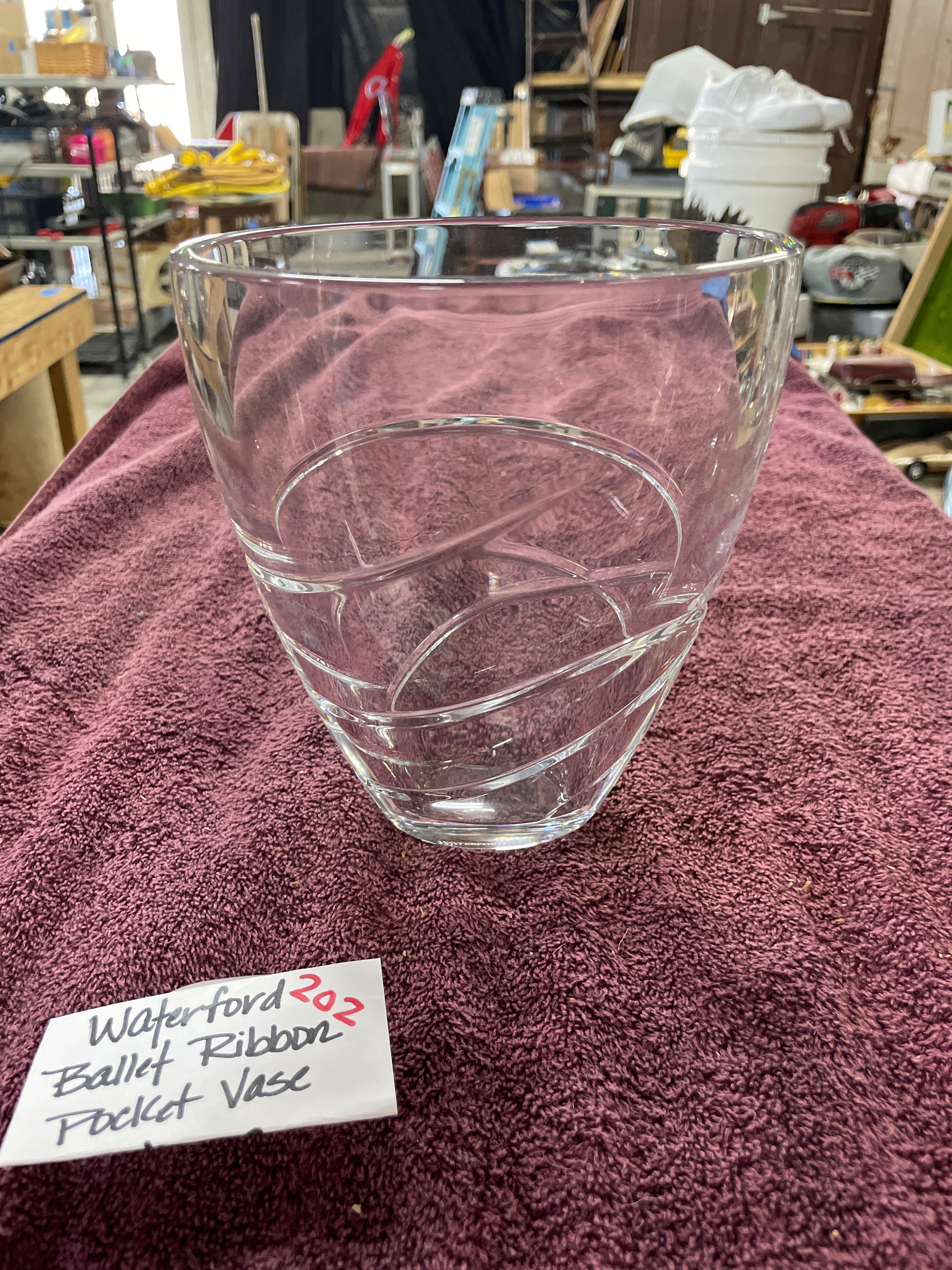A clear crystal Waterford Ballet Ribbon Pocket Vase, measuring approximately 6.5 inches tall.