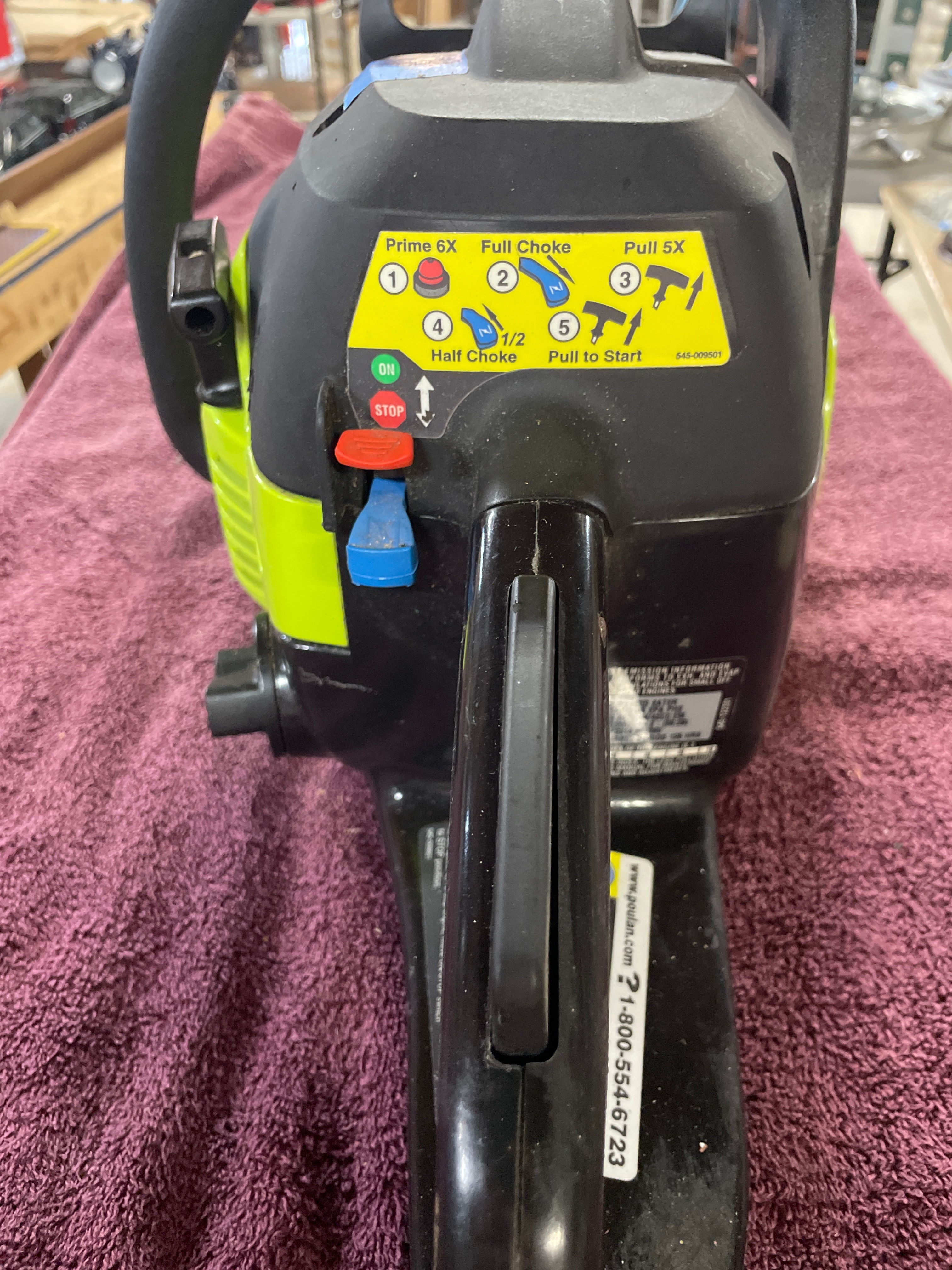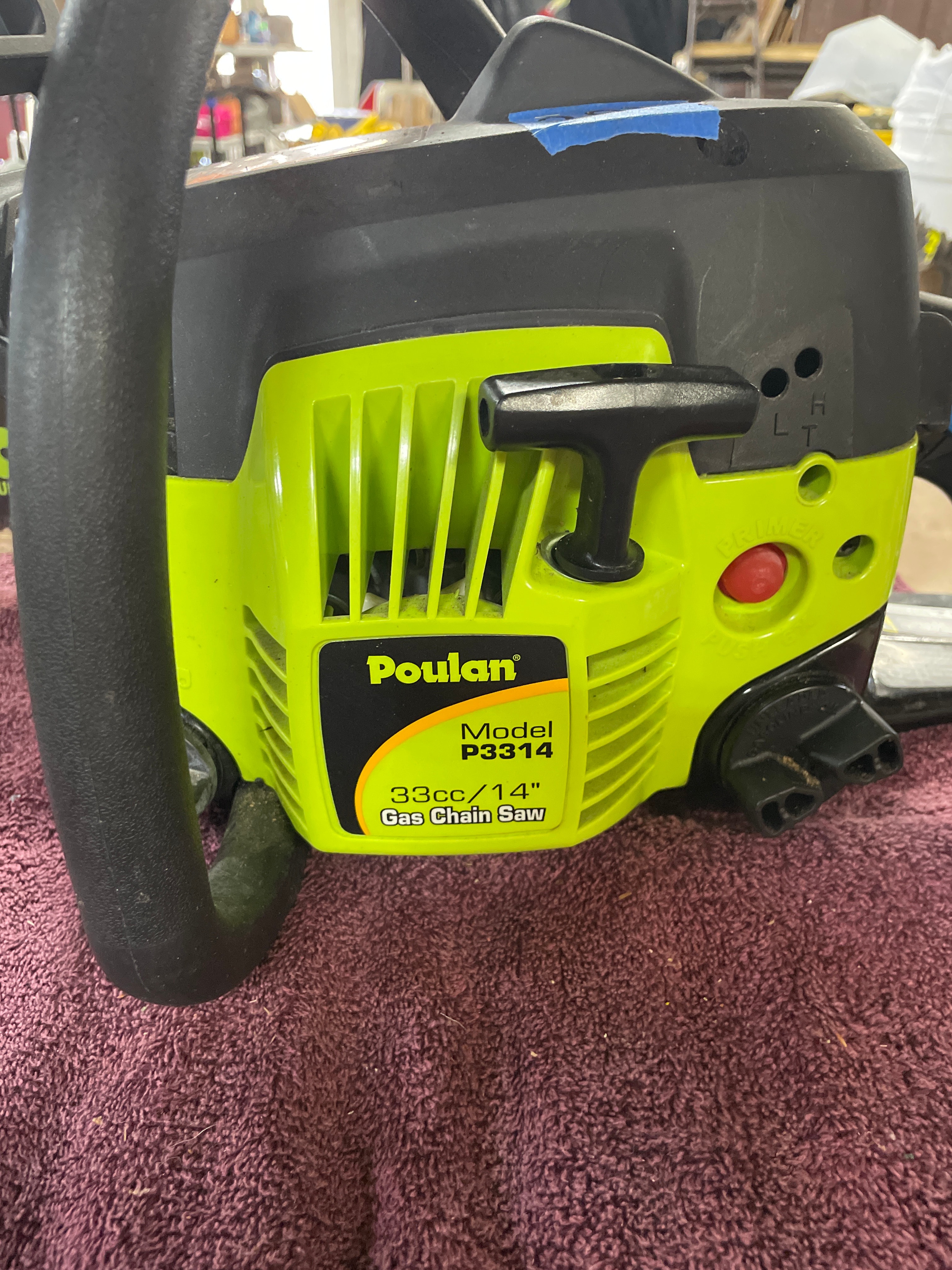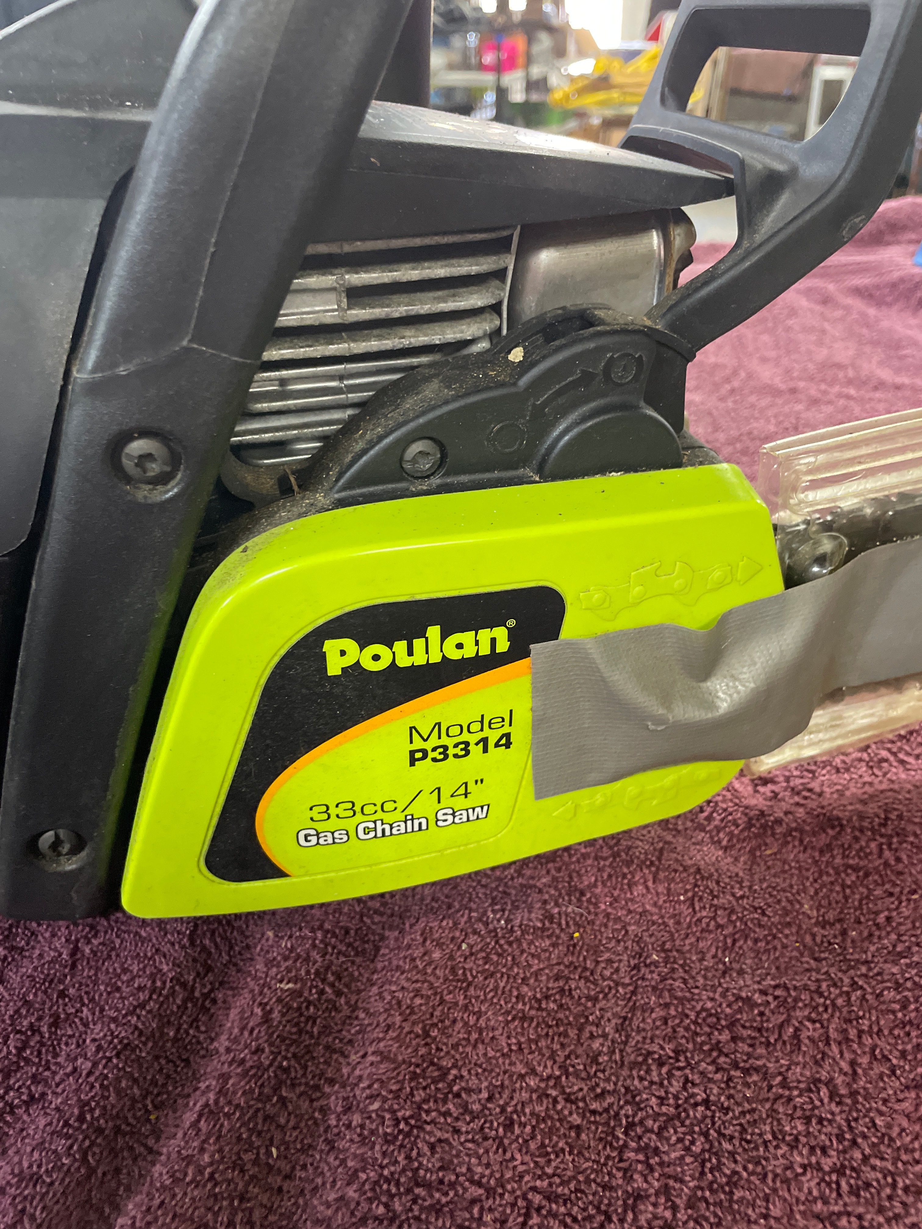 A black and lime green Poulan Model P3314 33cc/14″ Gas Chain Saw with 14″ Reduced Kickback Guide Bar.