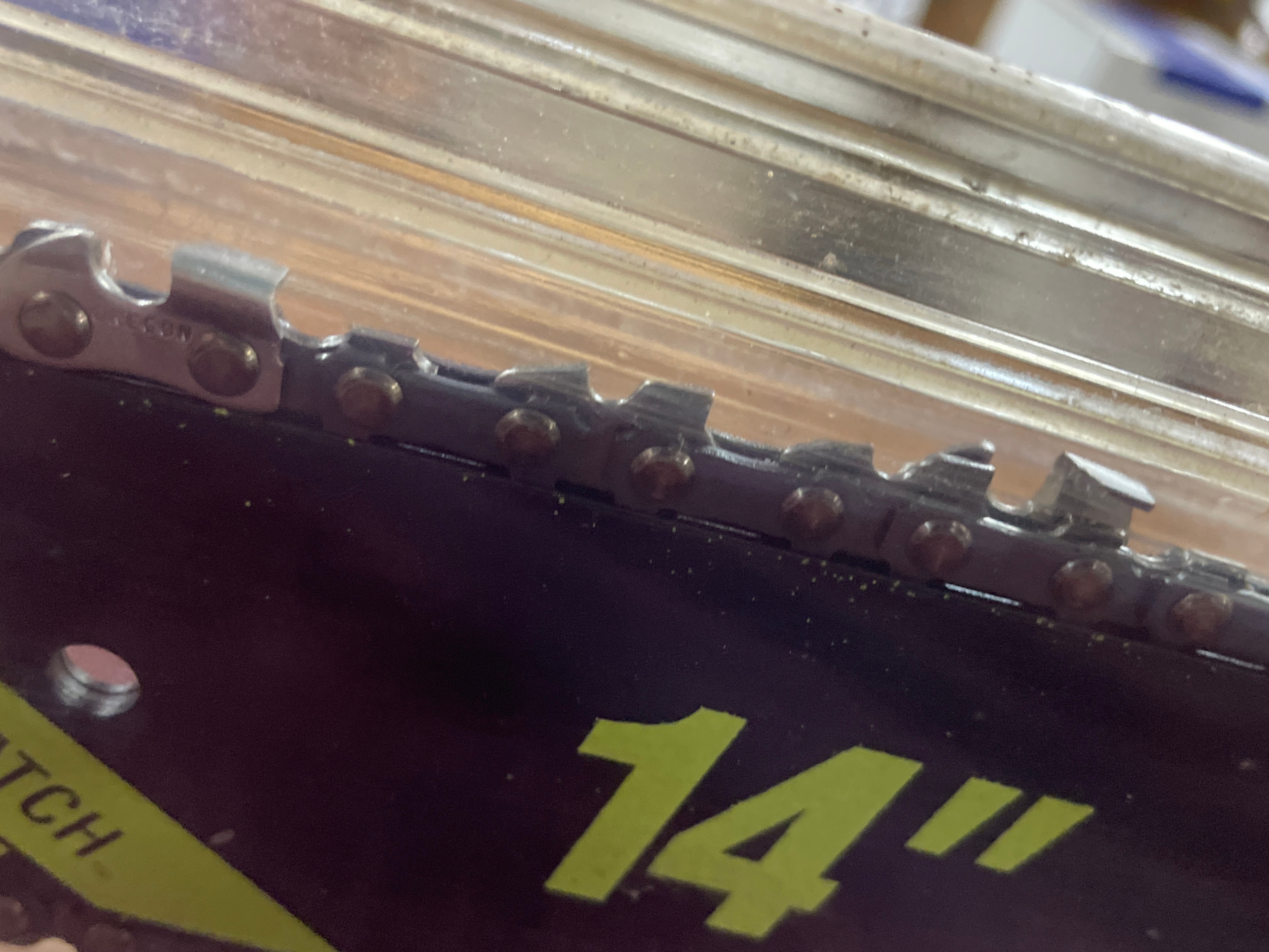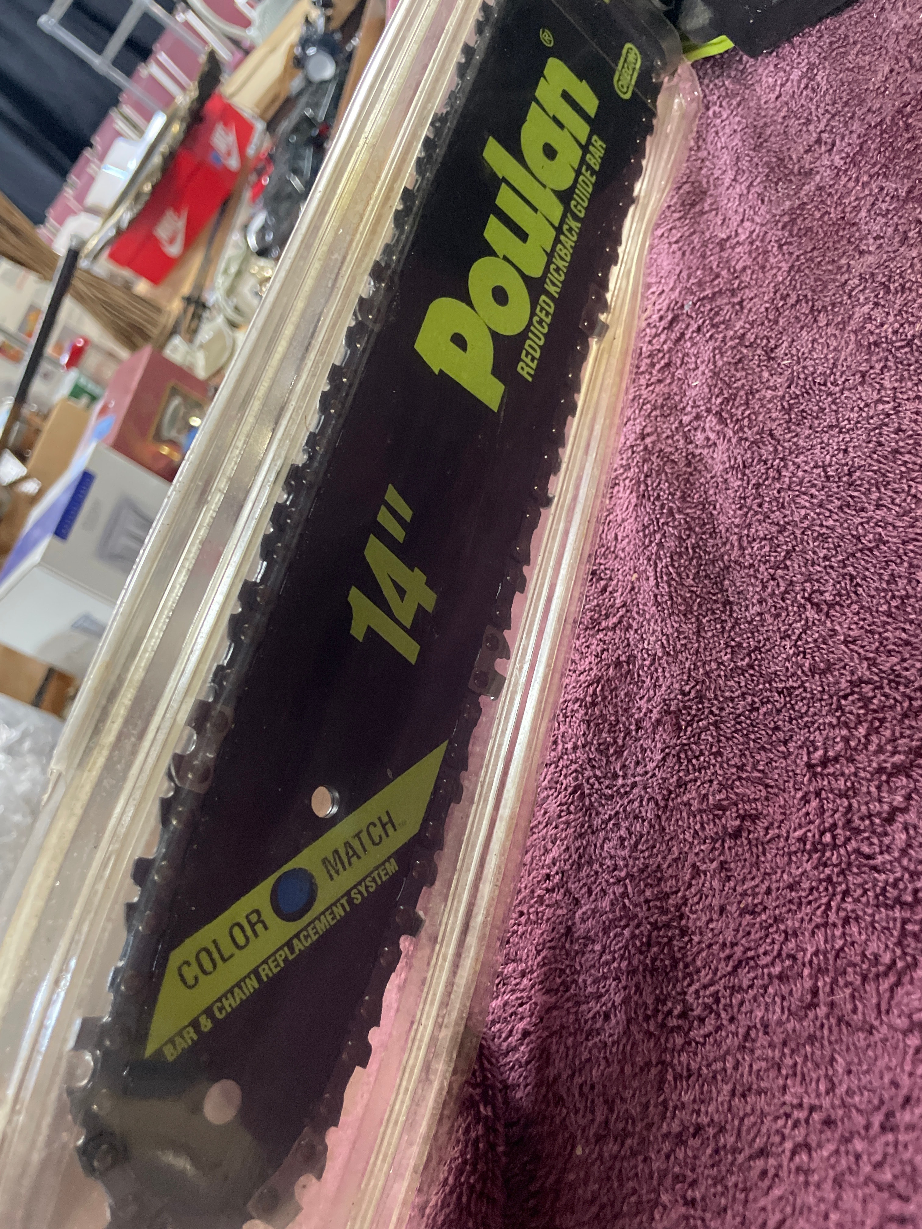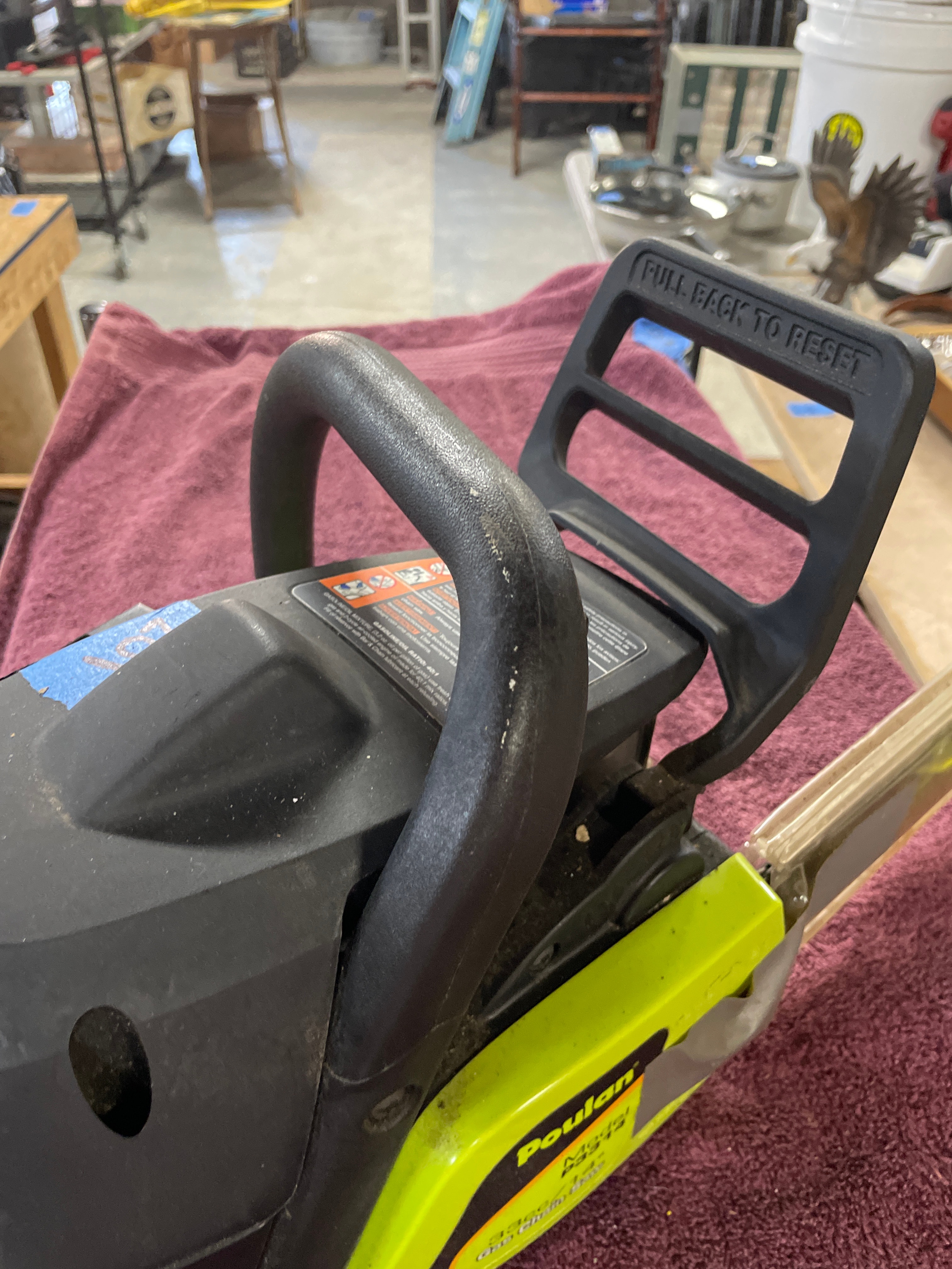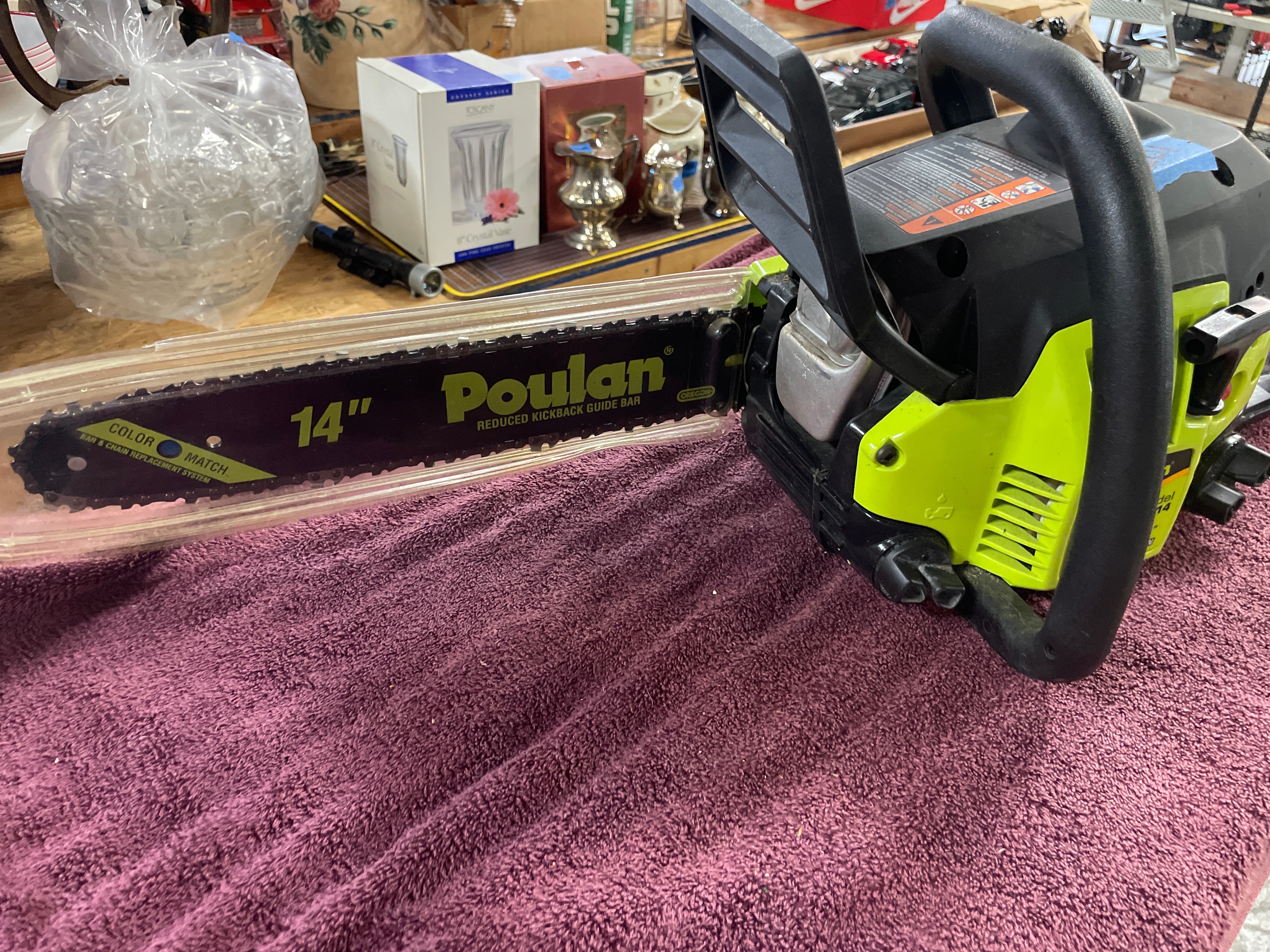 A black and lime green Poulan Model P3314 33cc/14″ Gas Chain Saw with 14″ Reduced Kickback Guide Bar.