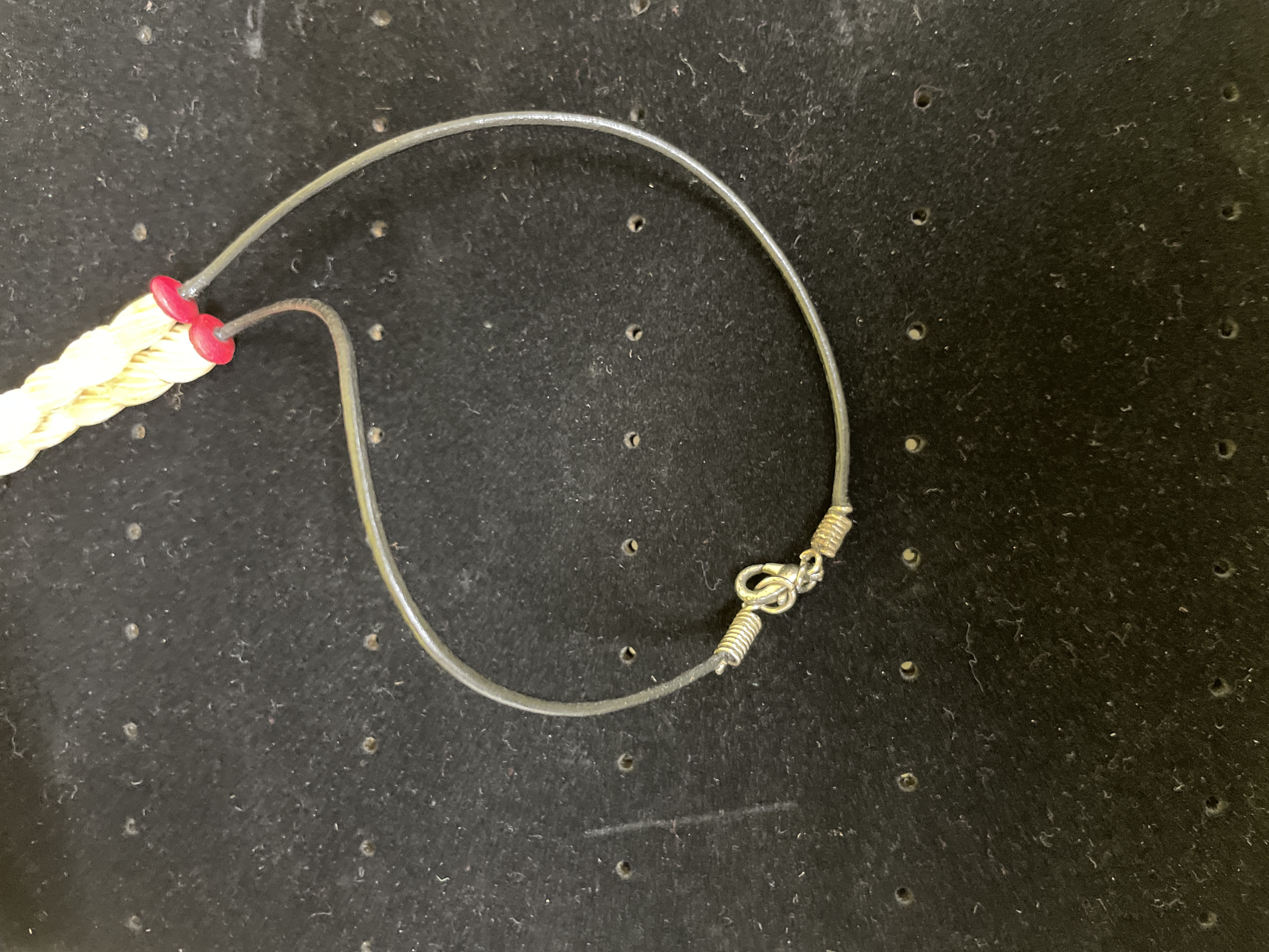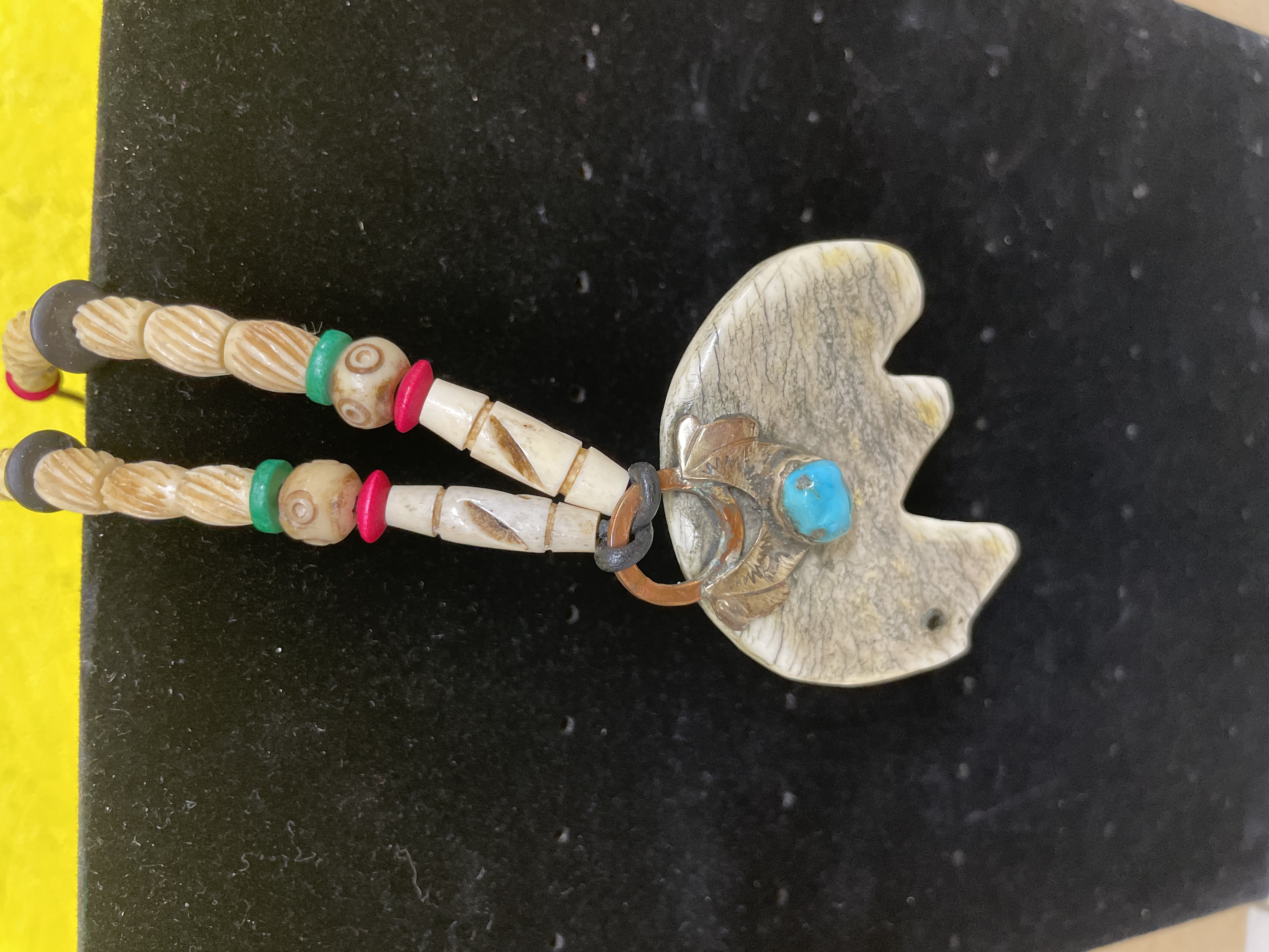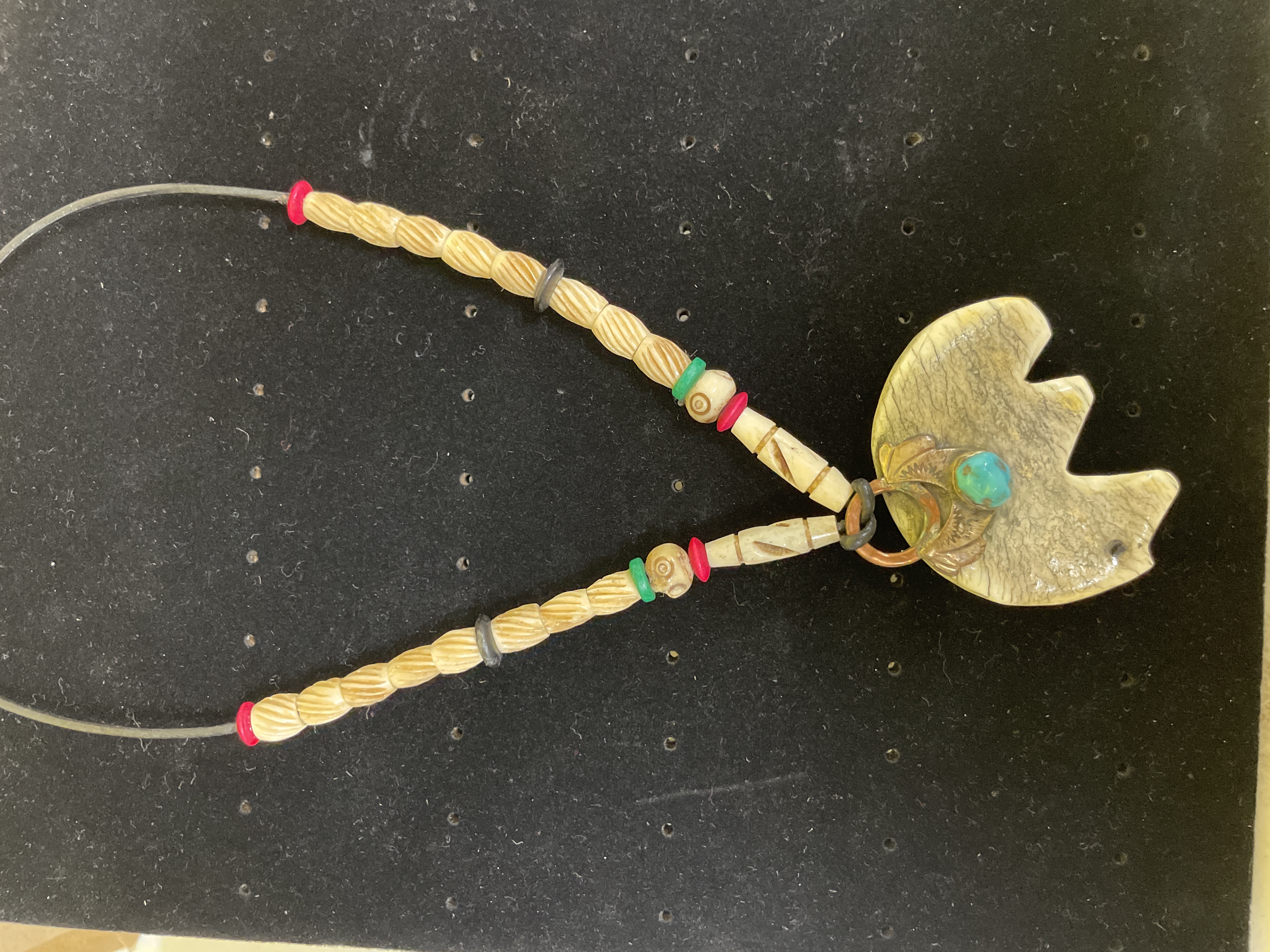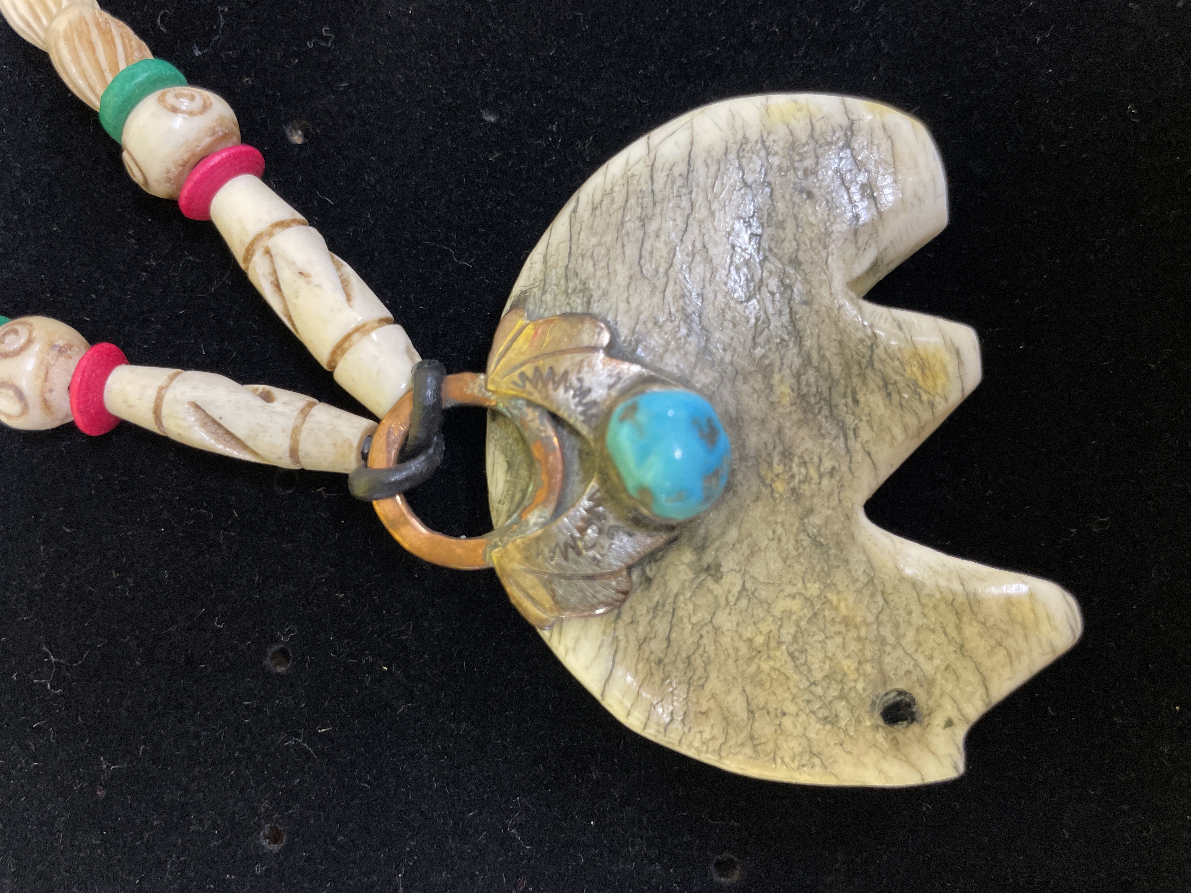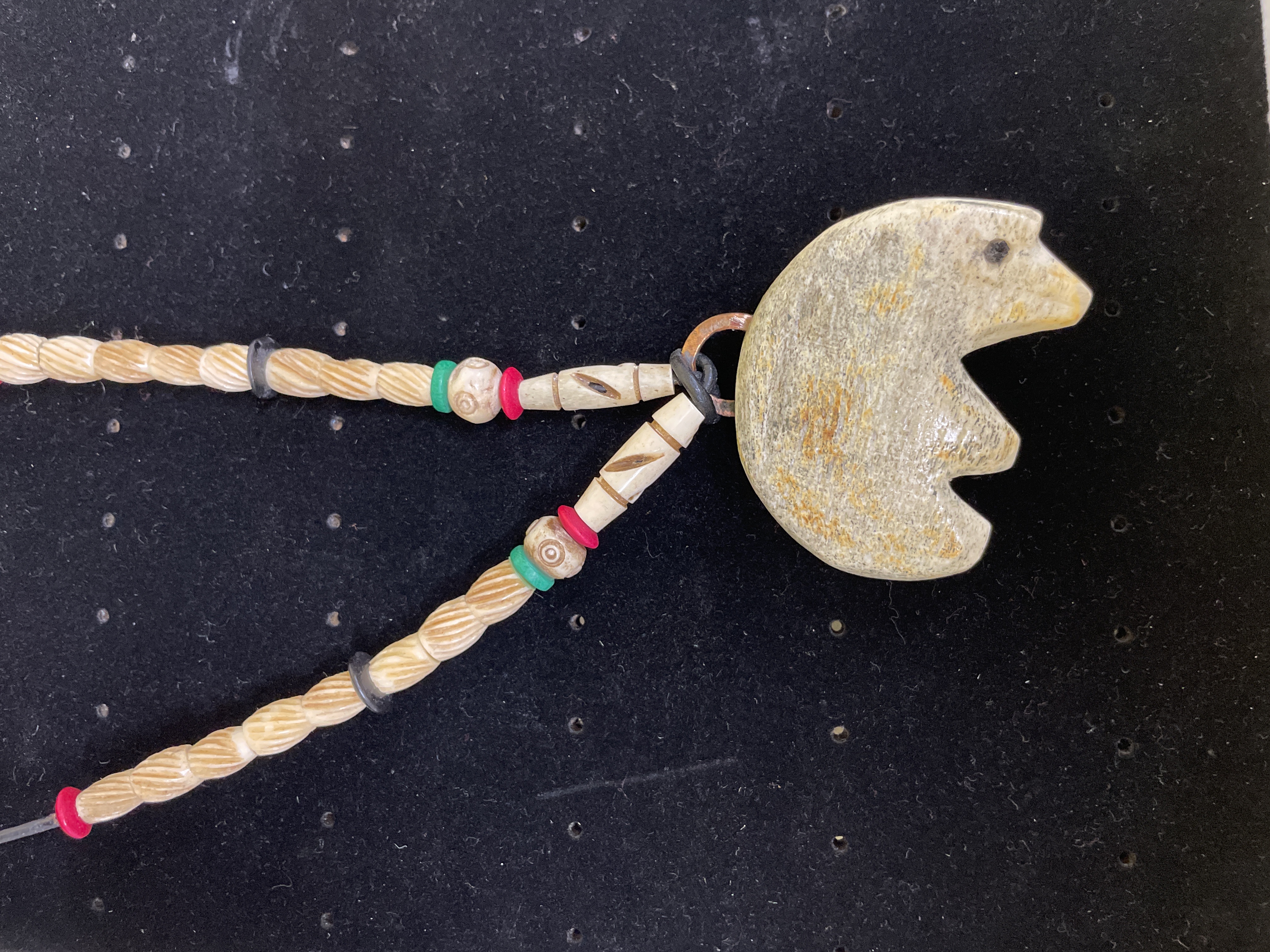 This Native American Zuni style fetish necklace features a large, handcrafted carved pendant suspended from a beaded strand. The pendant, shaped like a stylized bear effigy, is crafted from a light, bone-like material with natural variations and striations. It is accented by a bezel-set, rounded turquoise-colored stone (likely turquoise) beneath a textured copper-toned metal element resembling leaves or feathers. The necklace strand comprises numerous tubular, light-colored carved bone beads with incised line patterns, interspersed with smaller round plastic or resin beads in red, green, and black. These are strung on a grey cord, which terminates in a simple silver-toned metal hook-and-eye clasp. No visible maker’s marks or inscriptions.