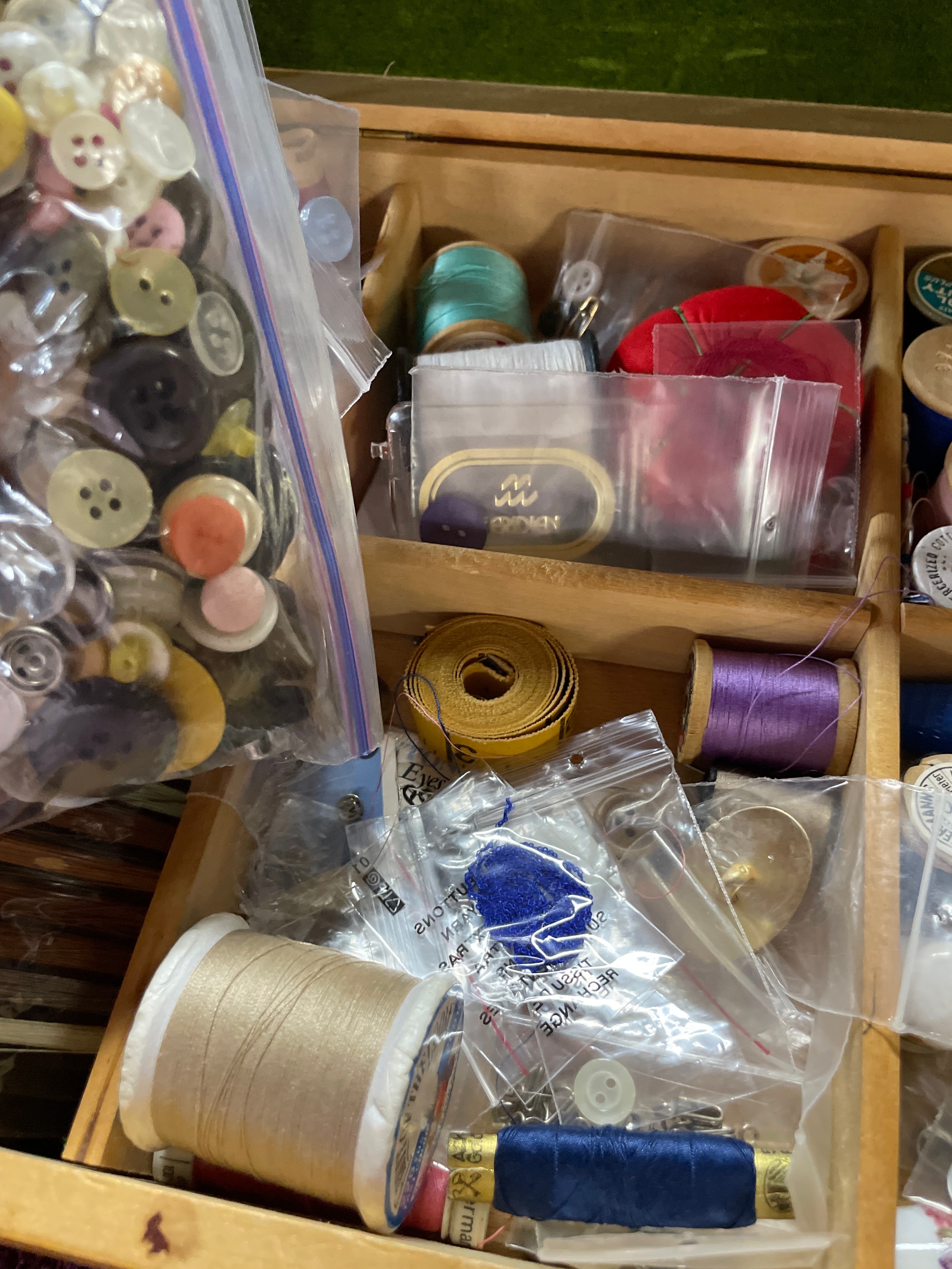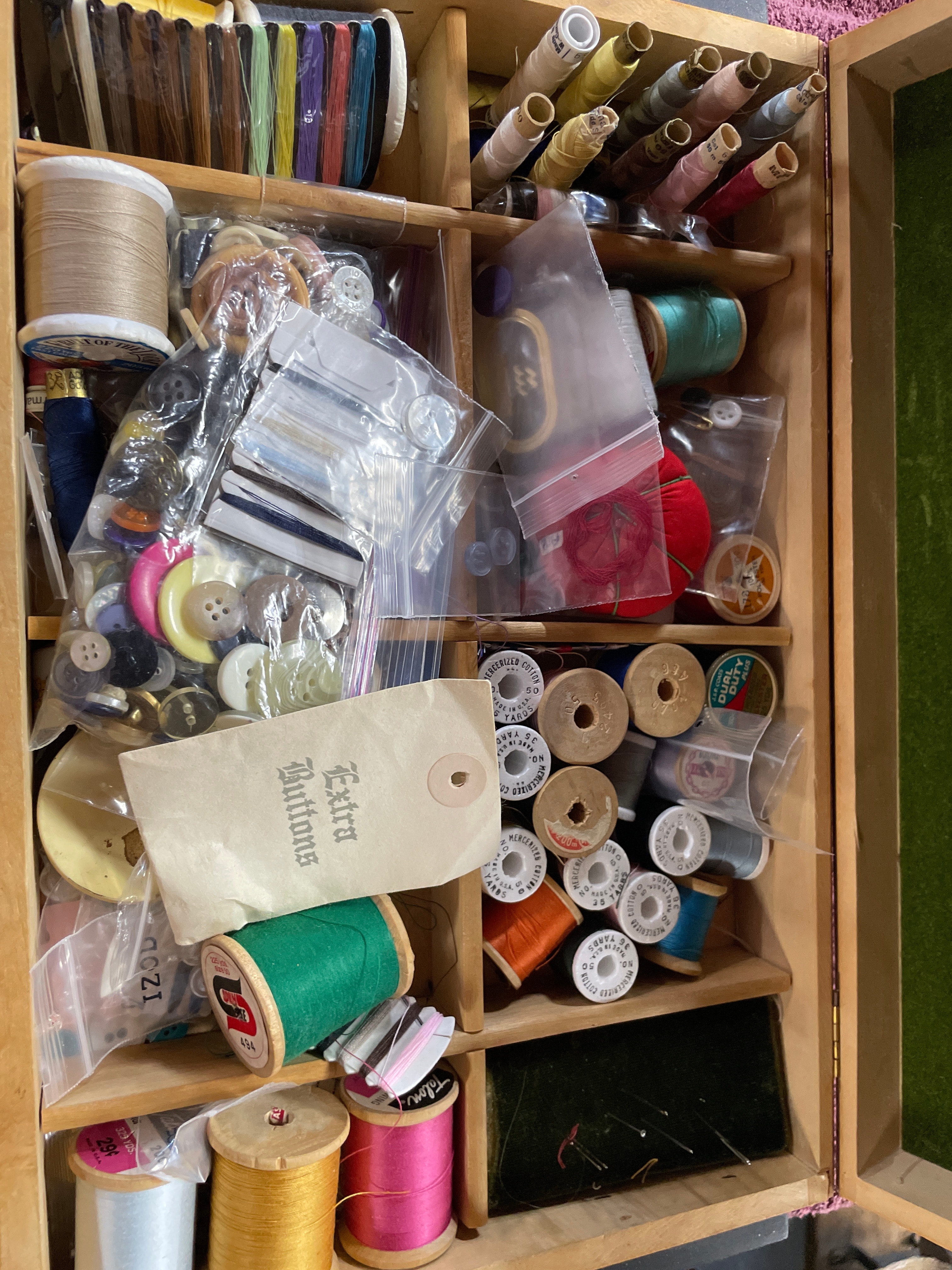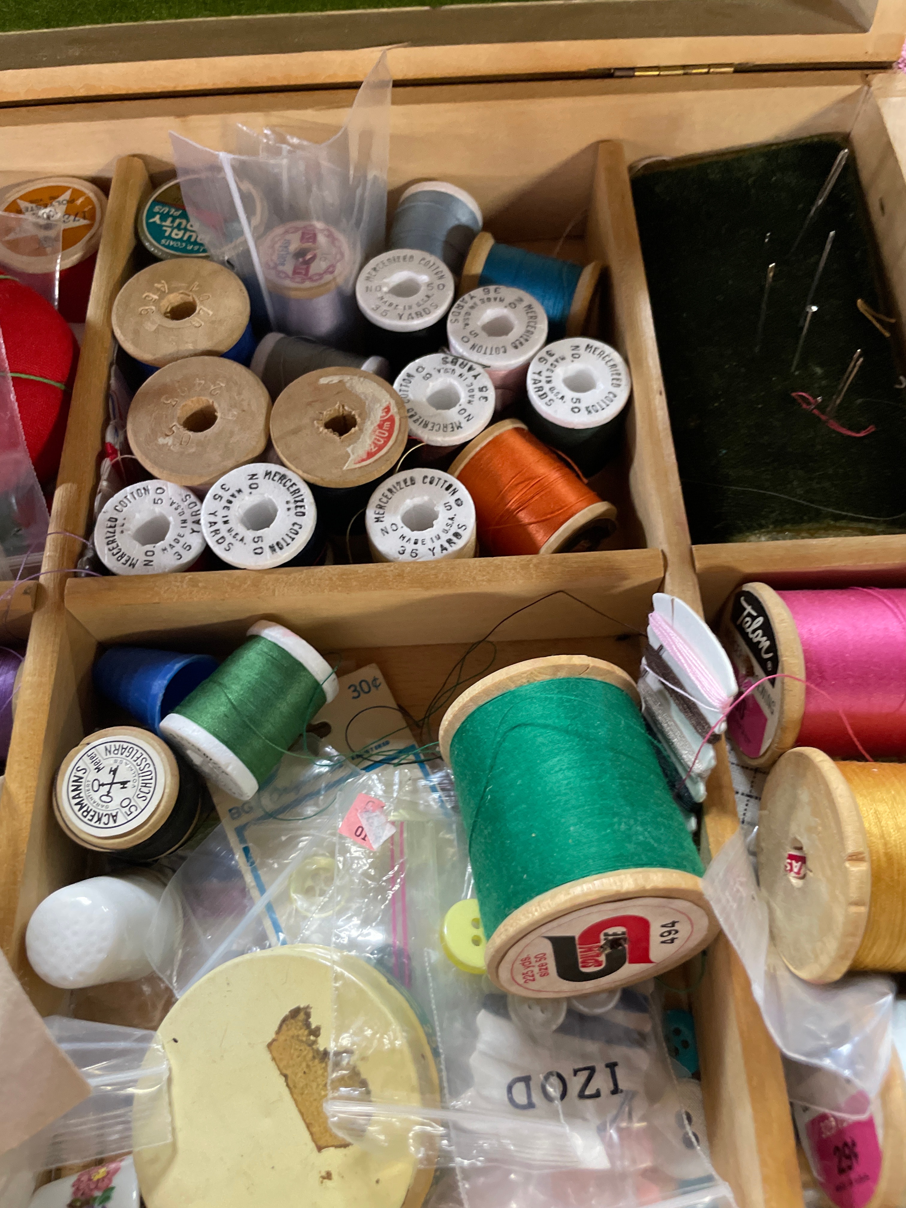 A light brown wooden sewing box, approximately 14.5 inches long, with a green felt-lined lid, containing numerous sewing notions including thread spools (J. & P. Coats, American Thread Co., Talon), assorted buttons, measuring tape, pincushions, needles, thimble, and scissors, with a ‘Singer’ label and ’30¢’ price visible on some items.