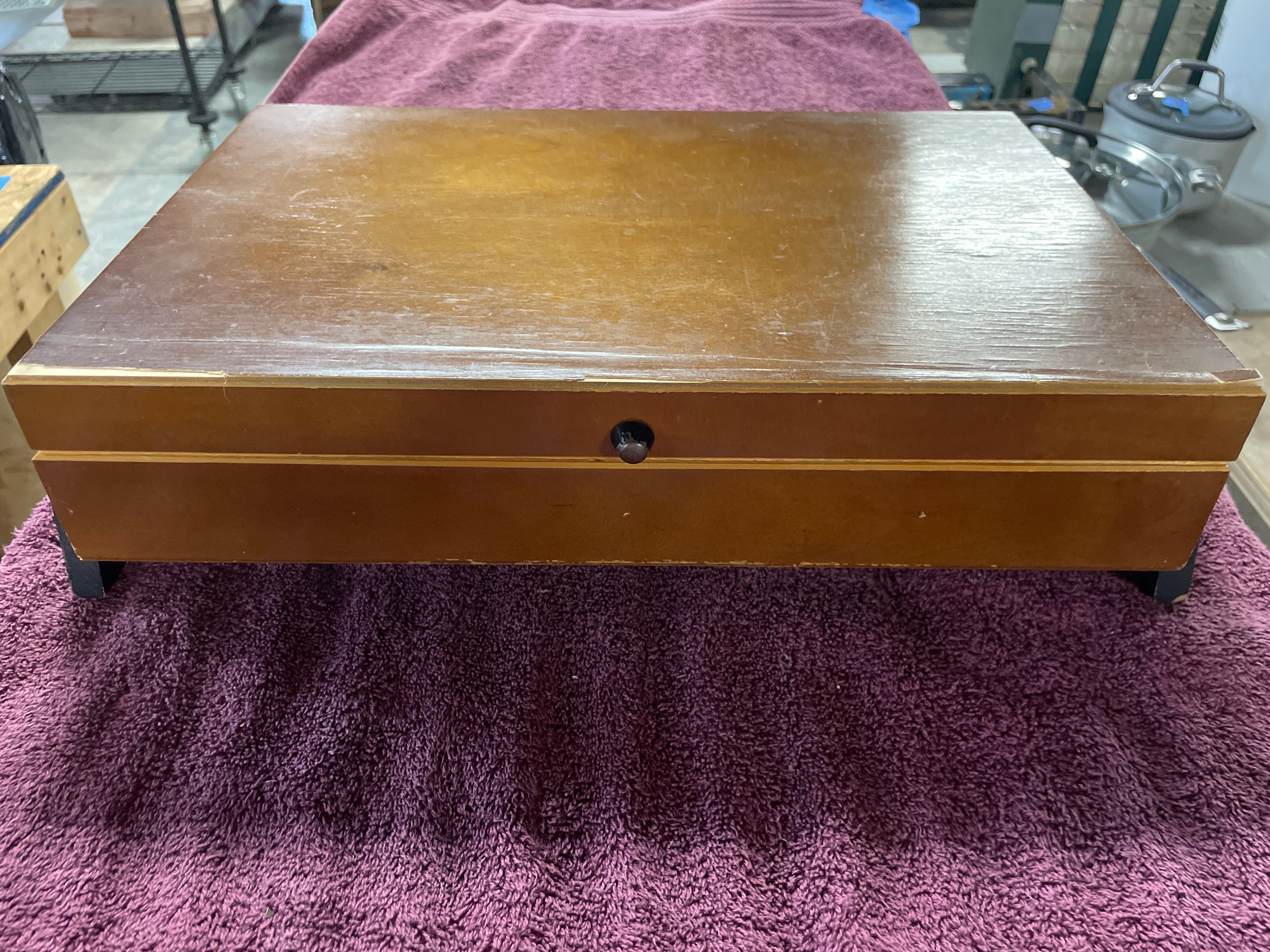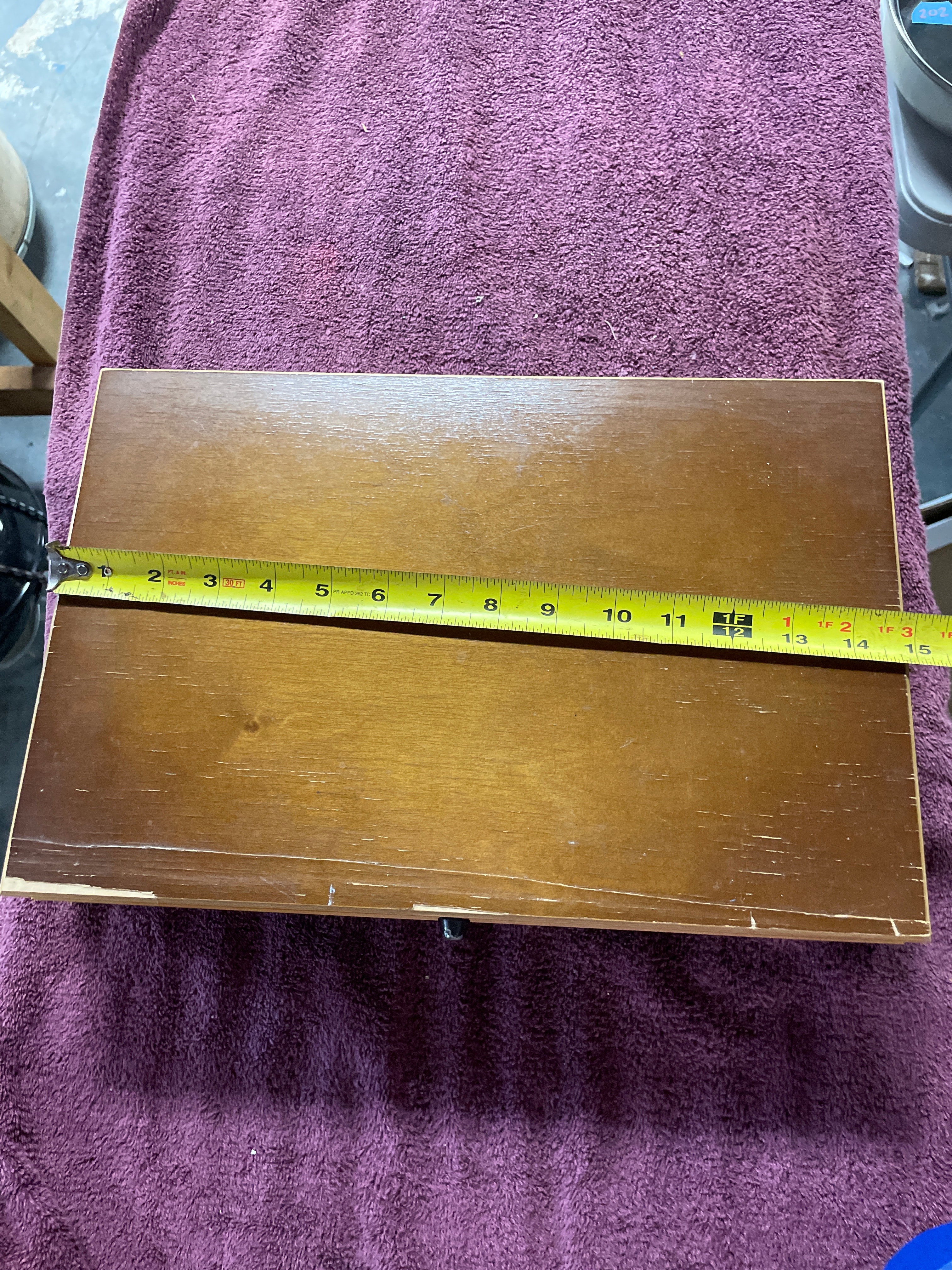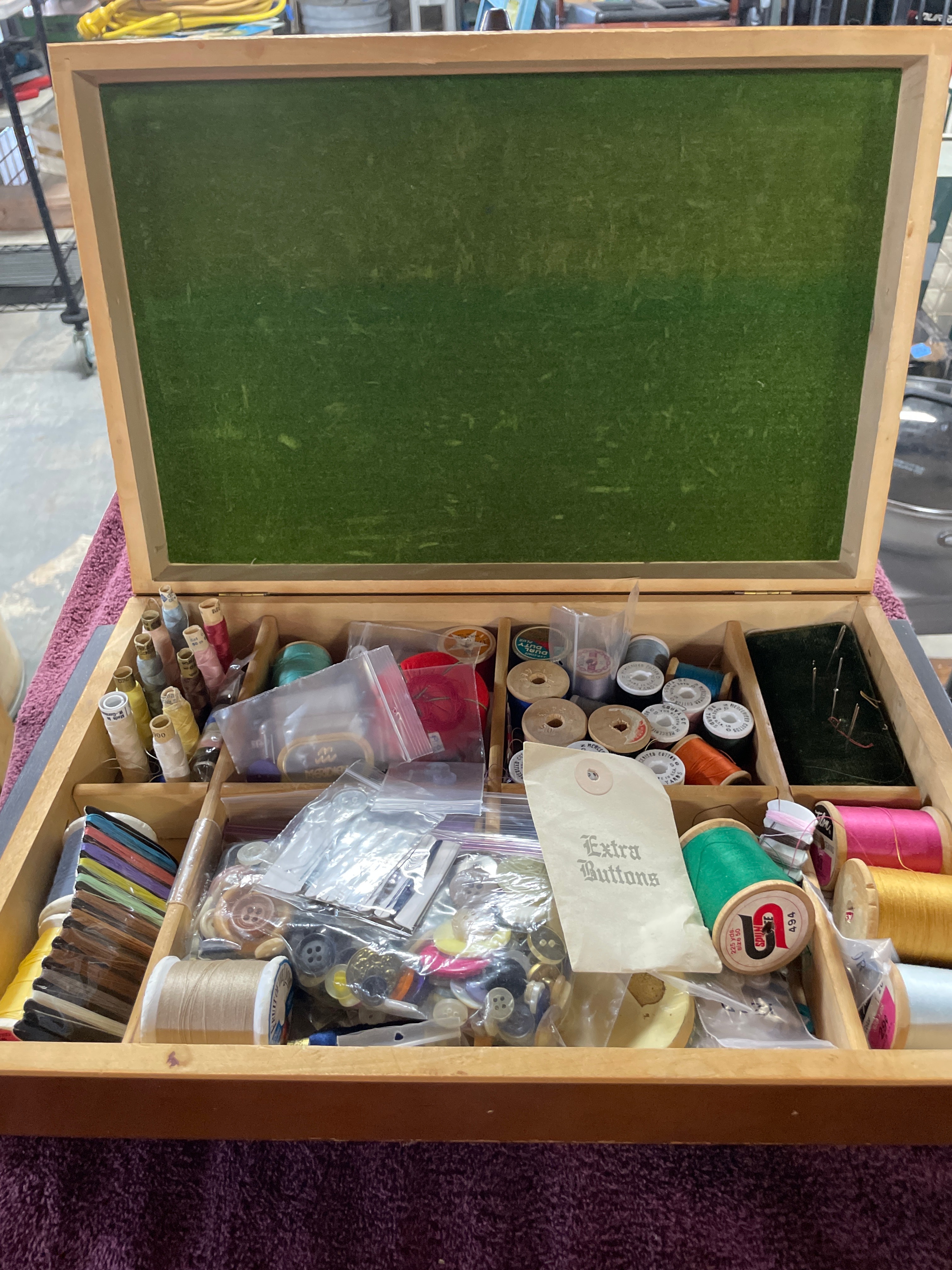 A light brown wooden sewing box, approximately 14.5 inches long, with a green felt-lined lid, containing numerous sewing notions including thread spools (J. & P. Coats, American Thread Co., Talon), assorted buttons, measuring tape, pincushions, needles, thimble, and scissors, with a ‘Singer’ label and ’30¢’ price visible on some items.