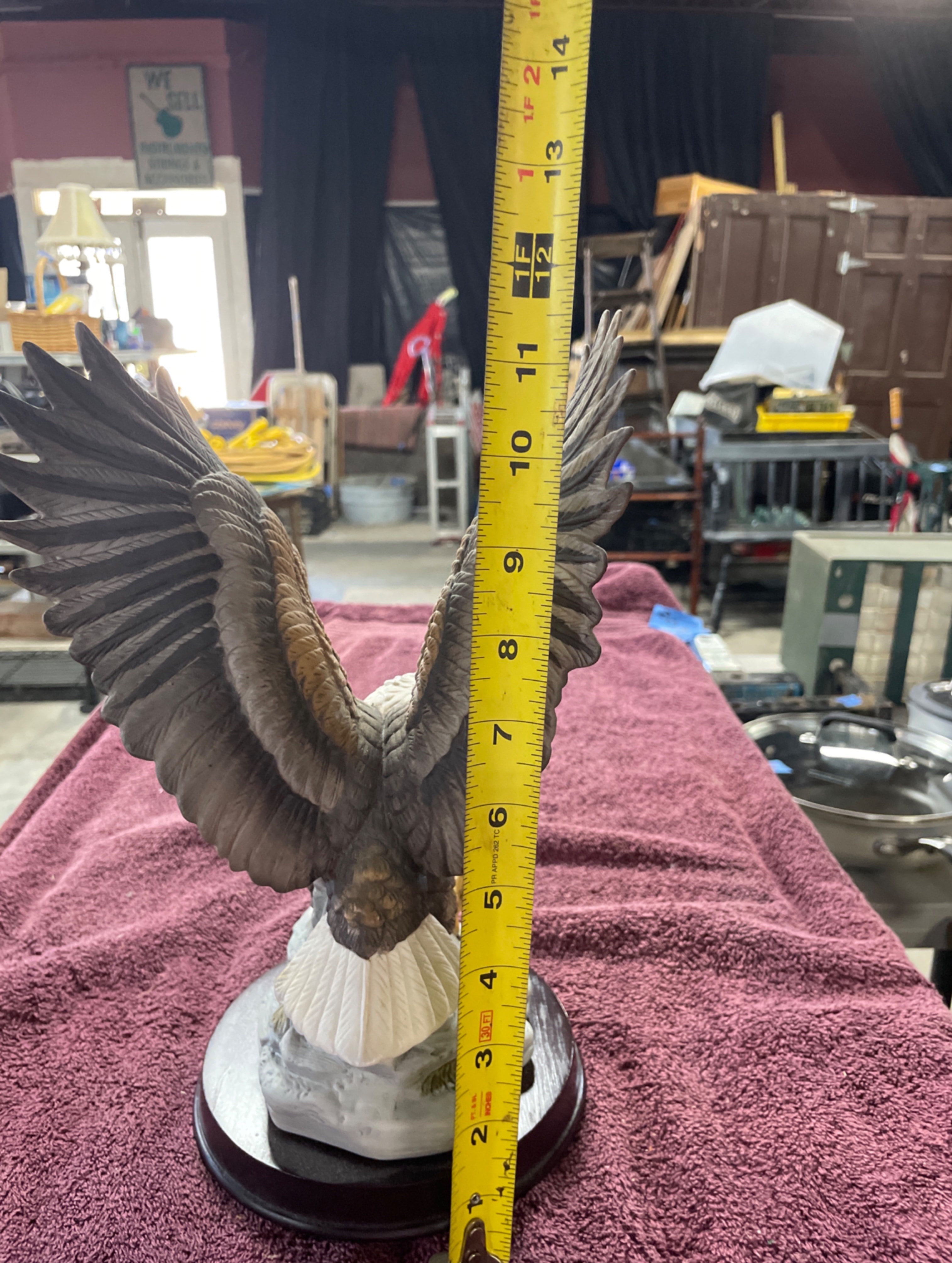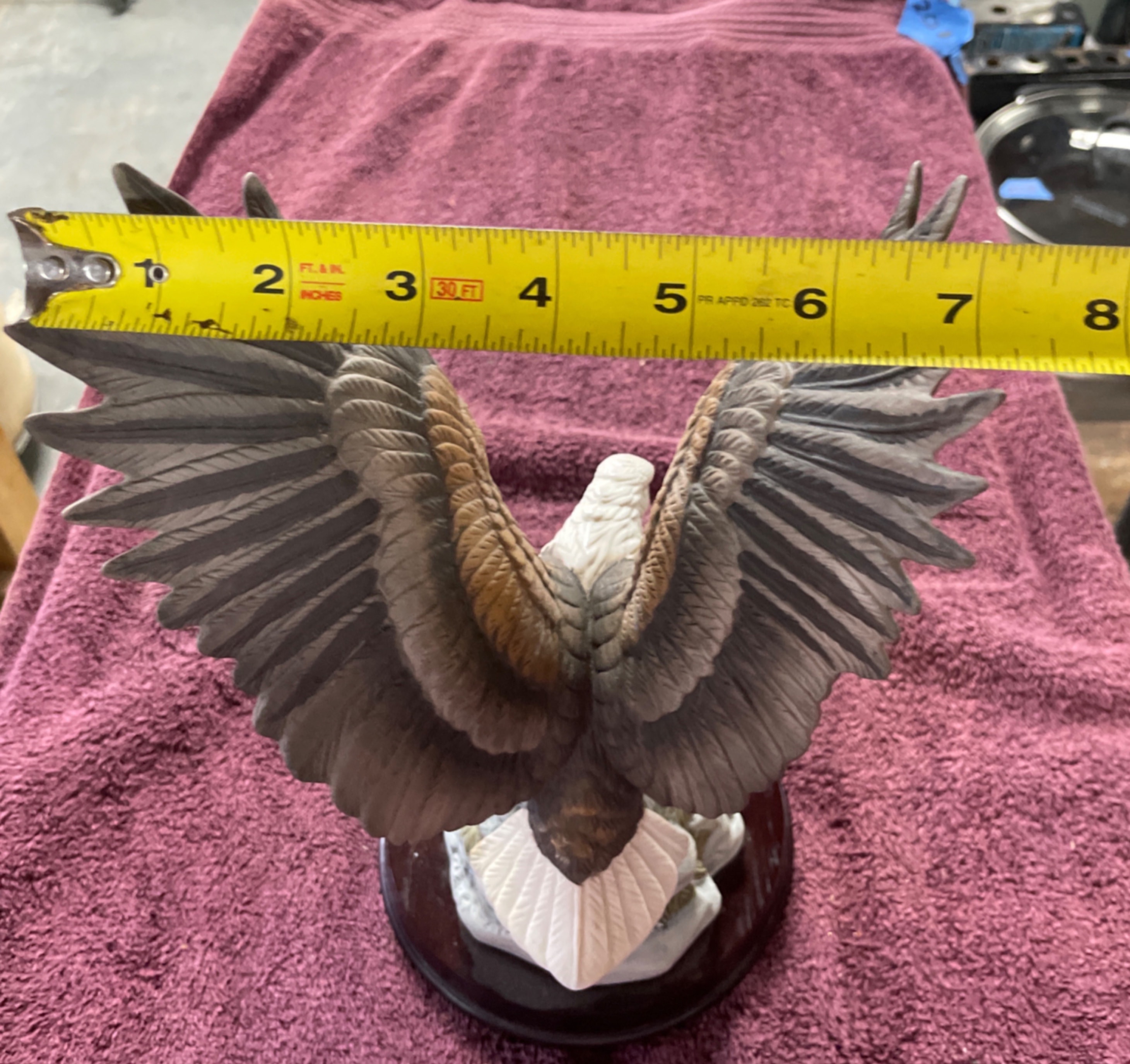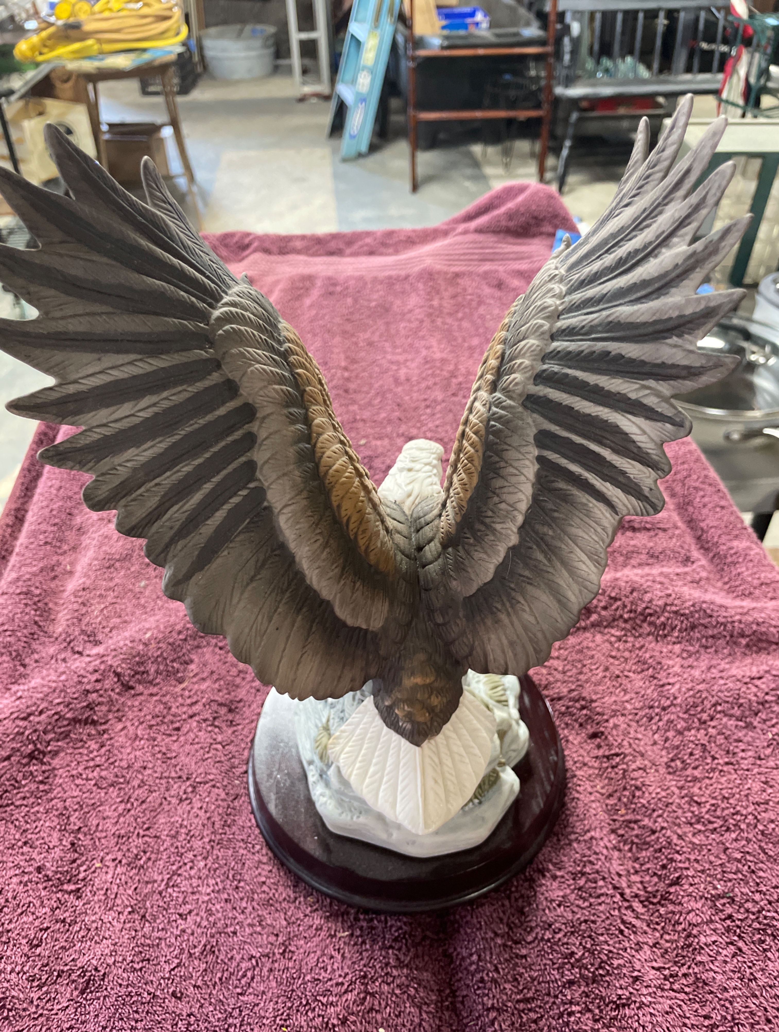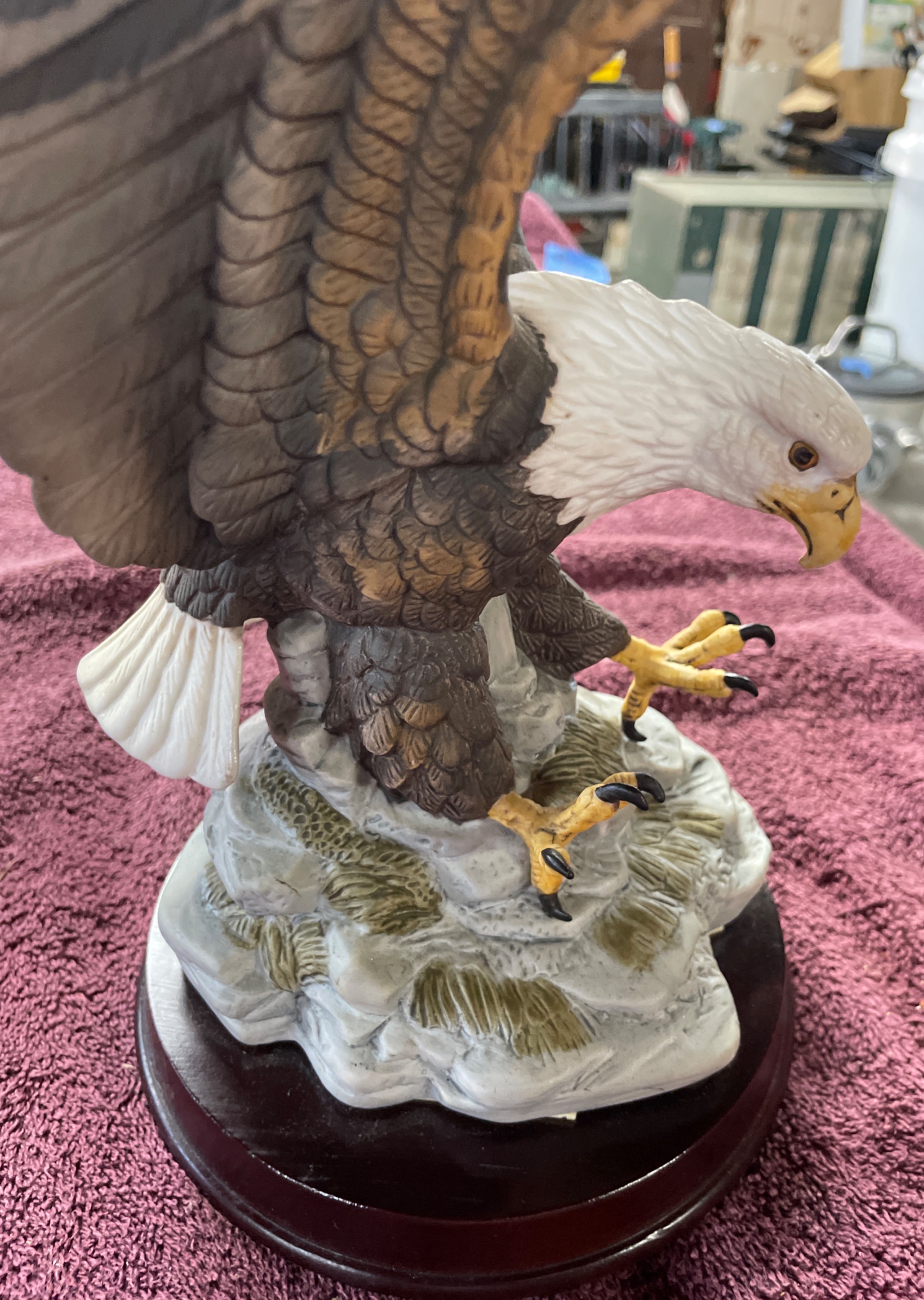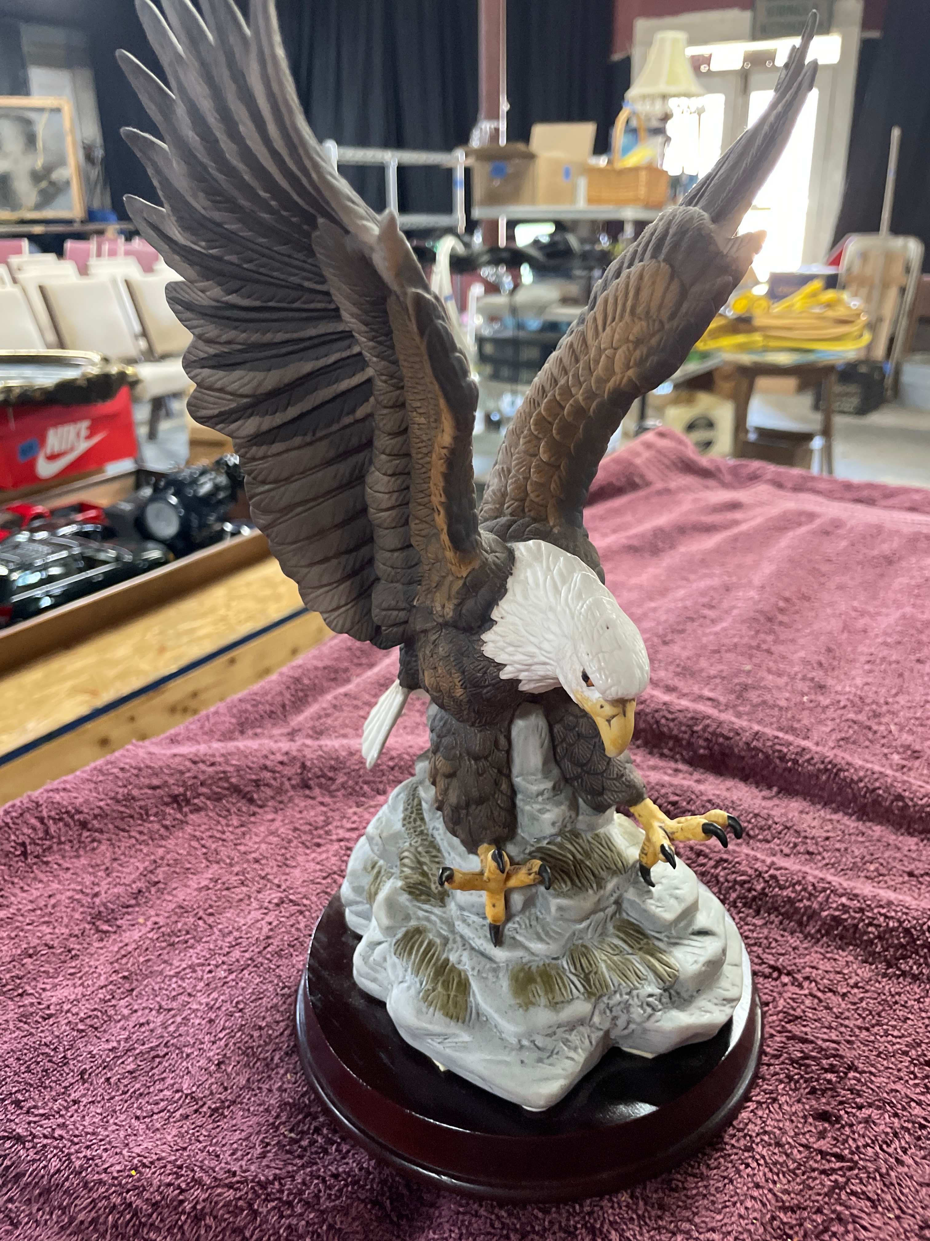 A resin bald eagle figurine, brown and white with yellow beak and talons, on a grey rock formation and dark wooden base, measuring approximately 13.5 inches high with a 7.5-inch wingspan.