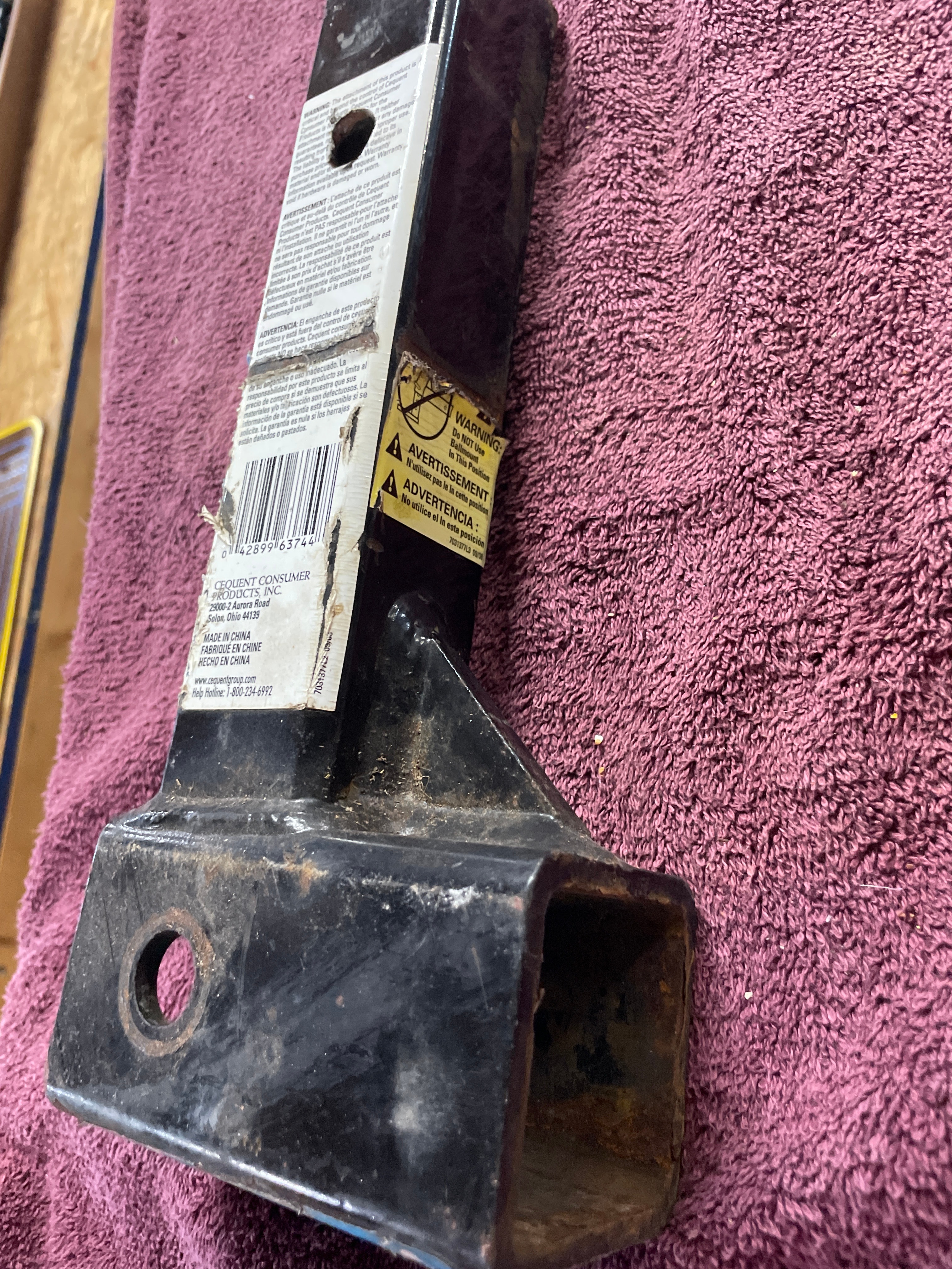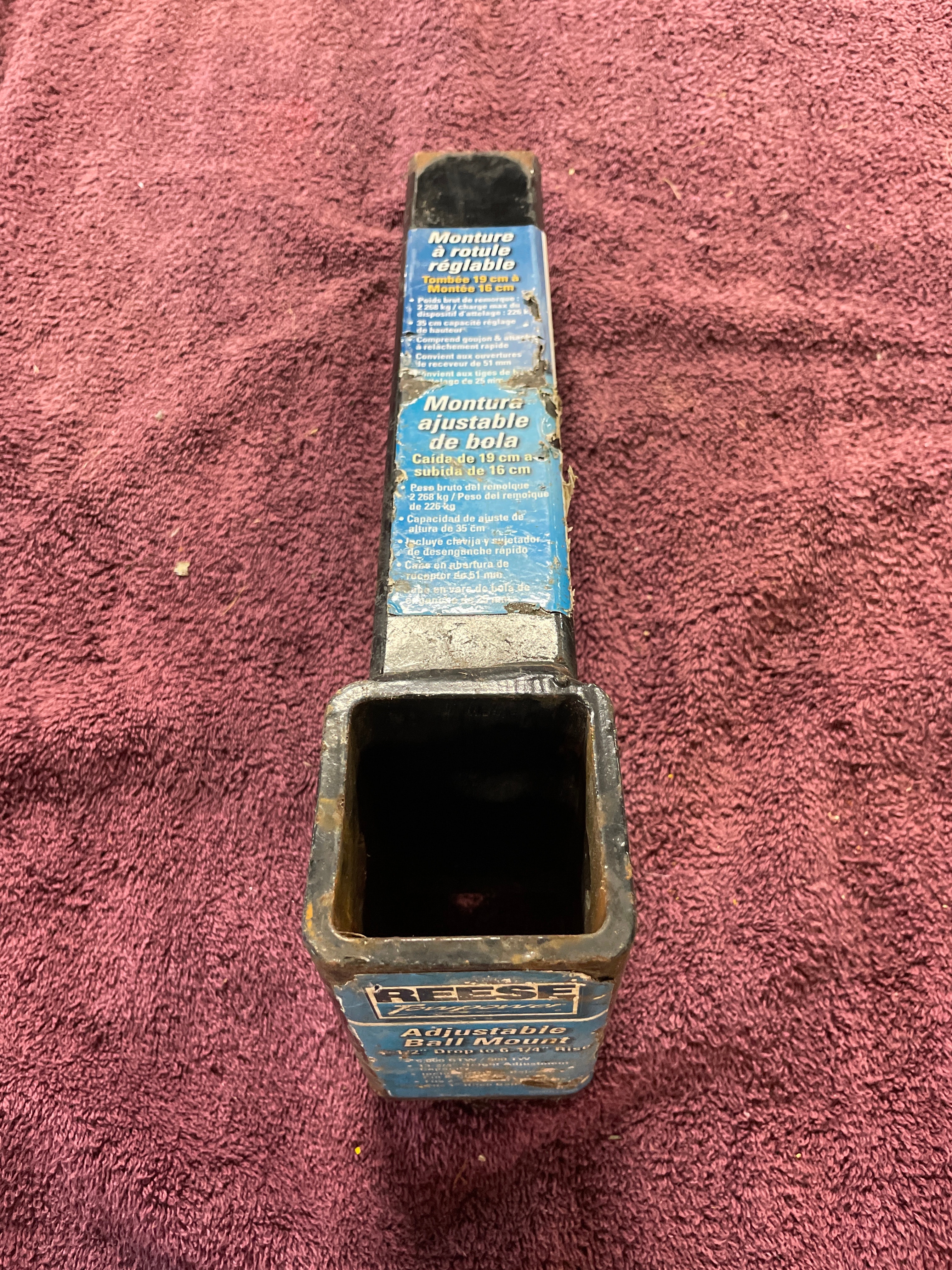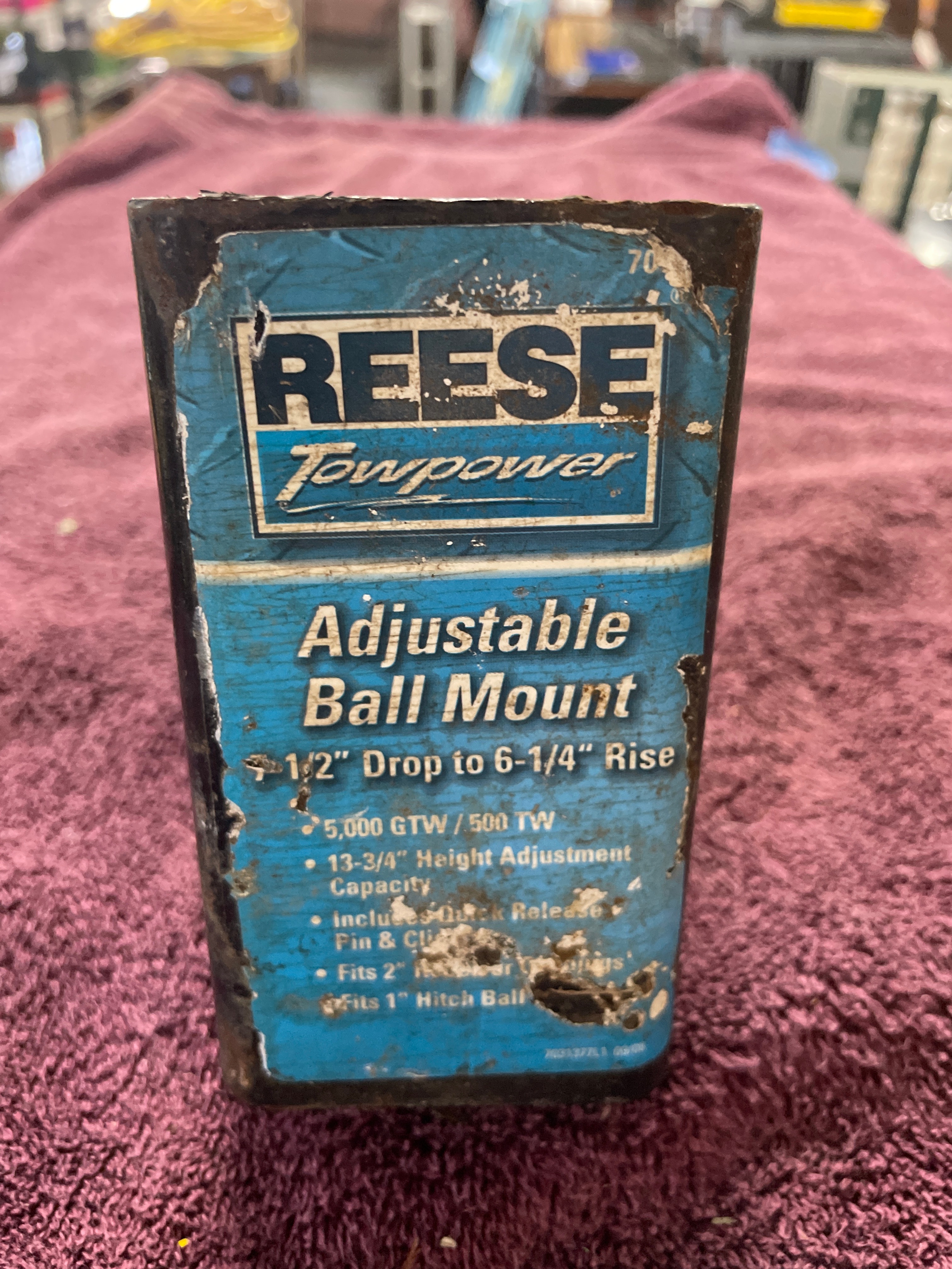 A black REESE Towpower Adjustable Ball Mount, labeled for 1-1/2″ Drop to 6-1/4″ Rise and 5,000 GTW / 500 TW, made in China.