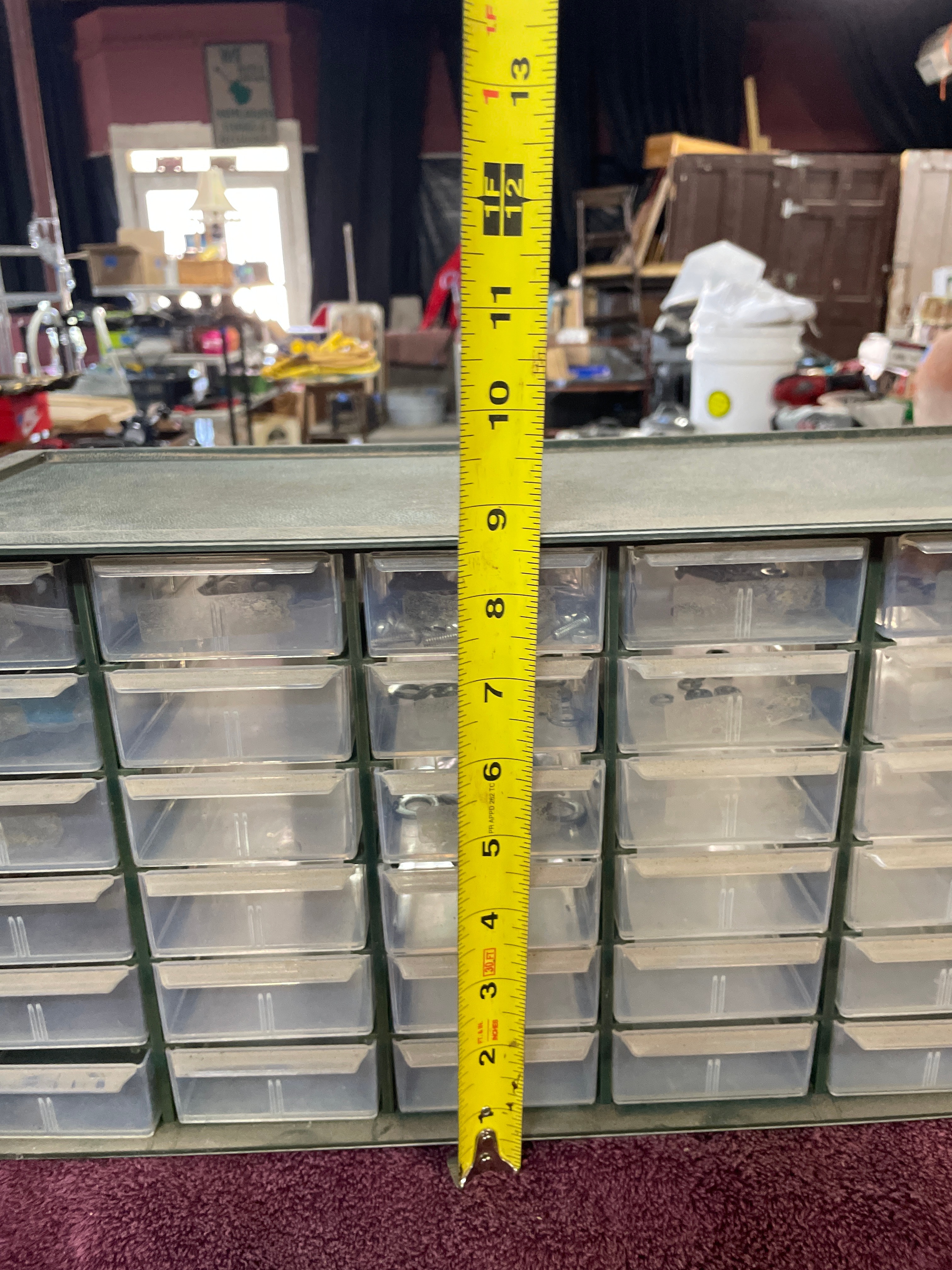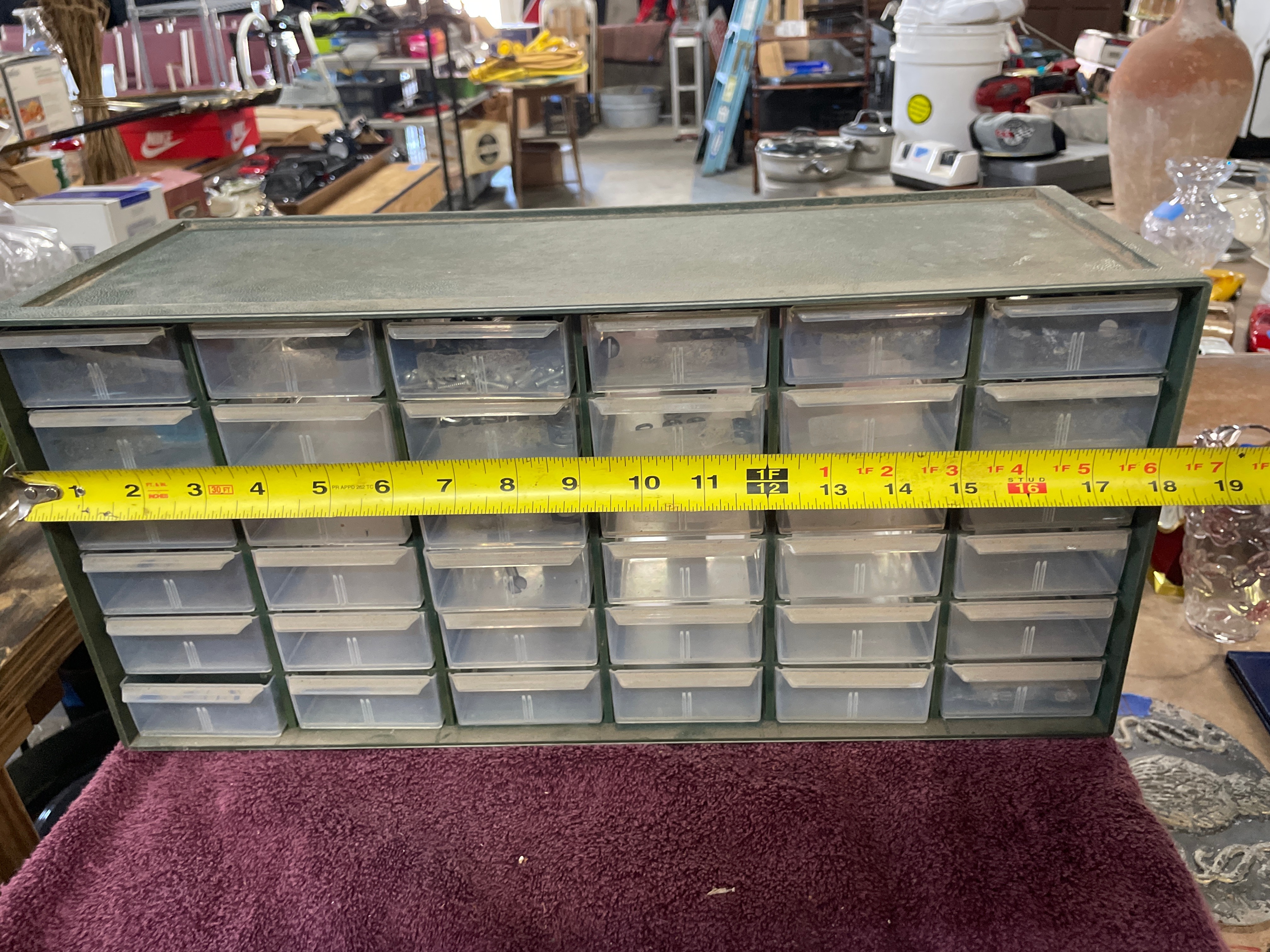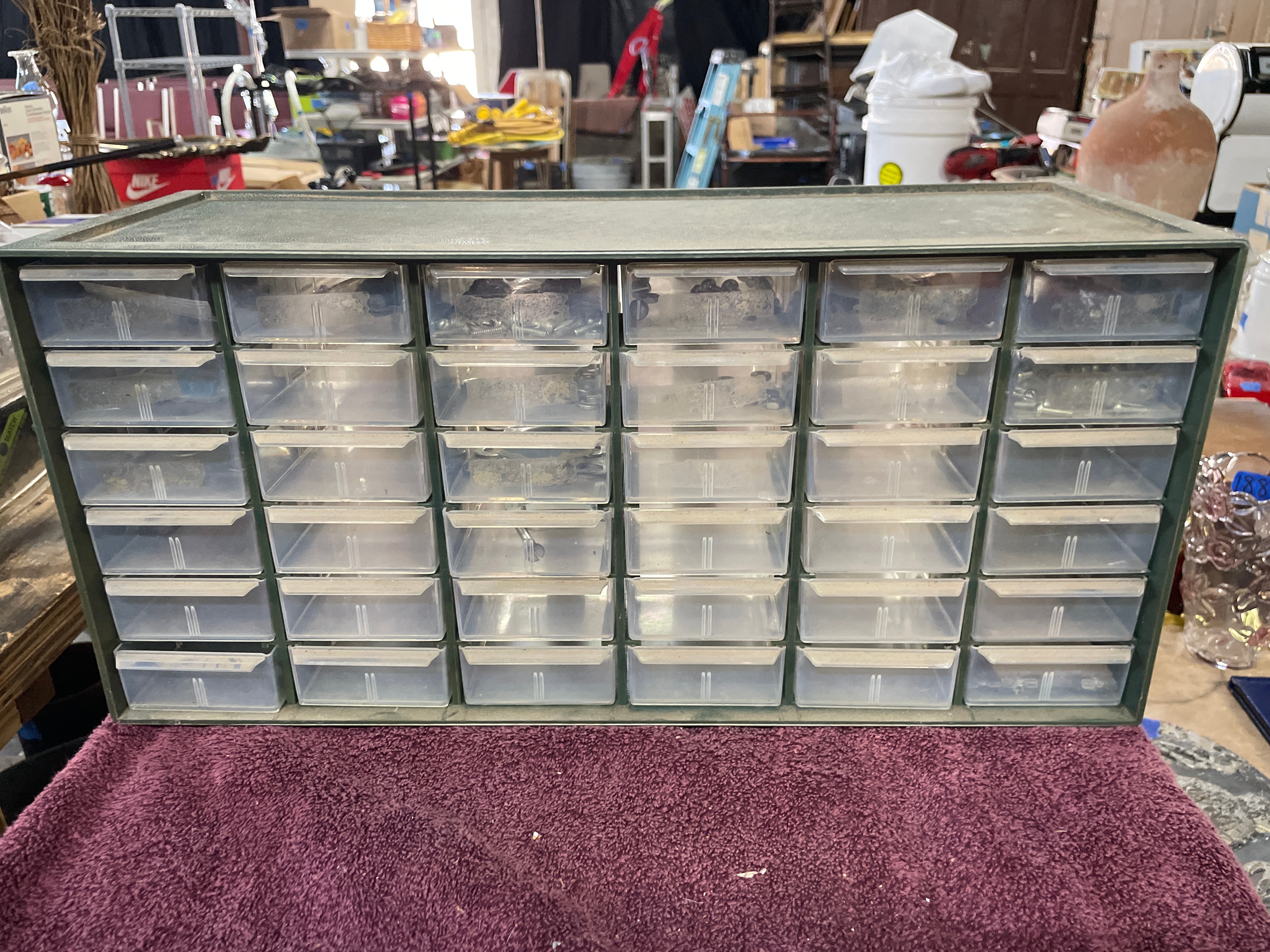 A dark green Akro-Mils 36-drawer parts storage cabinet, approximately 18.5 inches wide and 12.5 inches high, containing clear plastic drawers filled with silver-colored hardware, with one drawer labeled ‘Nuts & Bolts’.