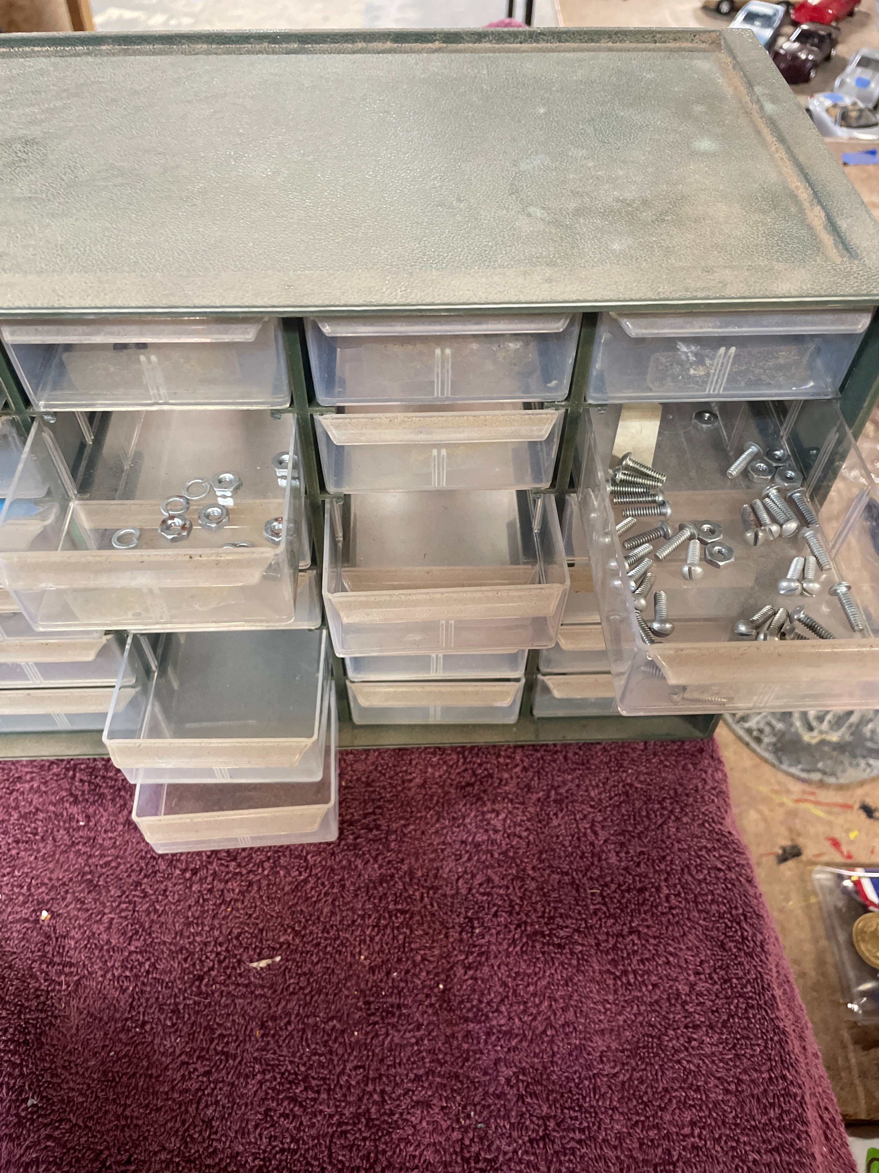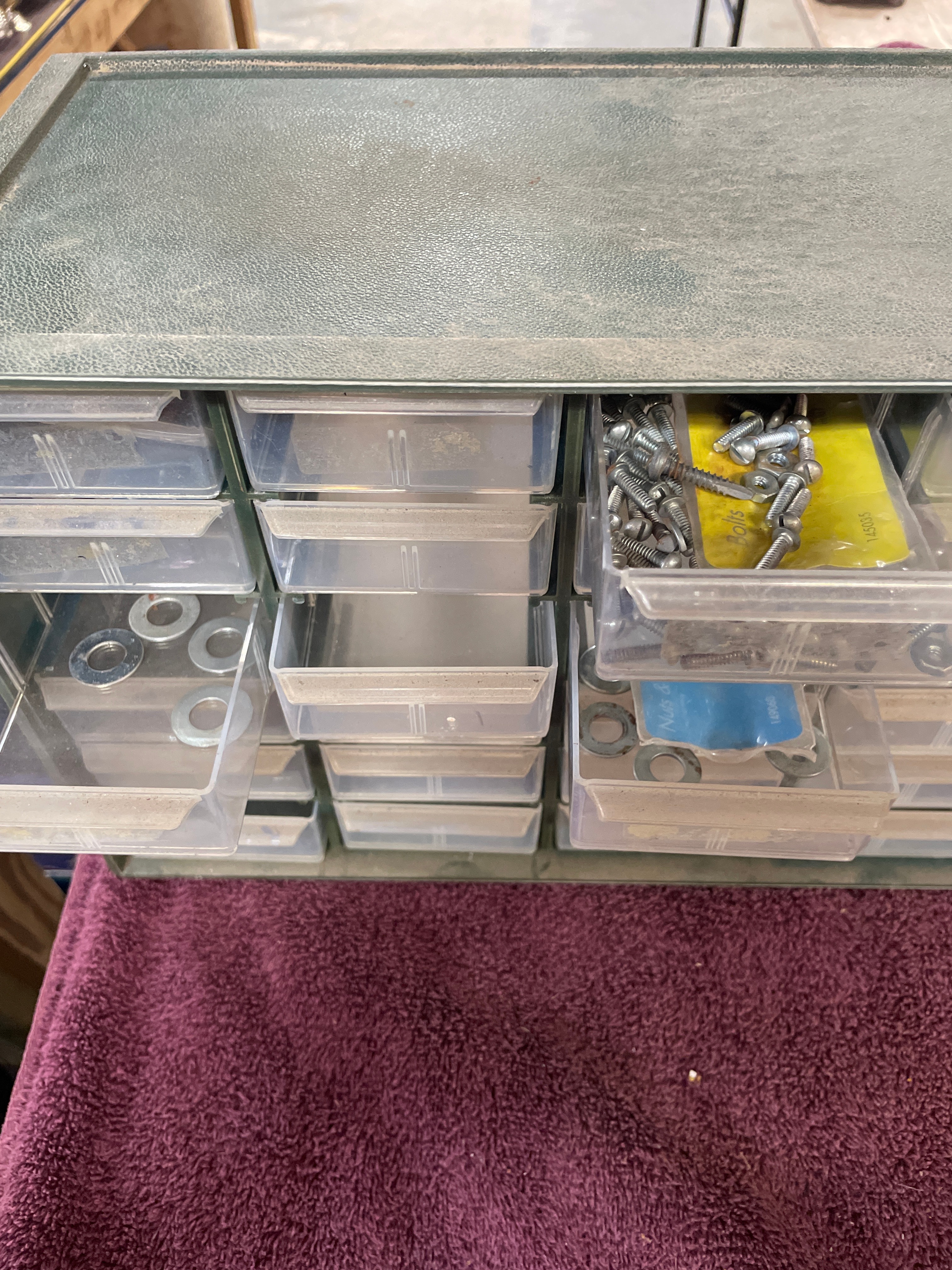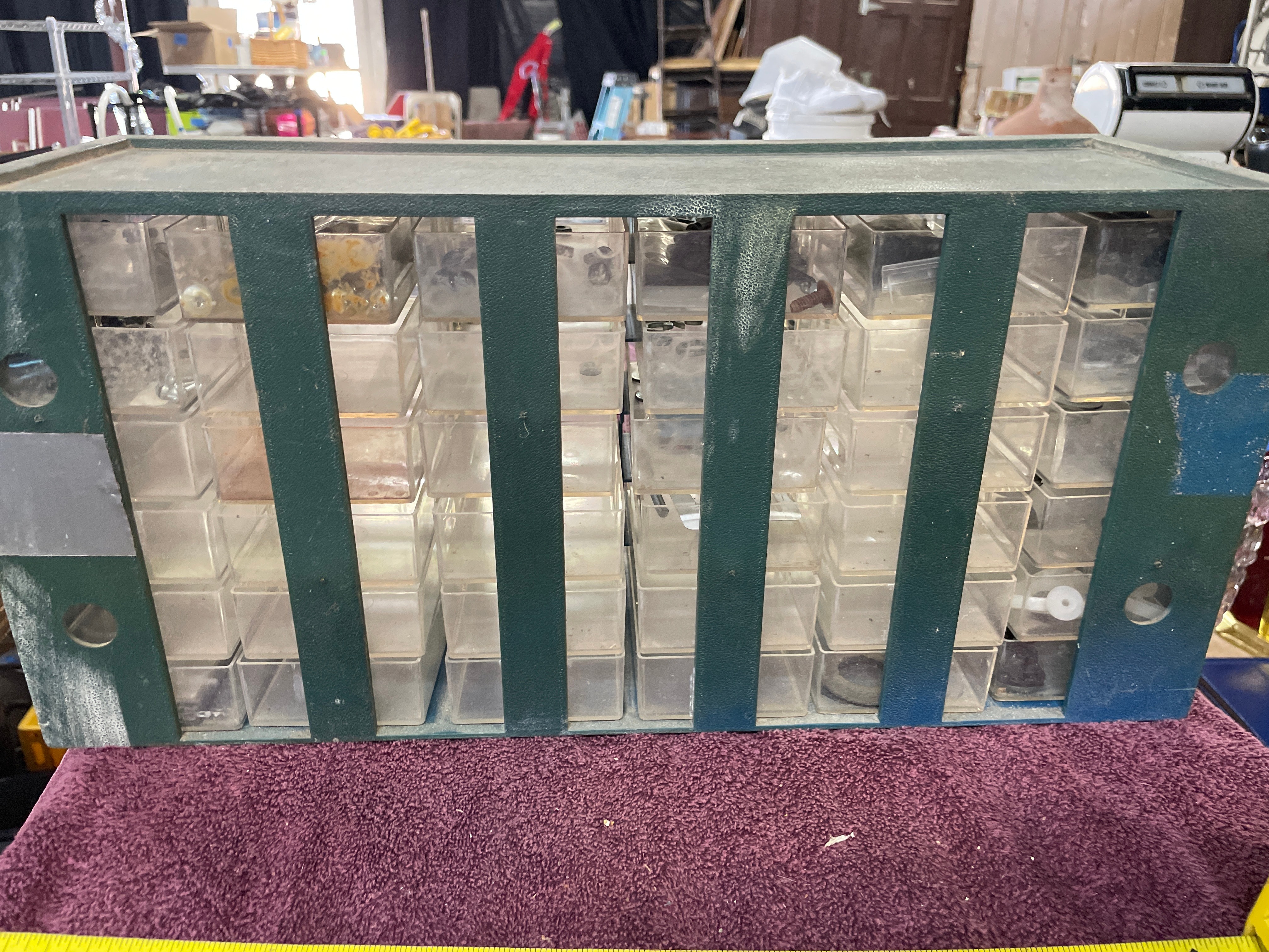 A dark green Akro-Mils 36-drawer parts storage cabinet, approximately 18.5 inches wide and 12.5 inches high, containing clear plastic drawers filled with silver-colored hardware, with one drawer labeled ‘Nuts & Bolts’.