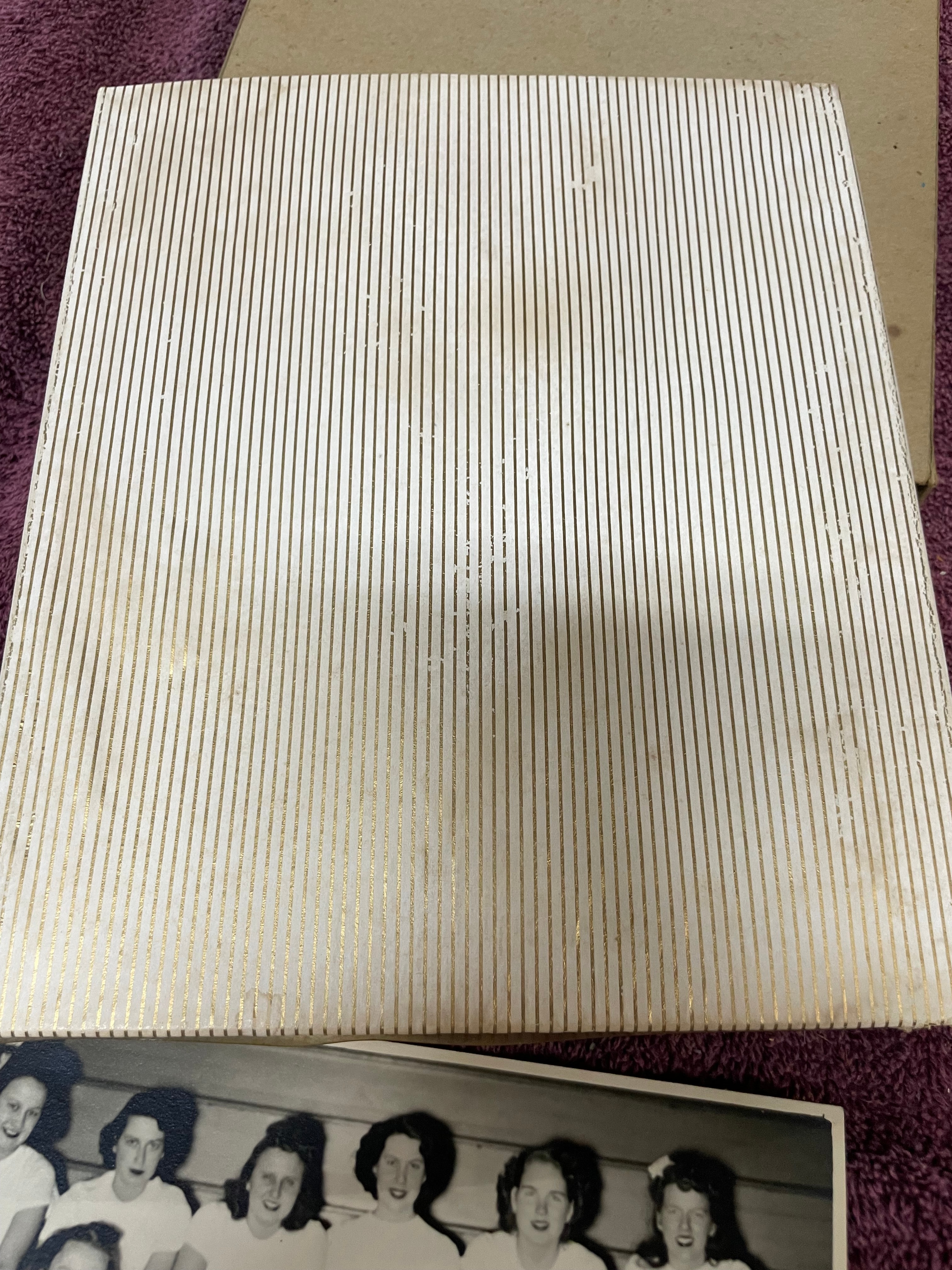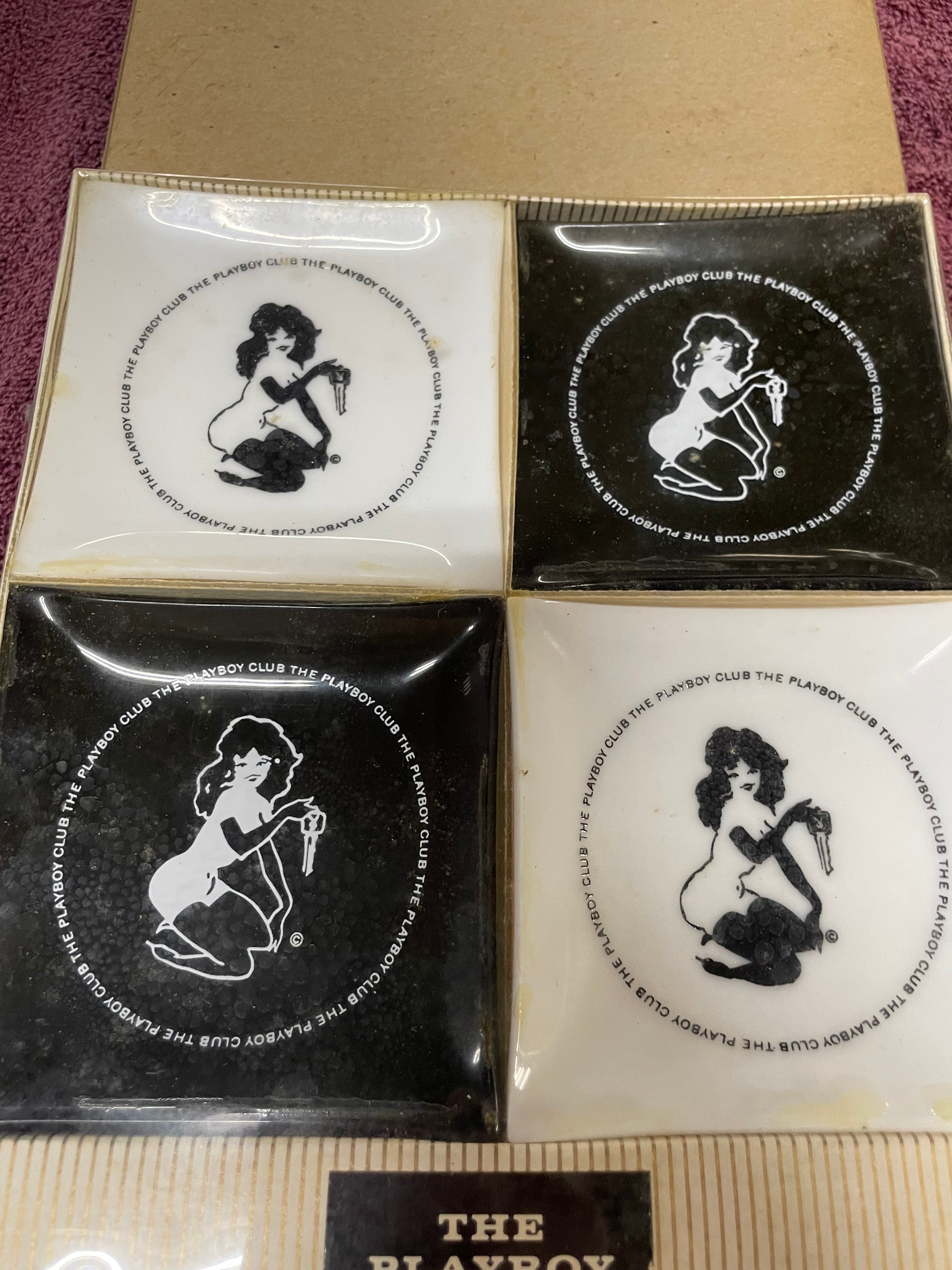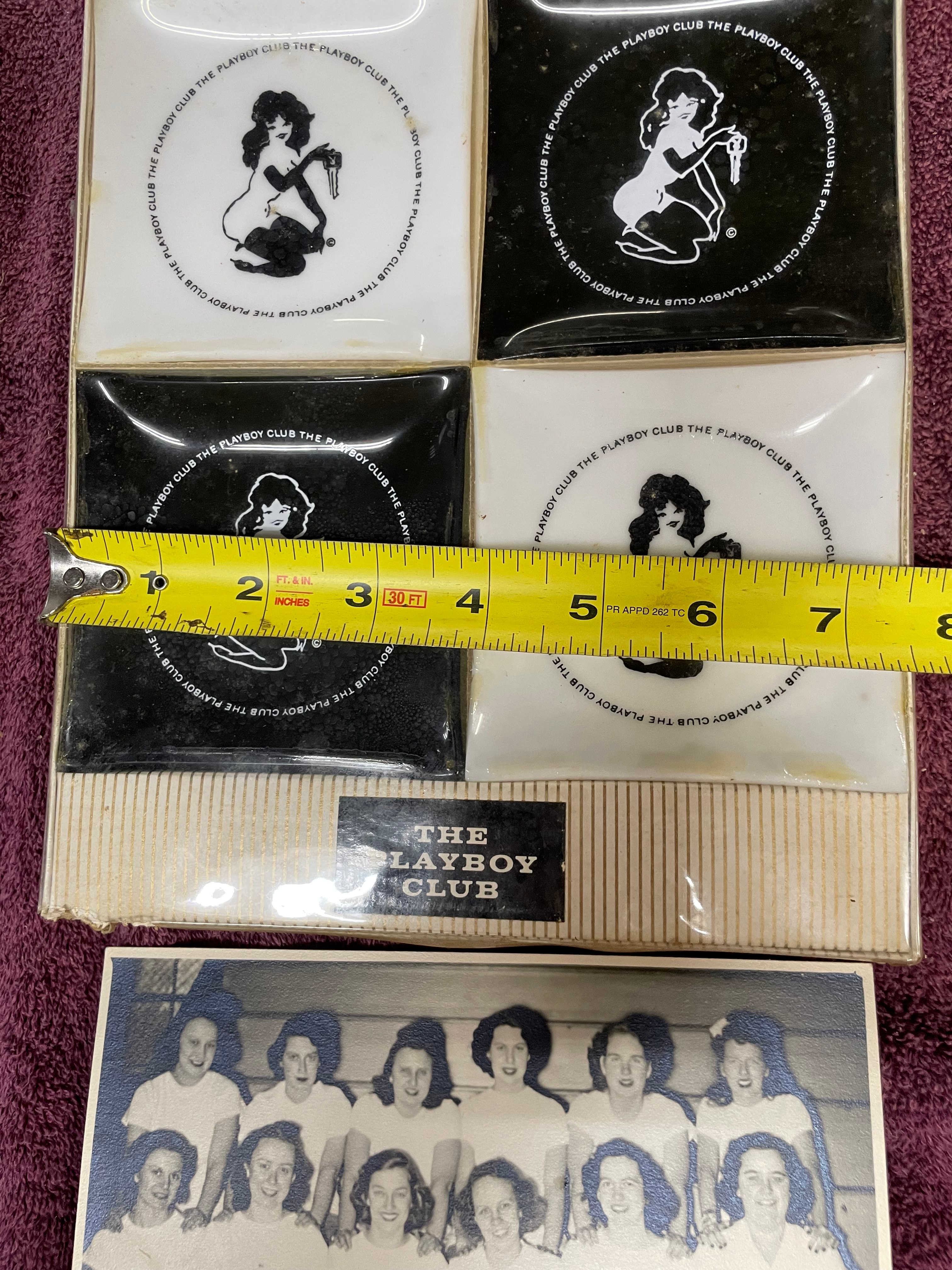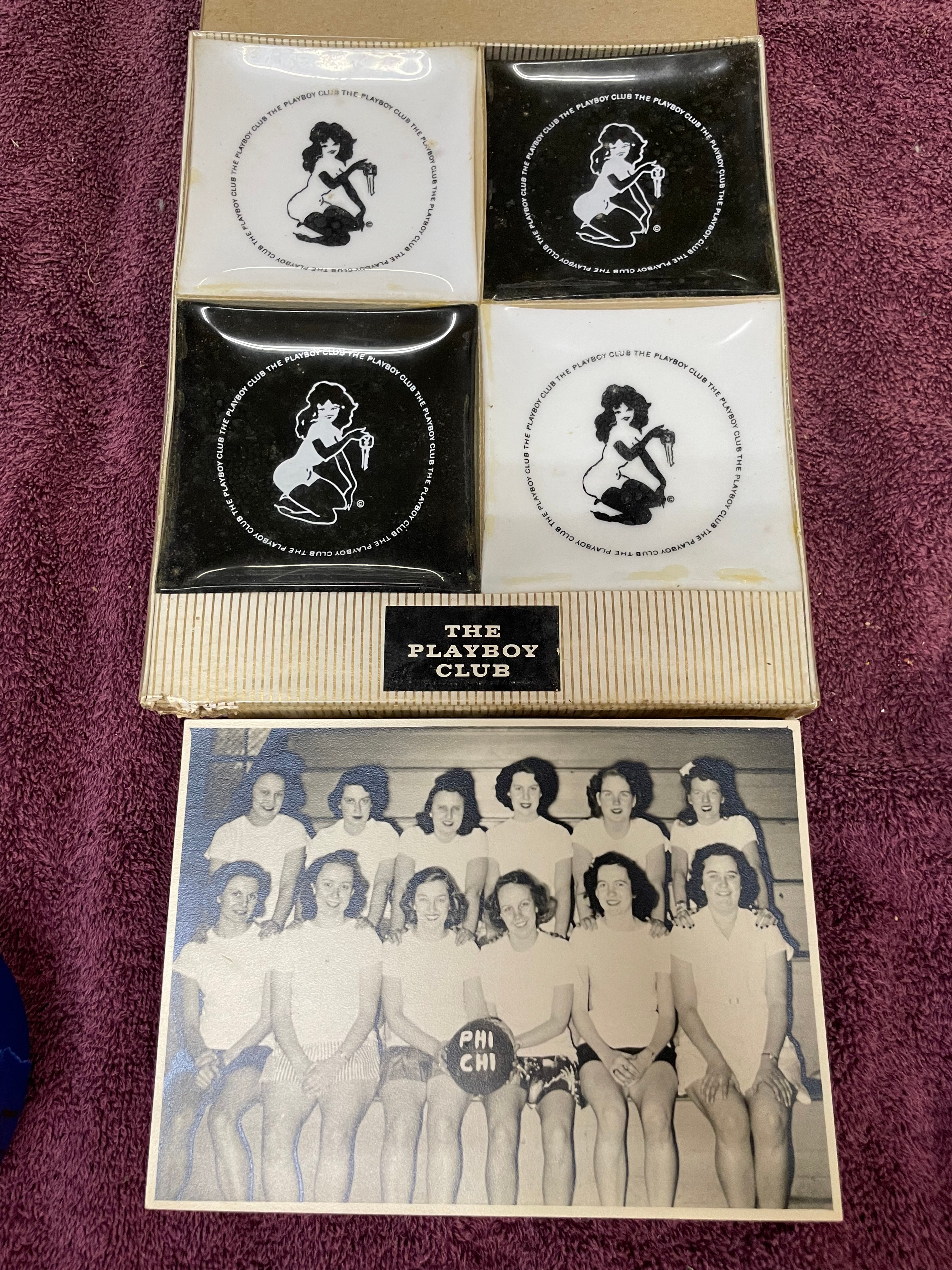 A set of four Playboy Club ashtrays, two white with black graphics and two black with white graphics. Each ashtray depicts a stylized Playboy Bunny character holding a key, encircled by repeated "THE PLAYBOY CLUB" text. The ashtrays are presented in their original cardboard box, which prominently displays "THE PLAYBOY CLUB" on its front label. Also included is a black and white photographic print depicting approximately fourteen young women, with one in the foreground holding an object bearing the Greek letters "PHI CHI" (ΦΧ).