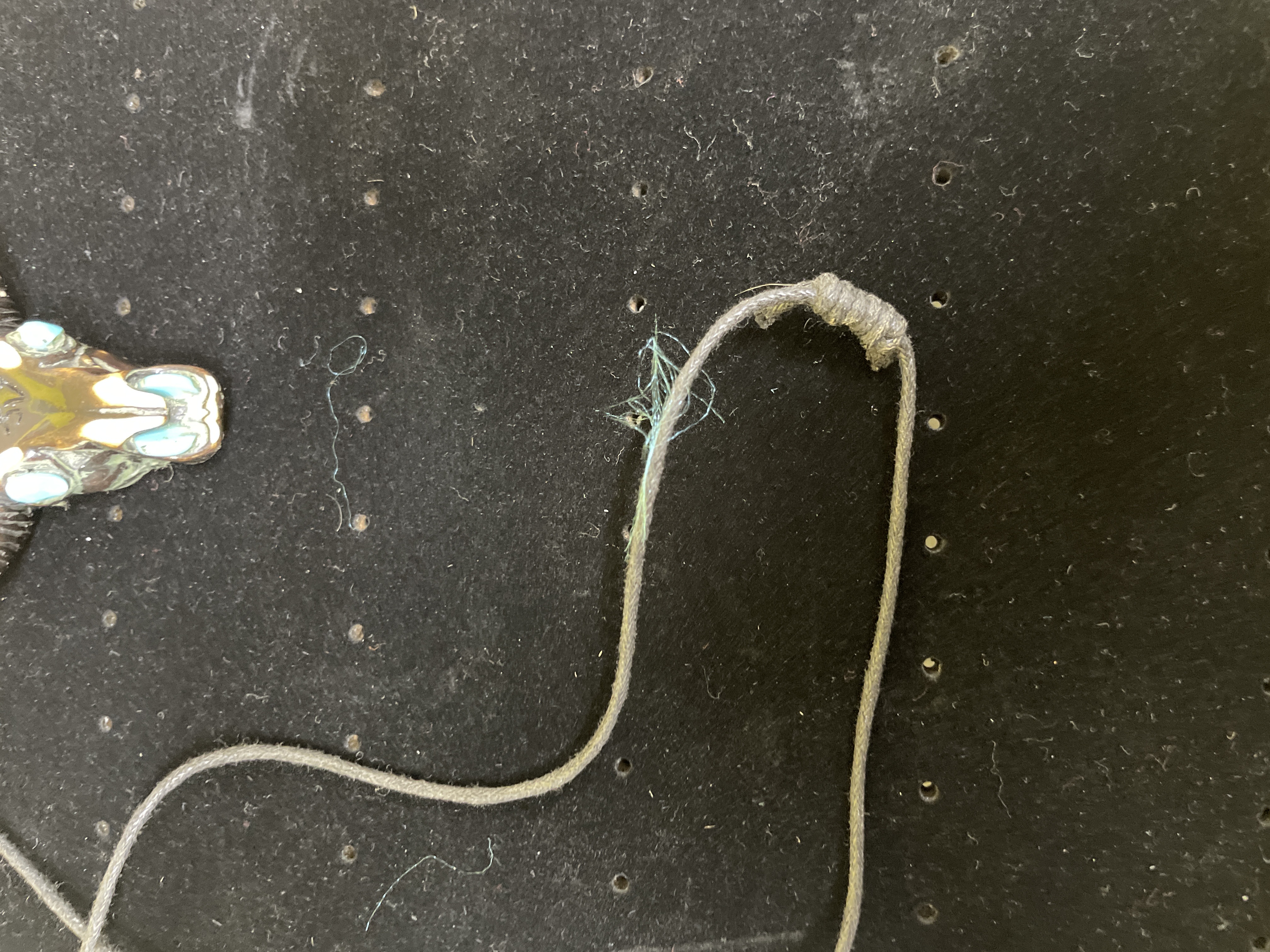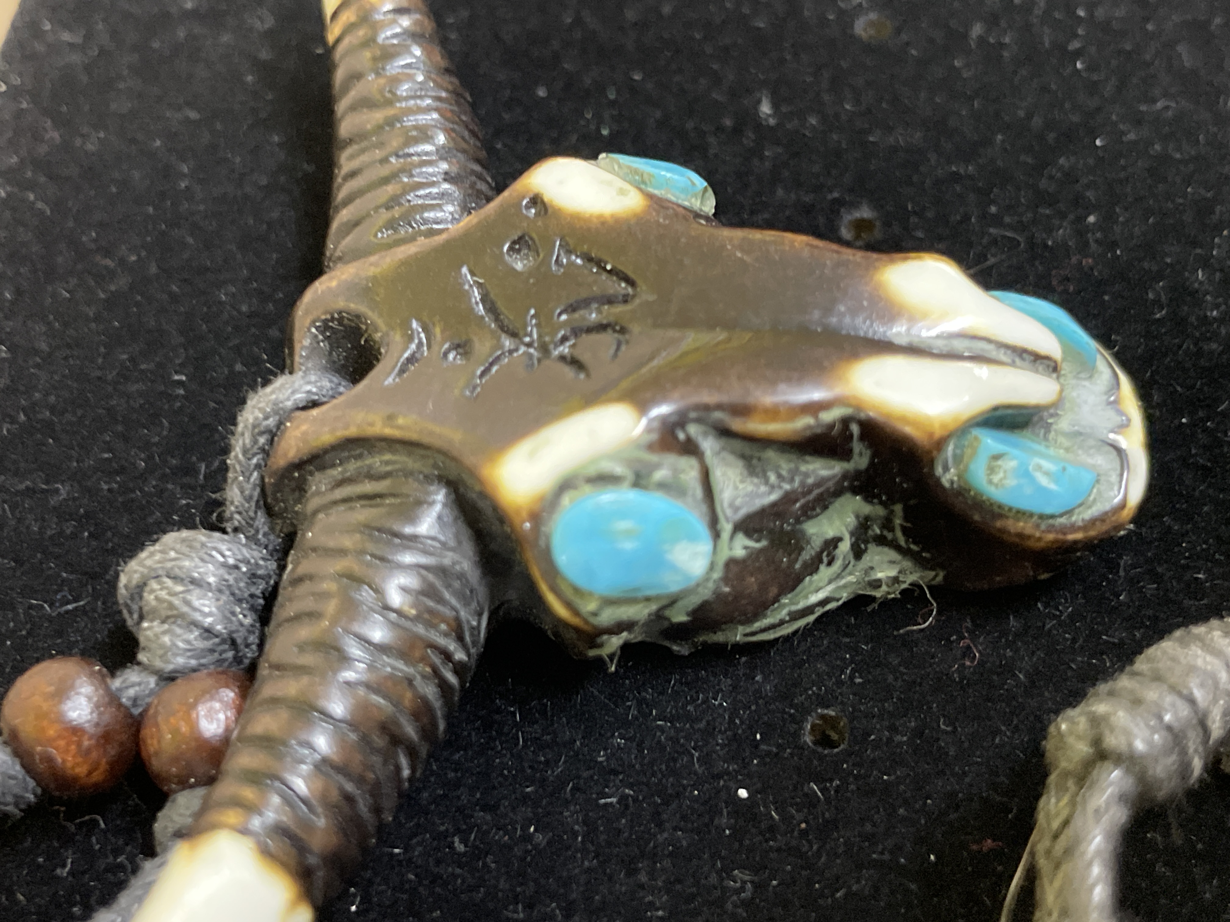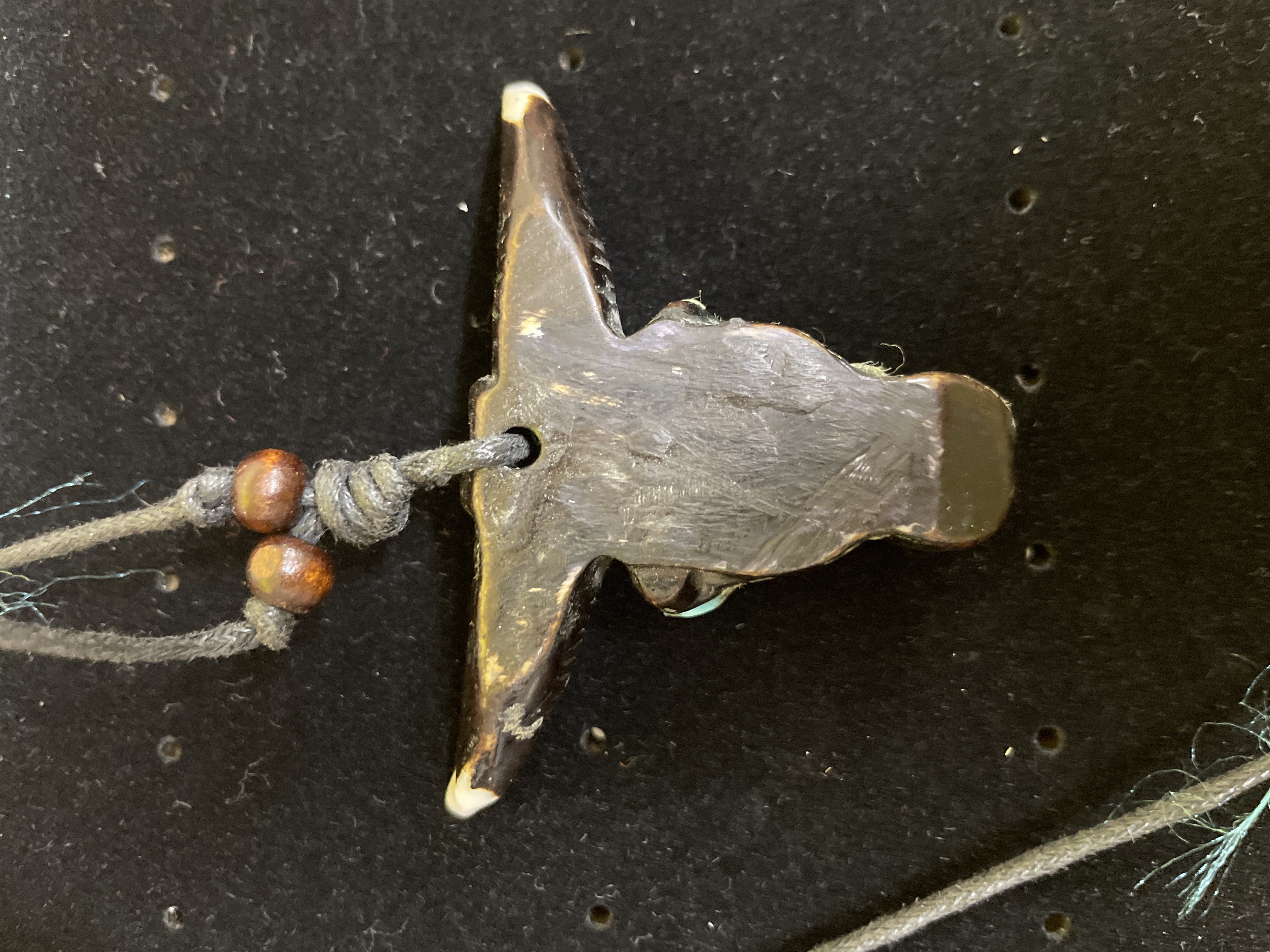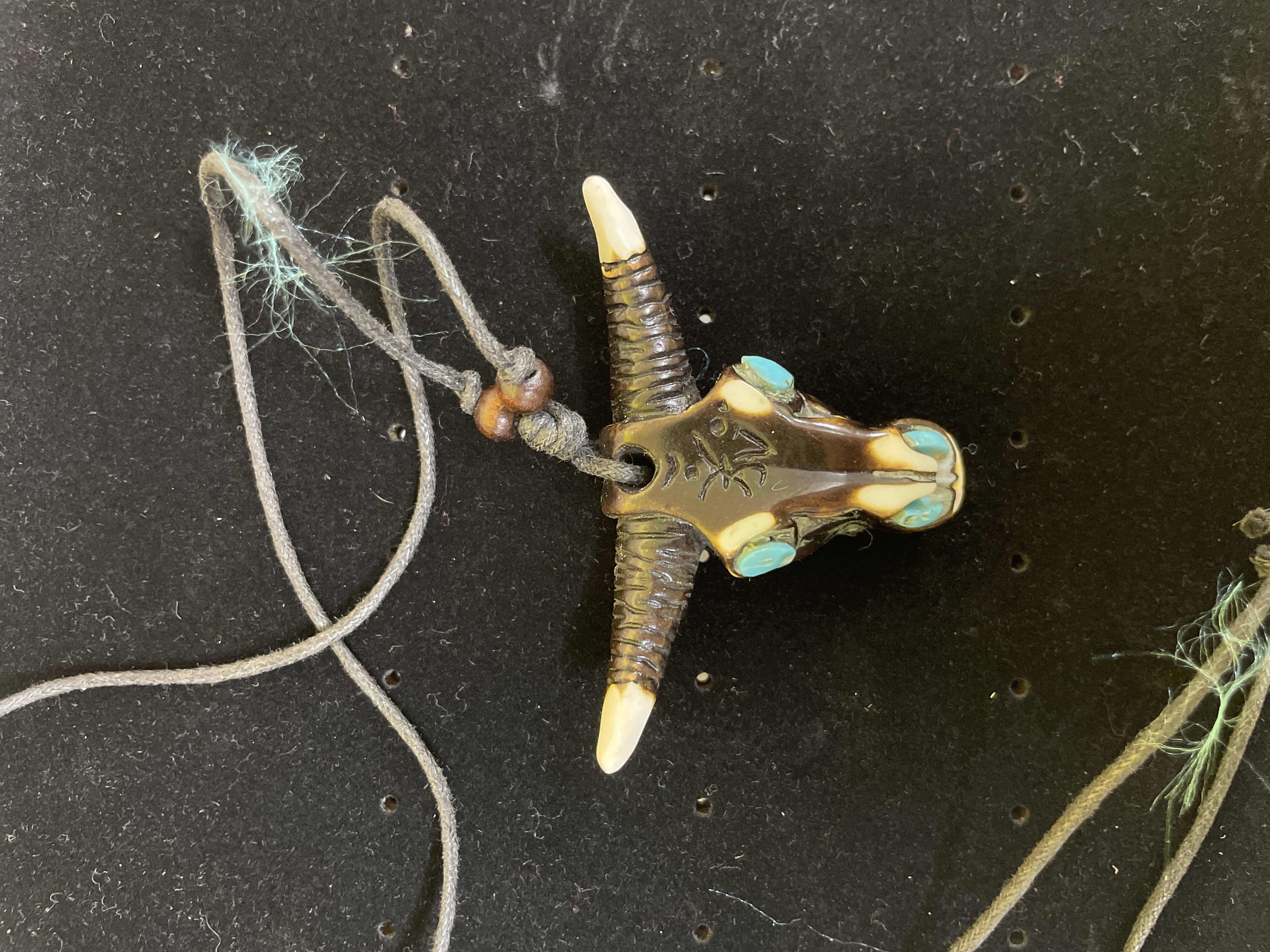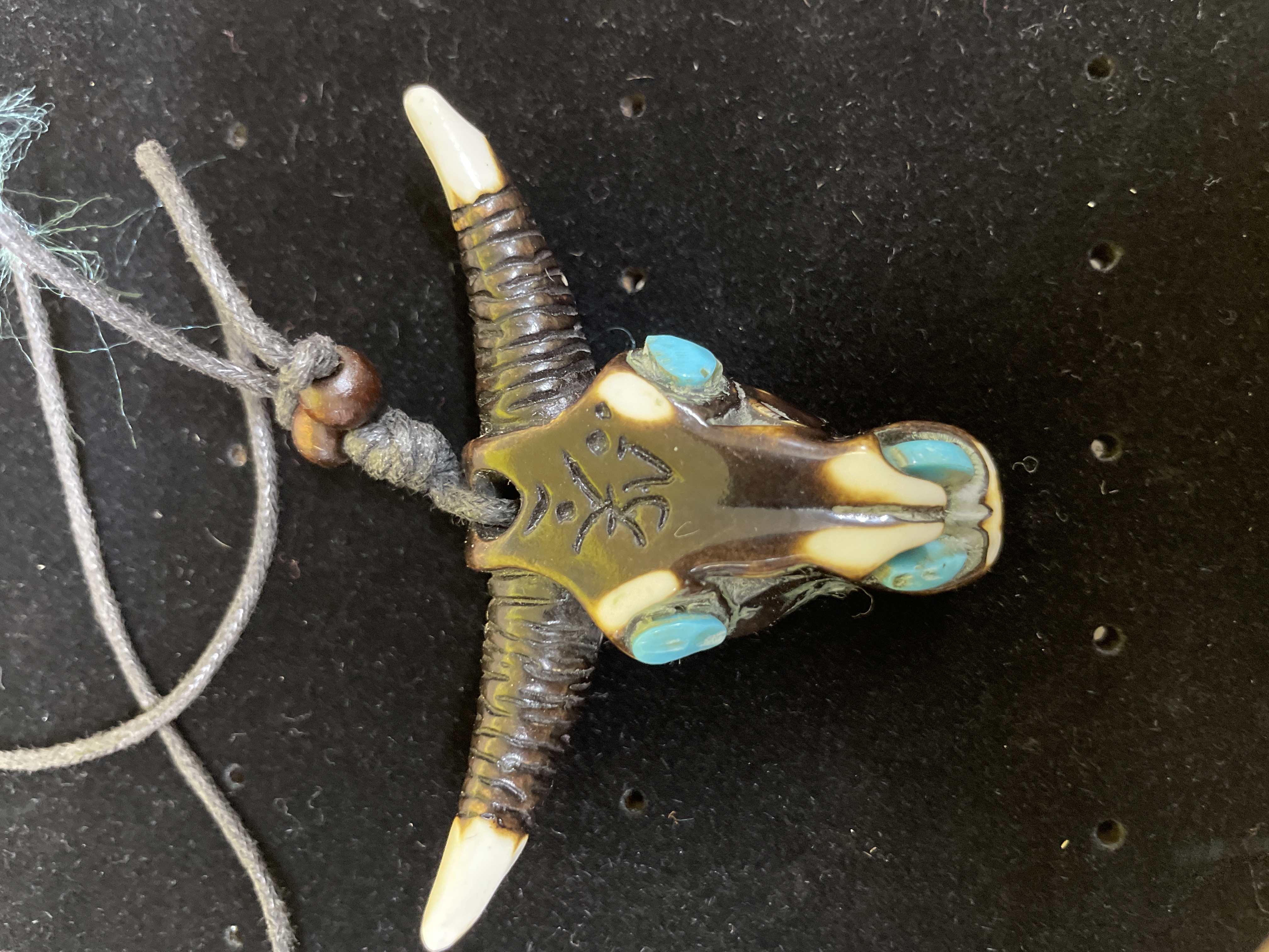 A necklace featuring a carved pendant depicting a horned animal skull, likely a bull or buffalo, with a polished finish in dark brown and off-white tones. The pendant incorporates turquoise-colored stone inlays for the eyes and snout details. A stylized Chinese character ‘牛’ (niú), translating to “ox” or “cow, ” is carved into the forehead. It is suspended from a grey braided textile cord, accented with small round wooden beads near the pendant, featuring adjustable knots.