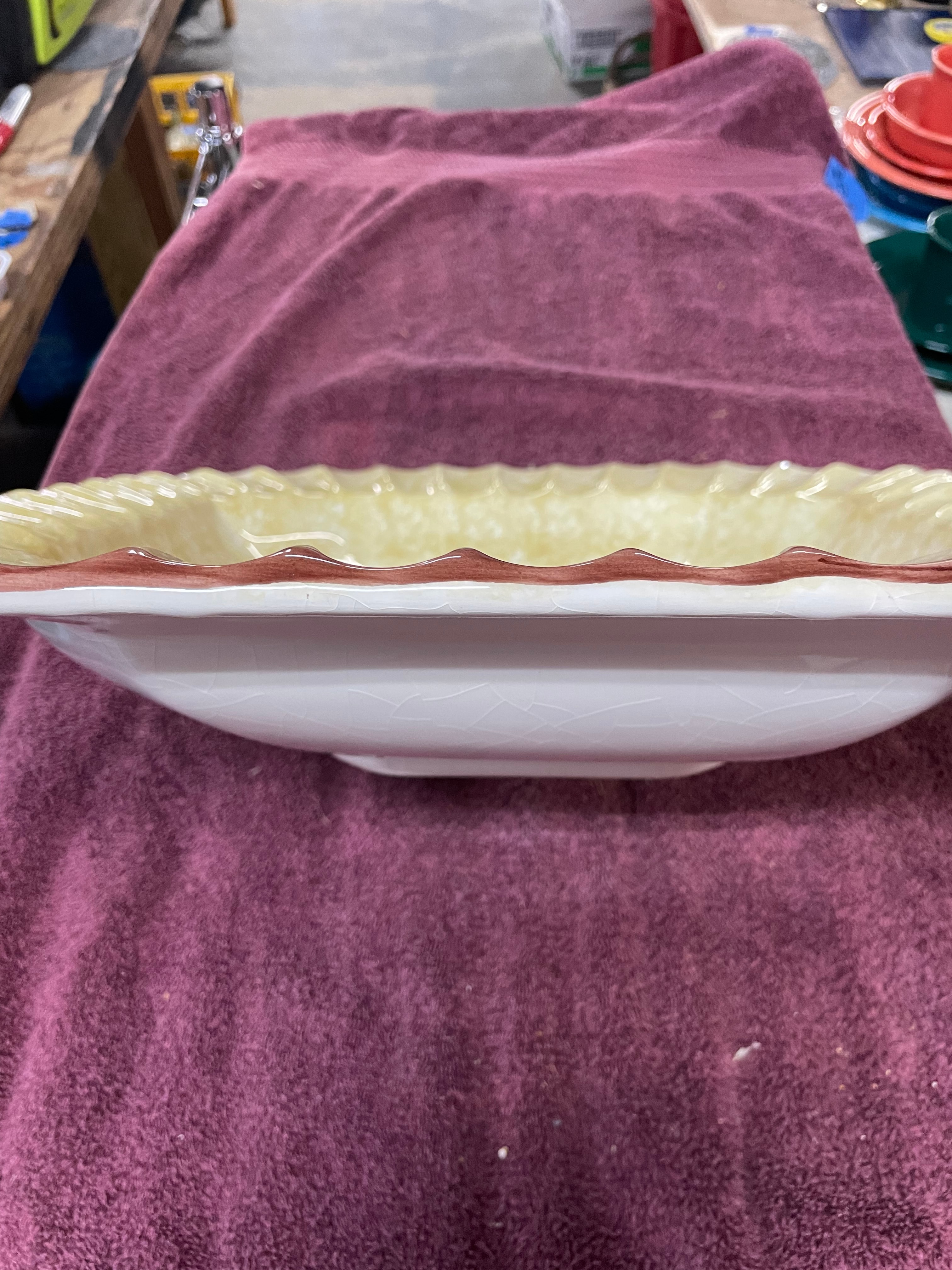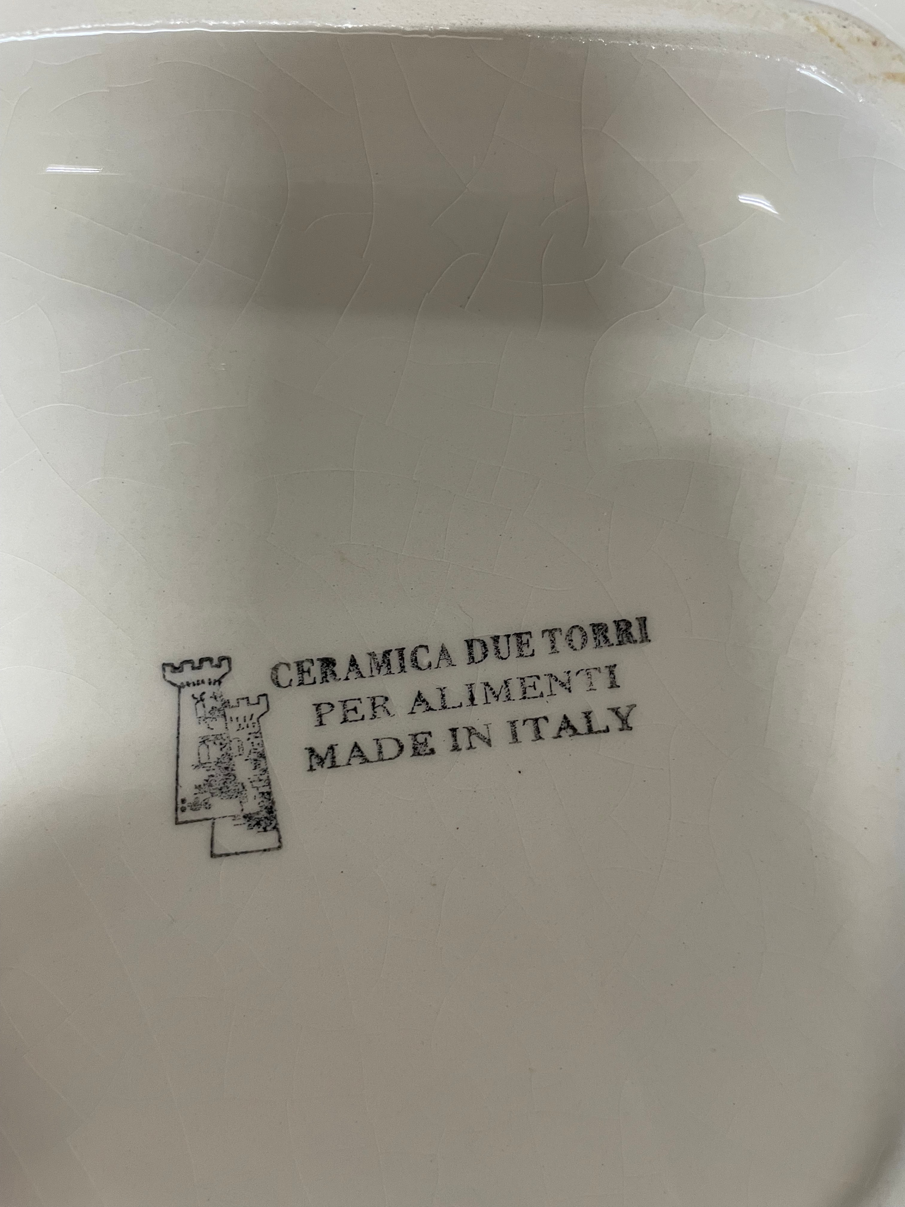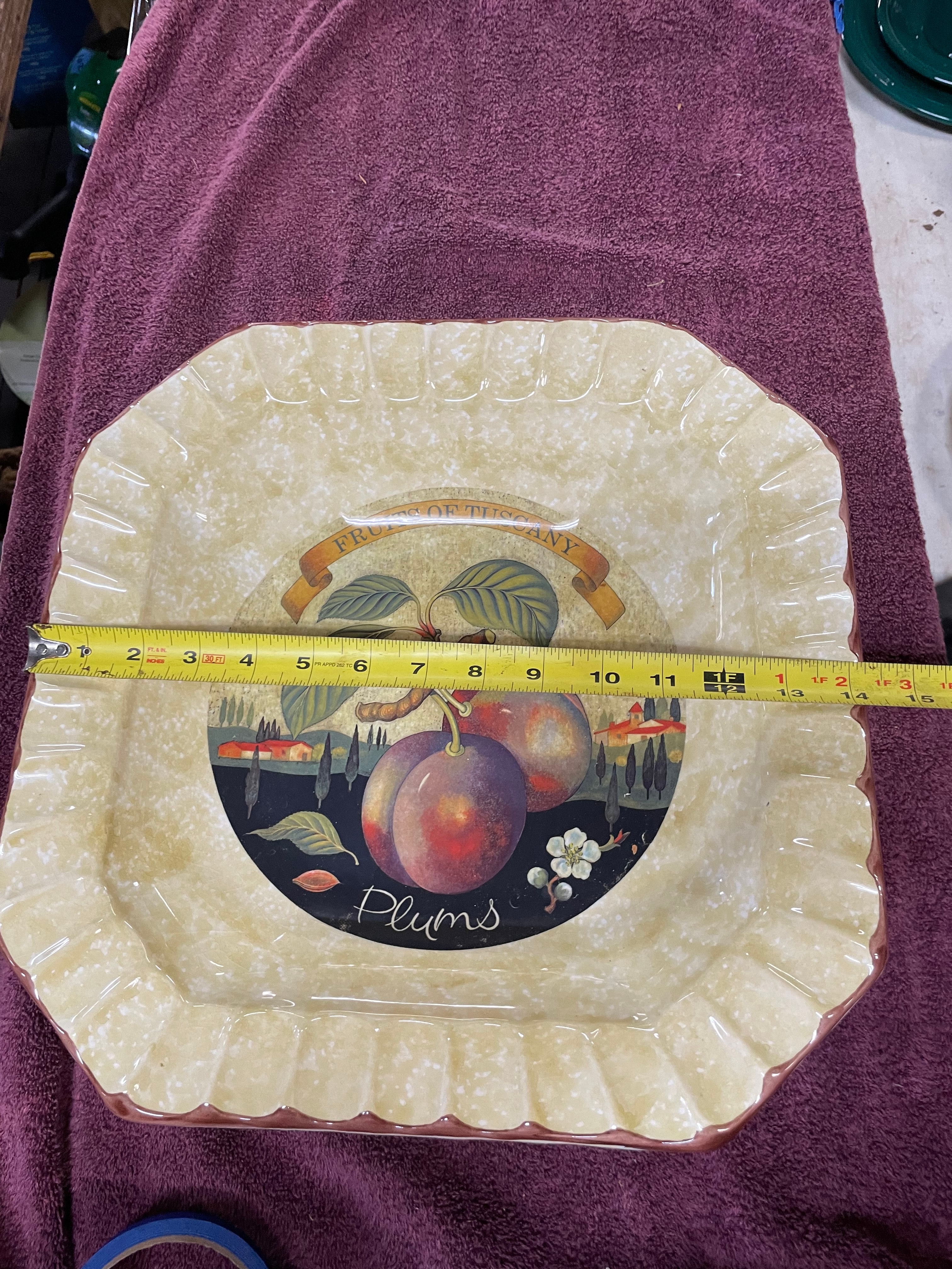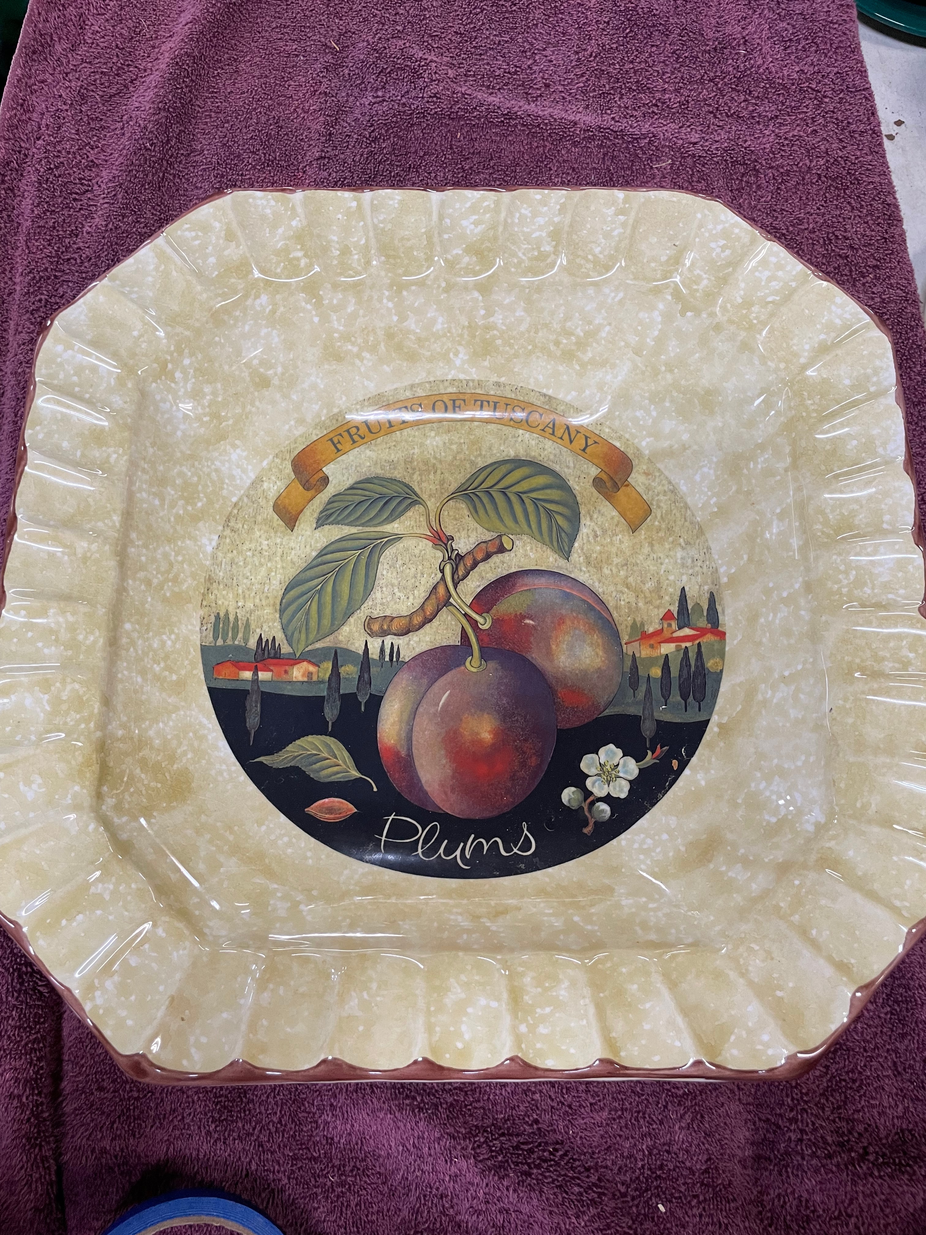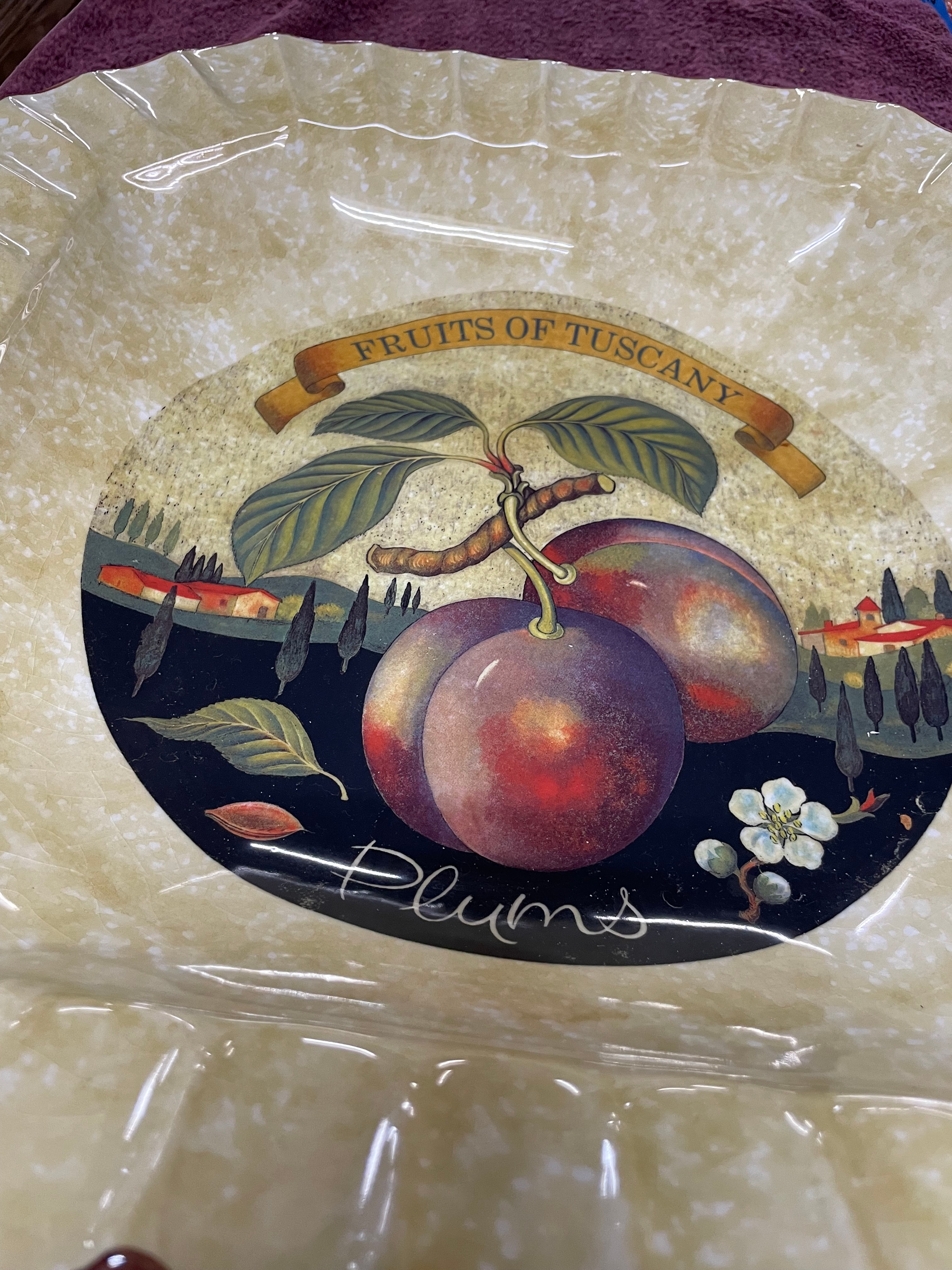A Ceramica Due Torri ‘Fruits of Tuscany’ octagonal ceramic pasta bowl. The bowl features a scalloped rim and a central transfer-printed design depicting two plums on a branch, set against a stylized Tuscan landscape with houses and cypress trees. The design is labeled "Plums" and topped with a banner reading "FRUITS OF TUSCANY." The primary glaze is a speckled cream, complemented by a reddish-brown trim on the outer edge. The underside bears the maker’s mark, a castle-like logo of two towers, alongside the text "CERAMICA DUE TORRI, " "PER ALIMENTI" (For Food), and "MADE IN ITALY."