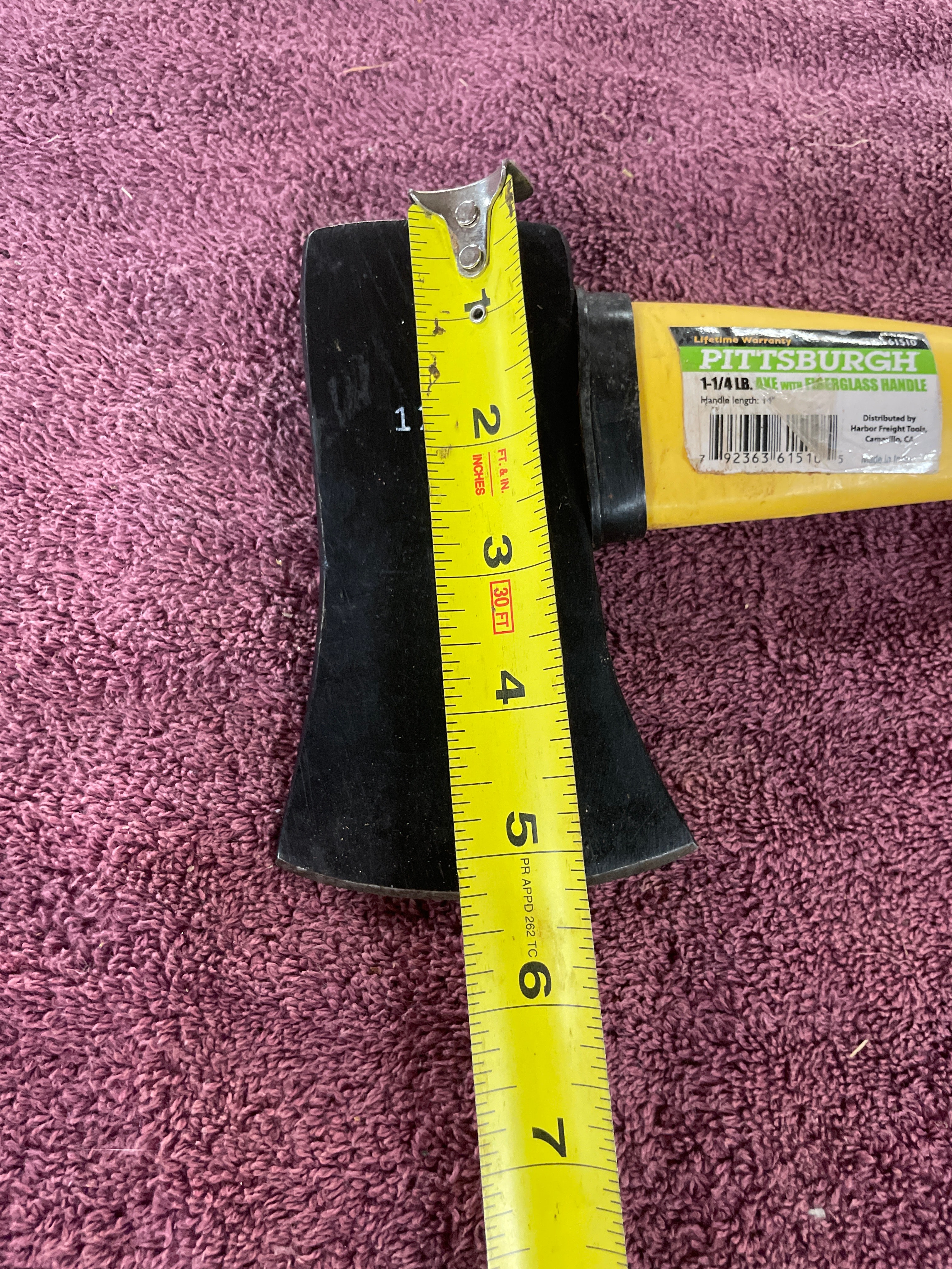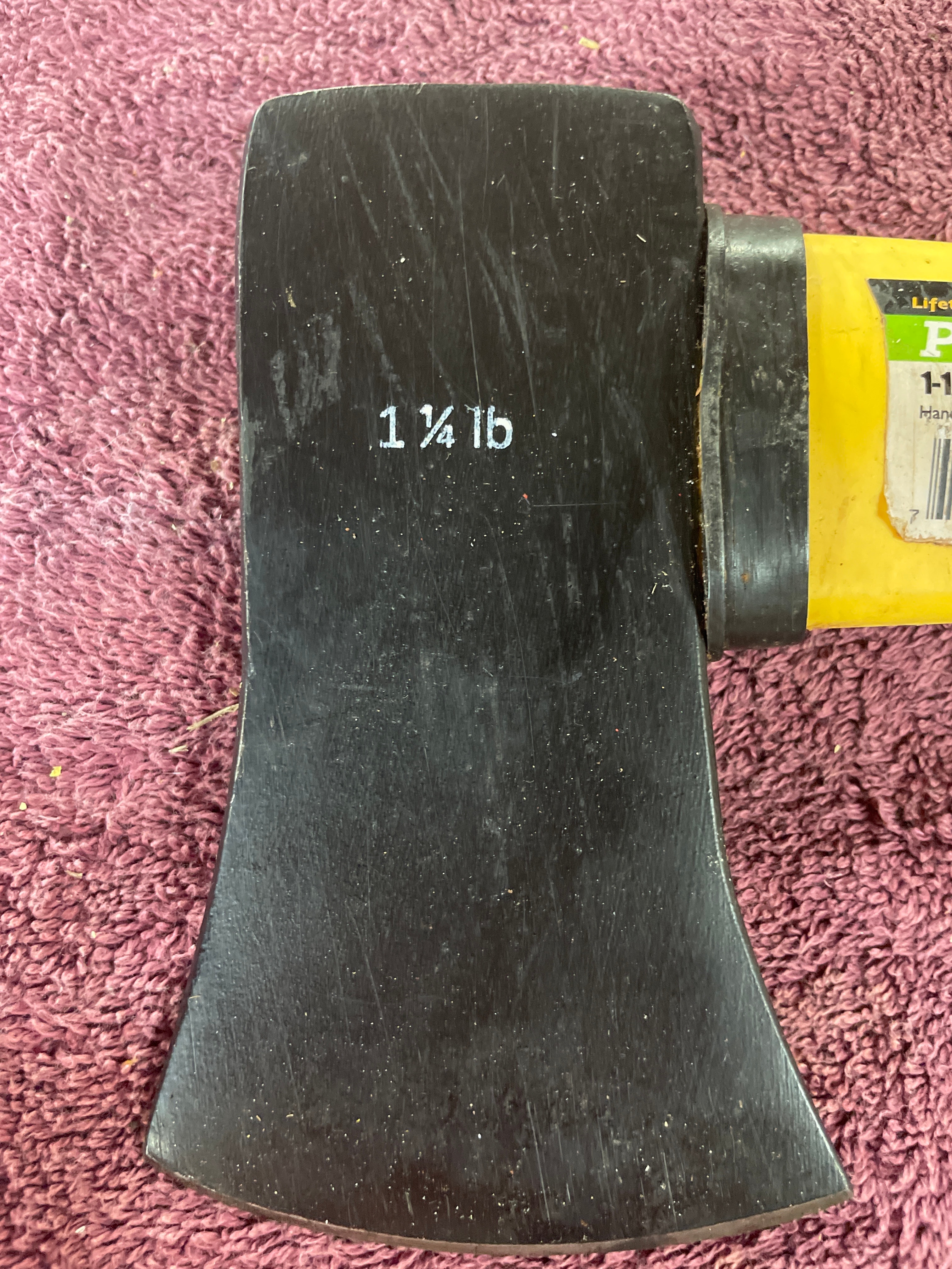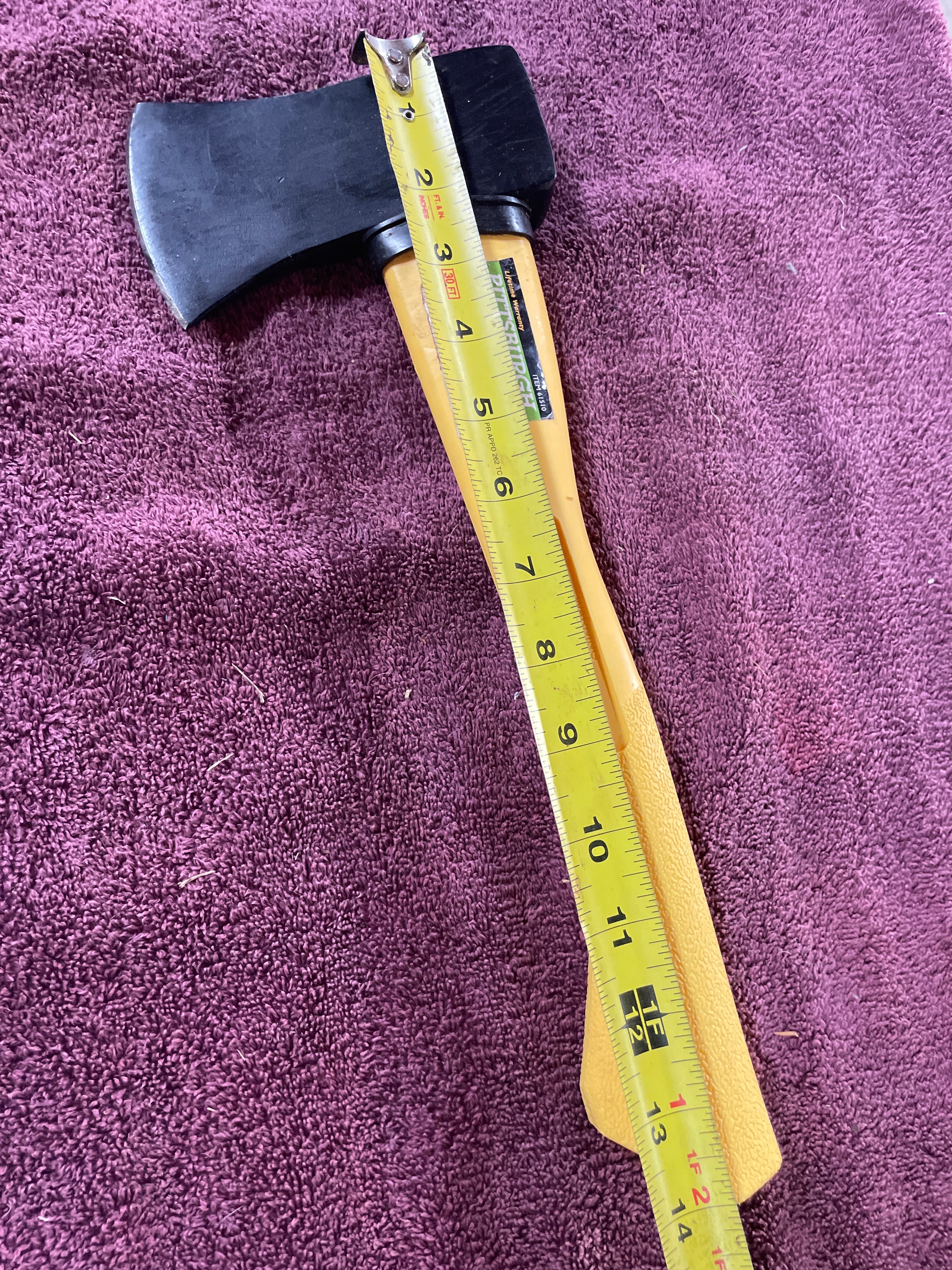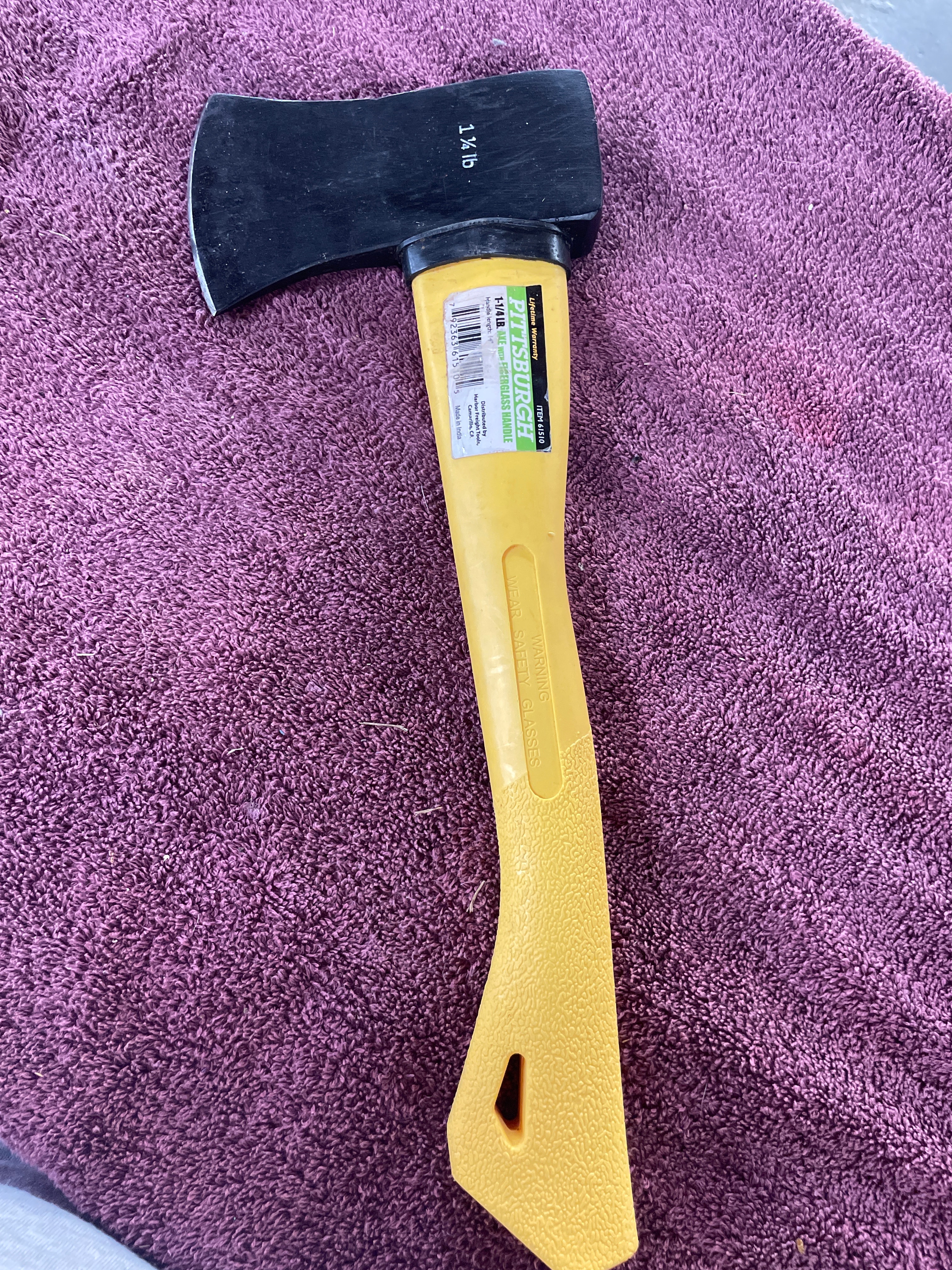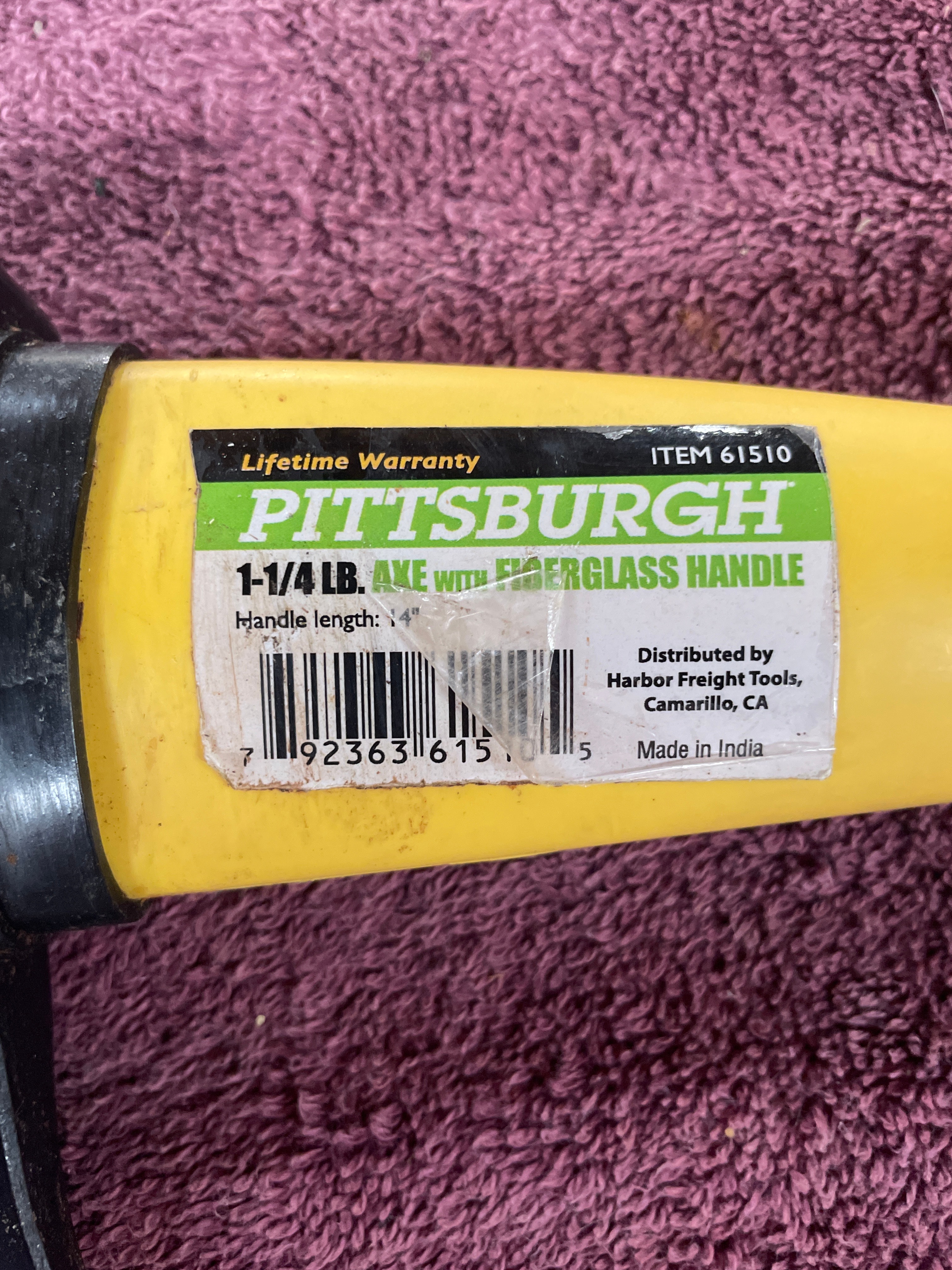 A black and yellow Pittsburgh 1-1/4 LB. axe with a 14-inch fiberglass handle, marked ‘ITEM 61510’ and ‘Made in India’.