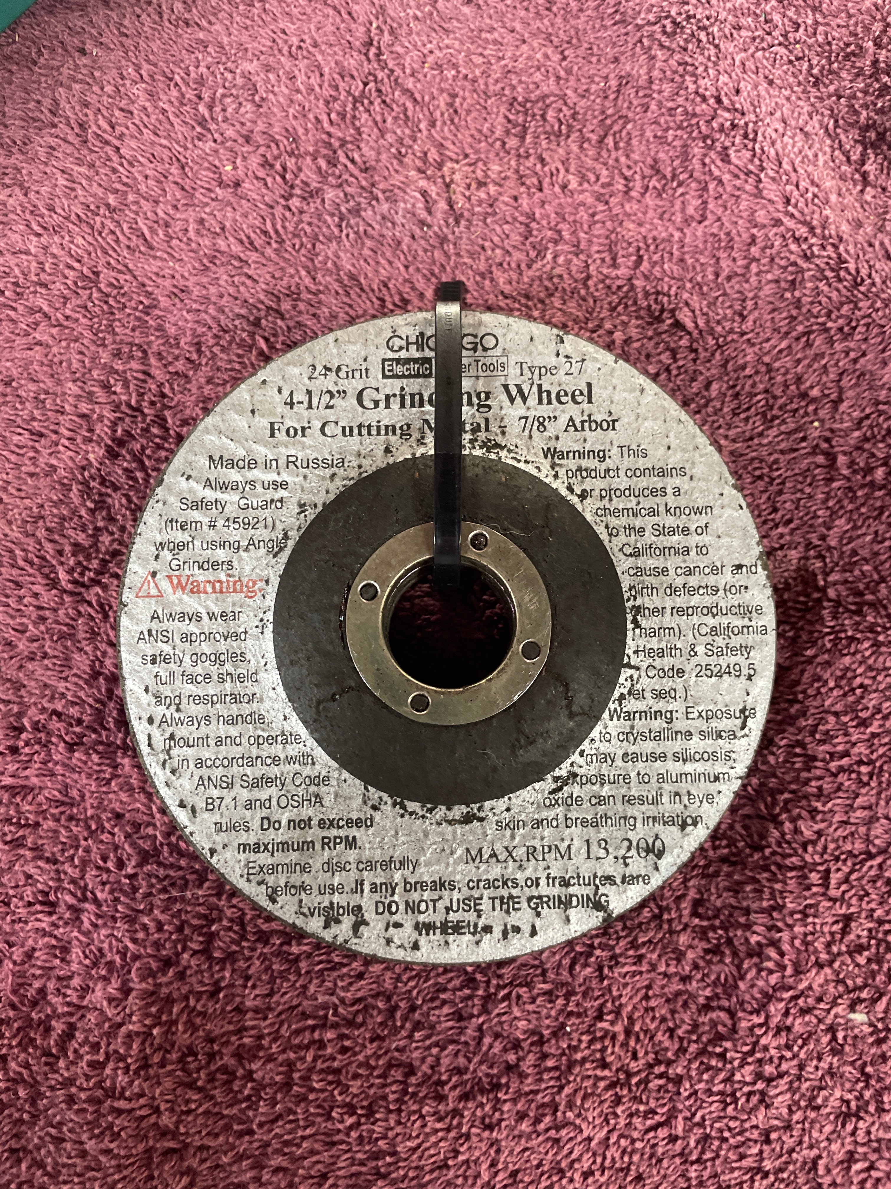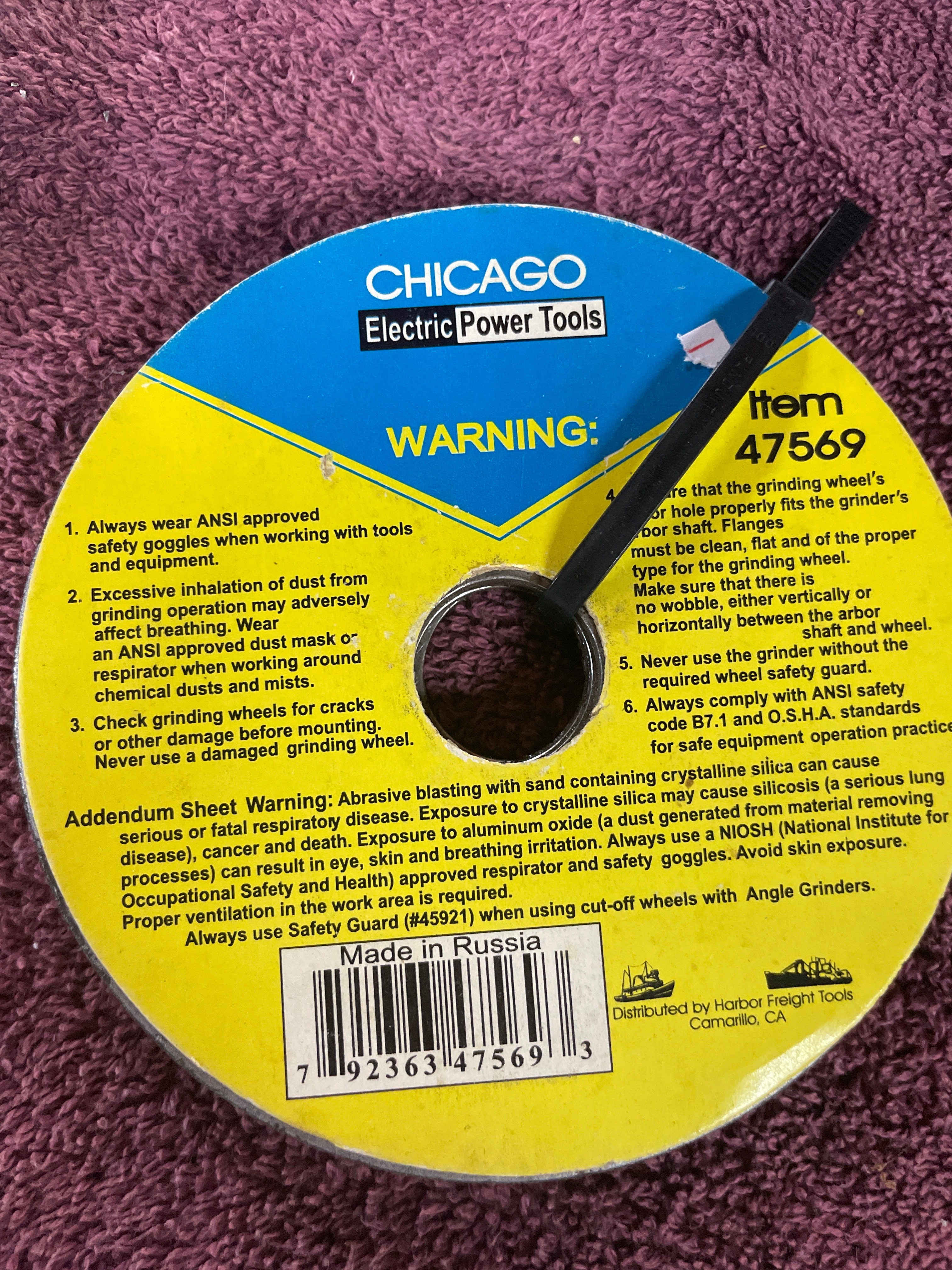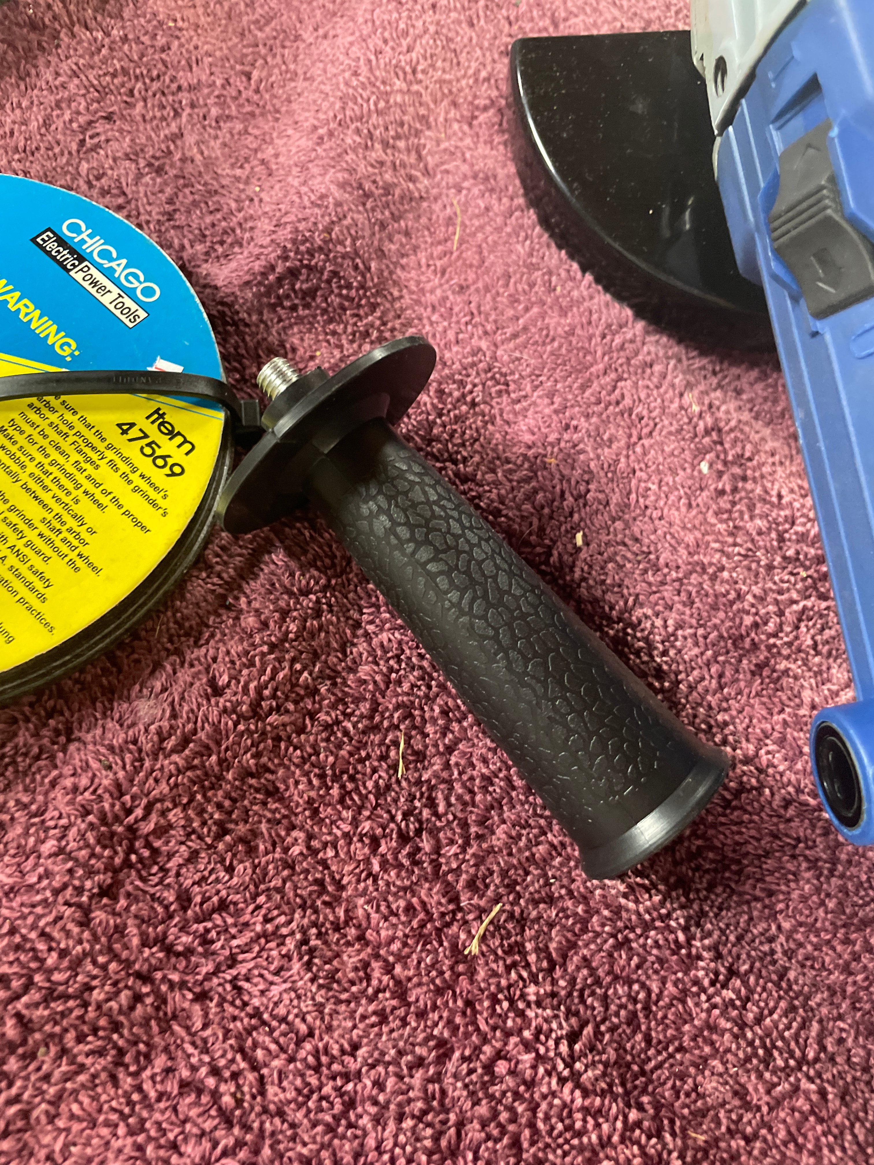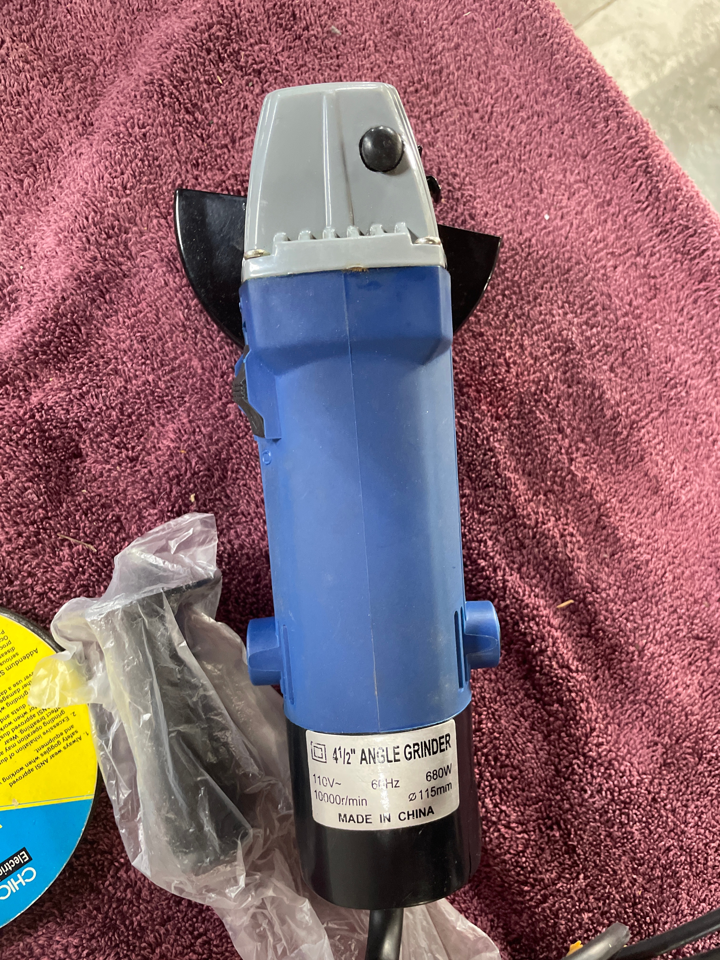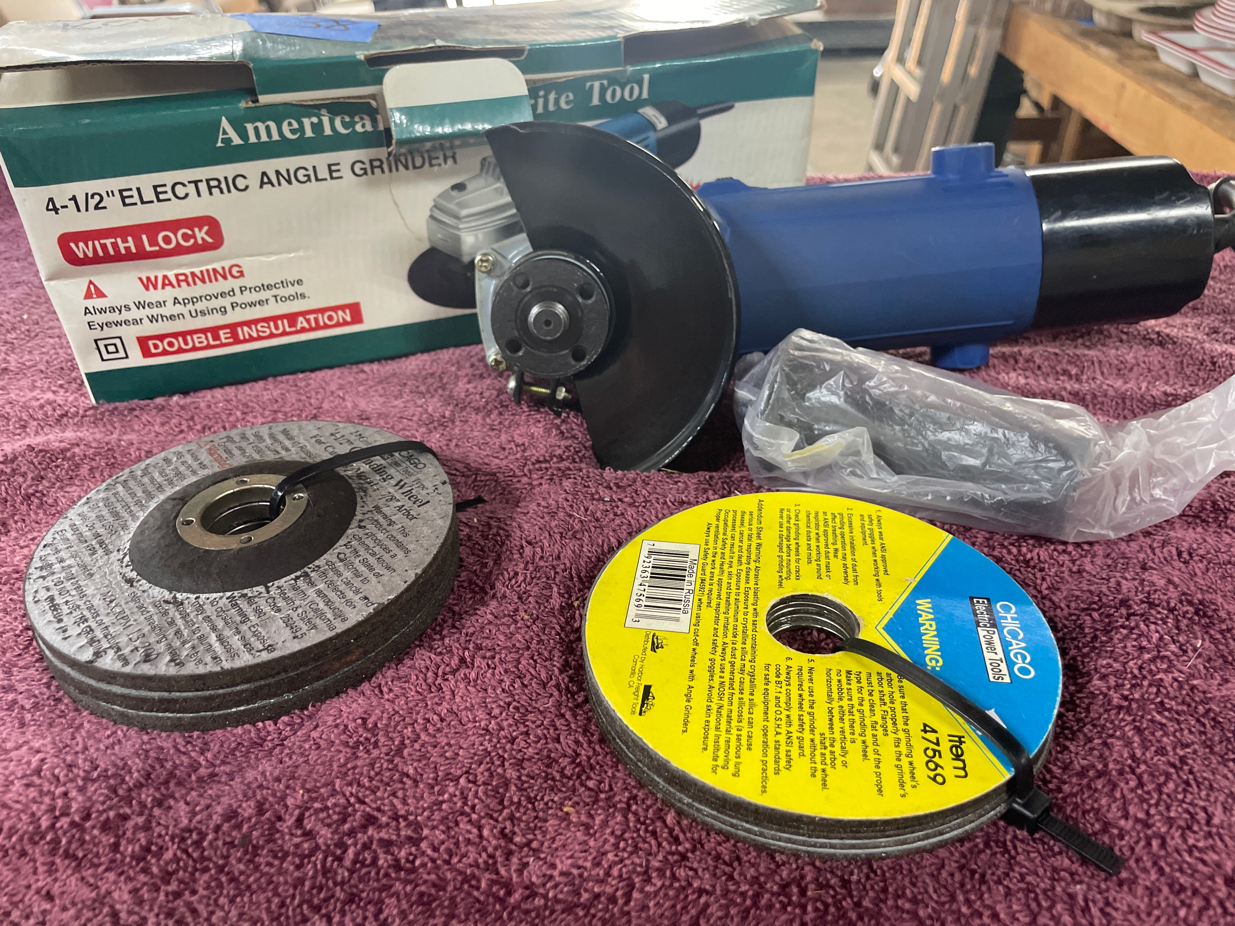 A blue, black, and gray “American Favourite Tool” 4-1/2″ electric angle grinder (680W, 10000r/min, Made in China) with its box and two silver wrenches, three gray “CHICAGO Electric Power Tools” 4-1/2″ grinding wheels (24 Grit, Made in Russia), and five yellow/blue “CHICAGO Electric Power Tools” cut-off wheels (Item 47569, Made in Russia).