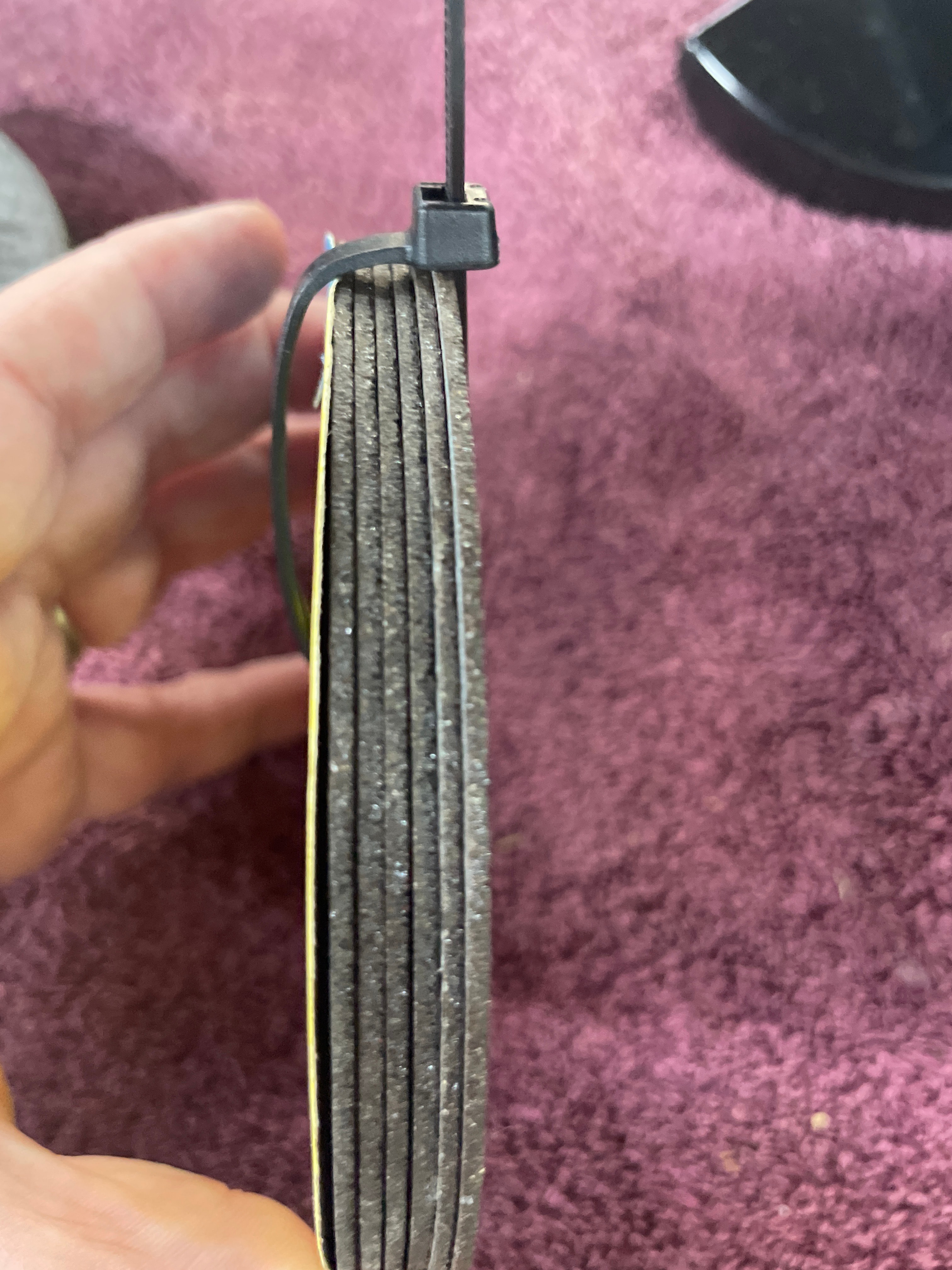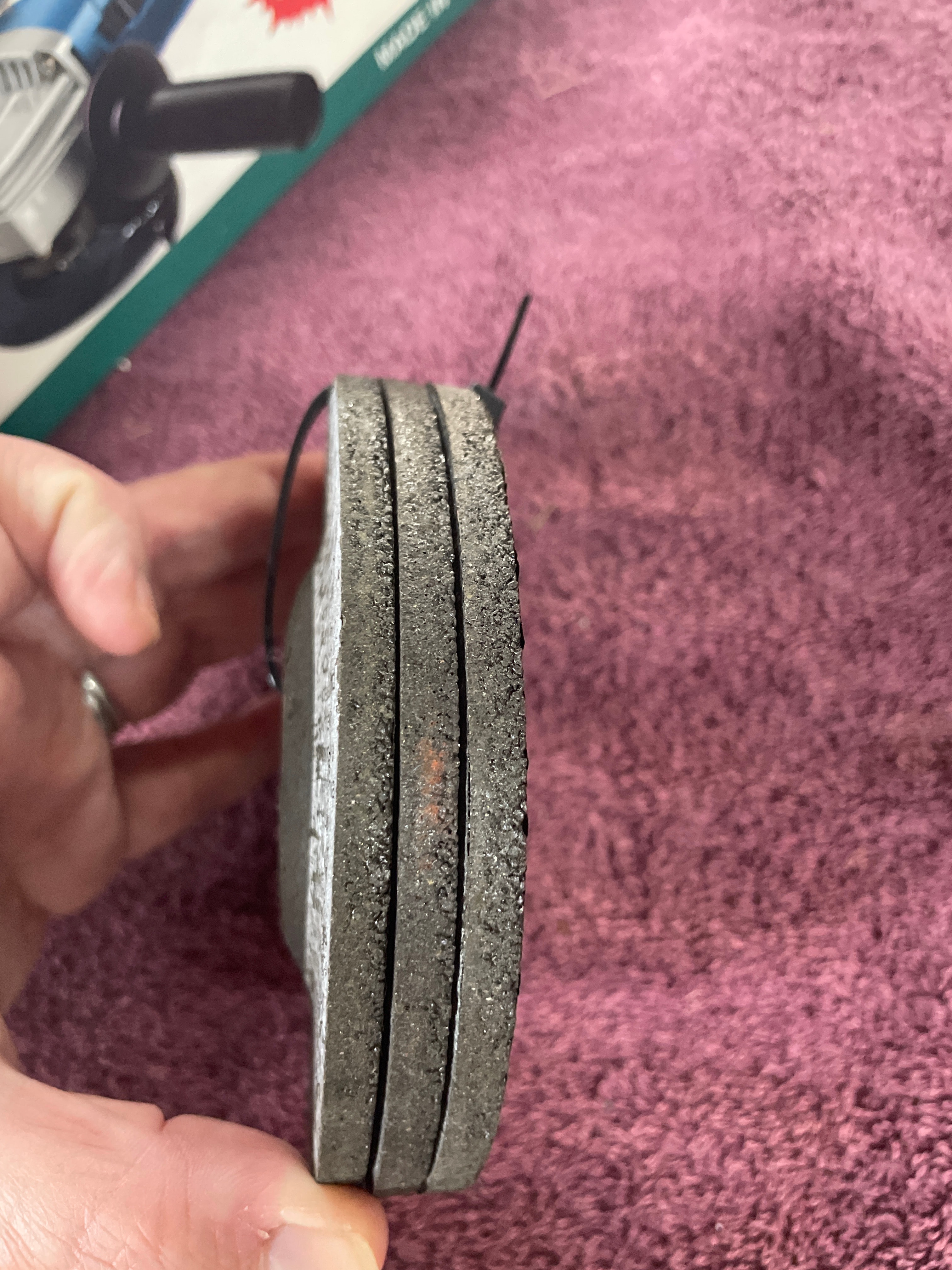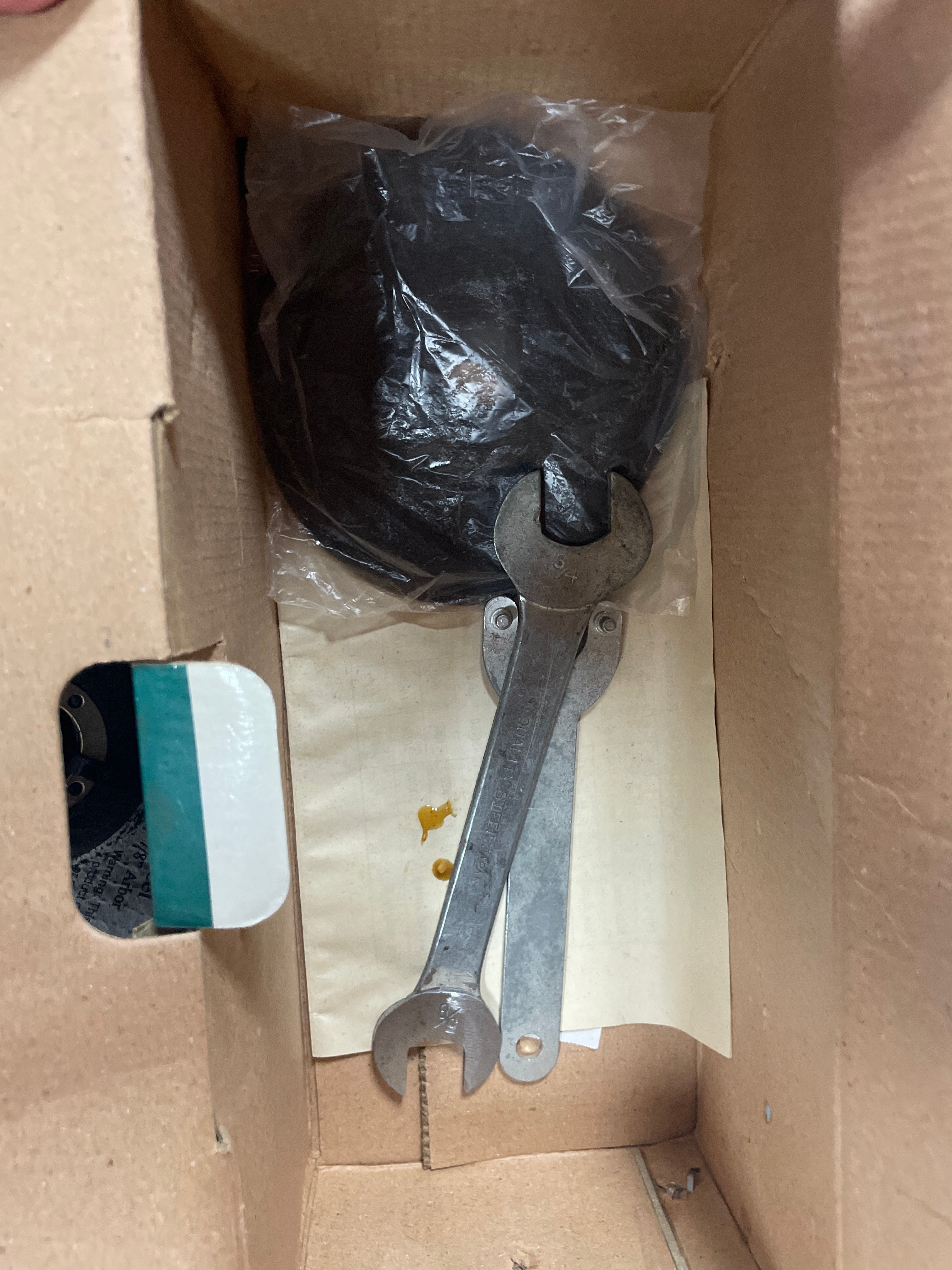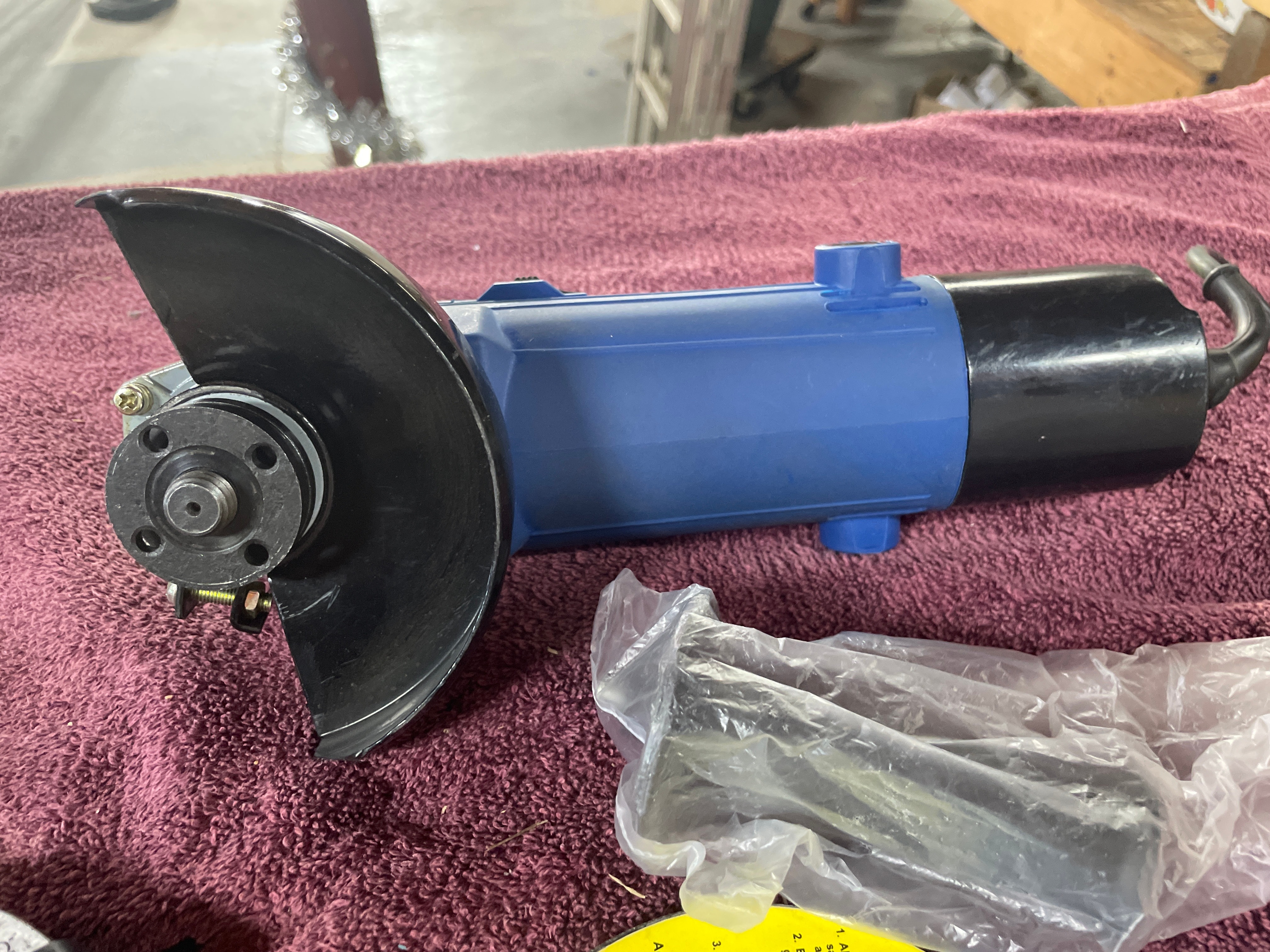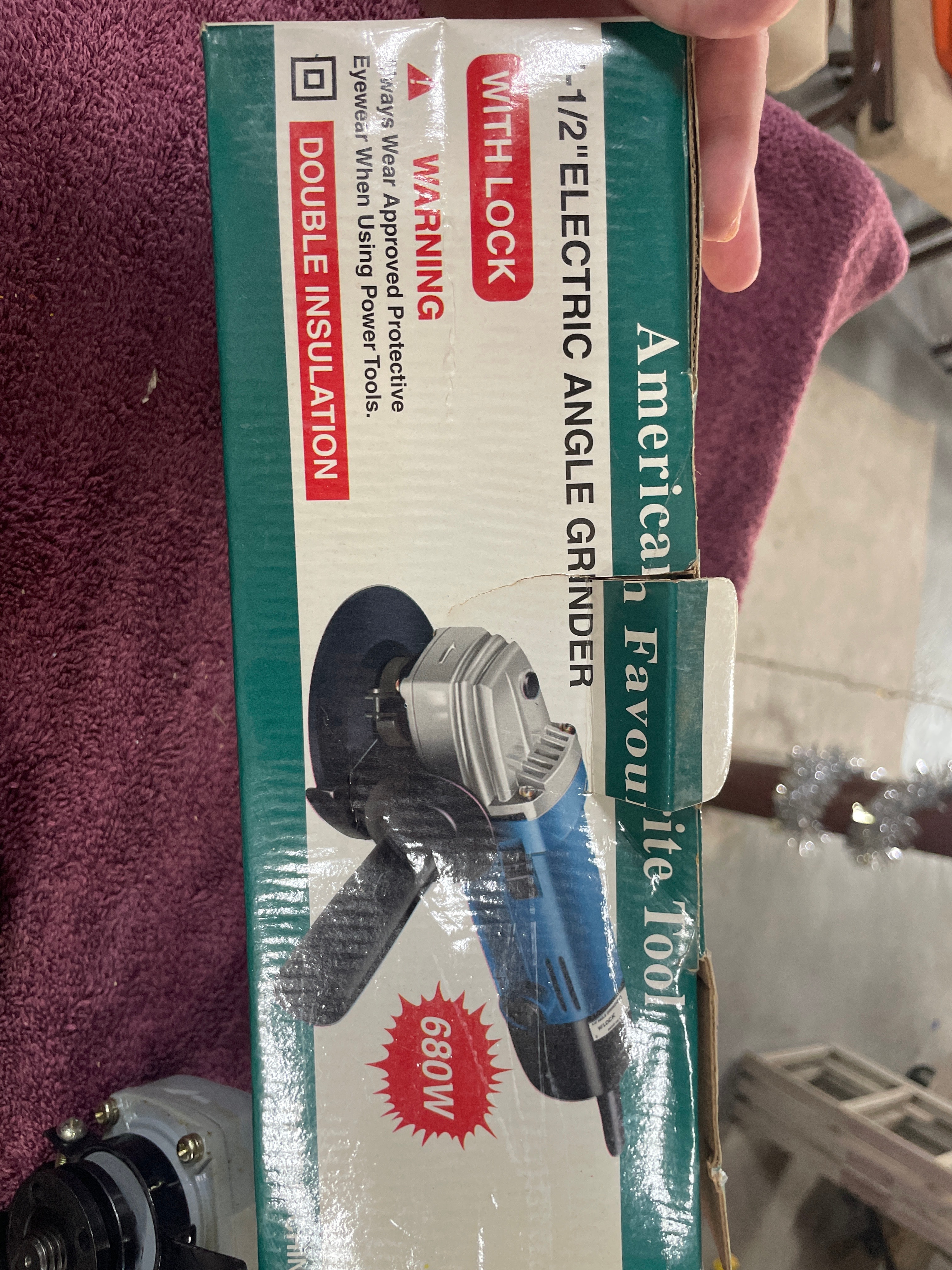 A blue, black, and gray “American Favourite Tool” 4-1/2″ electric angle grinder (680W, 10000r/min, Made in China) with its box and two silver wrenches, three gray “CHICAGO Electric Power Tools” 4-1/2″ grinding wheels (24 Grit, Made in Russia), and five yellow/blue “CHICAGO Electric Power Tools” cut-off wheels (Item 47569, Made in Russia).