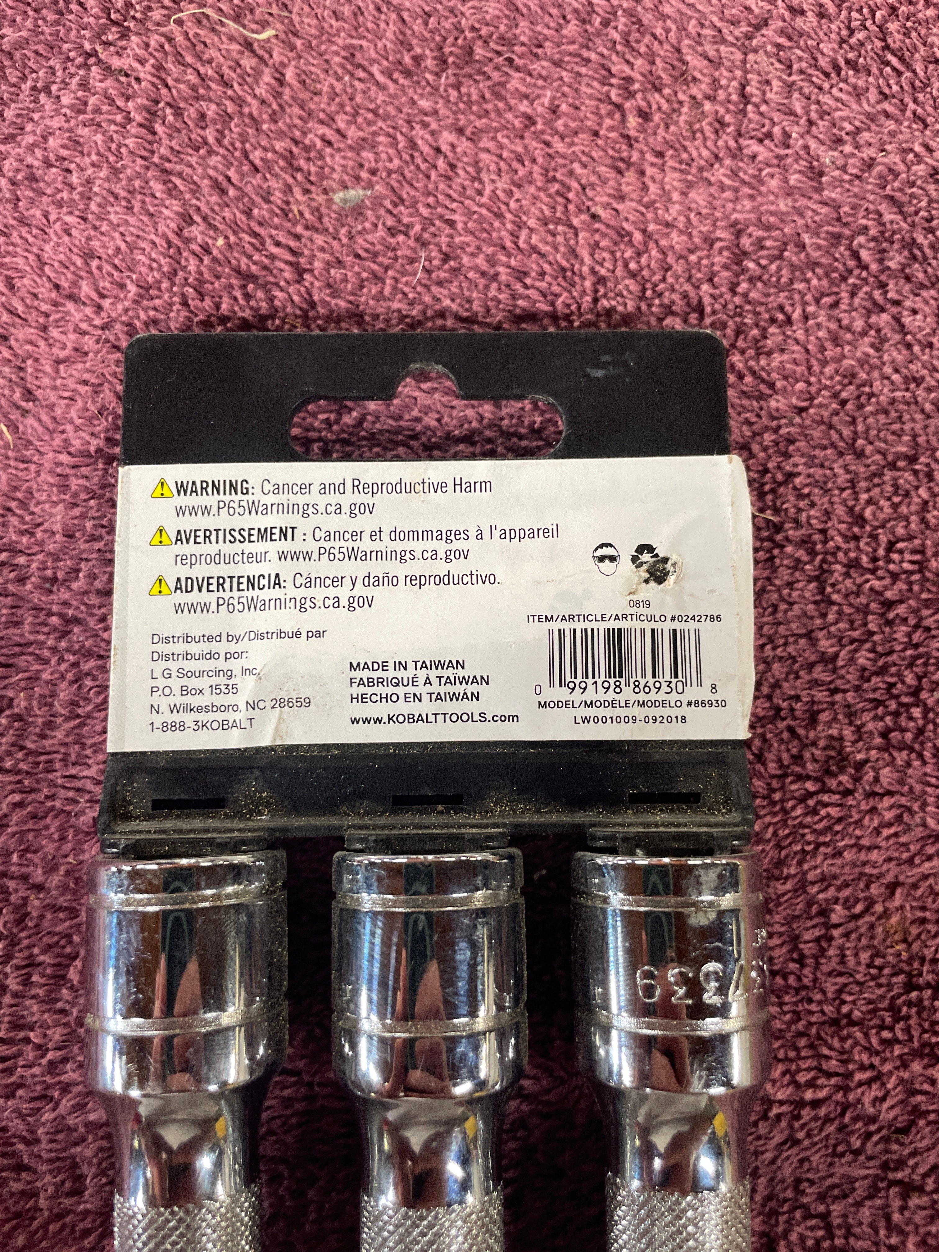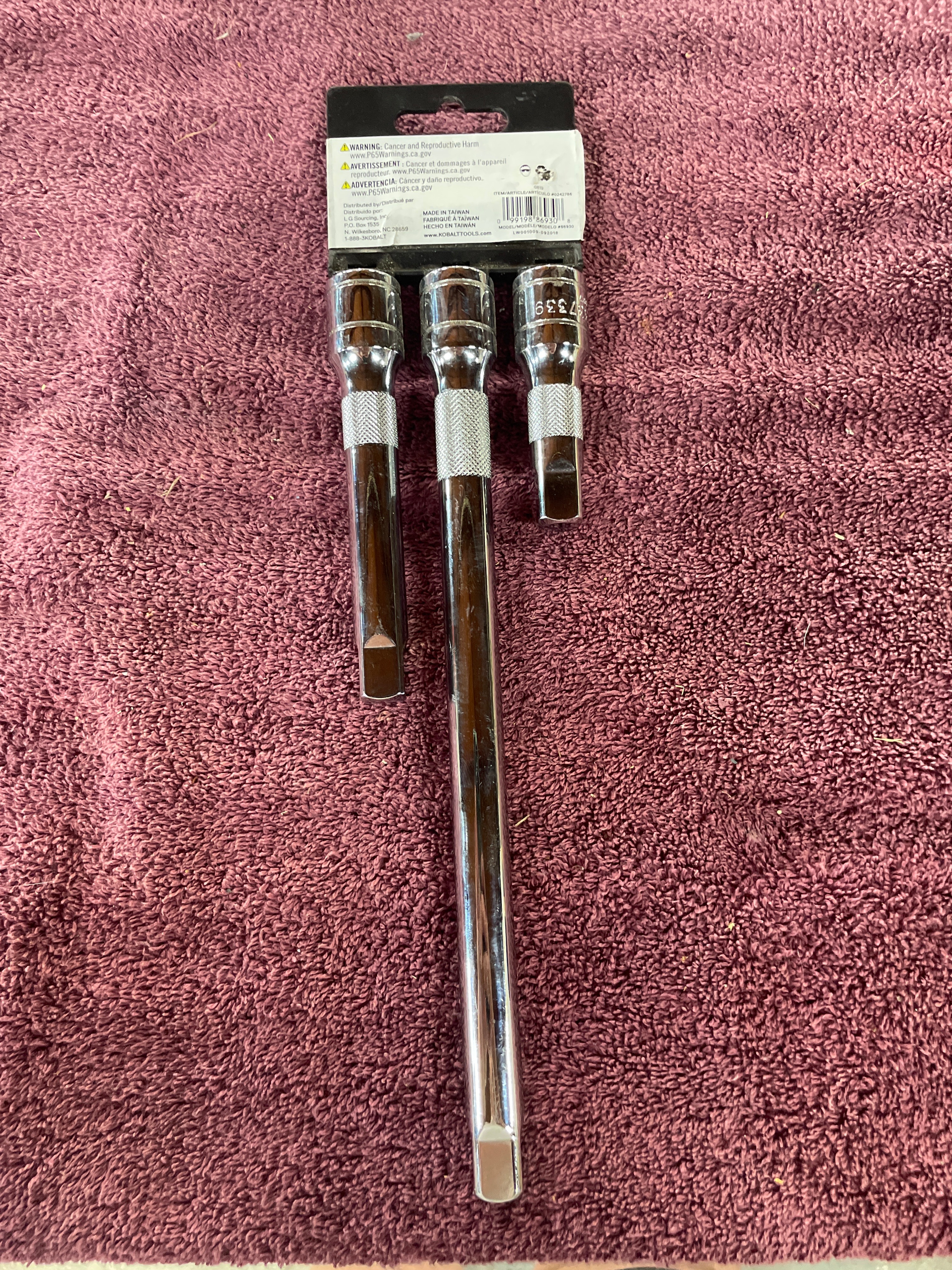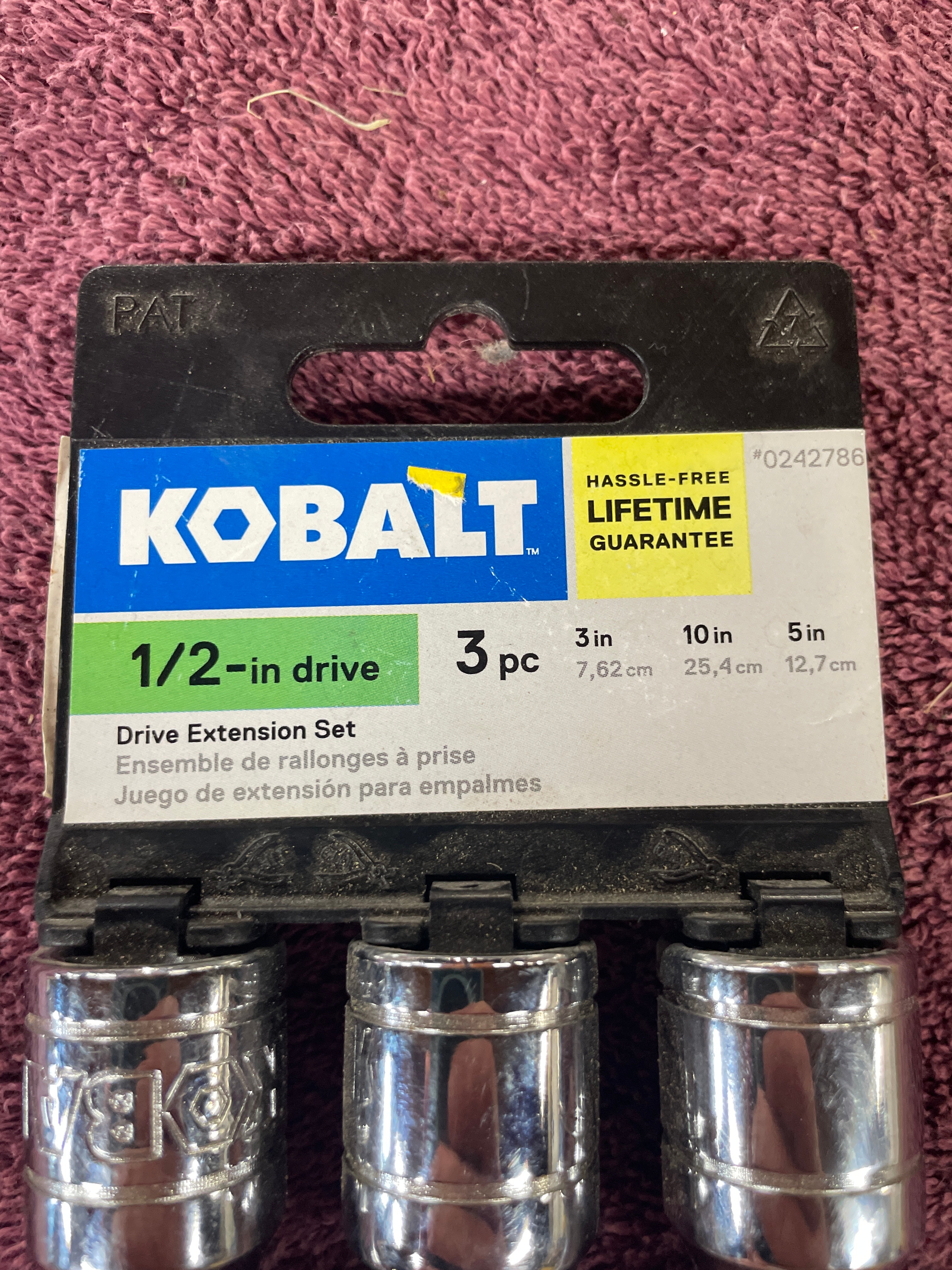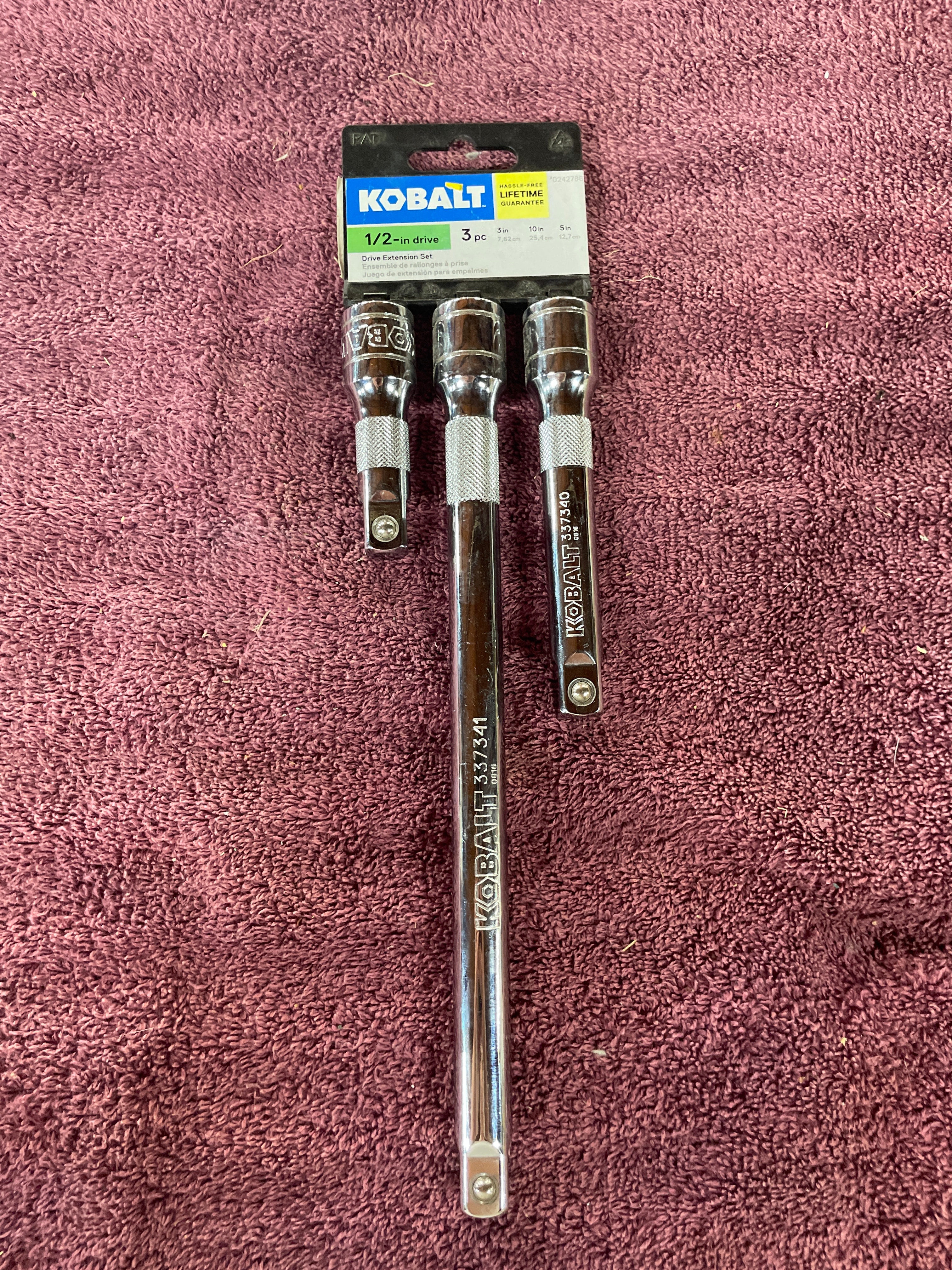 Three chrome Kobalt 1/2-inch drive tool extensions, a 3 pc set with 3 in, 10 in, and 5 in lengths, Model #0242786, made in Taiwan, with a lifetime guarantee.