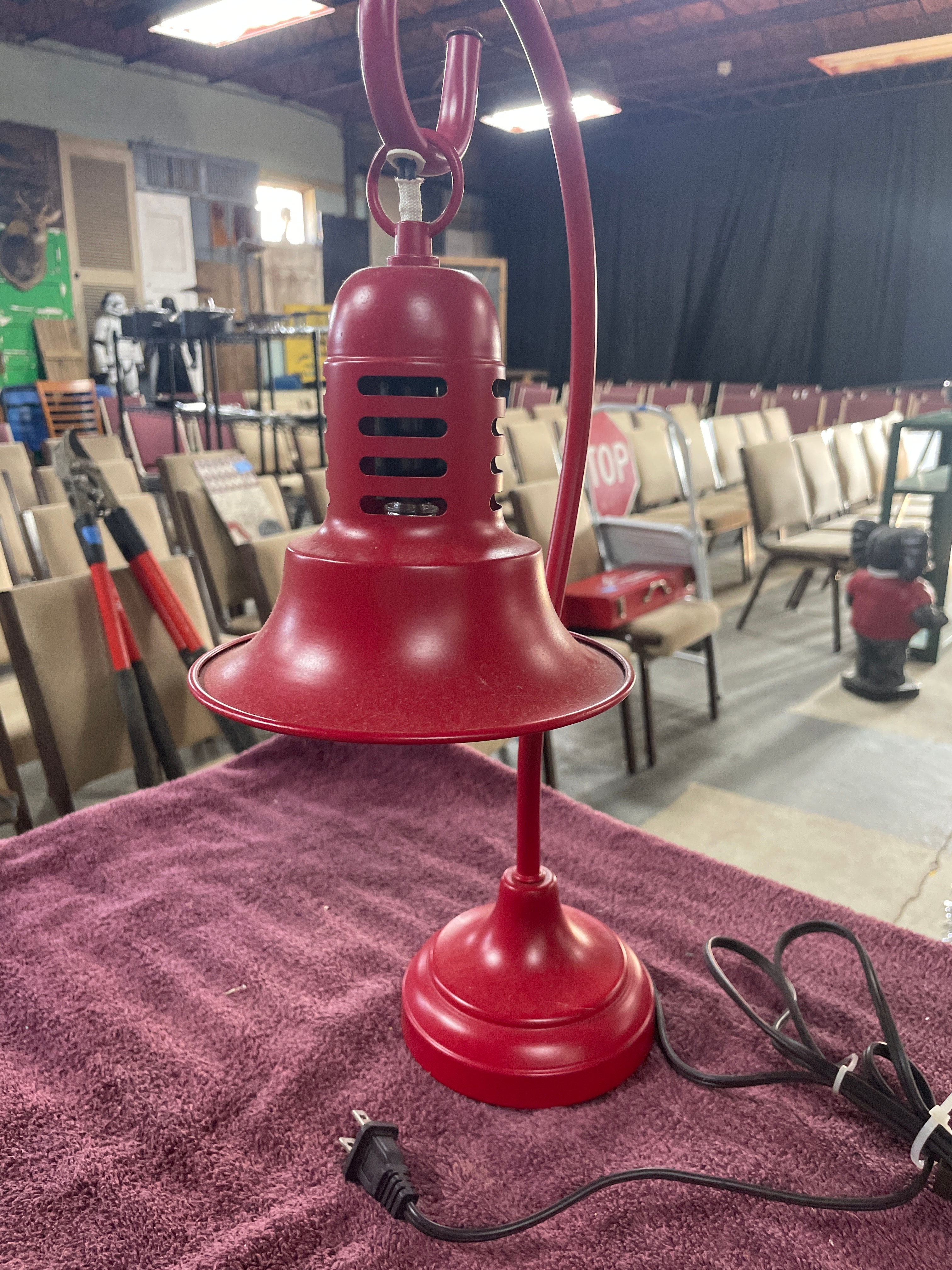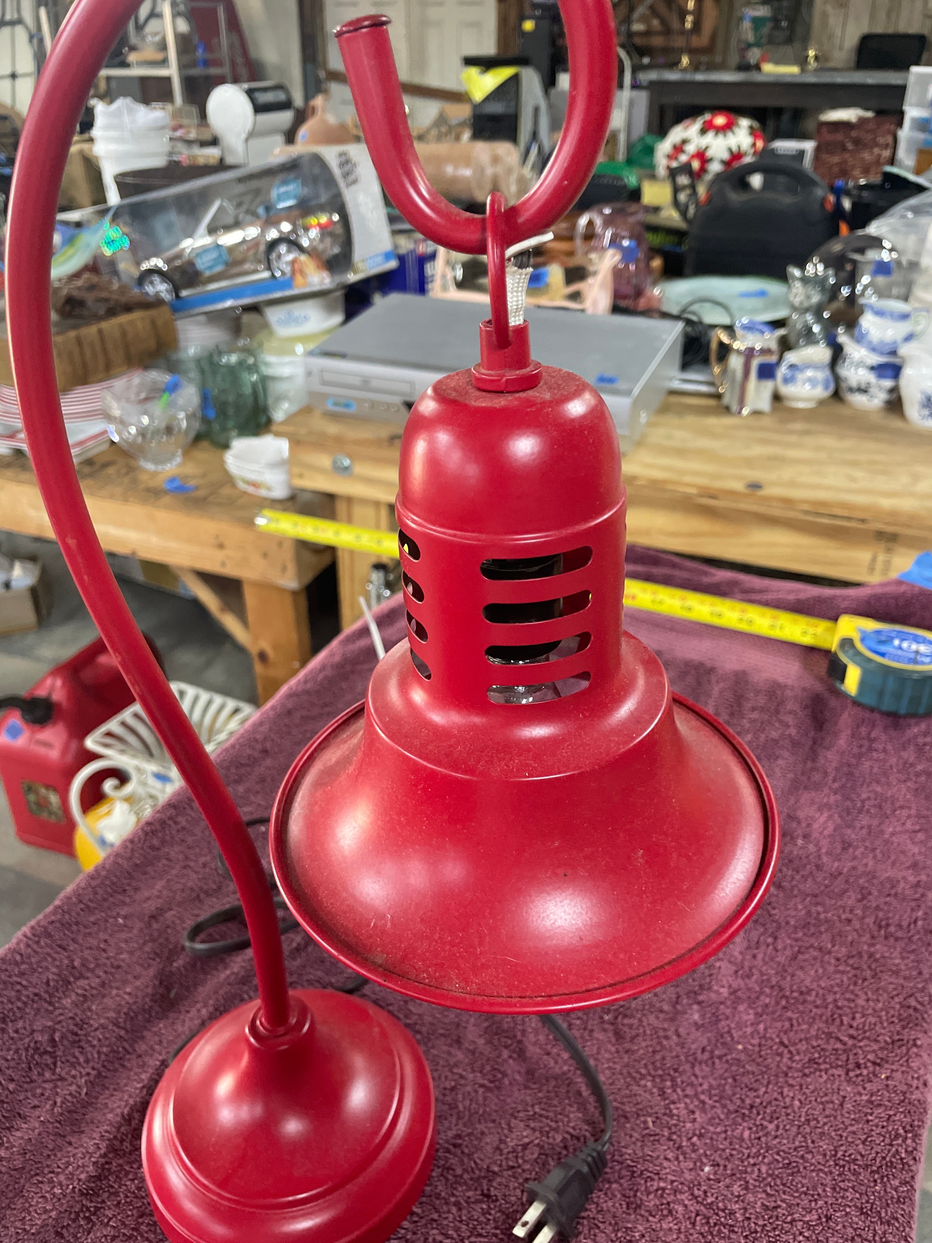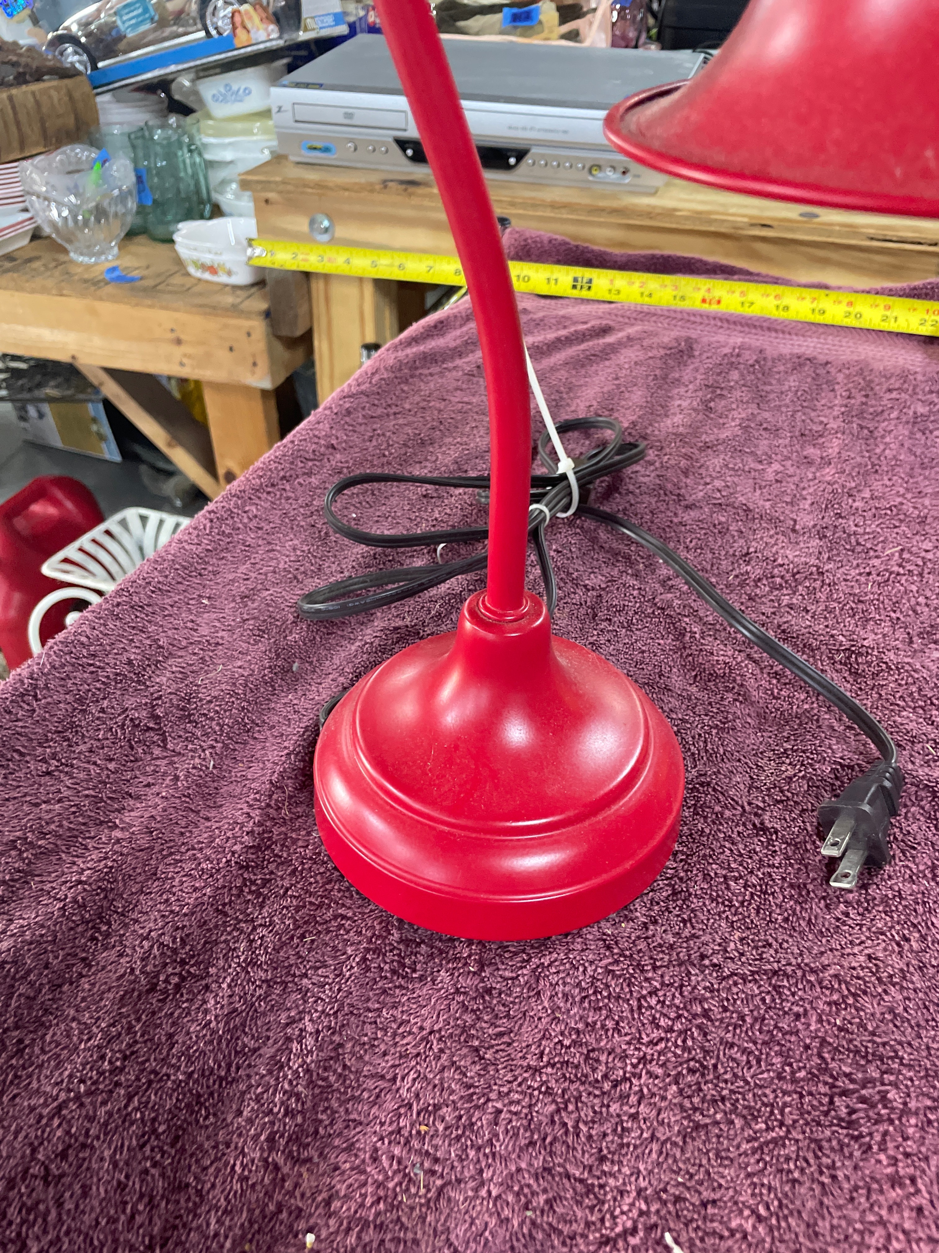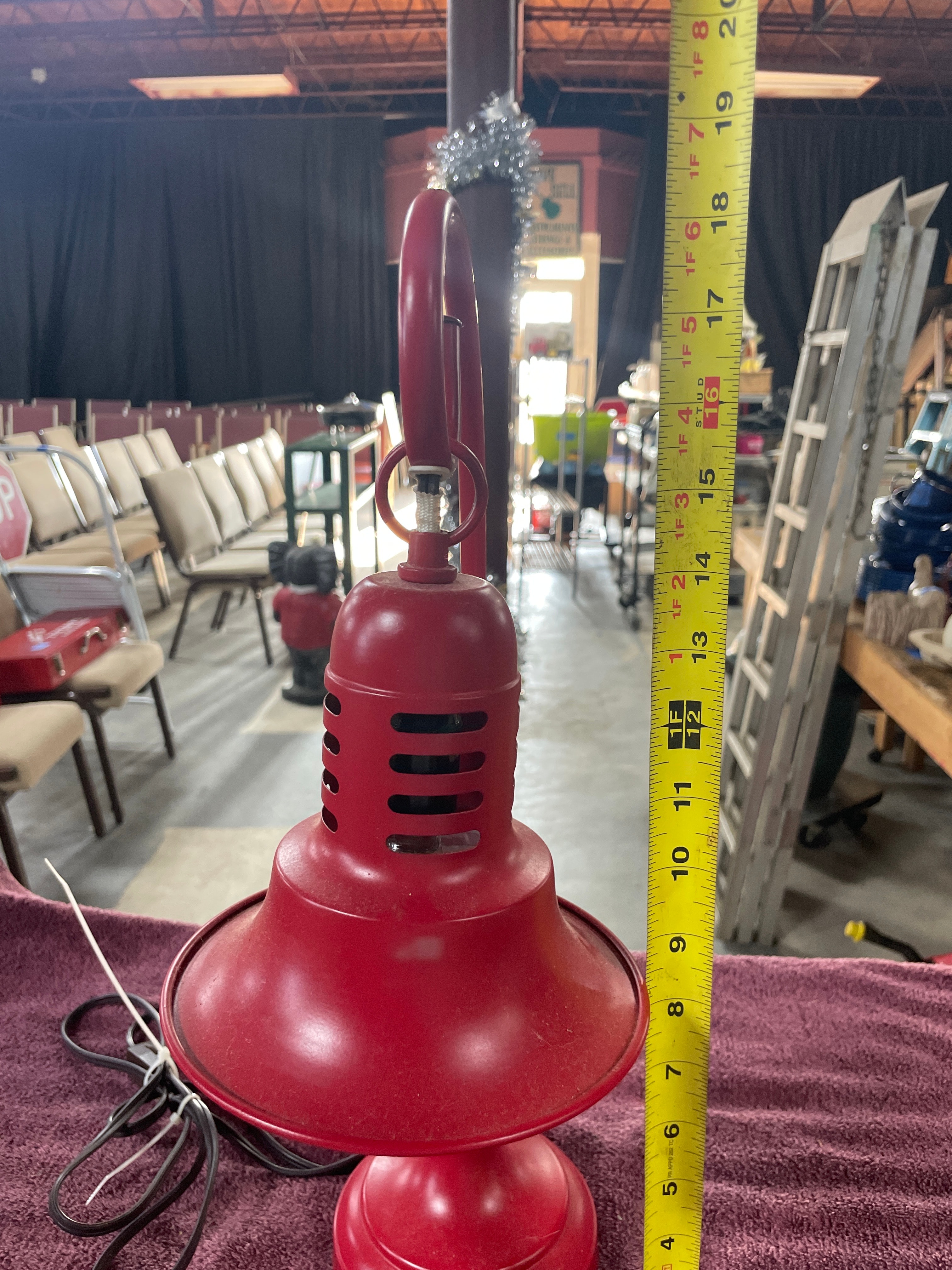 A single red metal desk lamp with a bell-shaped shade, measuring approximately 18 inches tall.