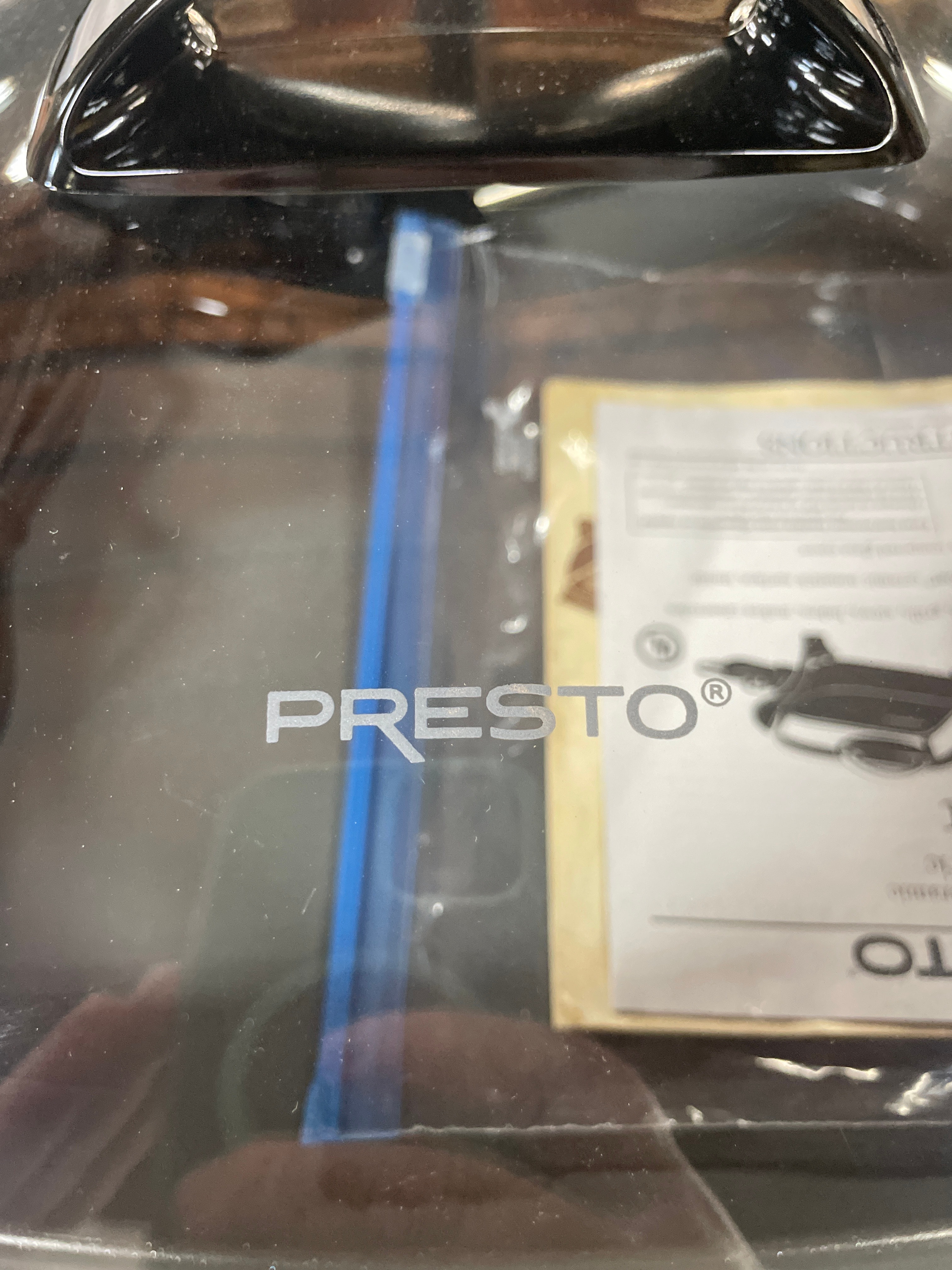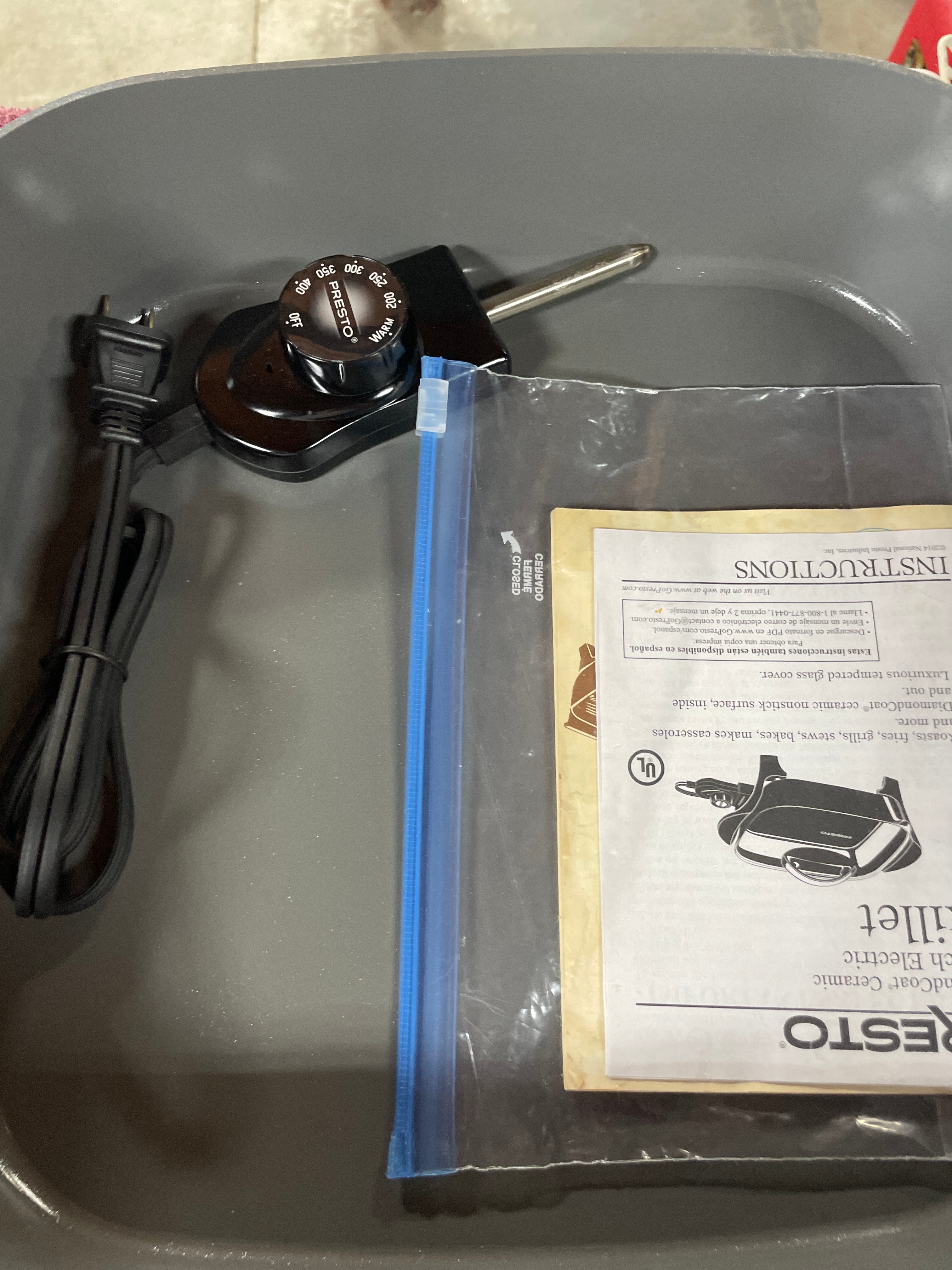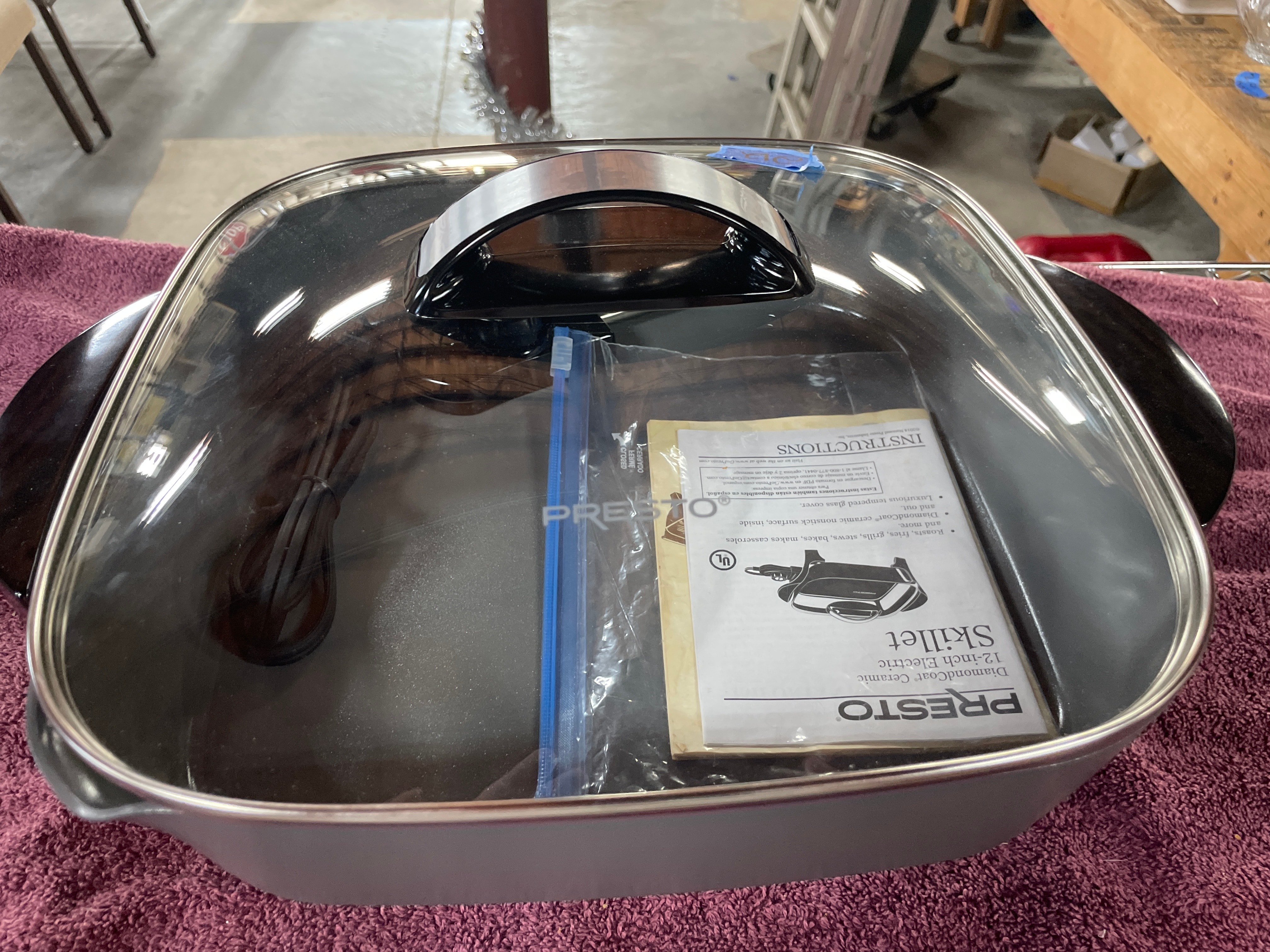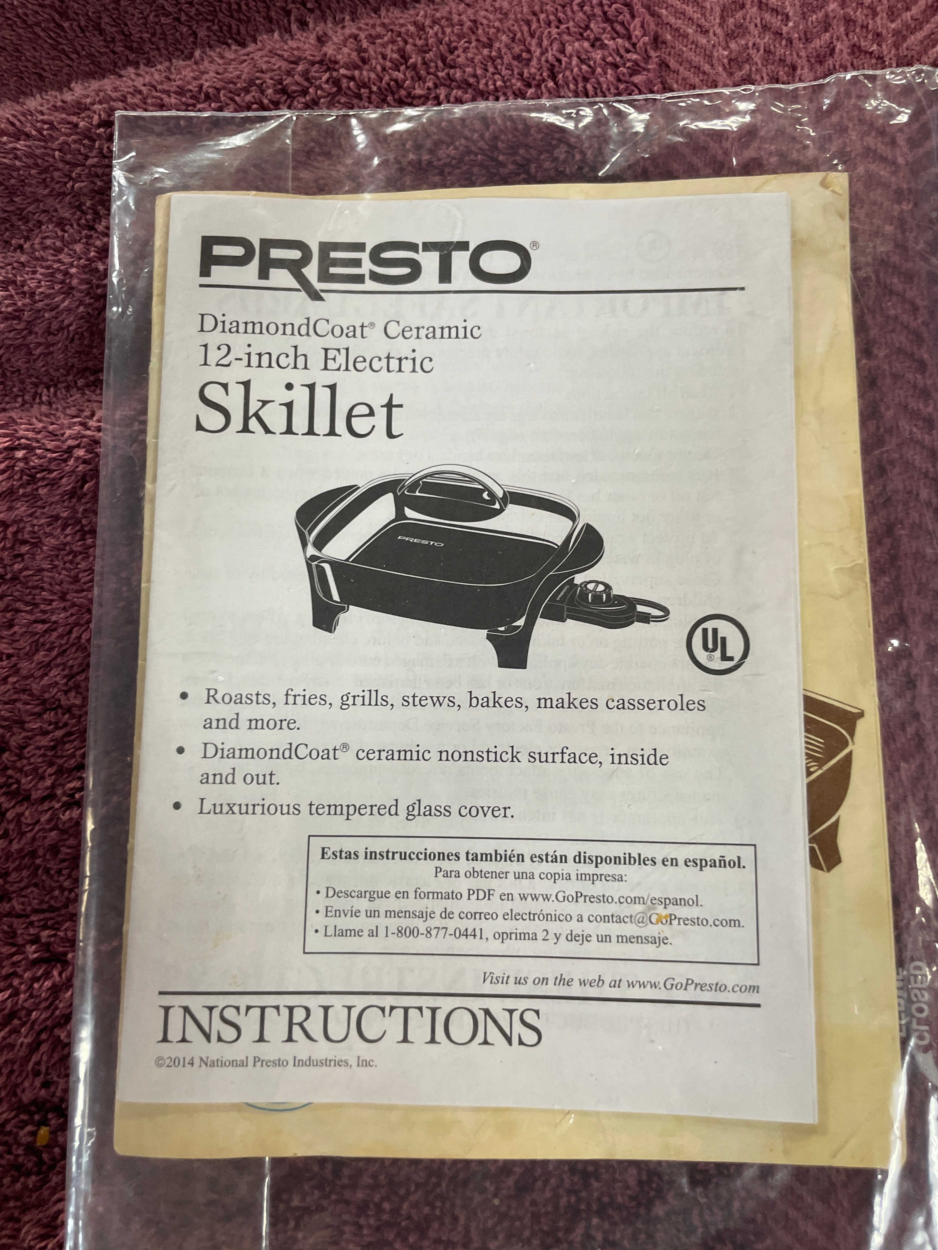 A grey PRESTO® DiamondCoat® Ceramic 12-inch Electric Skillet with a clear glass lid, black accents, and its instruction manual displaying a UL mark.