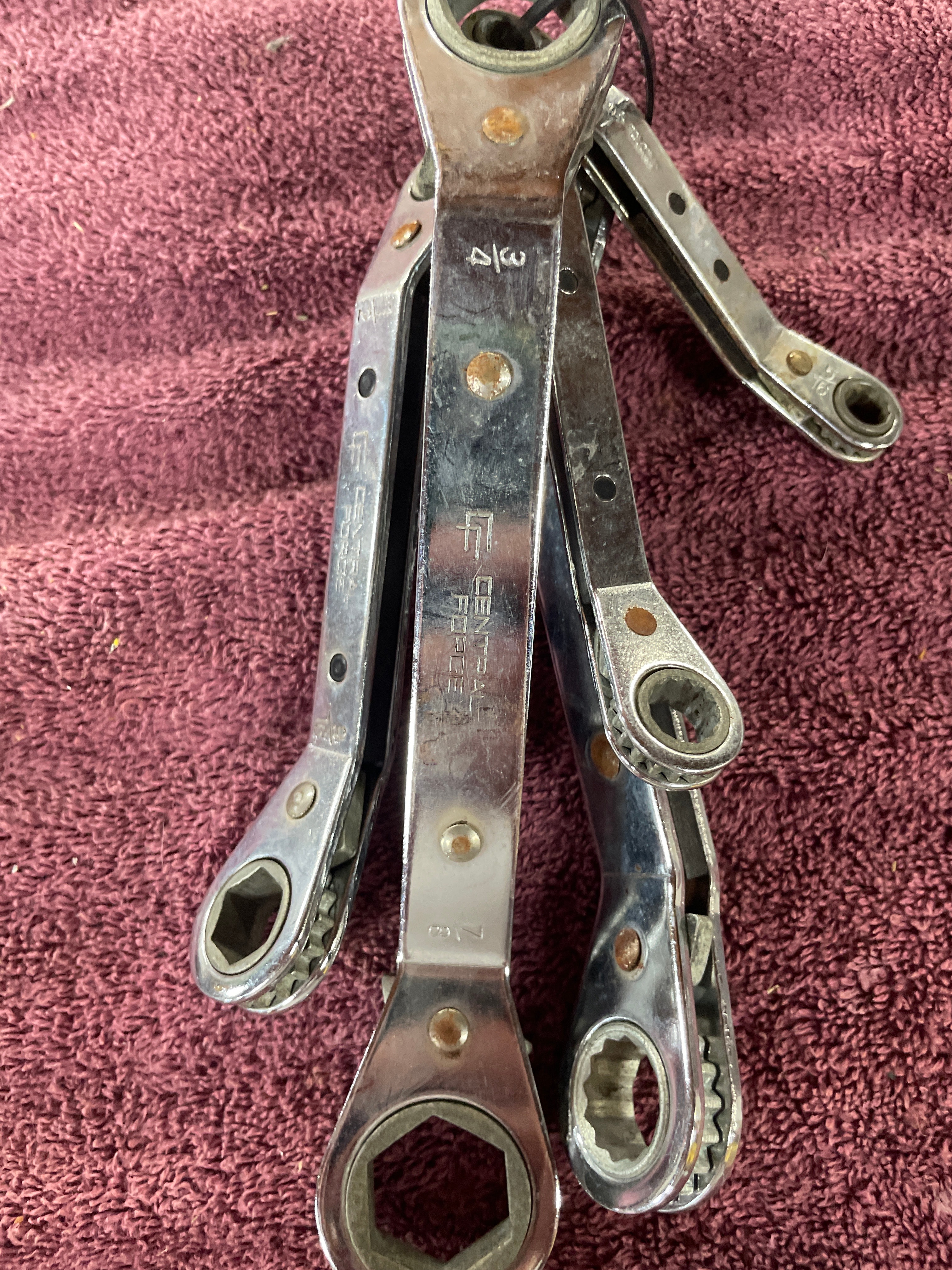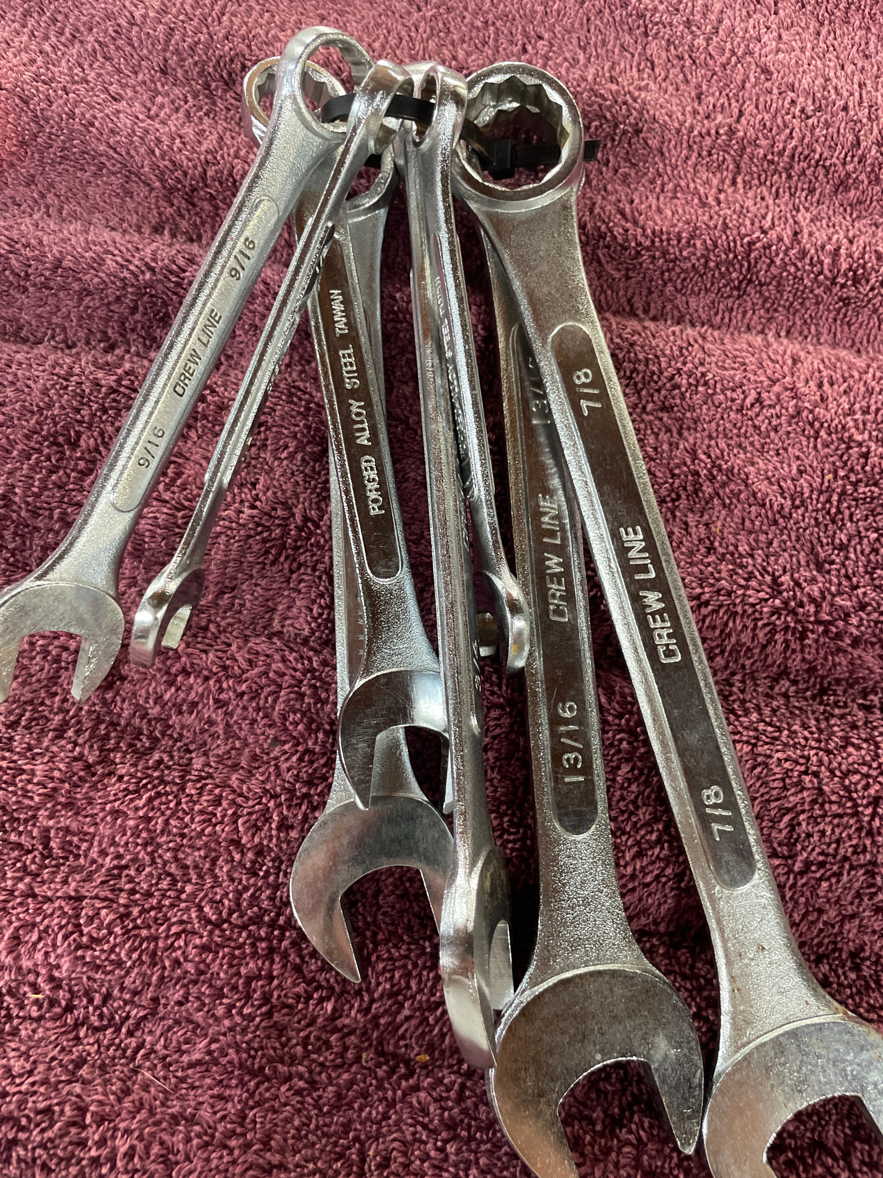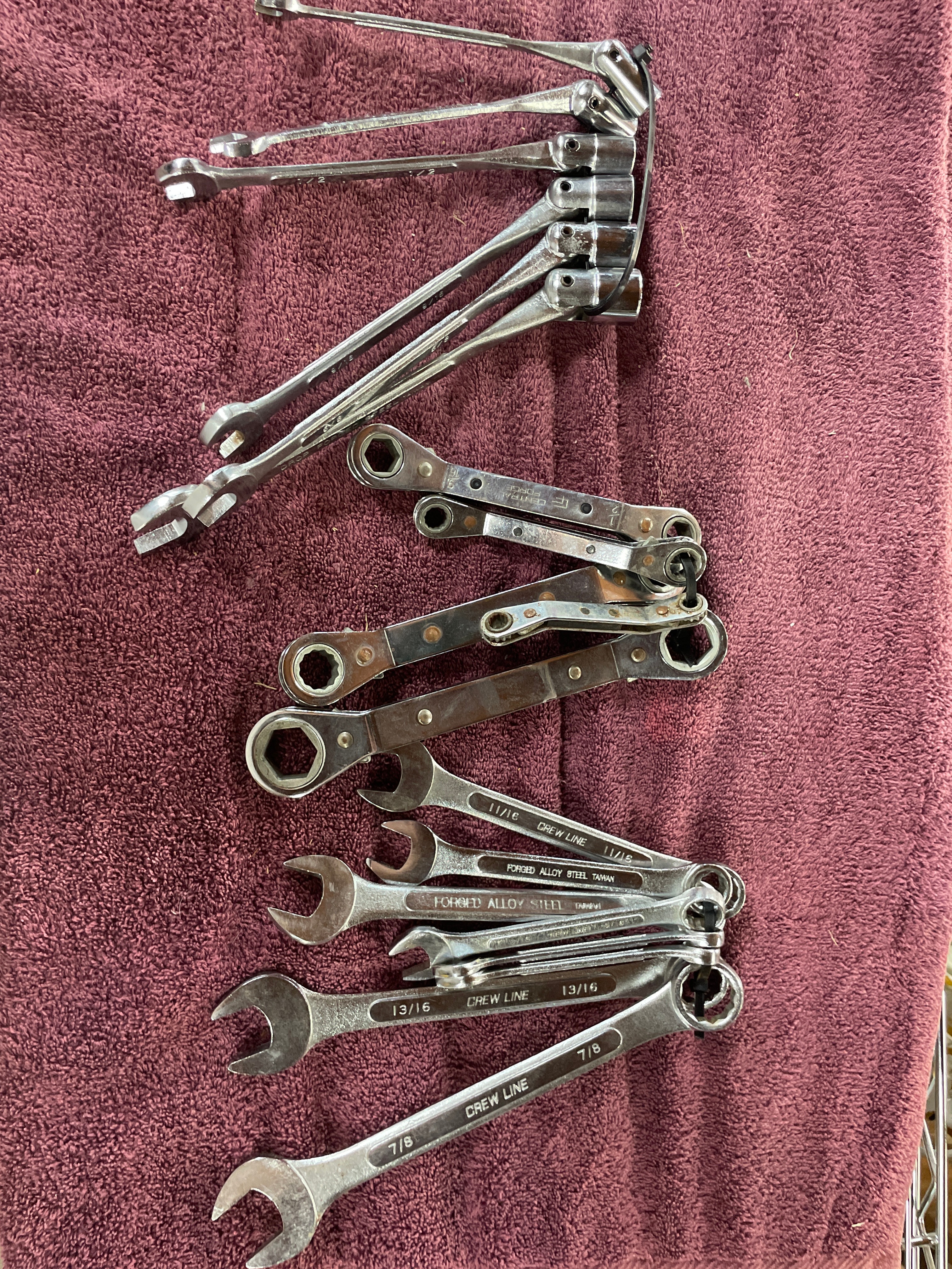 A collection of approximately 23-24 silver-colored wrenches, including CREW LINE forged alloy steel combination wrenches (1/2-7/8) and CENTRAL FORGE reversible ratcheting wrenches (3/8-5/8).