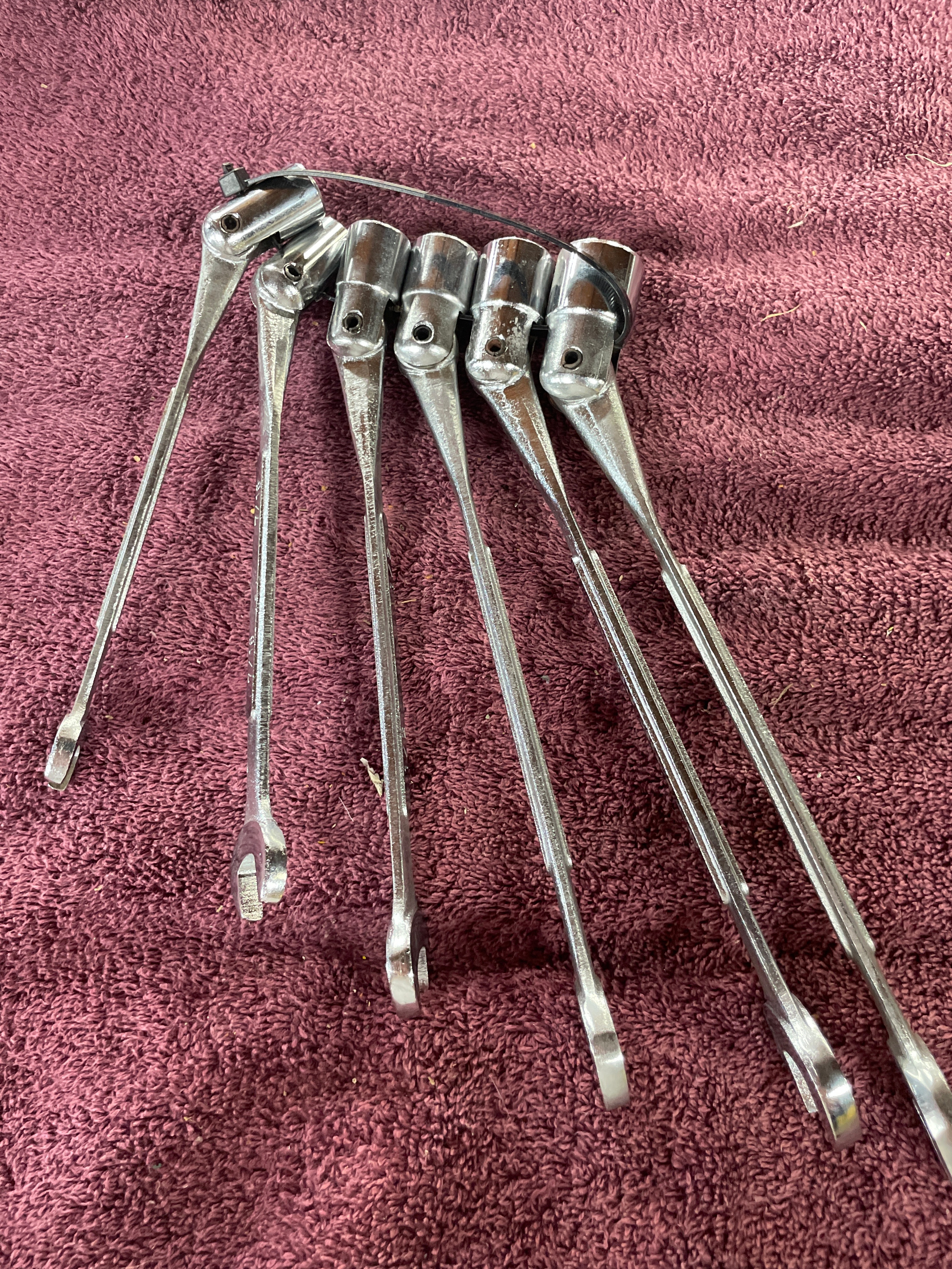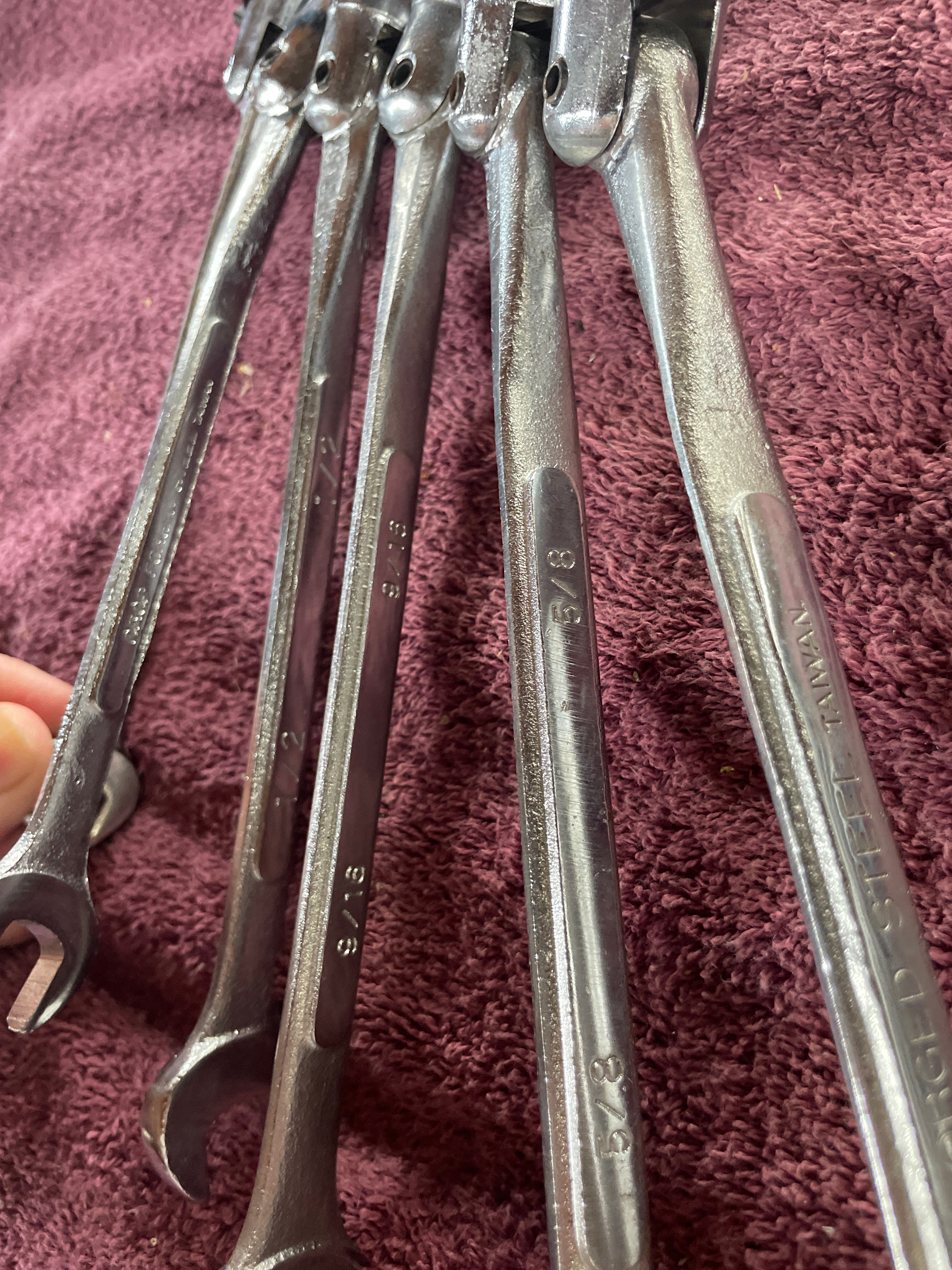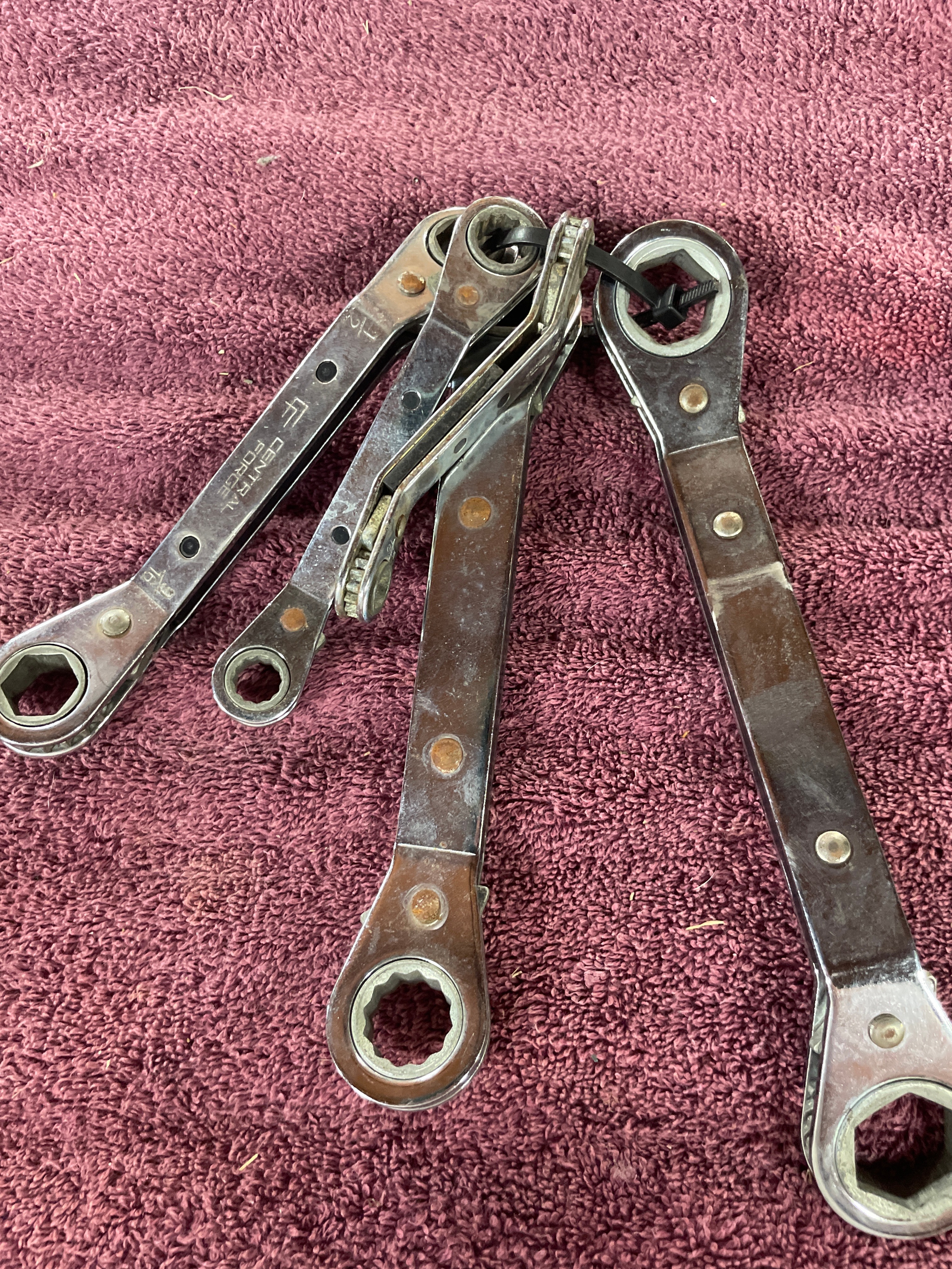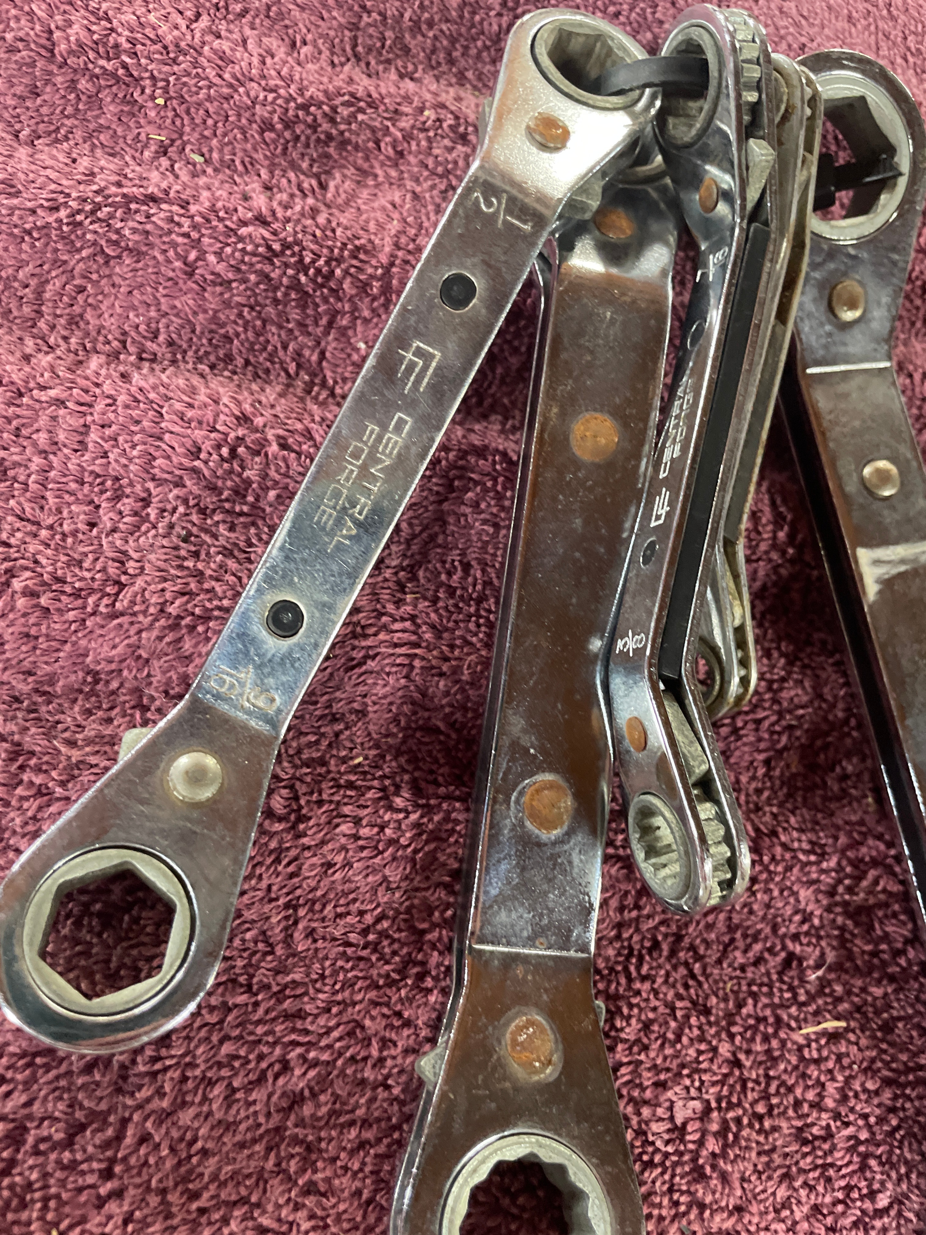 A collection of approximately 23-24 silver-colored wrenches, including CREW LINE forged alloy steel combination wrenches (1/2-7/8) and CENTRAL FORGE reversible ratcheting wrenches (3/8-5/8).