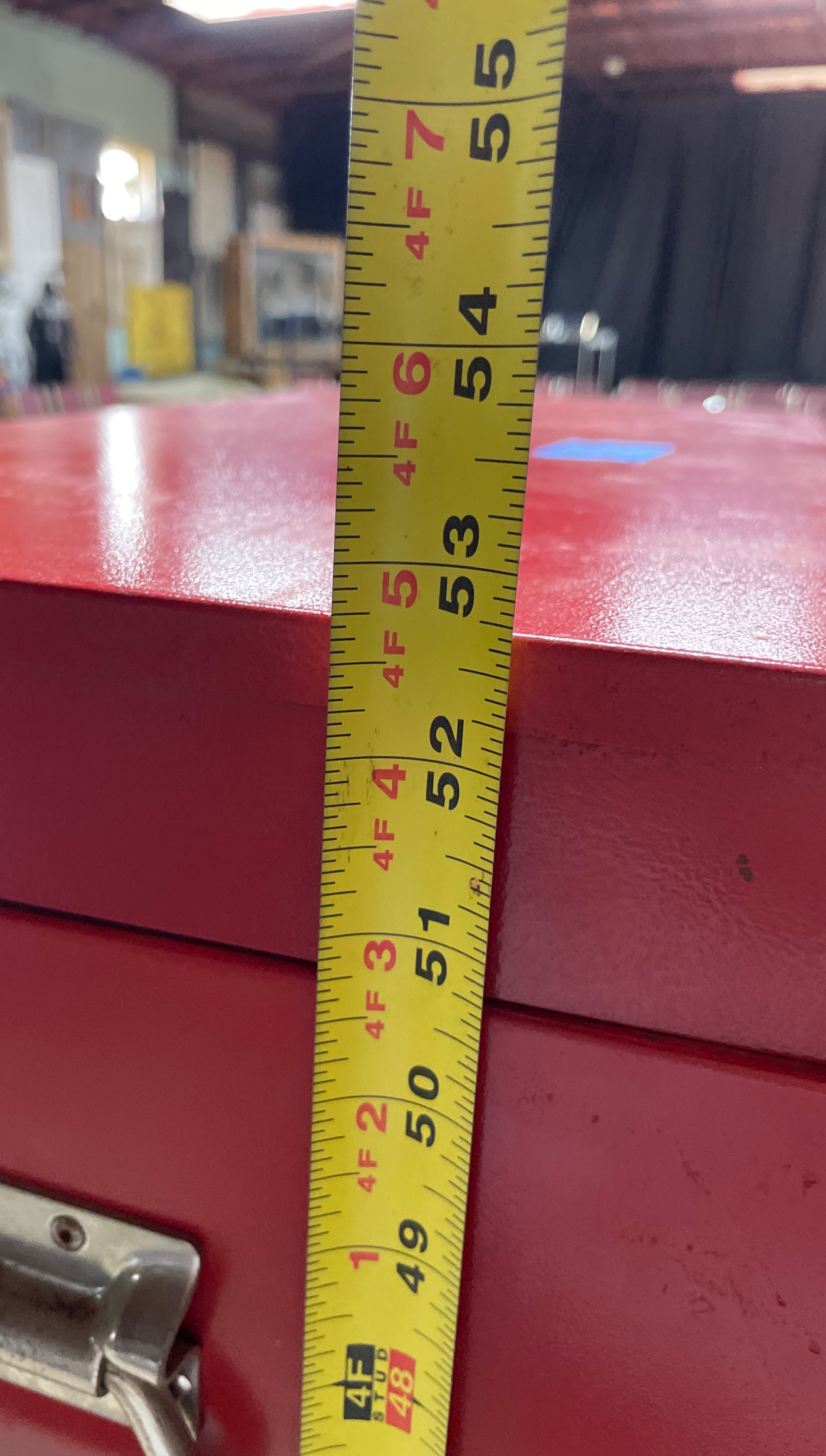A red, three-piece STACK-ON tool chest system, composed of a top chest, a middle chest, and a bottom rolling cabinet, measuring approximately 54 inches tall.