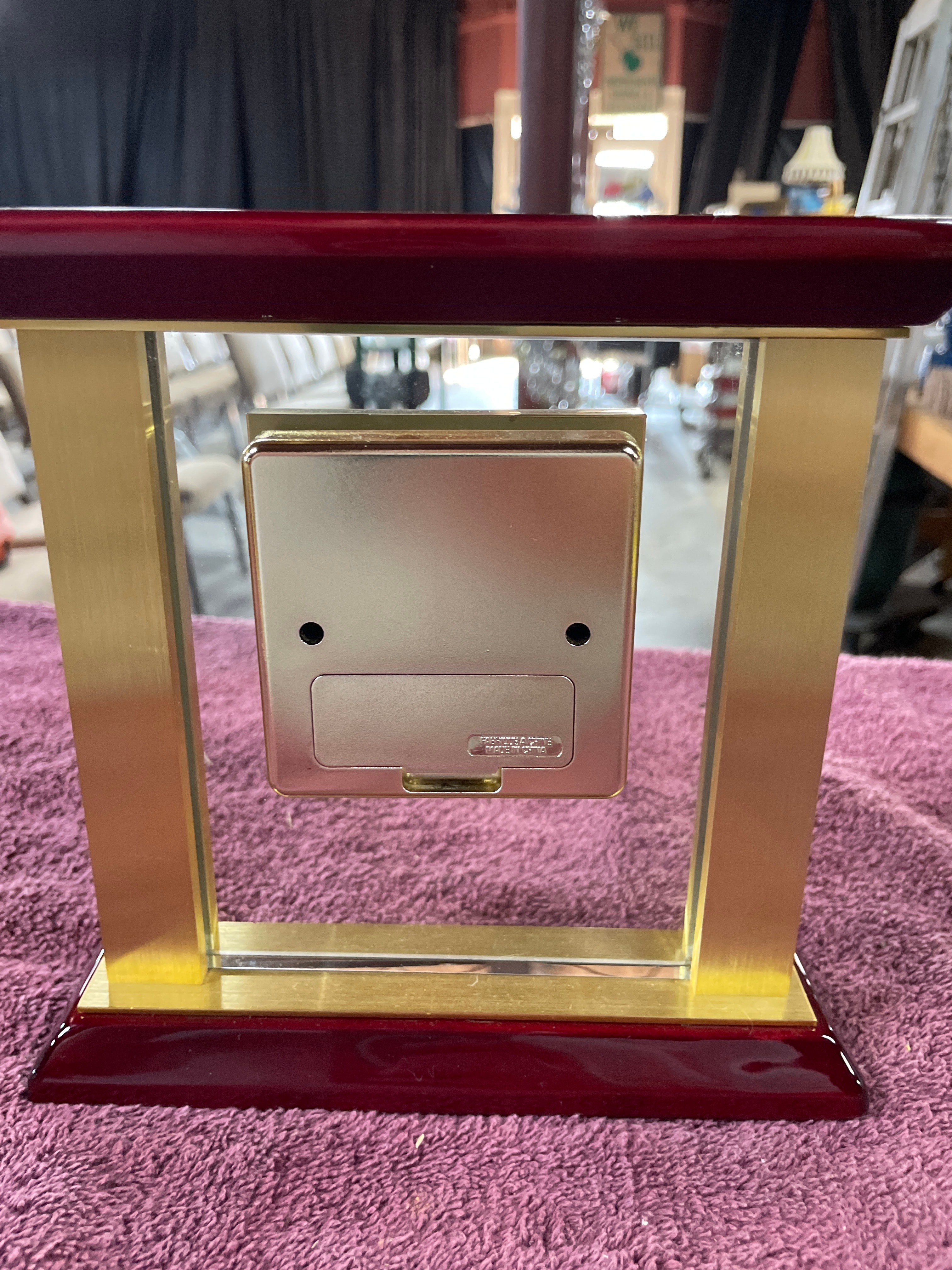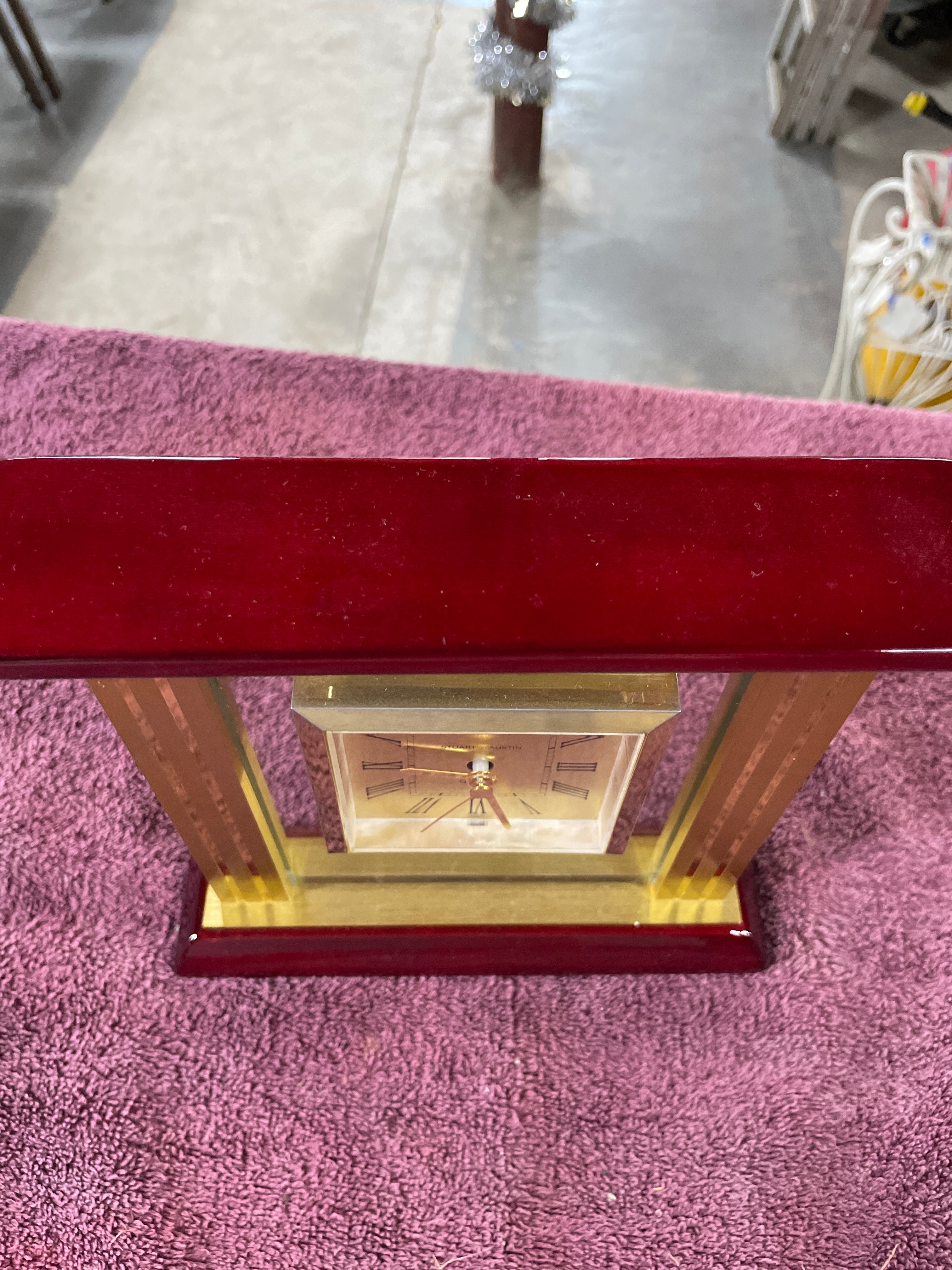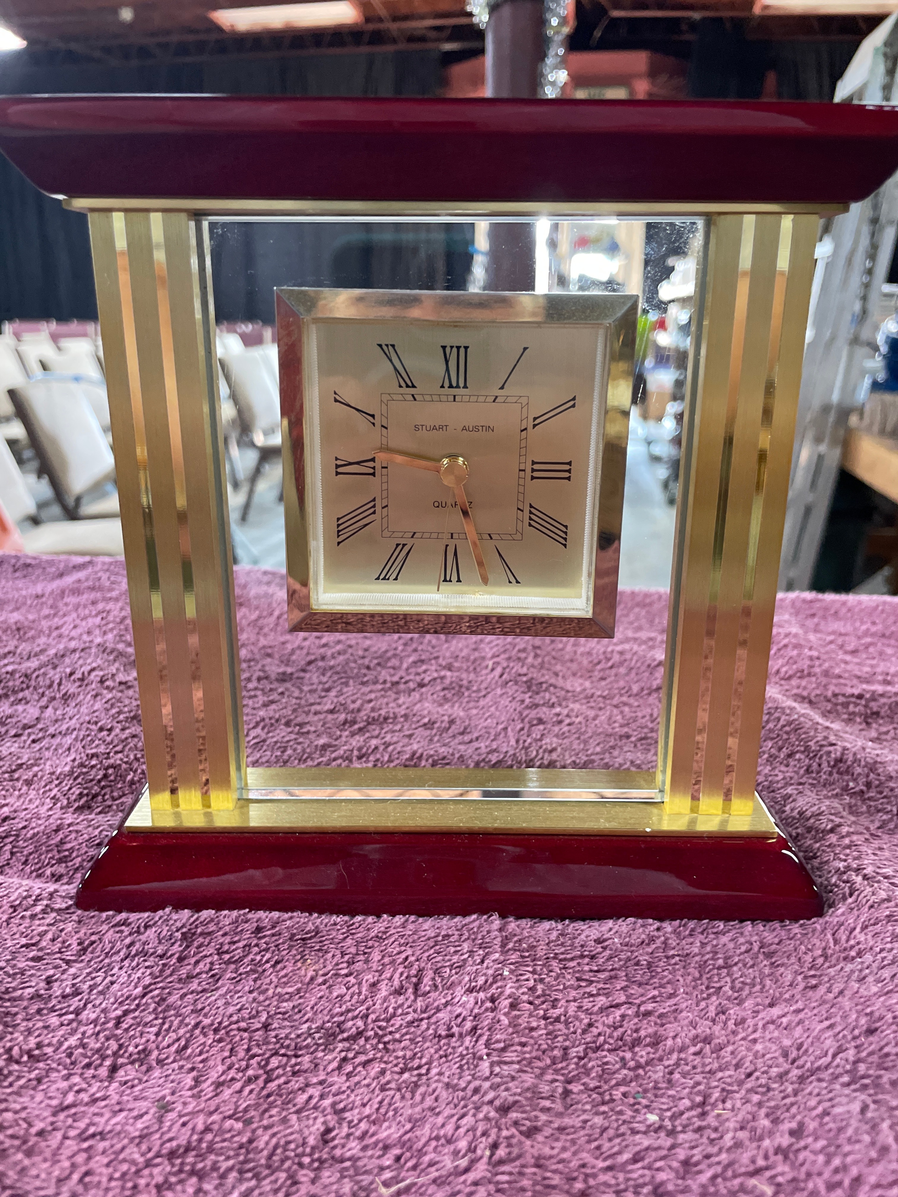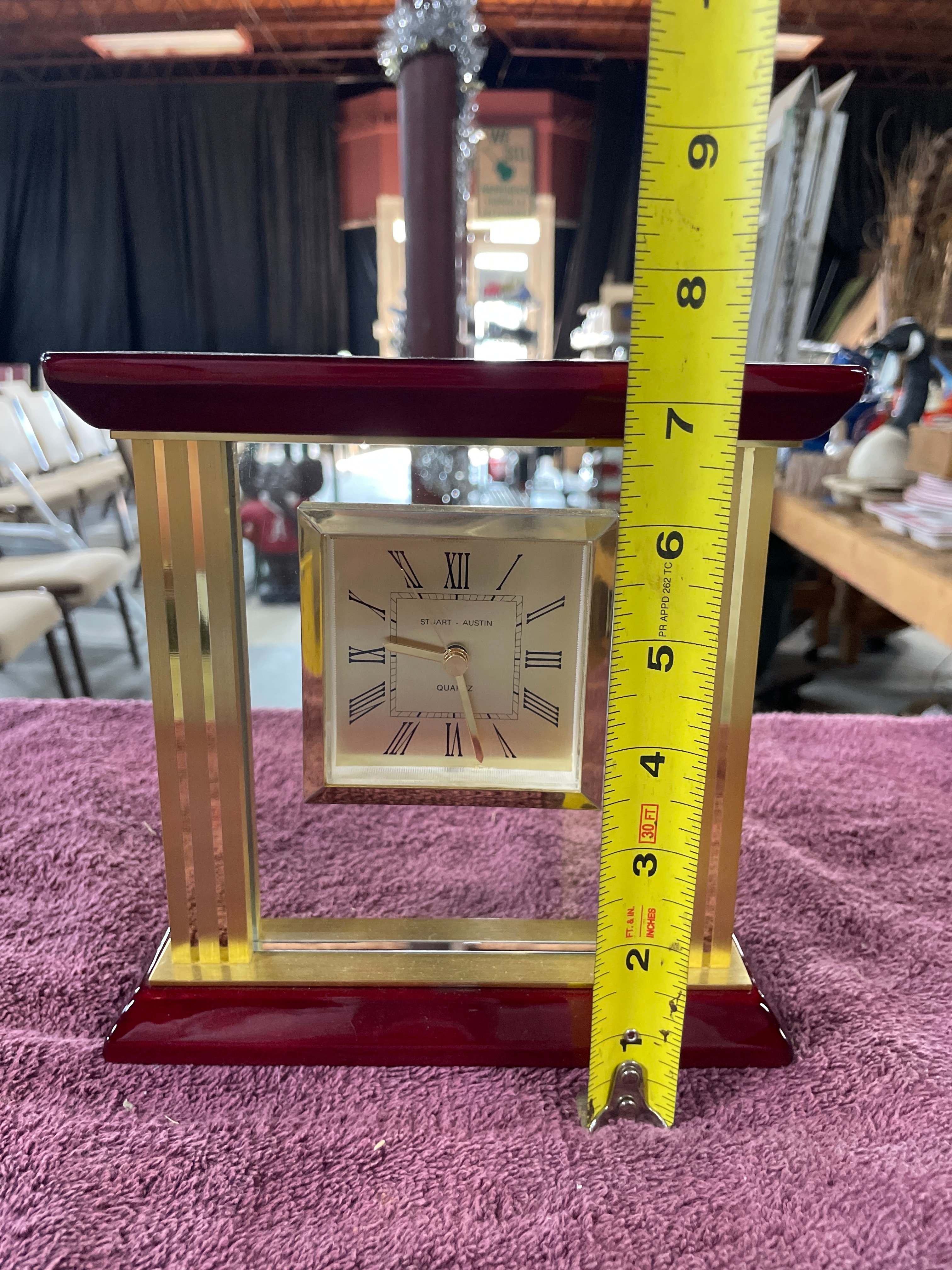 A red wood and gold-tone metal desk clock, marked “STUART – AUSTIN” and “QUARTZ” on its face, and “NO (0) JEWELS”, “UNADJUSTED”, “MADE IN CHINA” on the back of the mechanism, measuring approximately 7 inches tall.