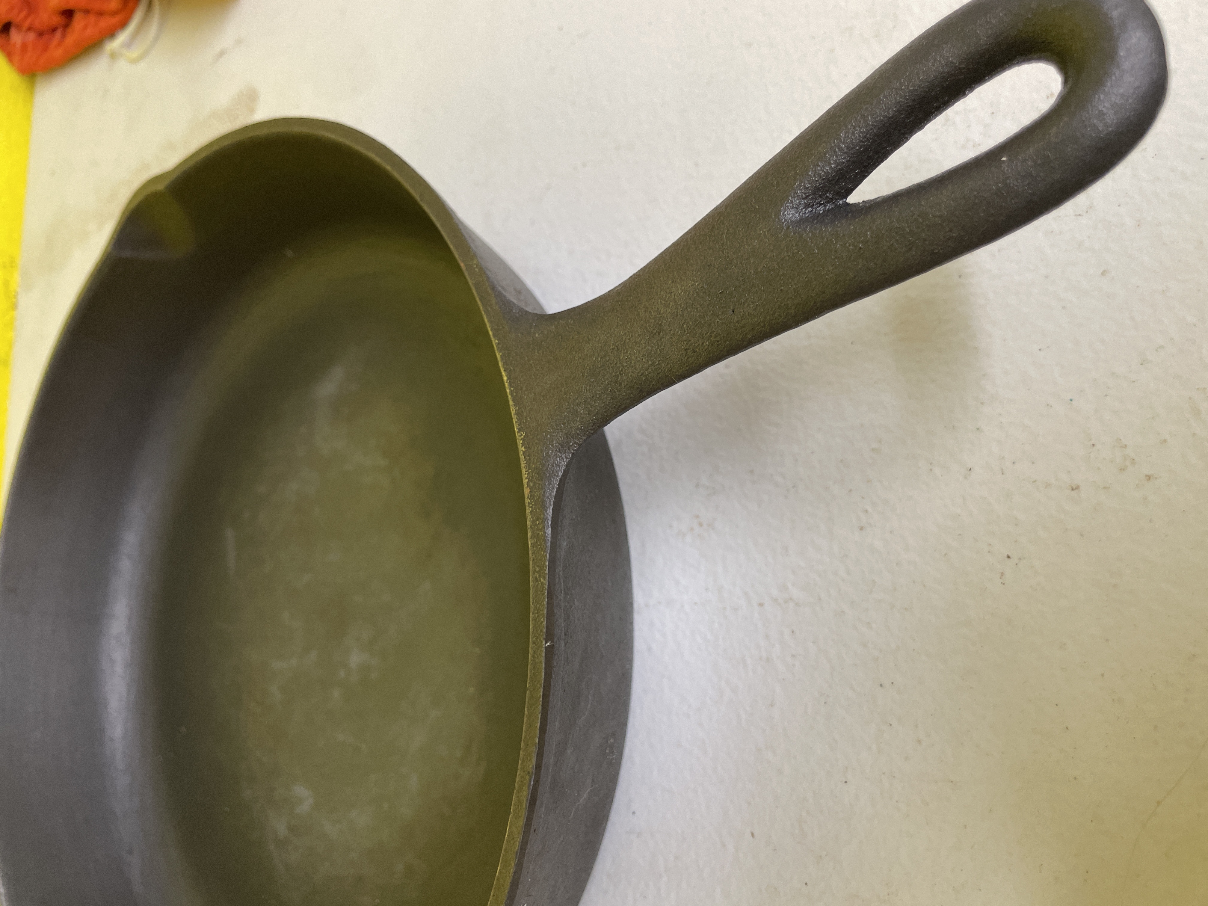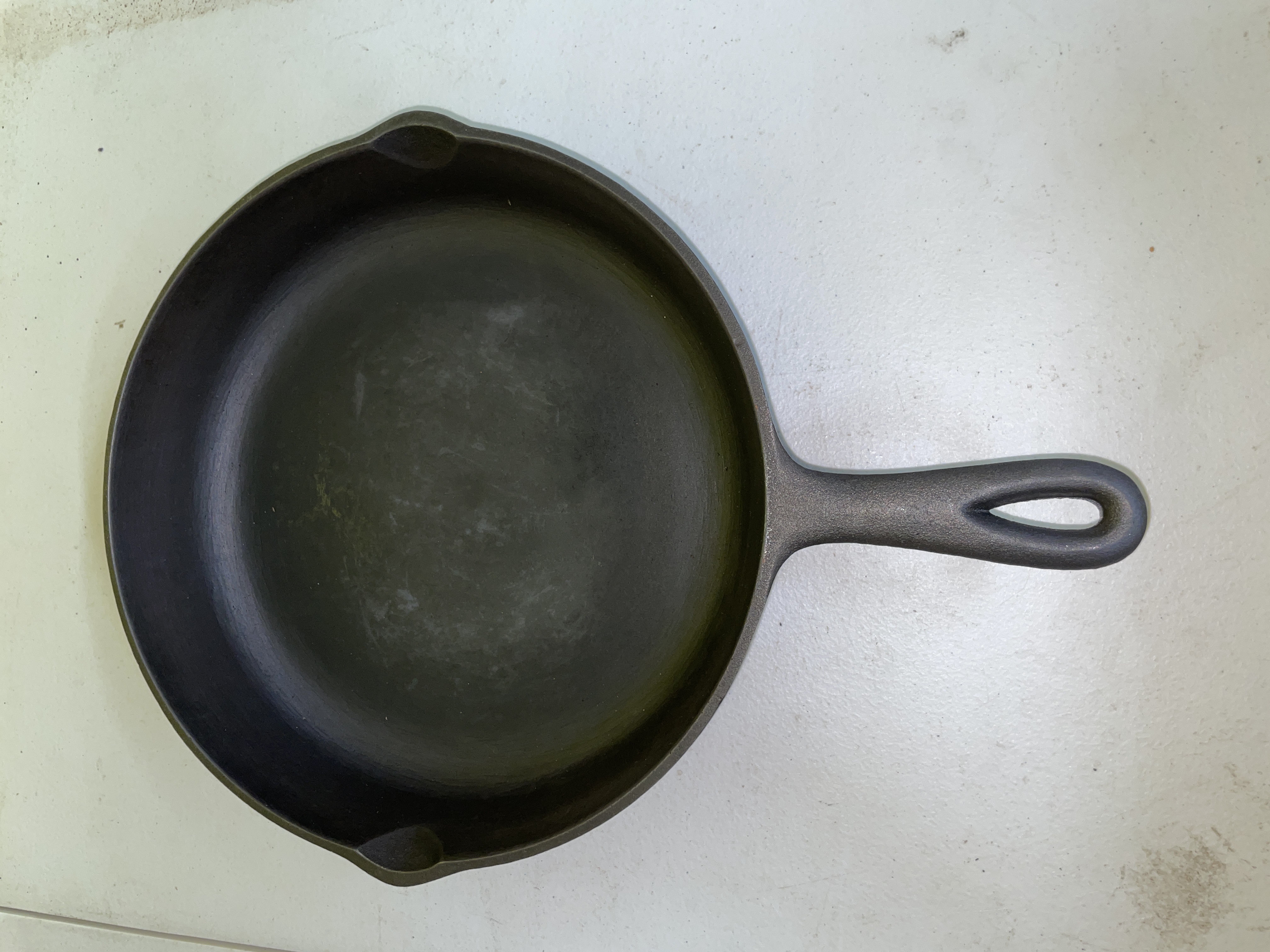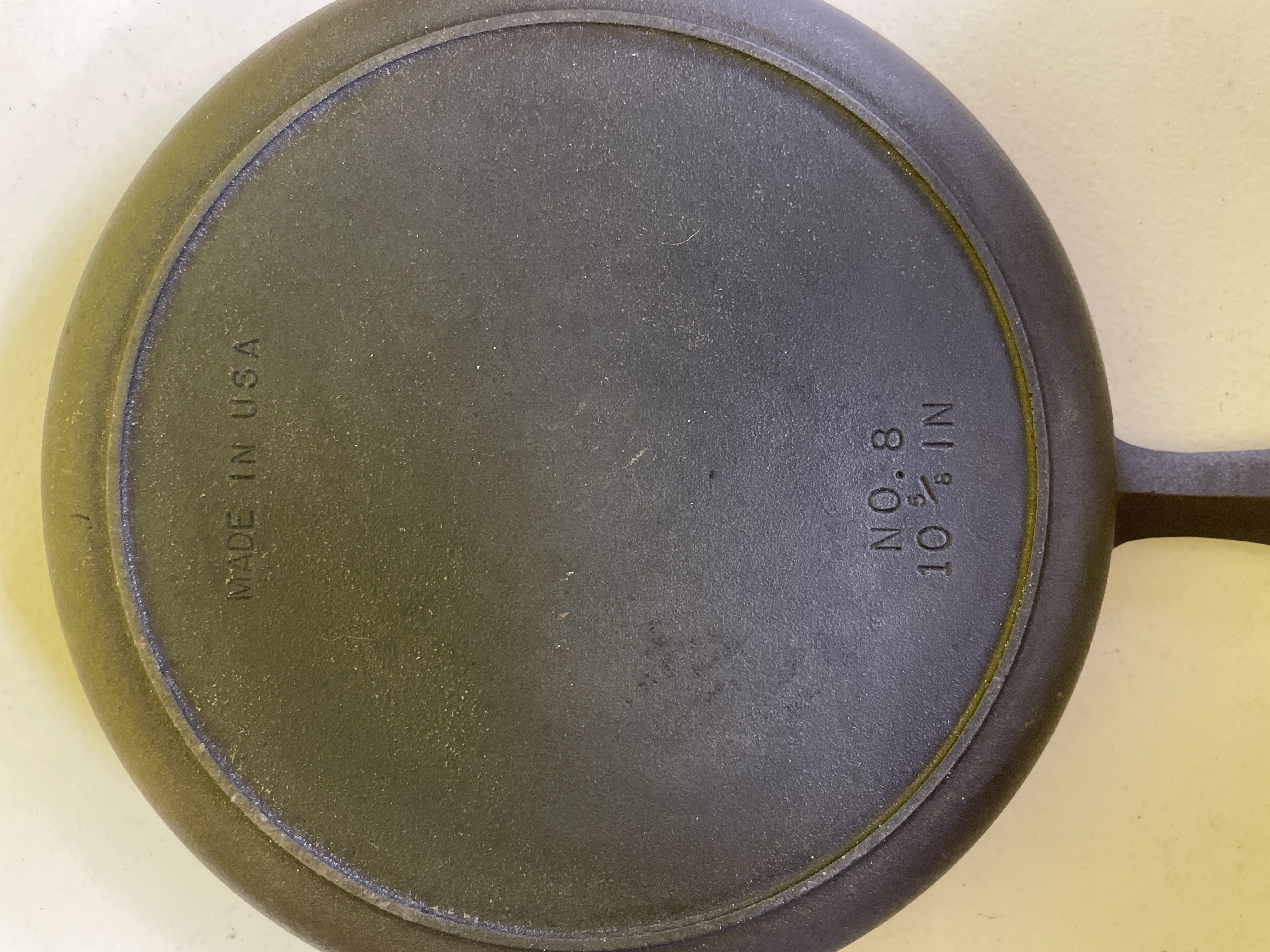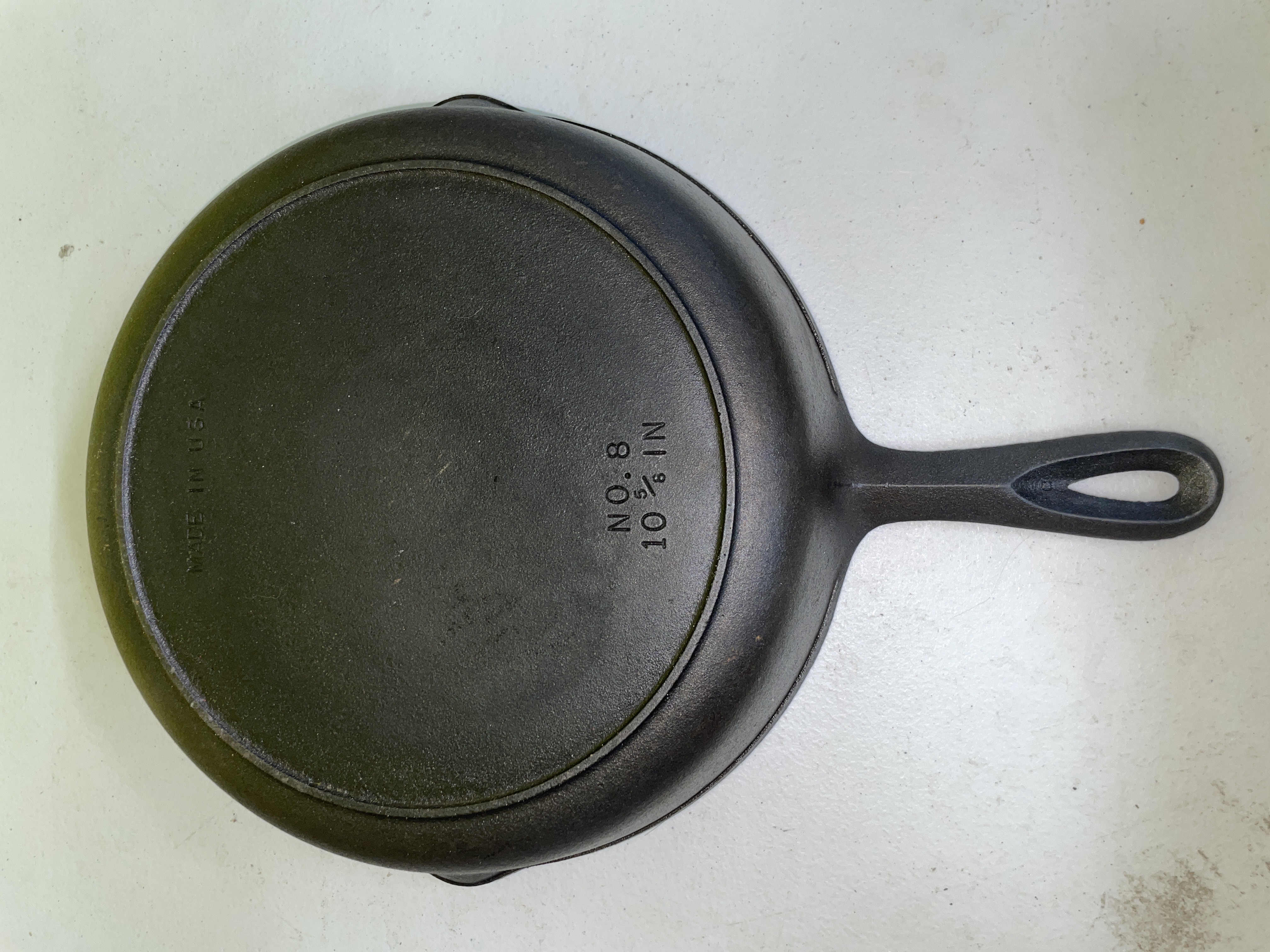 A round cast iron frying pan or skillet, featuring a single, integrated handle with an oval hanging hole and two small pour spouts on opposing sides of the rim. The pan is constructed from dark, matte cast iron. The underside of the pan is impressed with the text "MADE IN USA, " "NO. 8," and "10 ⅝ IN."
