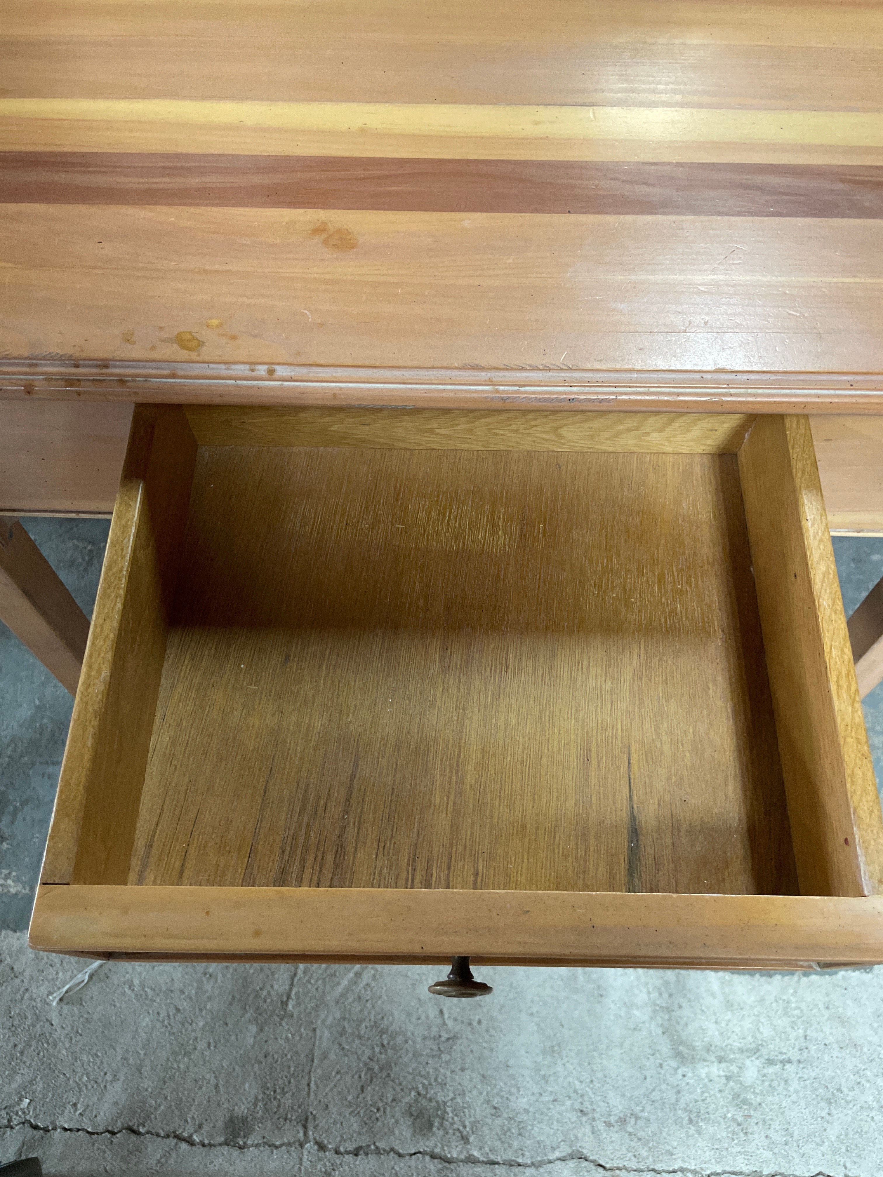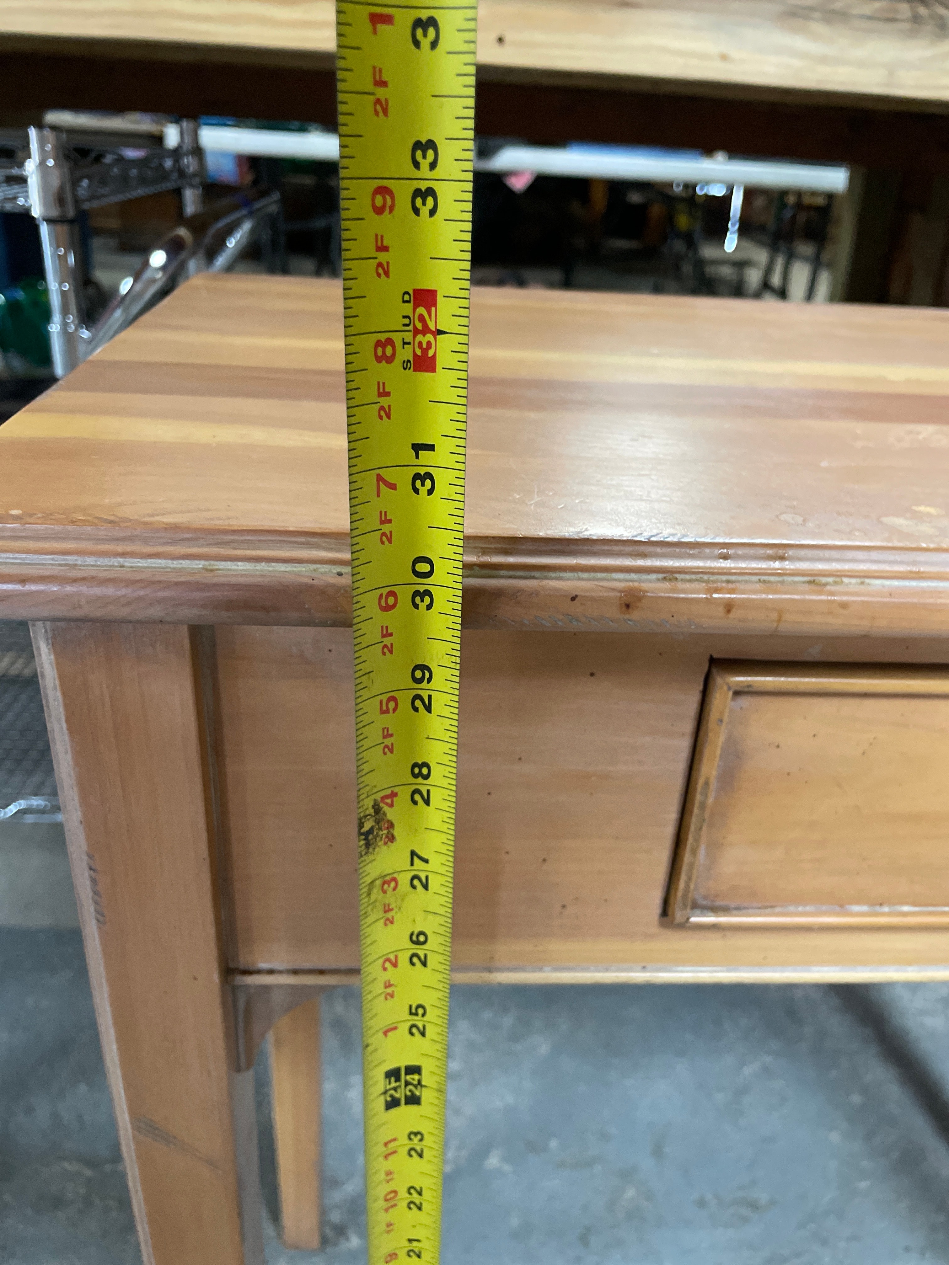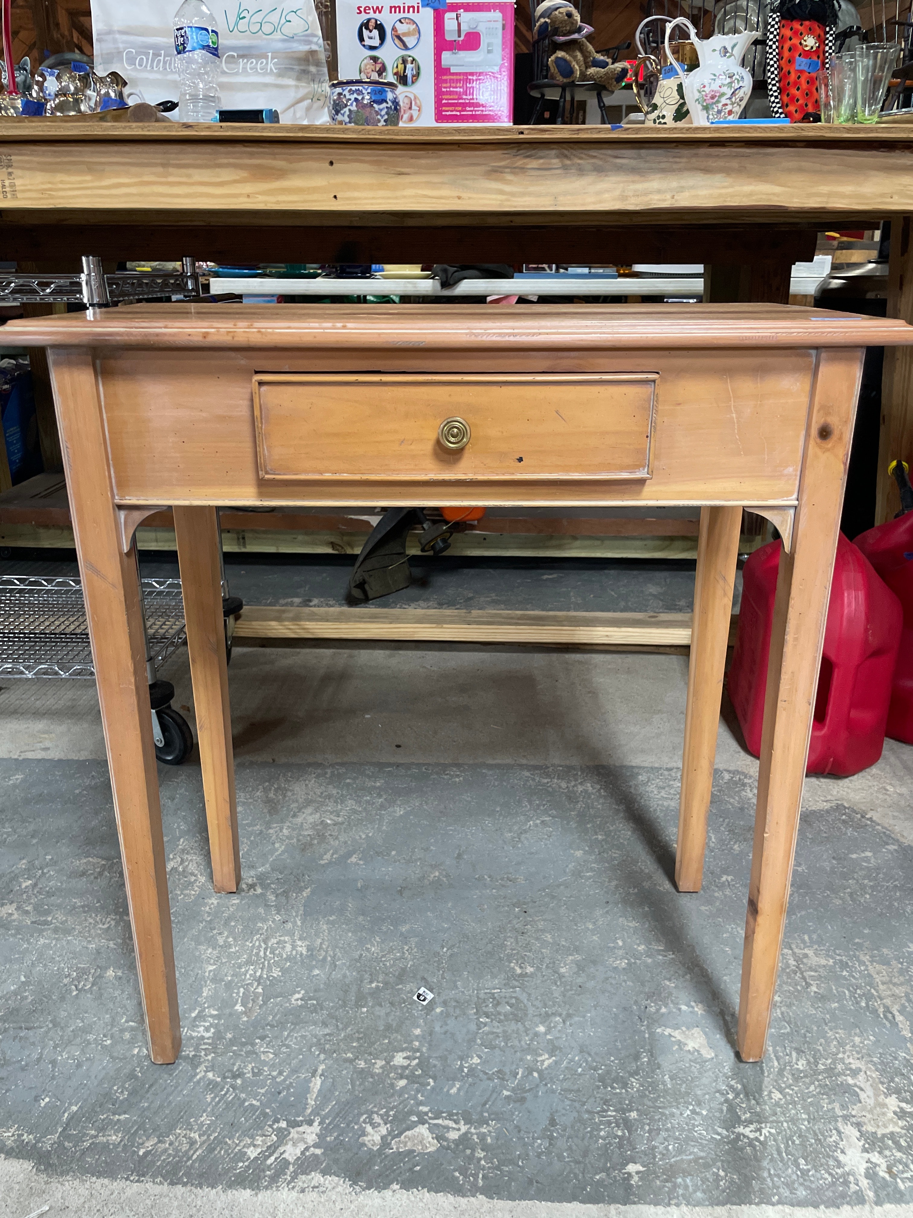 A light brown wooden console table featuring a single drawer with a brass-colored knob and varied natural wood tones on its top, measuring approximately 32 inches high, 28 inches wide, and 13.5 inches deep.