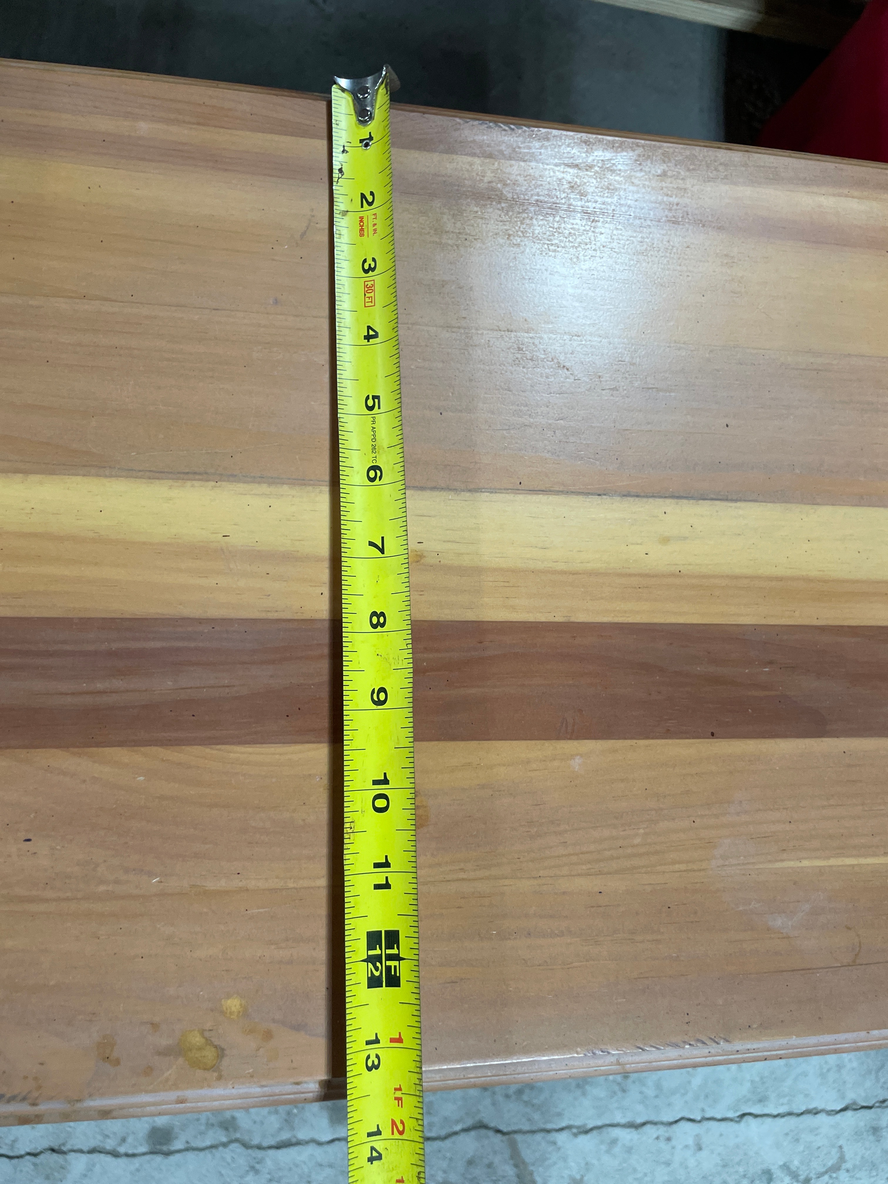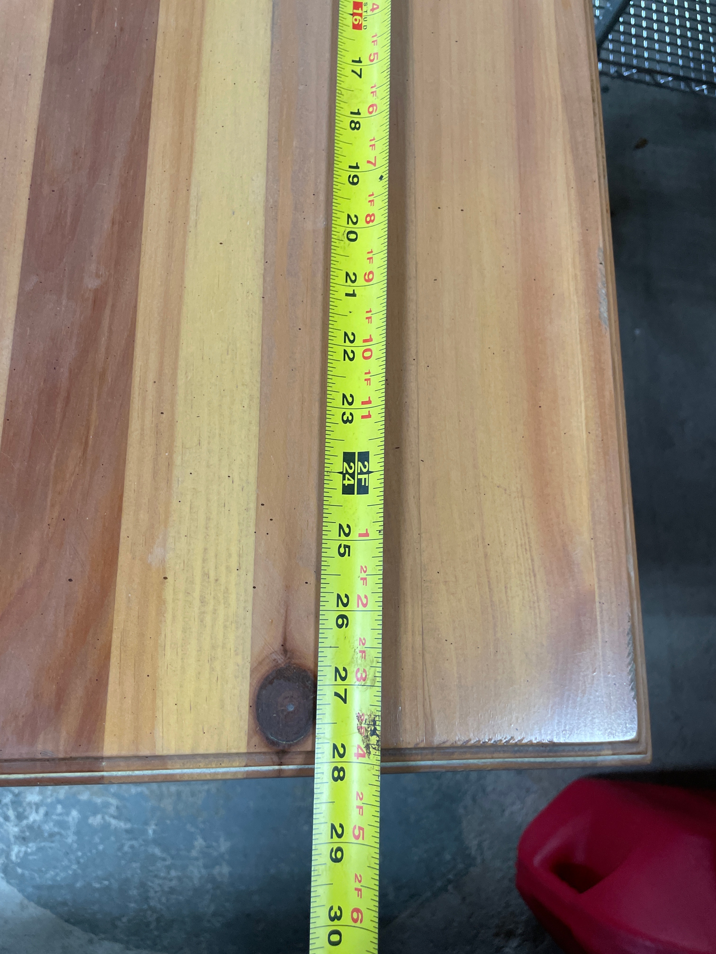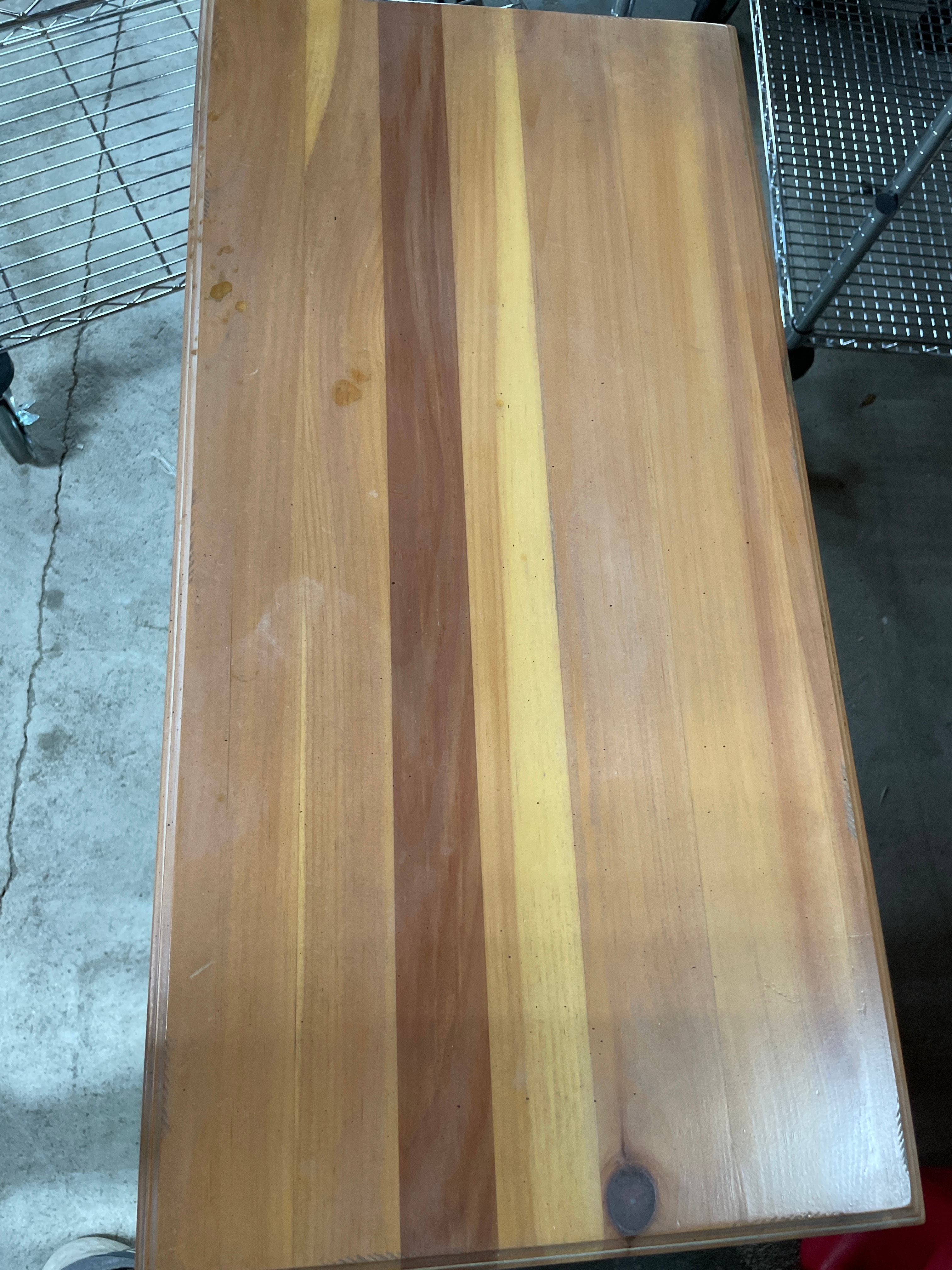 A light brown wooden console table featuring a single drawer with a brass-colored knob and varied natural wood tones on its top, measuring approximately 32 inches high, 28 inches wide, and 13.5 inches deep.