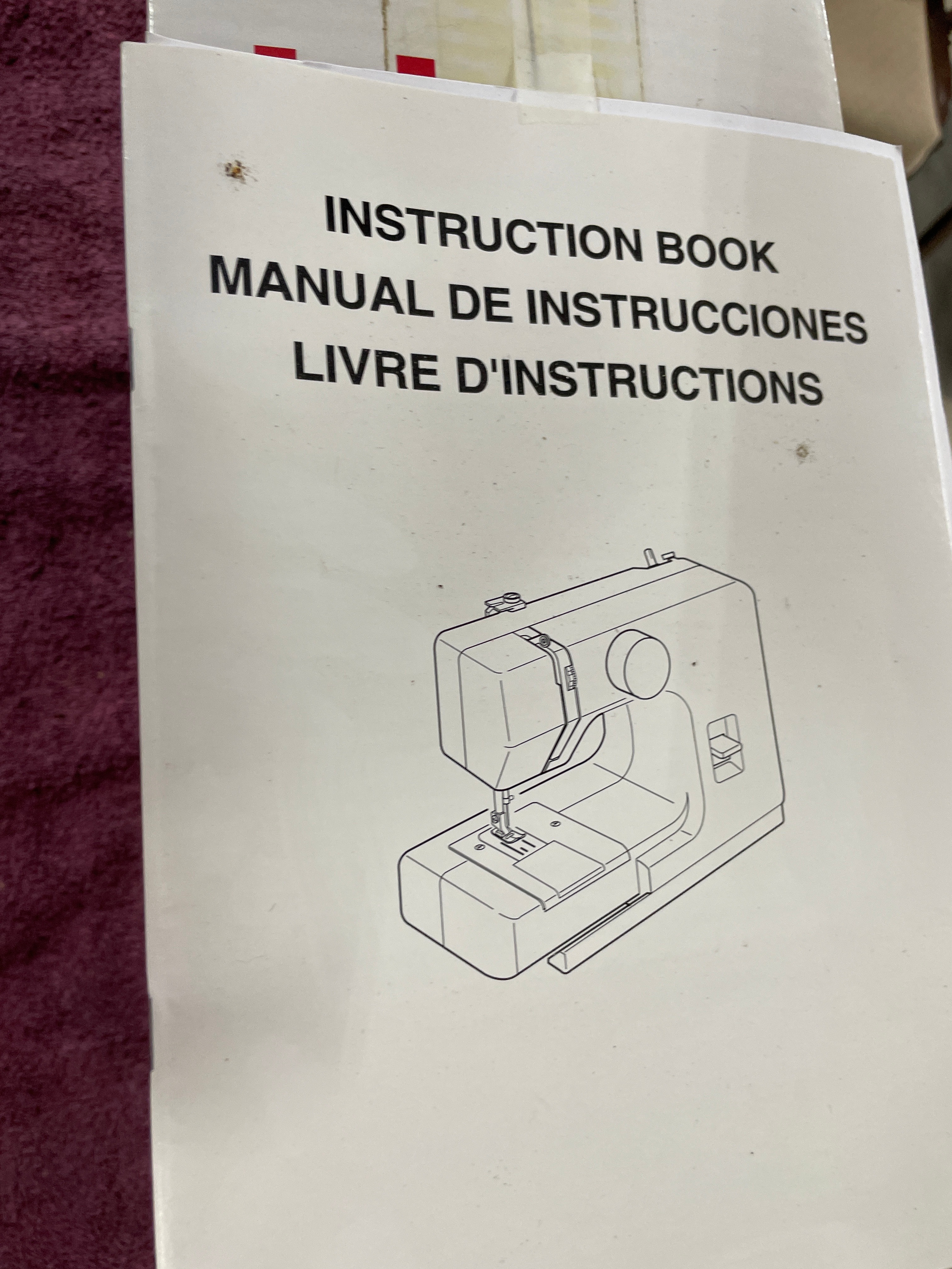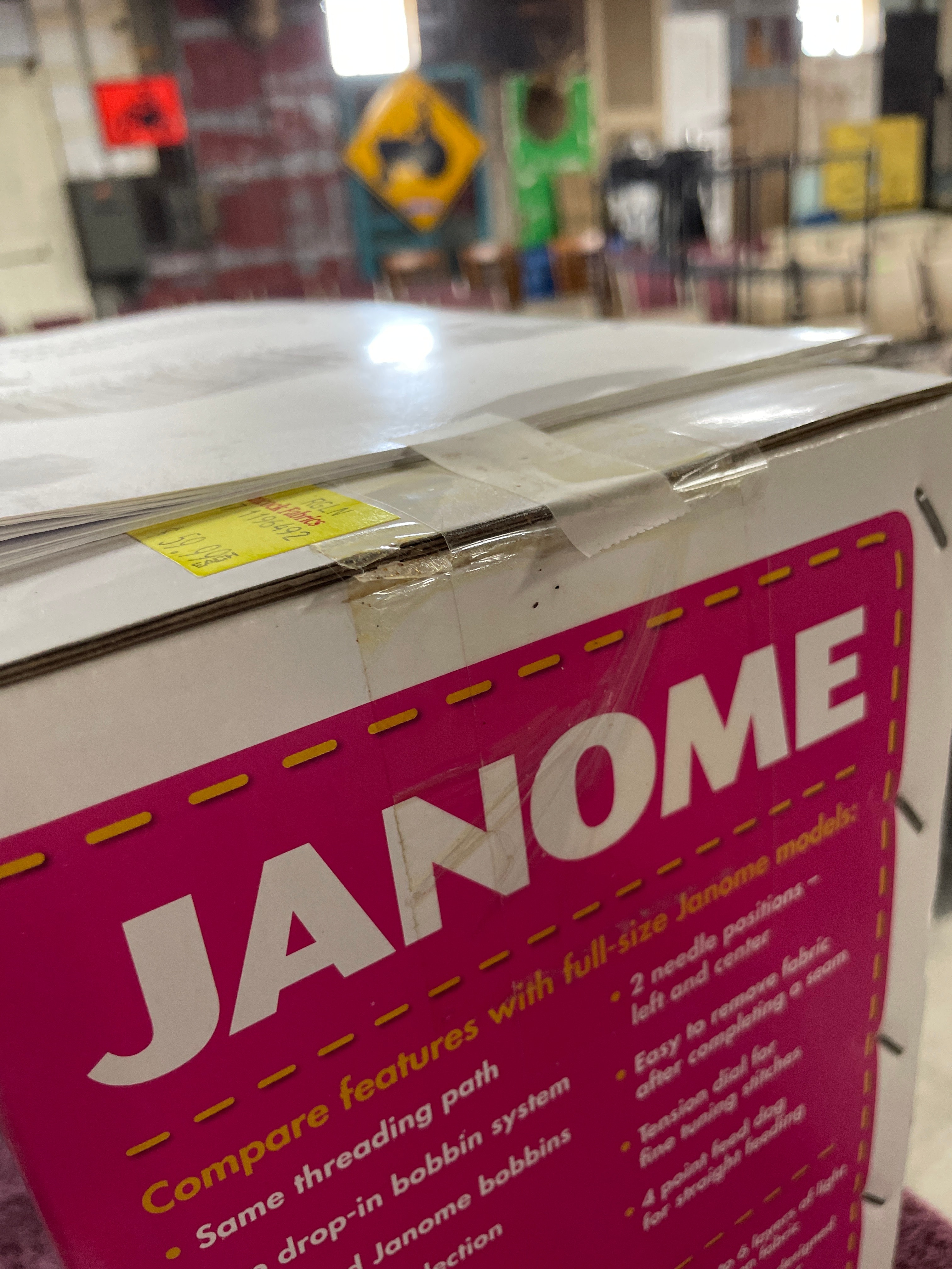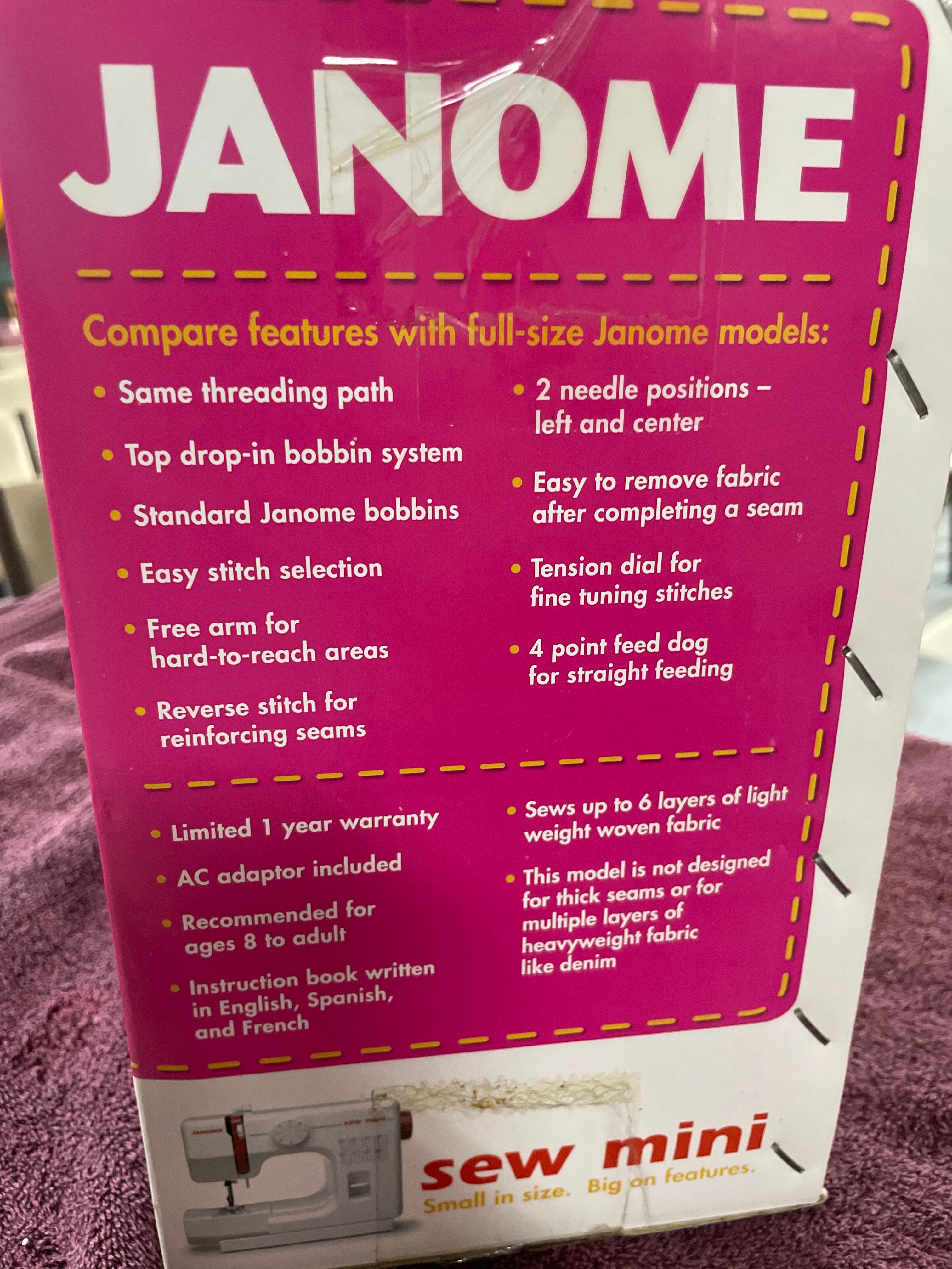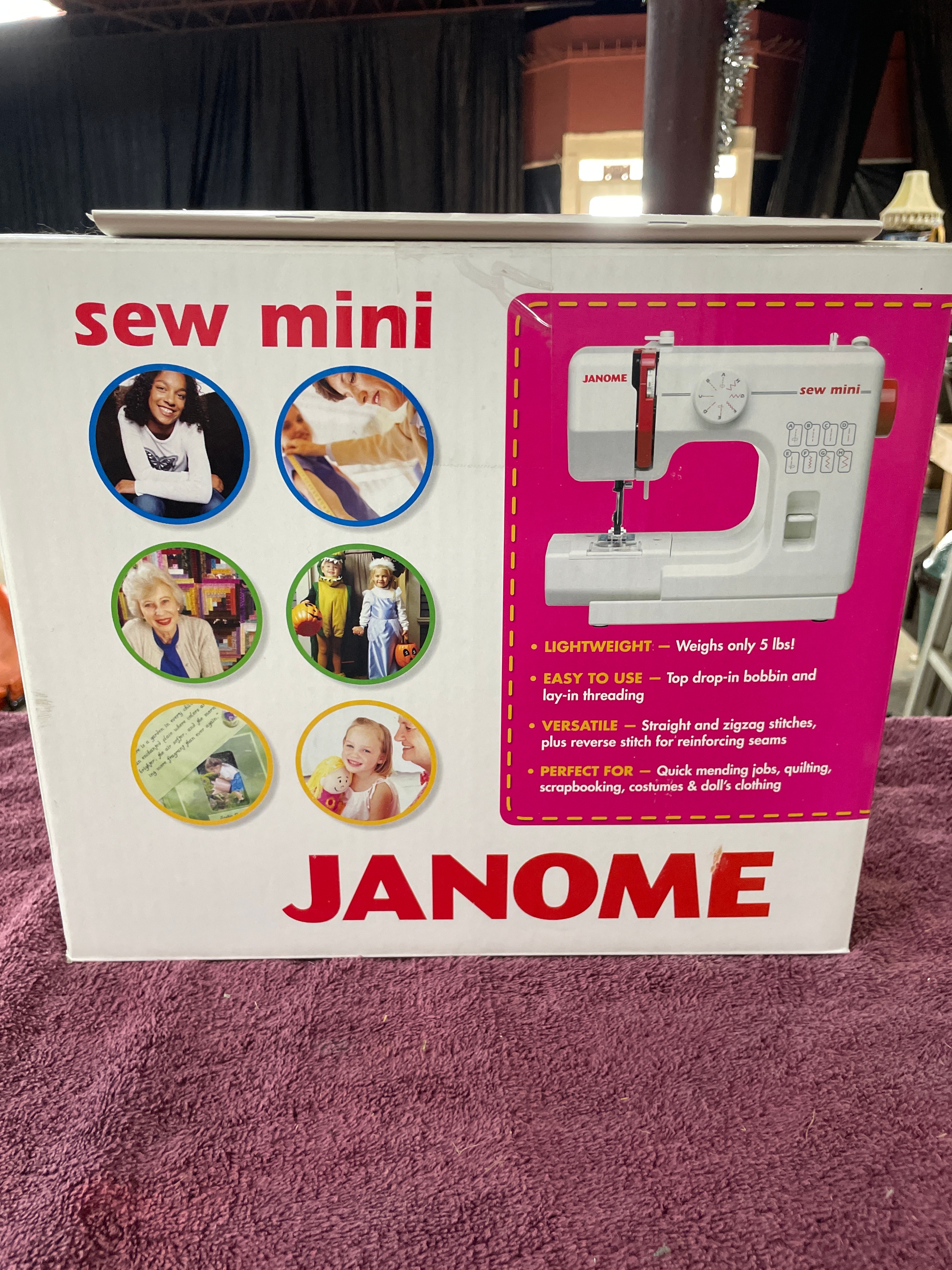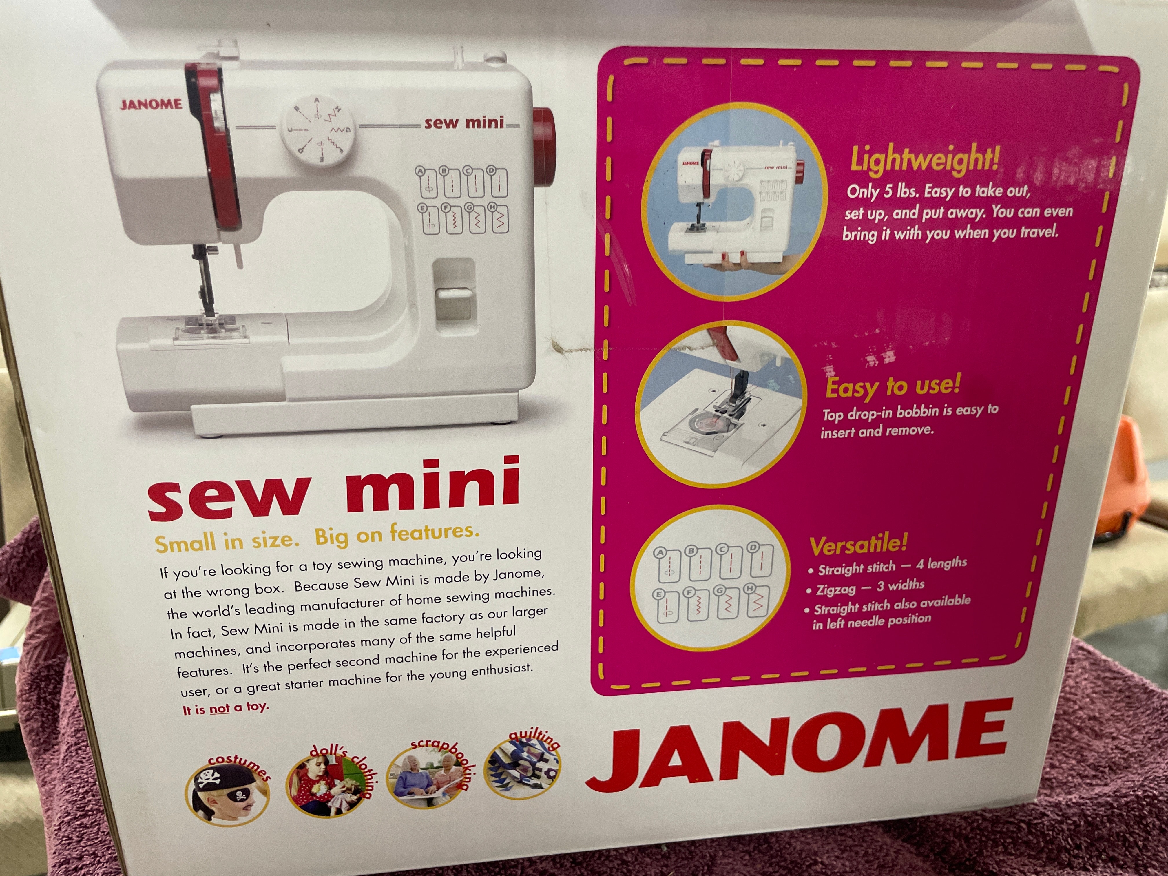 A white and pink boxed Janome “sew mini” sewing machine, depicting a white and red machine, accompanied by an “INSTRUCTION BOOK” manual, with a visible price of $10.99 on a yellow label.