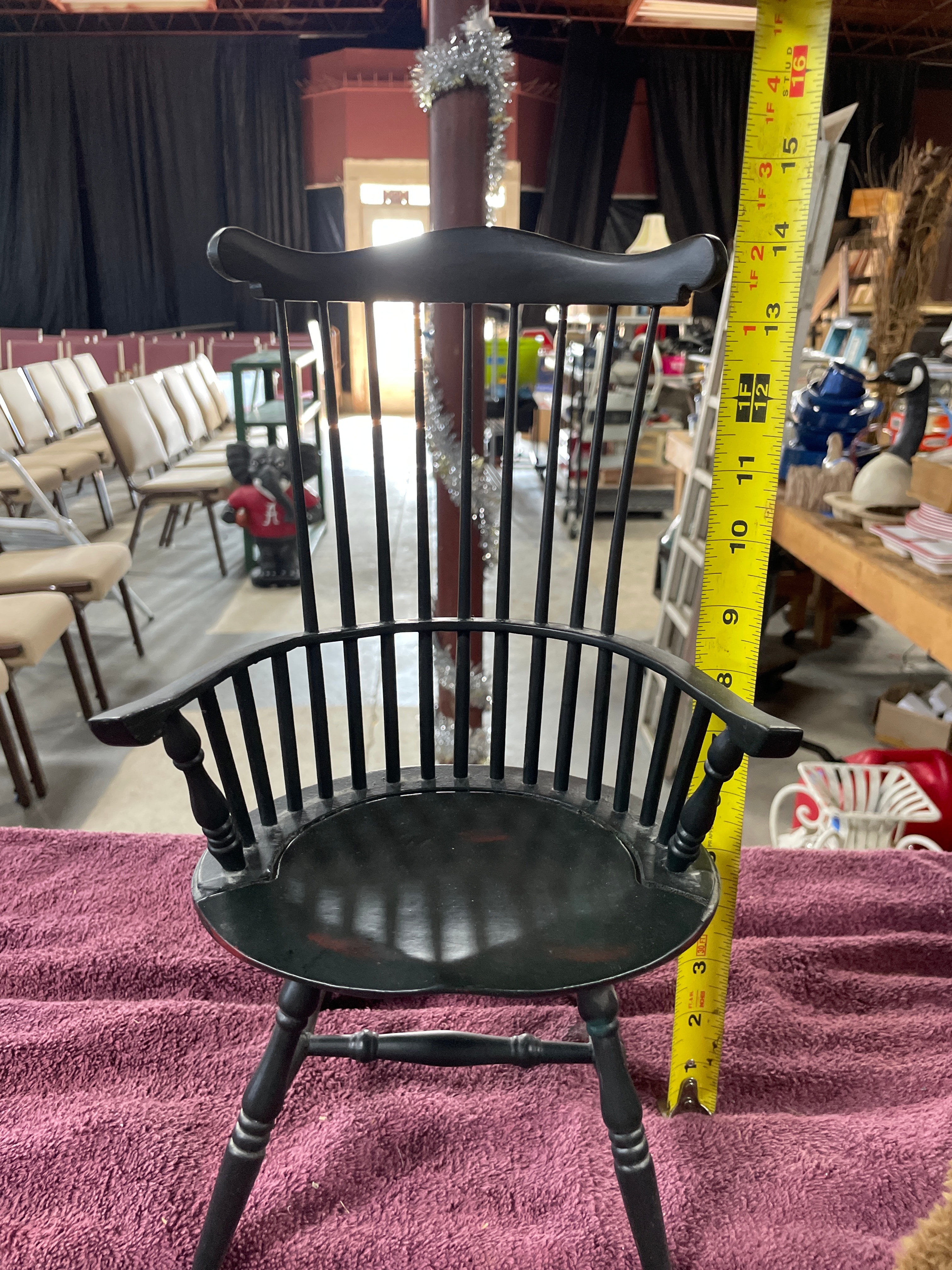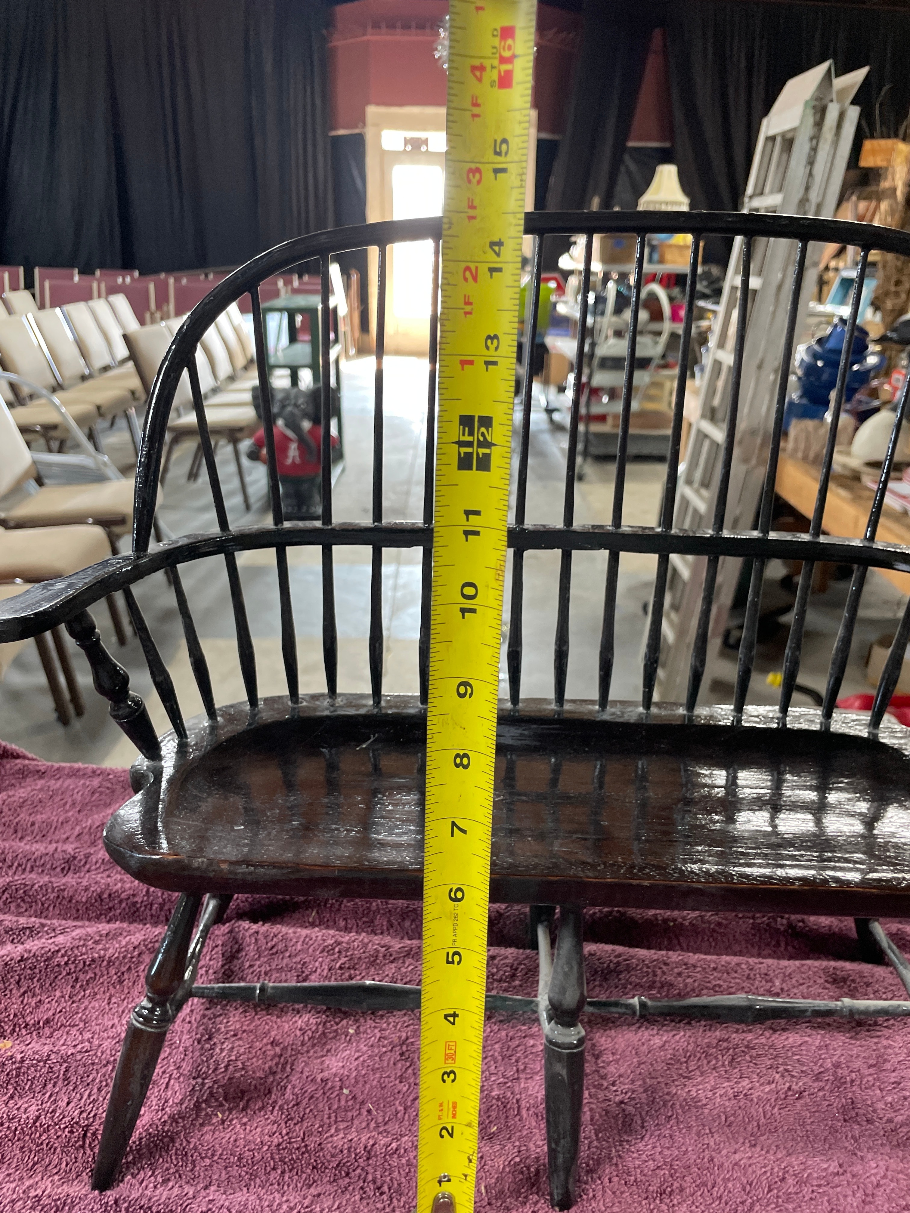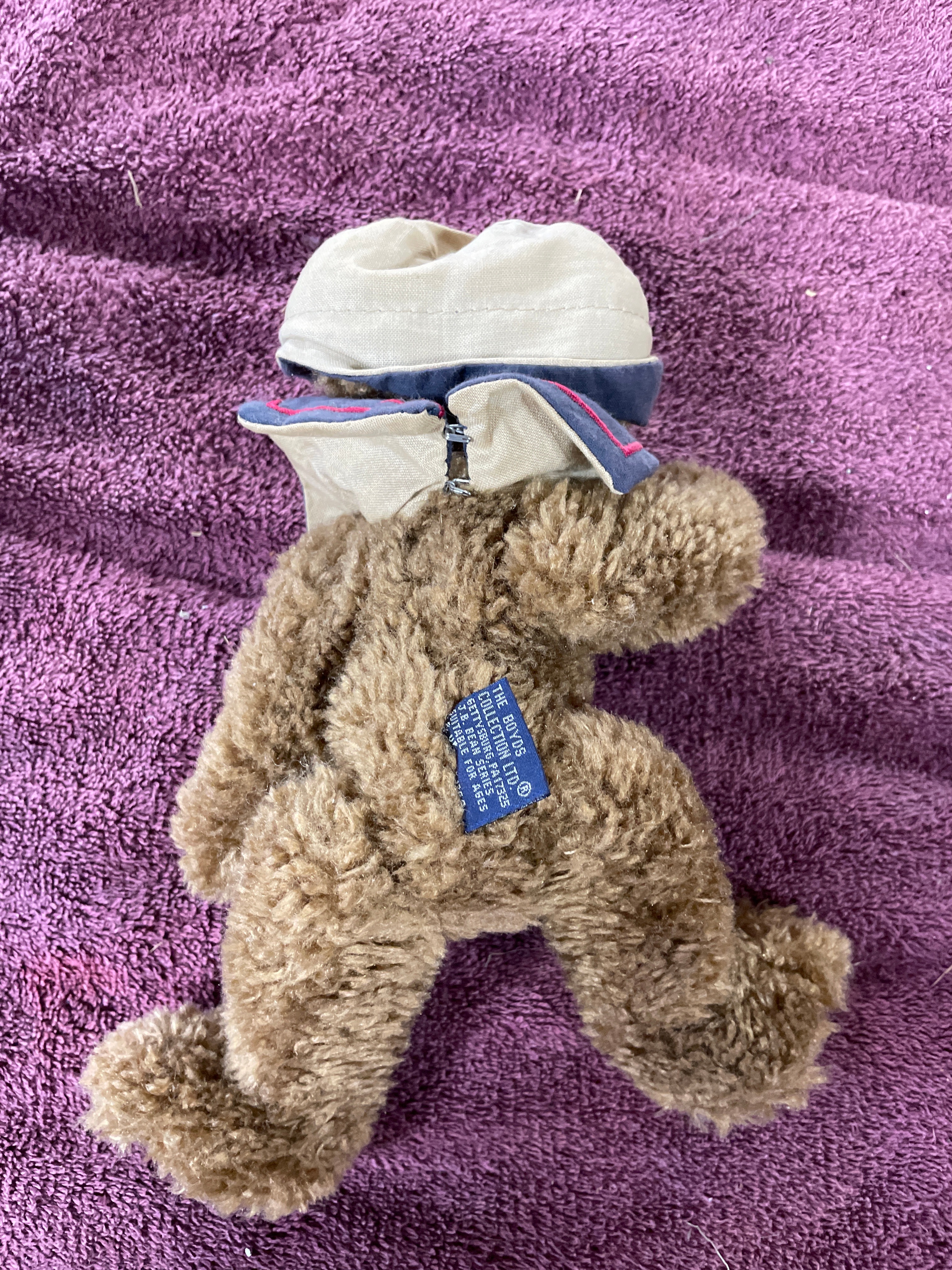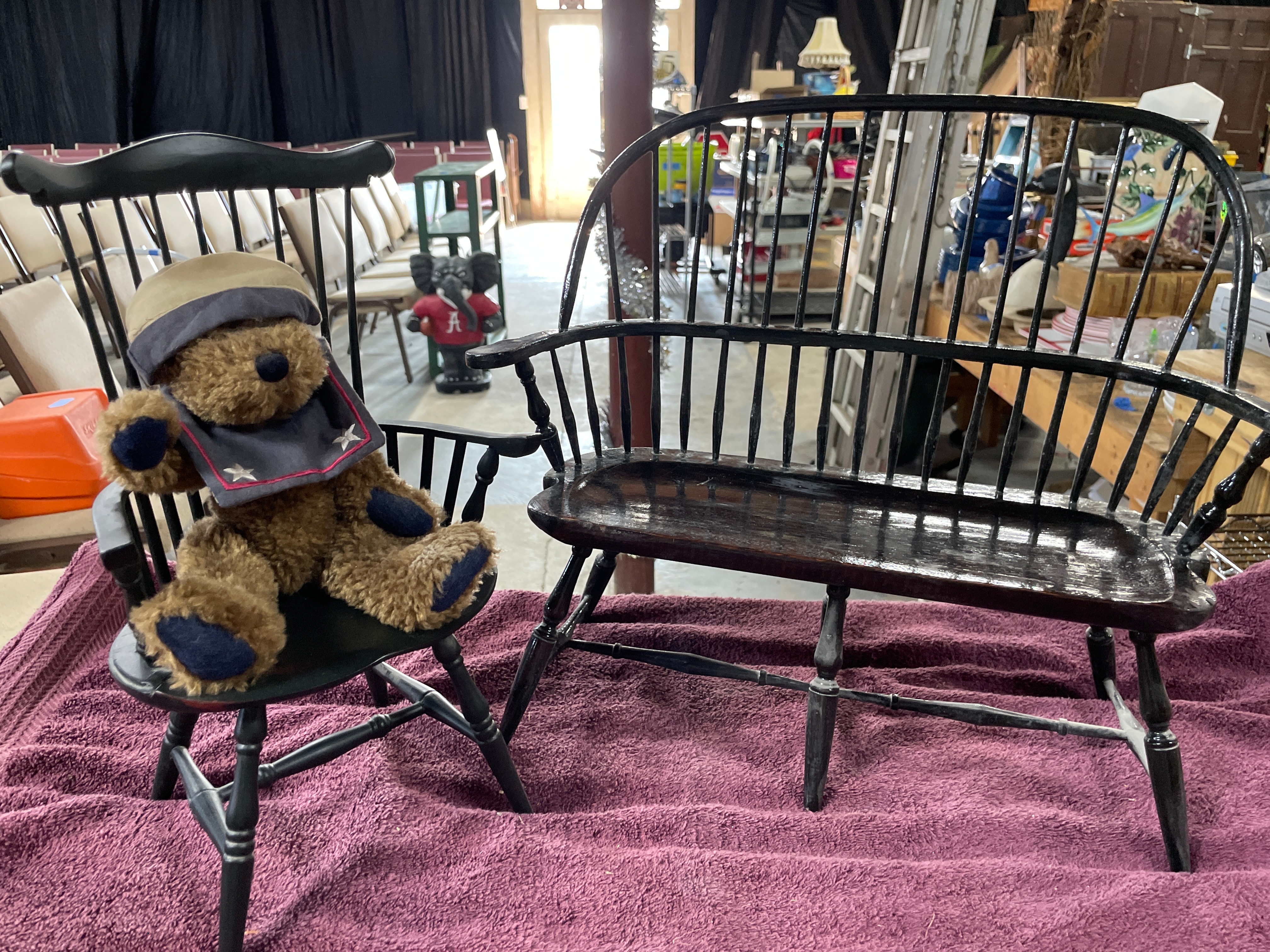 A brown Boyds Collection J.B. Bean Series teddy bear wearing a blue and beige sailor outfit, one black Sarreal Ltd. miniature Windsor-style chair approximately 15.5 inches tall, and one black and dark brown miniature Windsor-style bench approximately 15.5 inches tall and 17 inches wide.