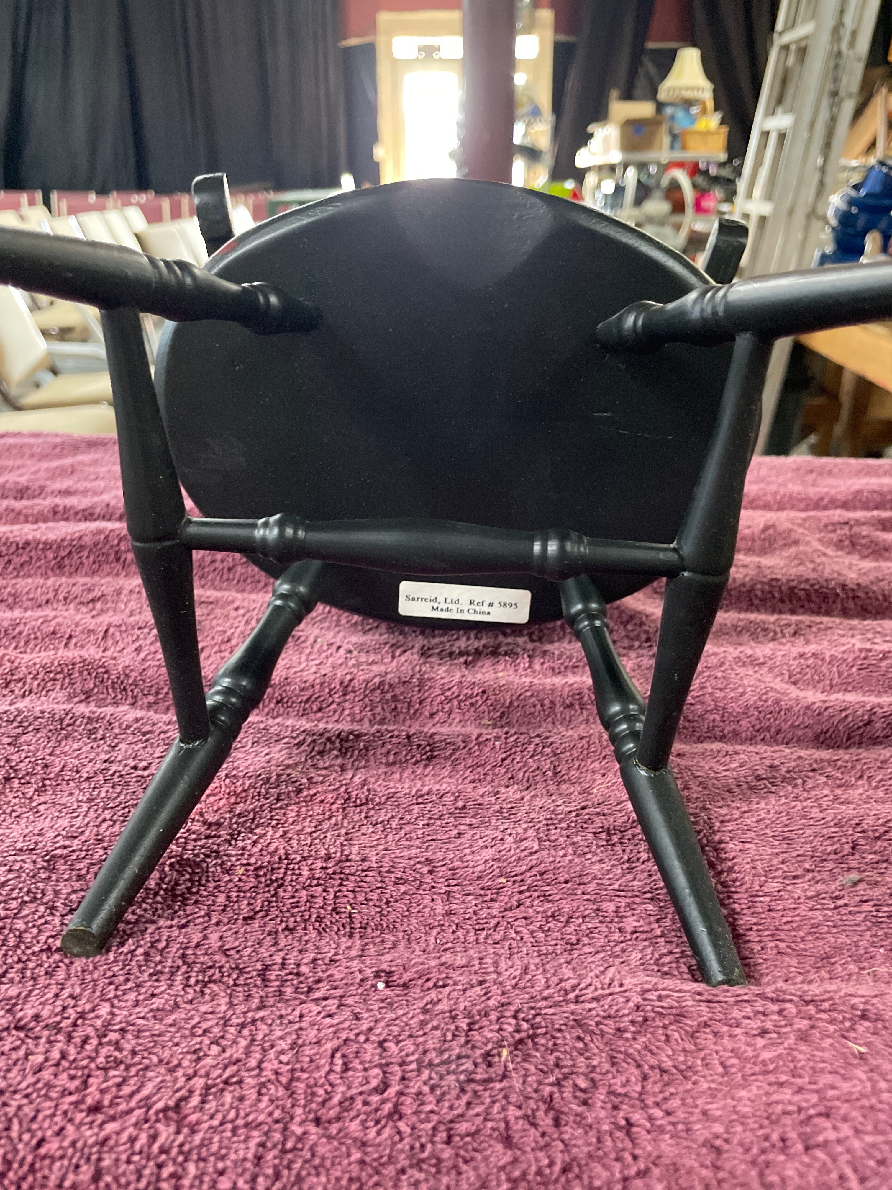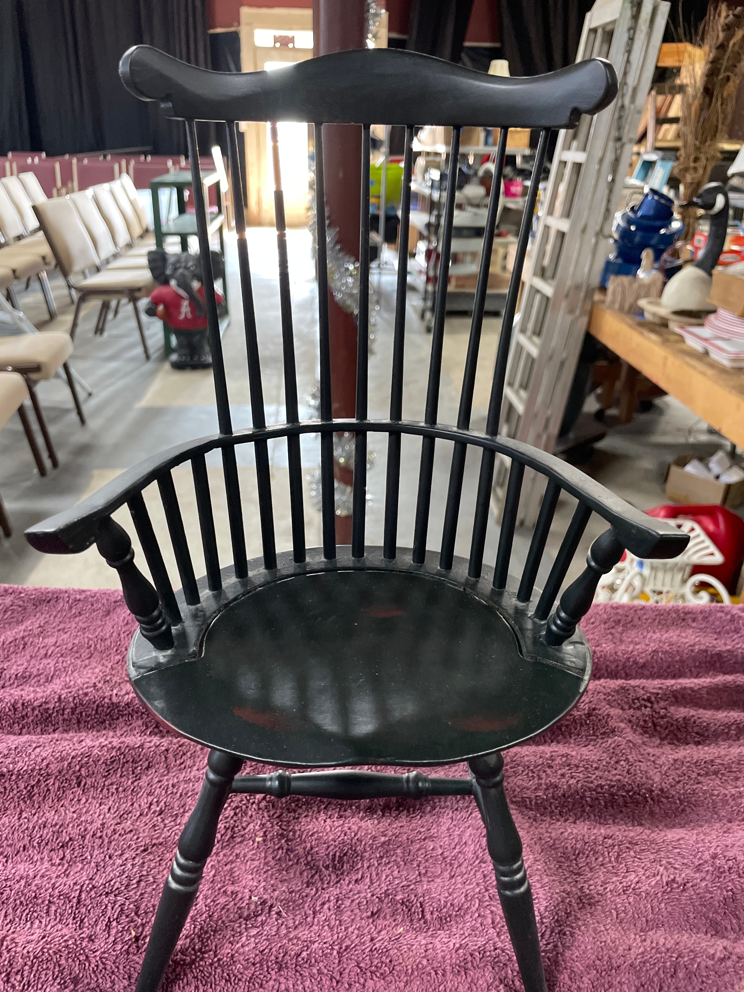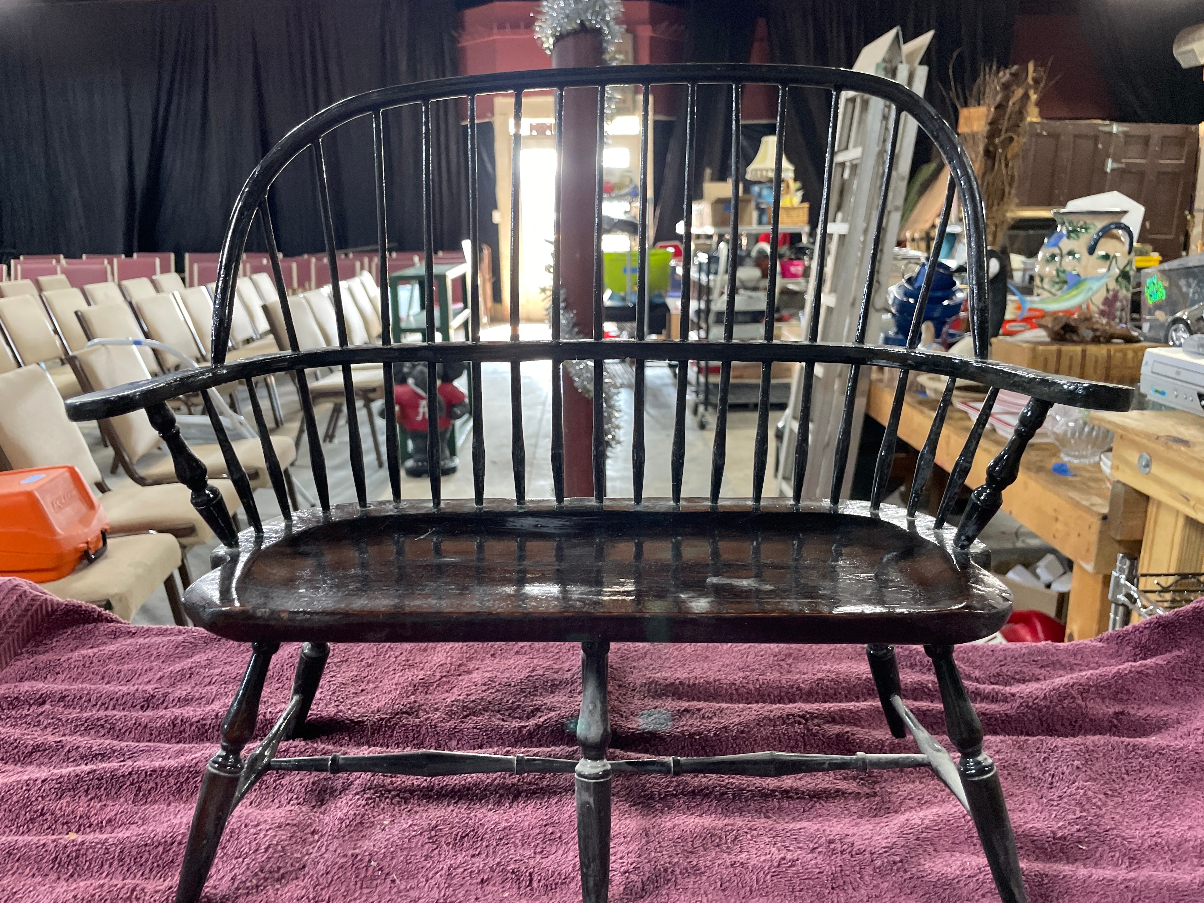 A brown Boyds Collection J.B. Bean Series teddy bear wearing a blue and beige sailor outfit, one black Sarreal Ltd. miniature Windsor-style chair approximately 15.5 inches tall, and one black and dark brown miniature Windsor-style bench approximately 15.5 inches tall and 17 inches wide.