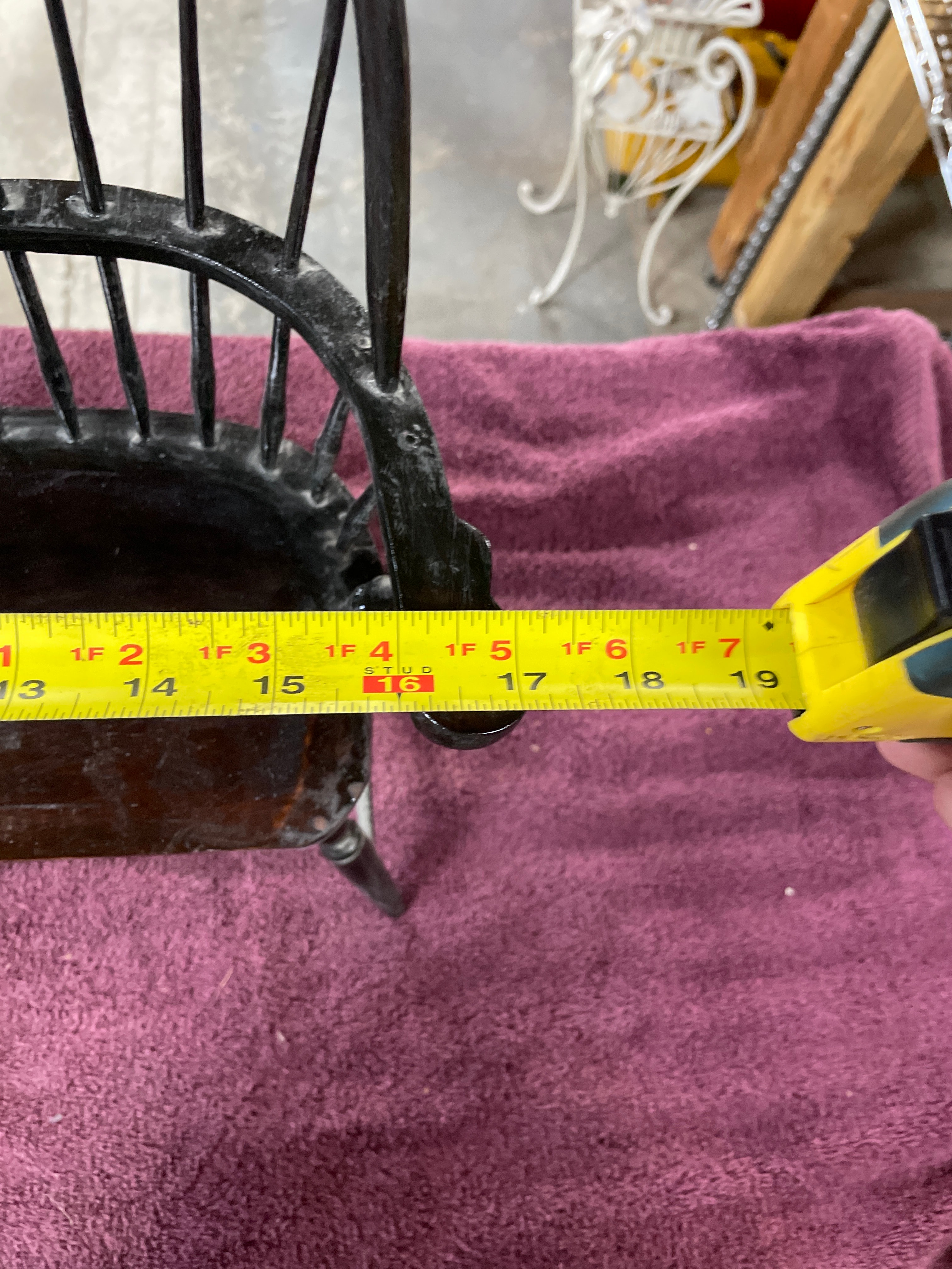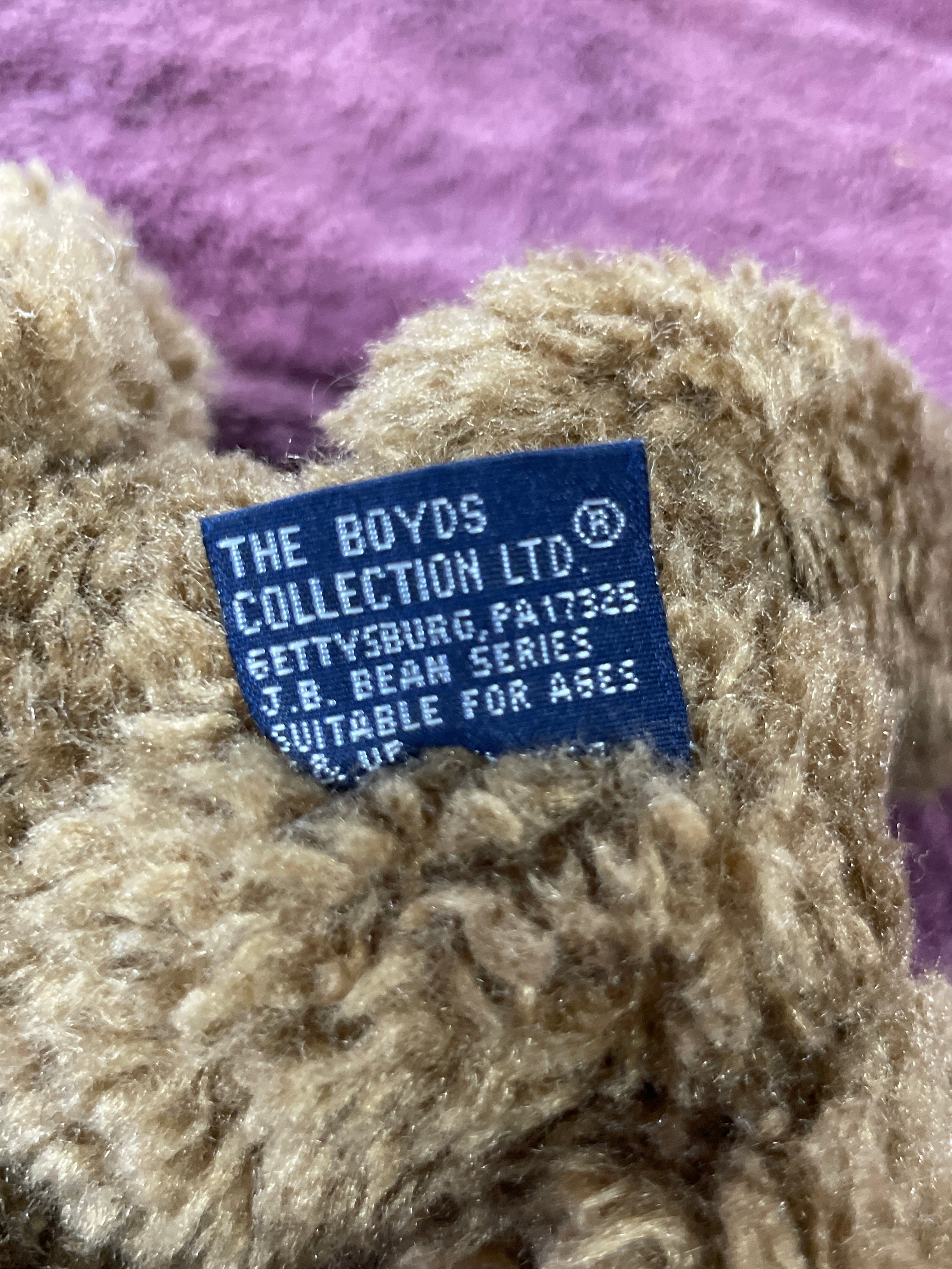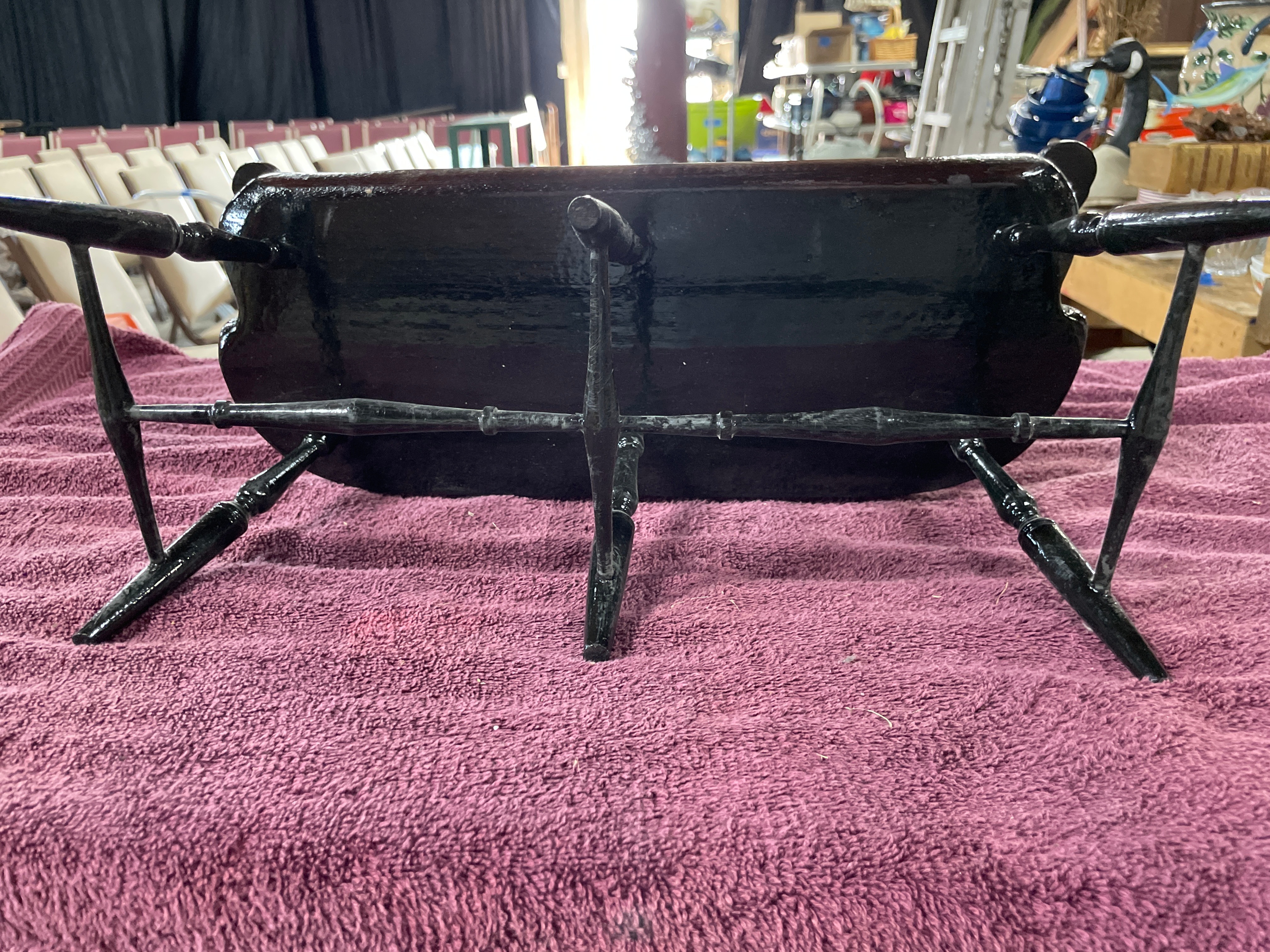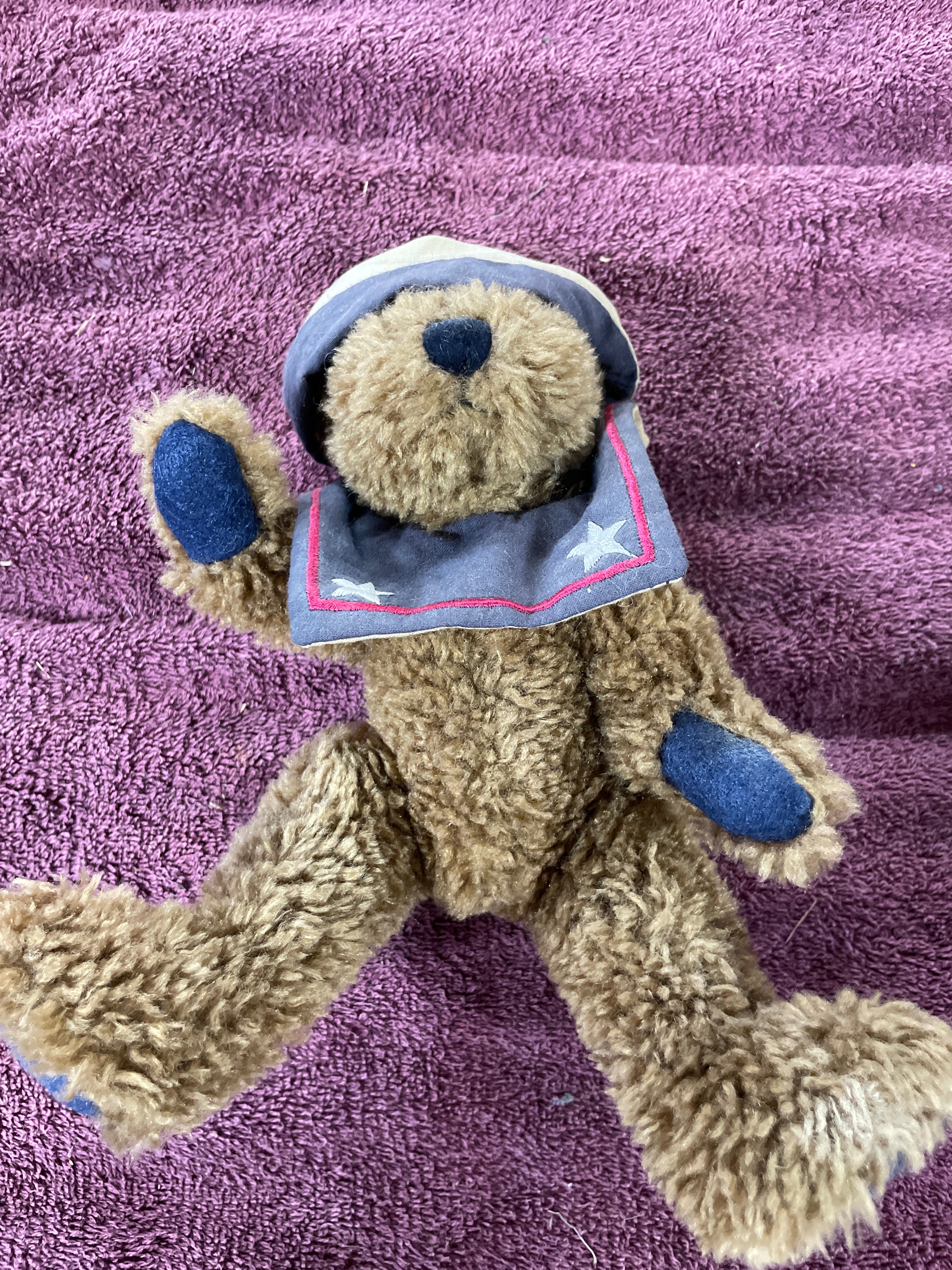 A brown Boyds Collection J.B. Bean Series teddy bear wearing a blue and beige sailor outfit, one black Sarreal Ltd. miniature Windsor-style chair approximately 15.5 inches tall, and one black and dark brown miniature Windsor-style bench approximately 15.5 inches tall and 17 inches wide.
