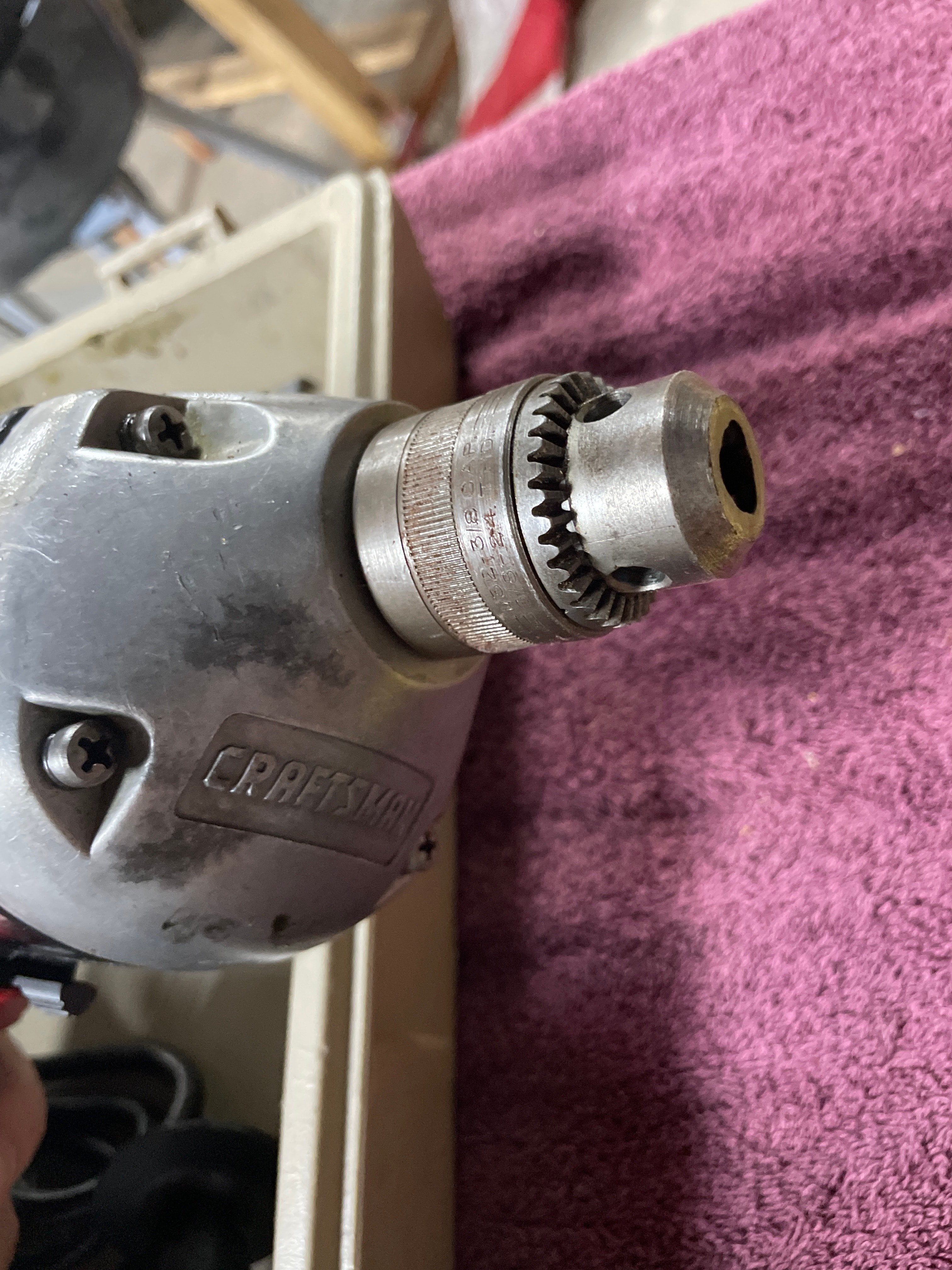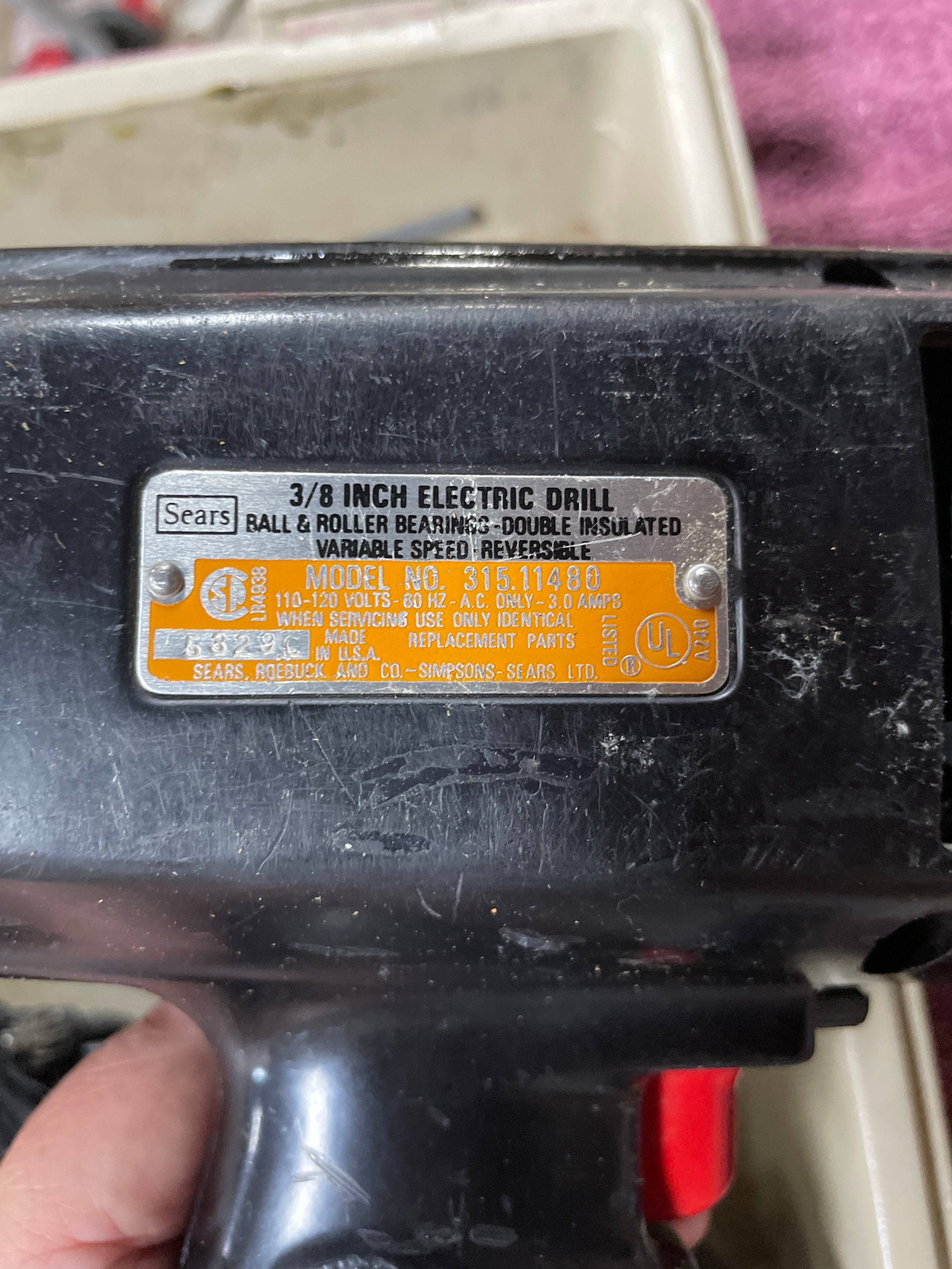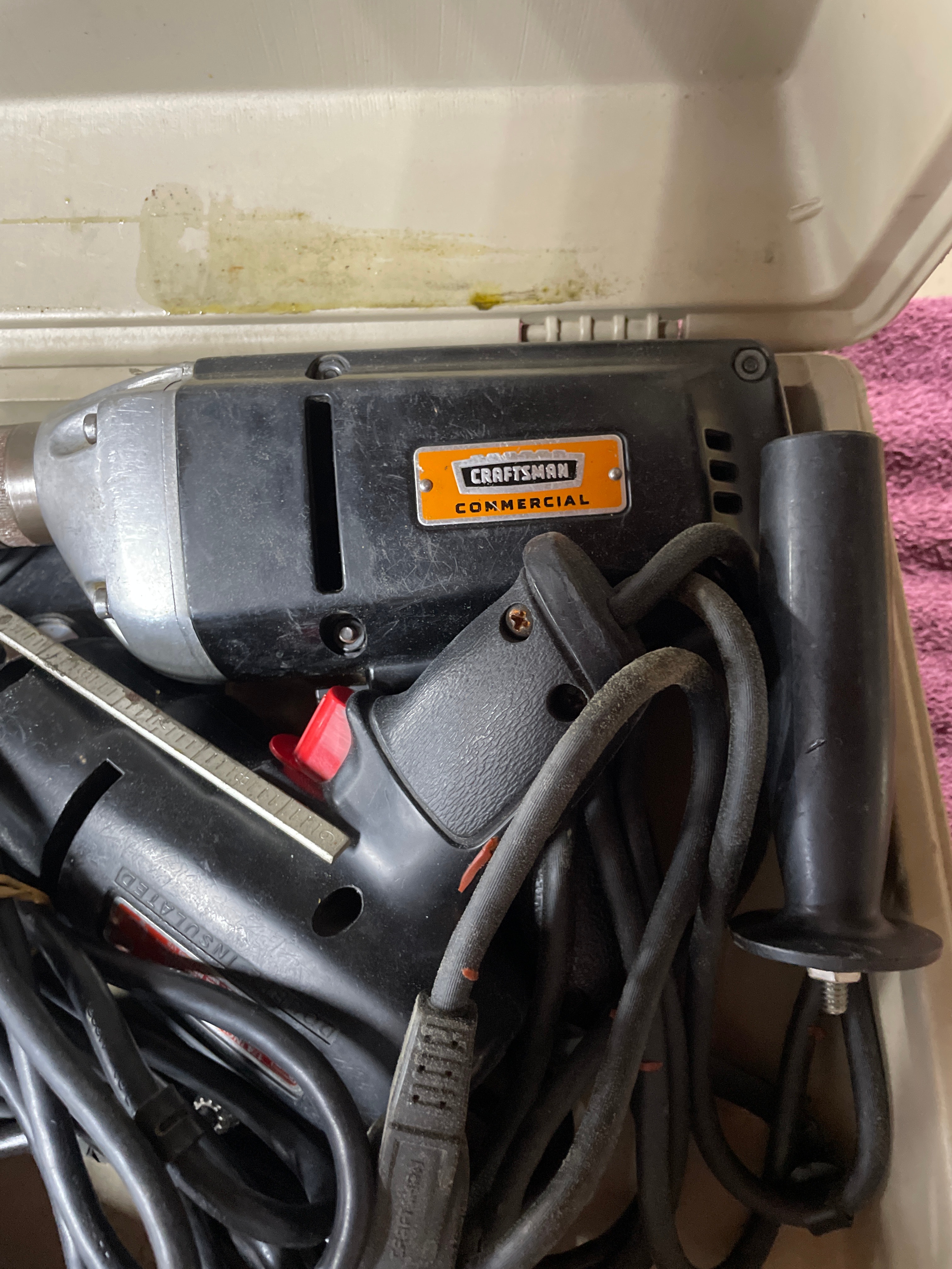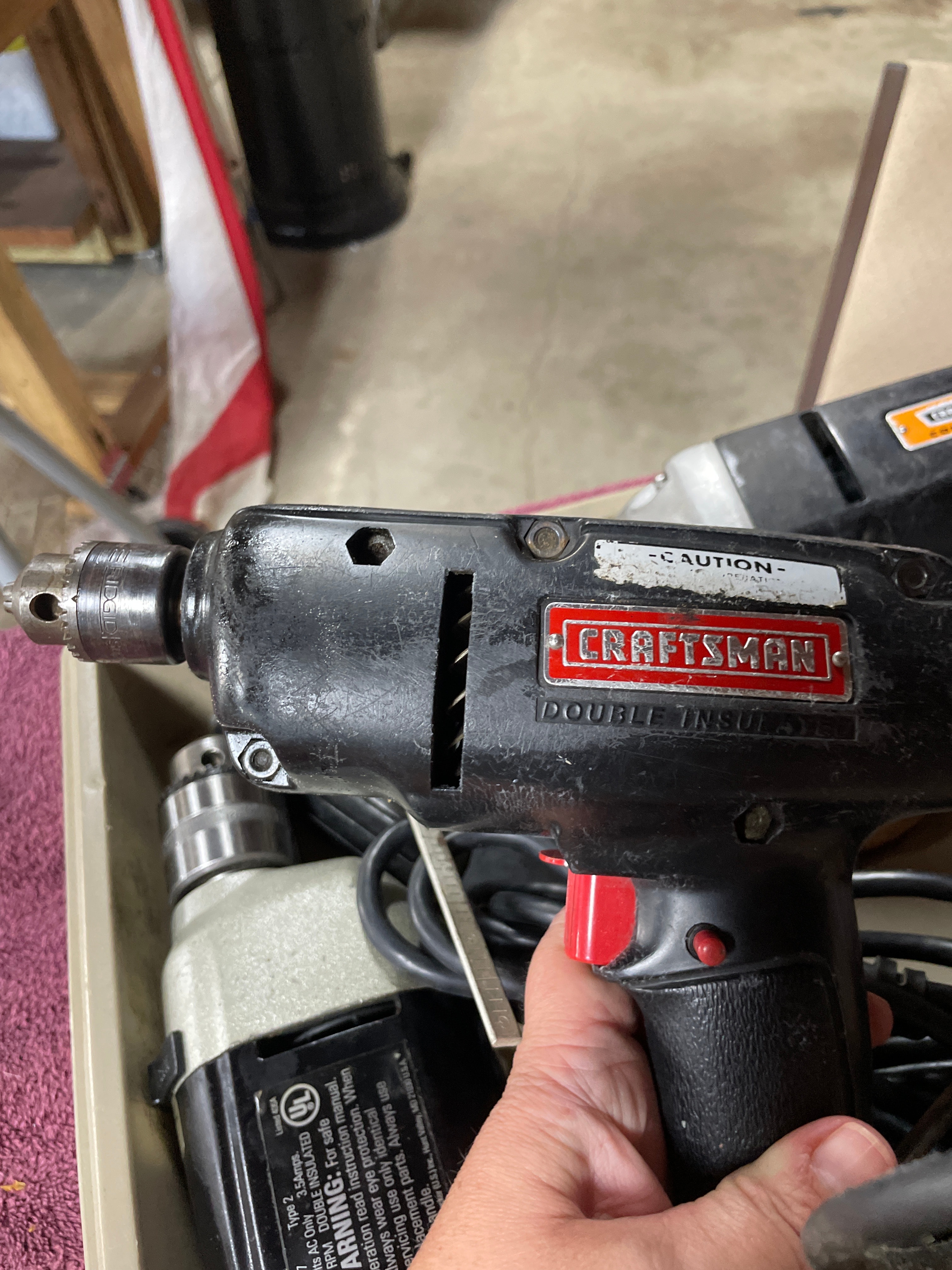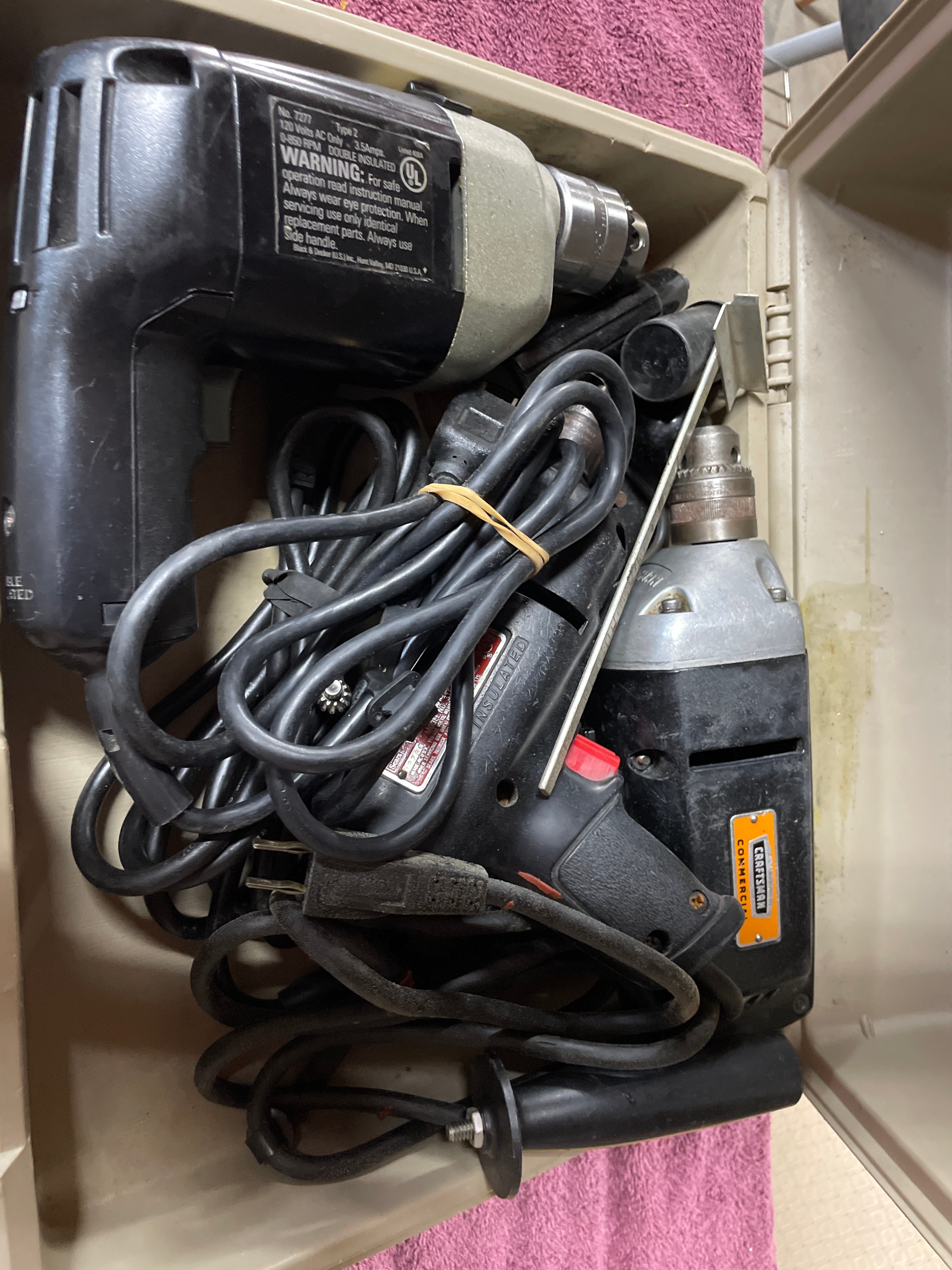 Three electric drills: a black and silver Craftsman Commercial 3/8 inch electric drill (Sears Model No. 315.11486), a black and silver Craftsman Double Insulated 1/4 inch electric drill (Sears Model No. 315.11410), and a black and light grey Black&Decker 1/2 inch drill (No. 1272 Type 2) featuring variable speed, reversing, drilling, screw driving, and hammer action, all housed in a beige Craftsman hard plastic case.