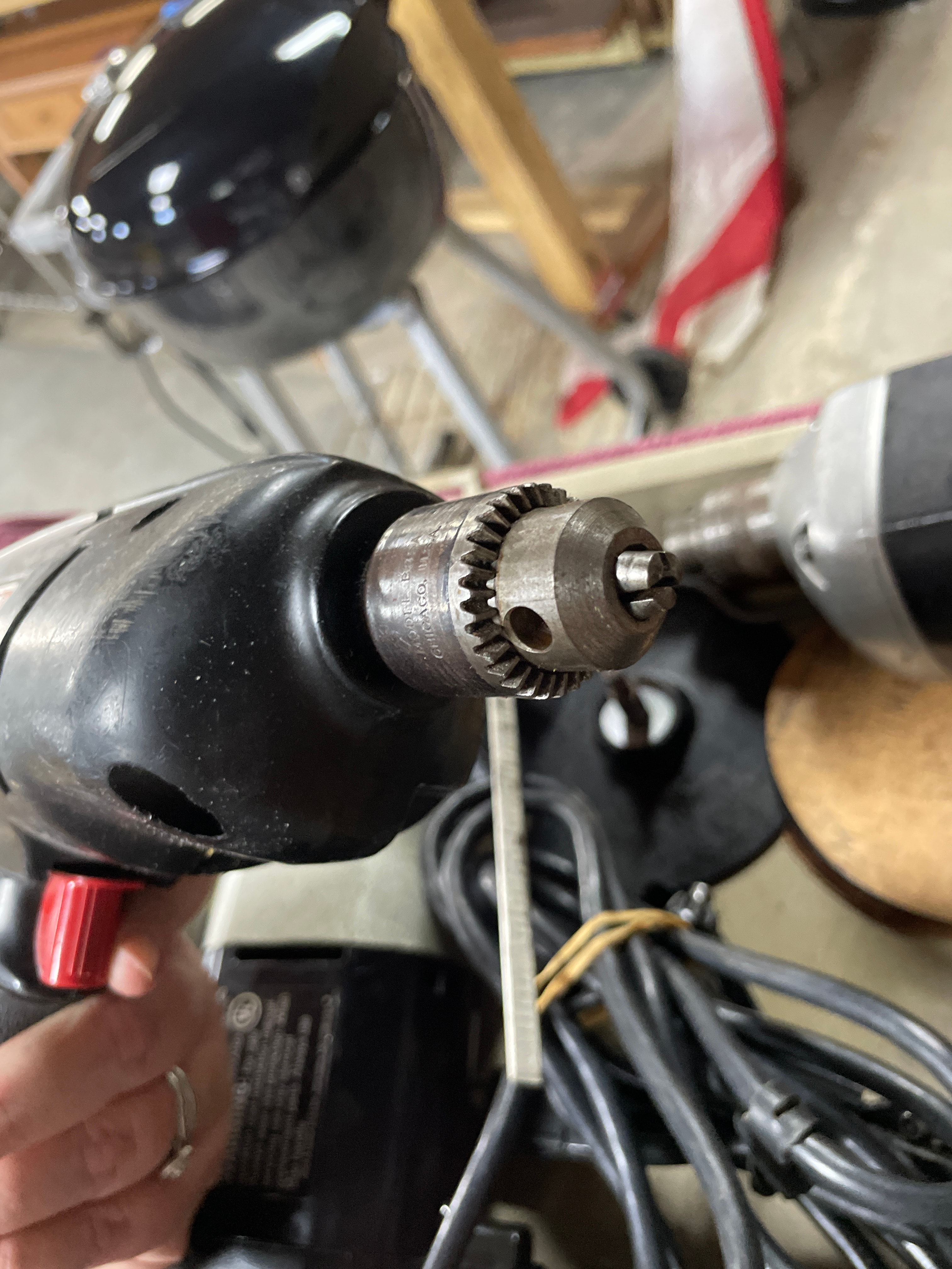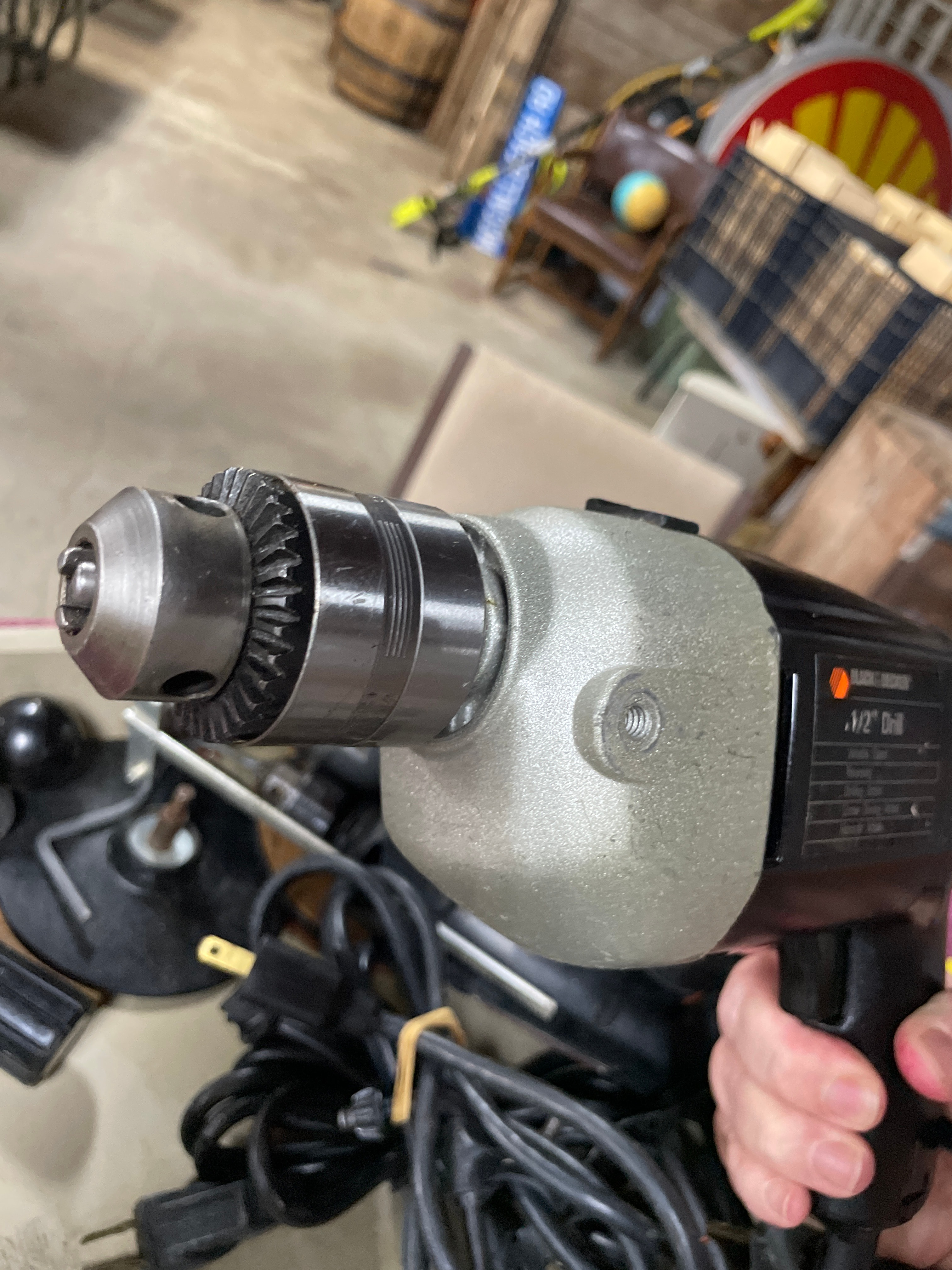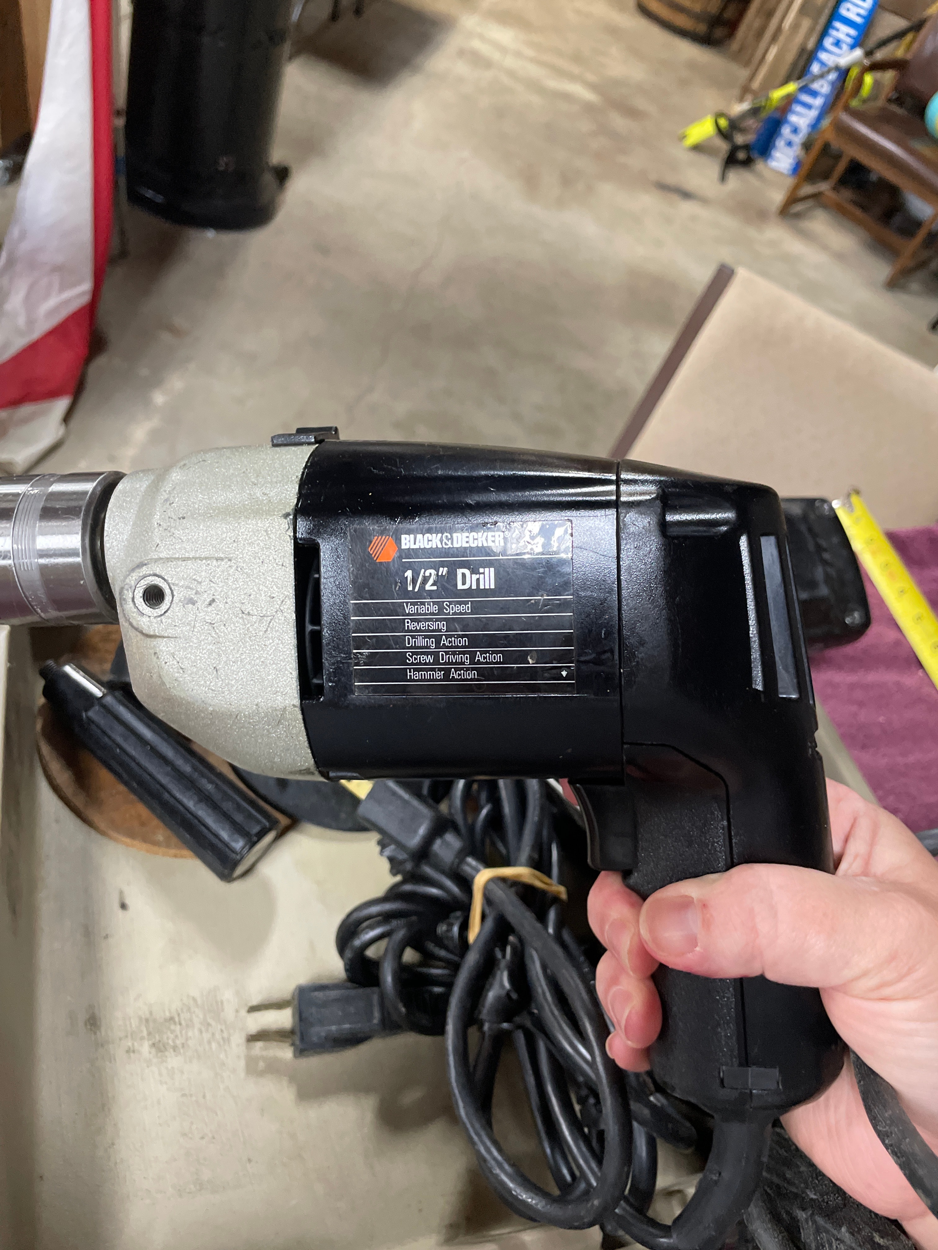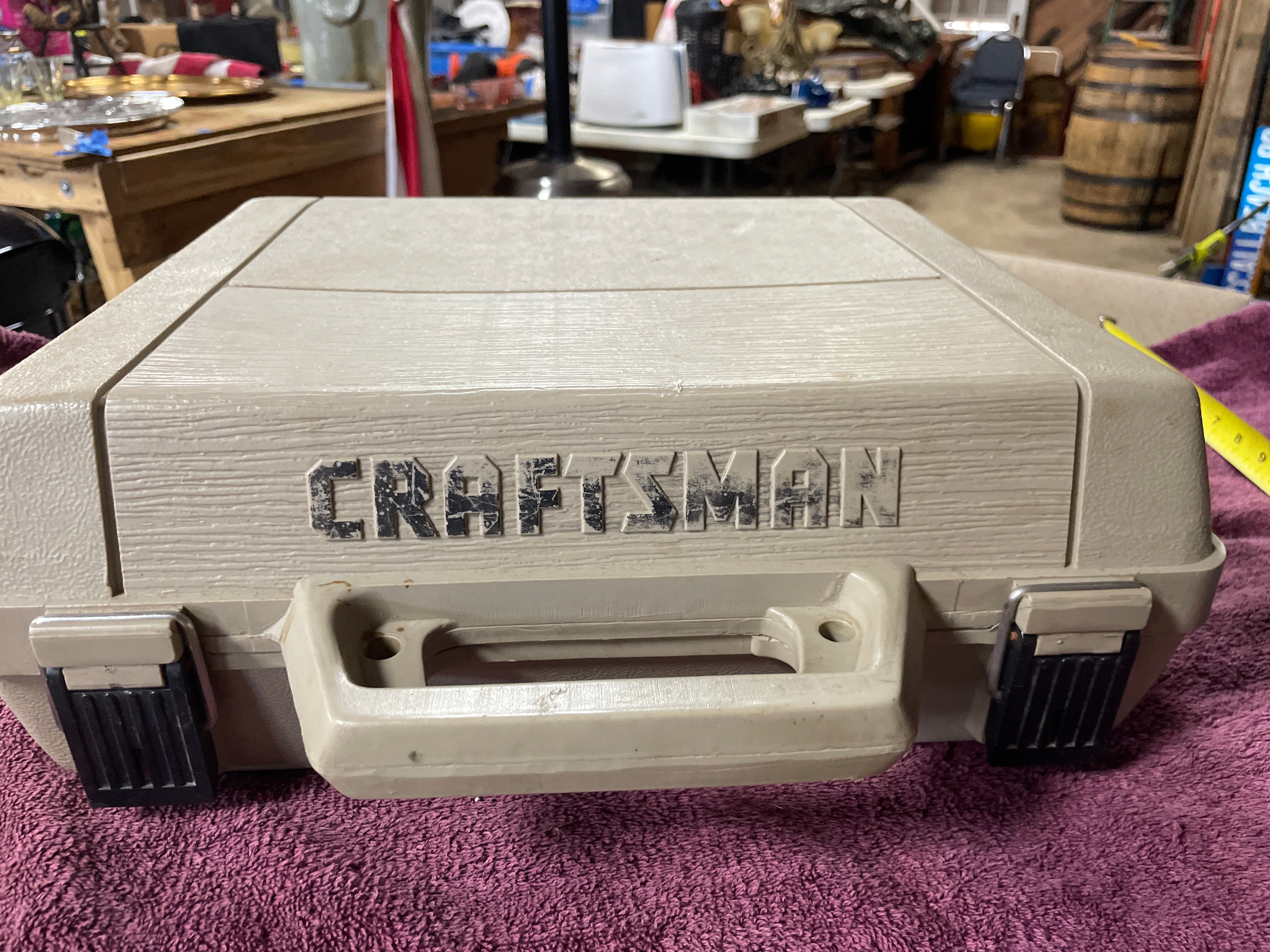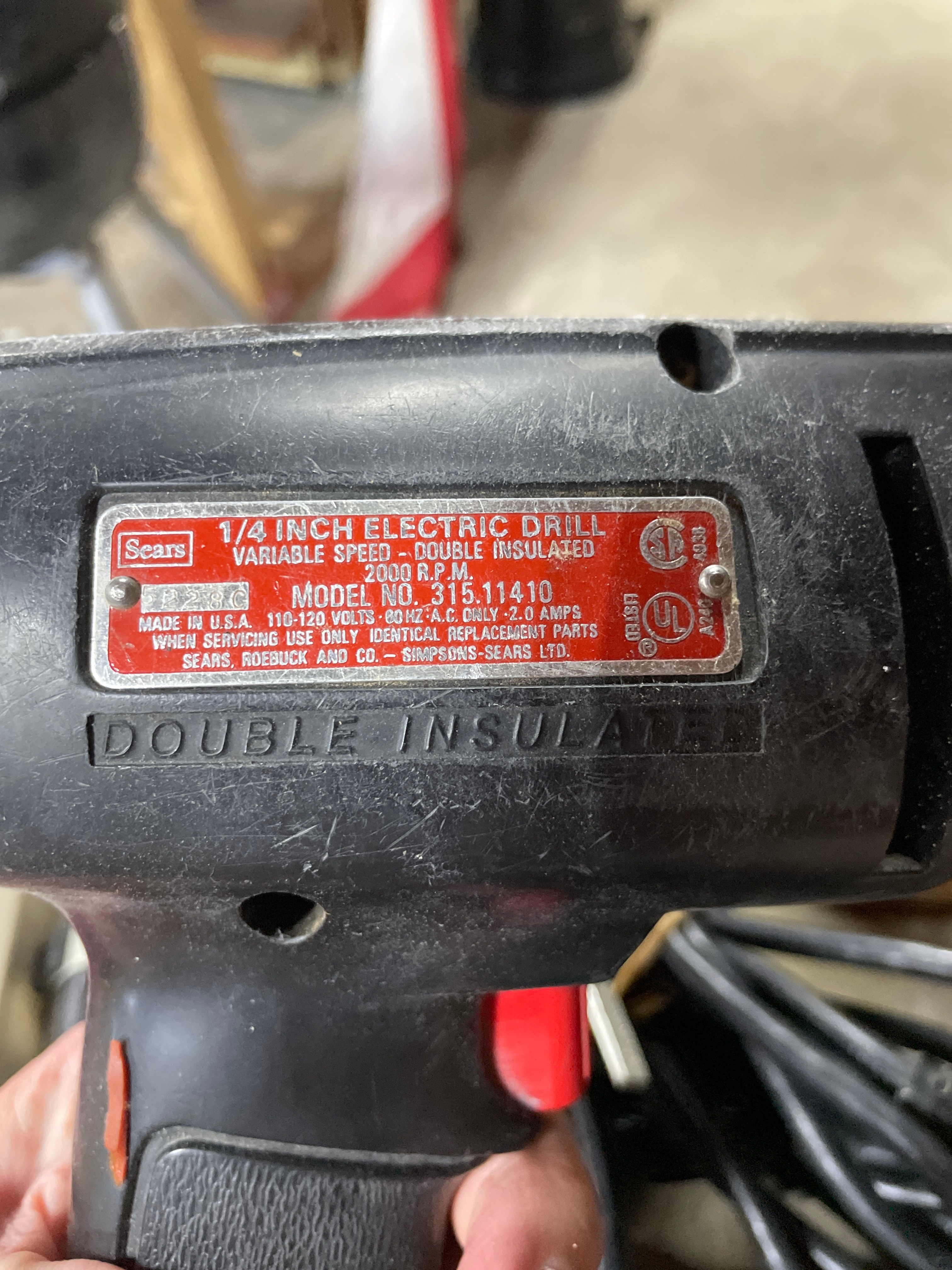 Three electric drills: a black and silver Craftsman Commercial 3/8 inch electric drill (Sears Model No. 315.11486), a black and silver Craftsman Double Insulated 1/4 inch electric drill (Sears Model No. 315.11410), and a black and light grey Black&Decker 1/2 inch drill (No. 1272 Type 2) featuring variable speed, reversing, drilling, screw driving, and hammer action, all housed in a beige Craftsman hard plastic case.