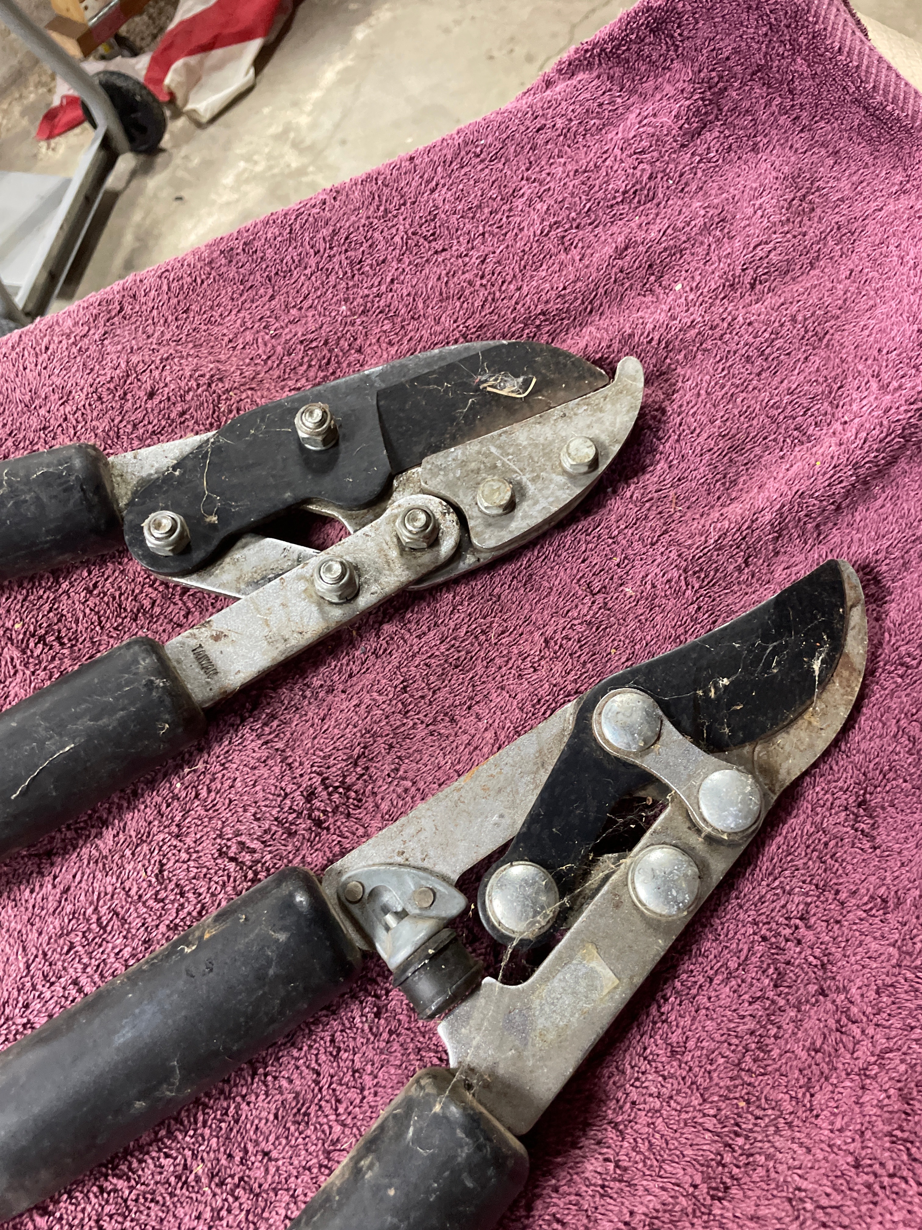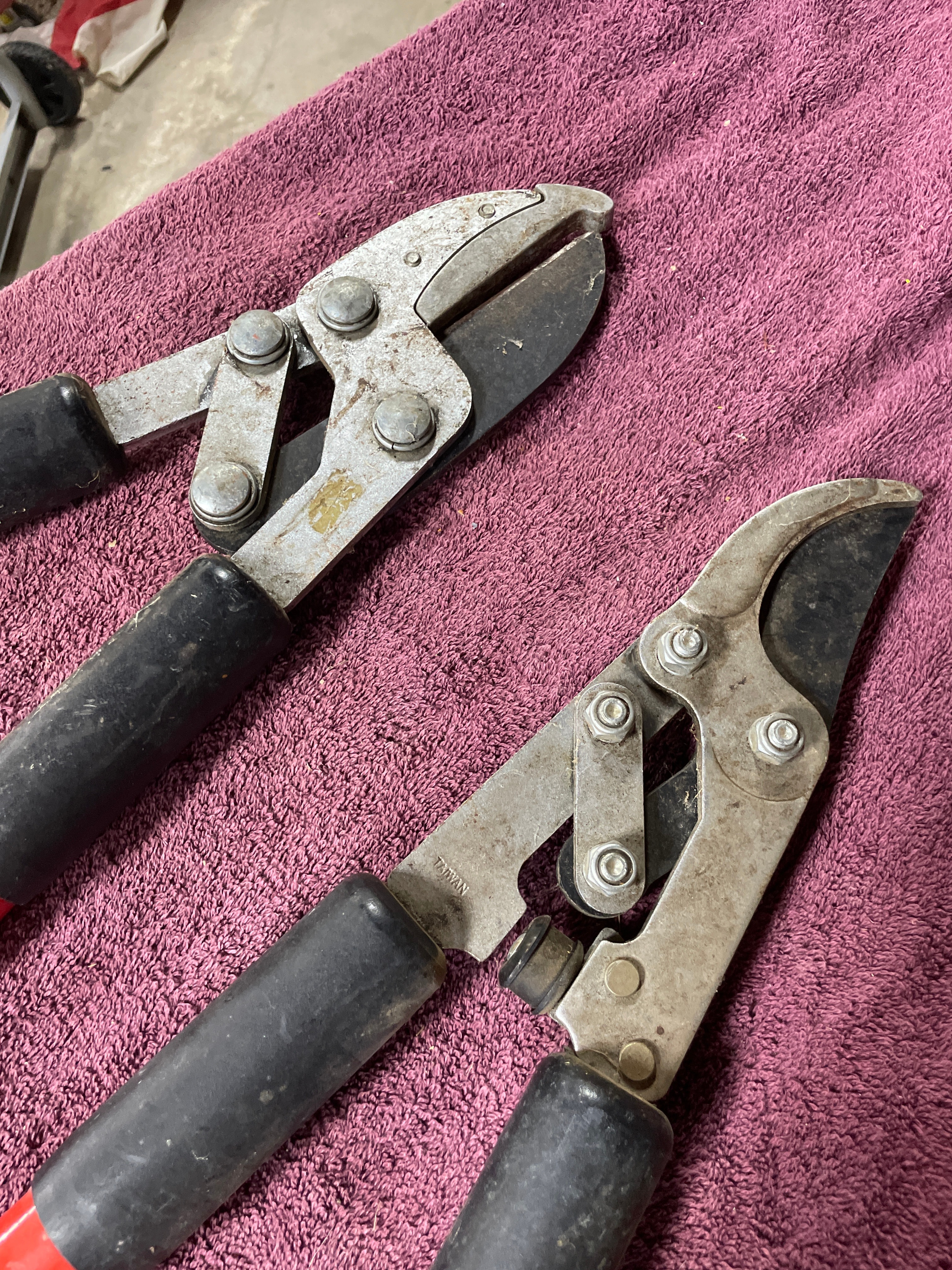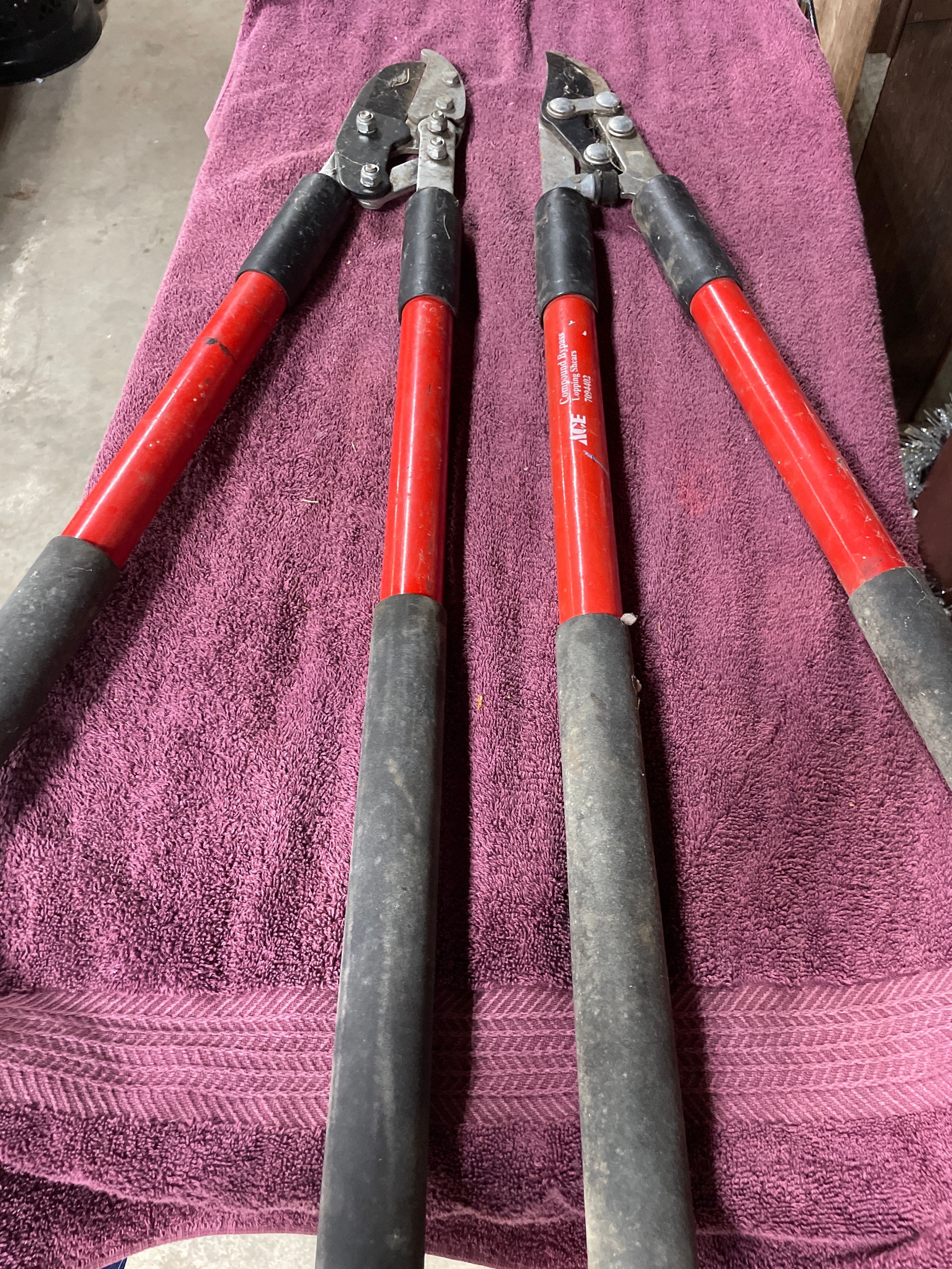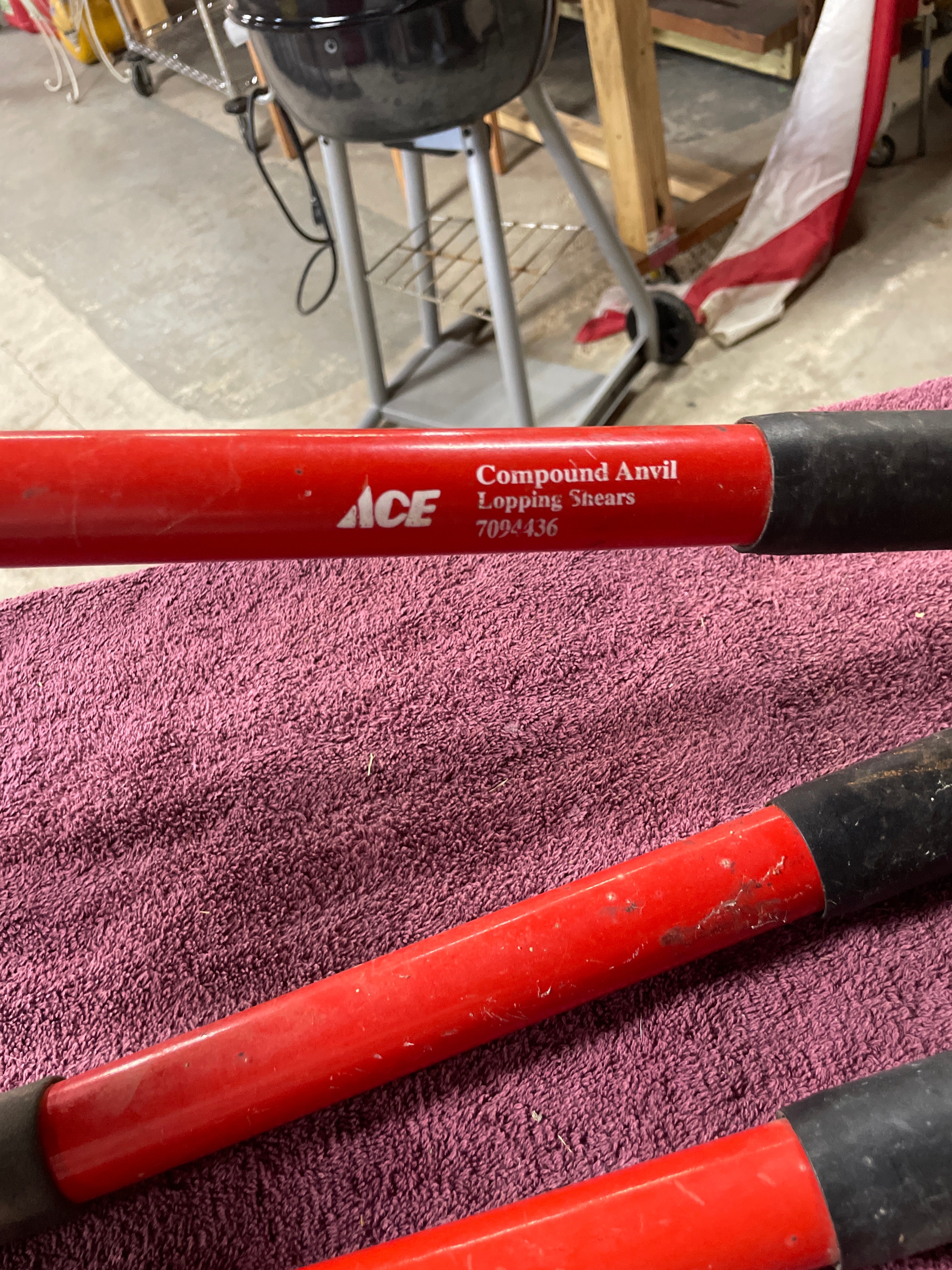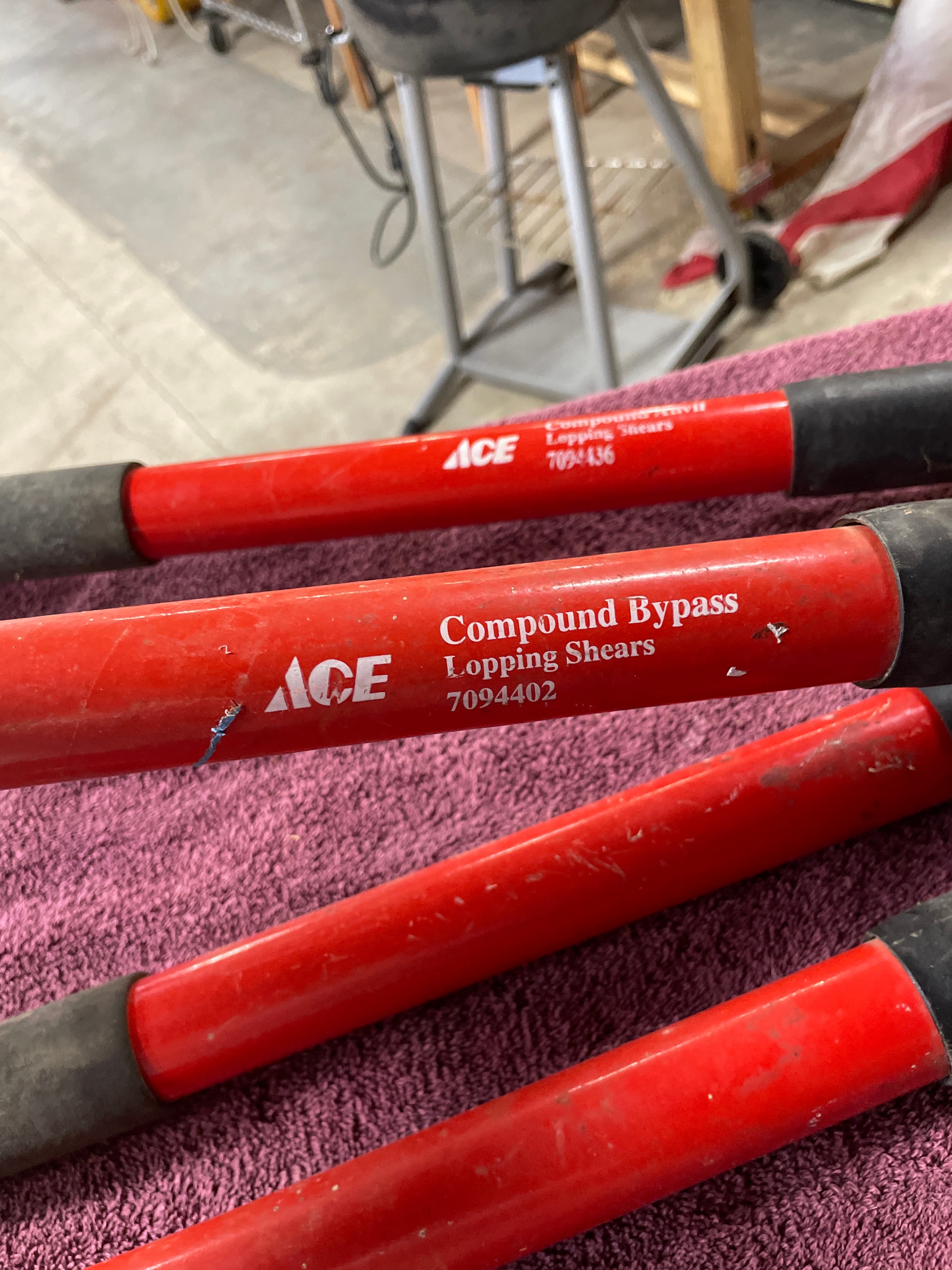 Two pairs of red and silver/black ACE lopping shears, including one Compound Anvil model 709-436 and one Compound Bypass model 7094402 stamped TAIWAN.