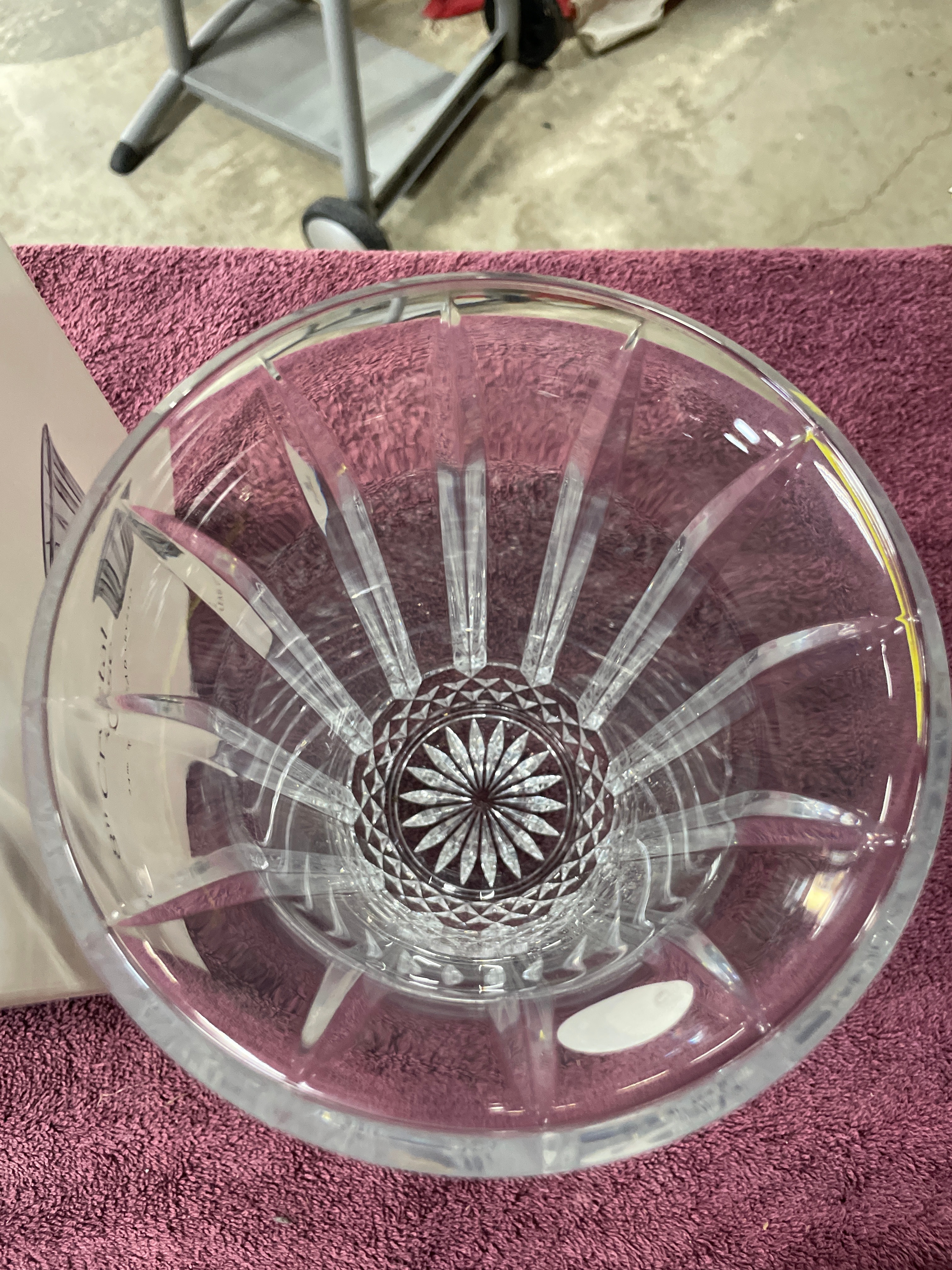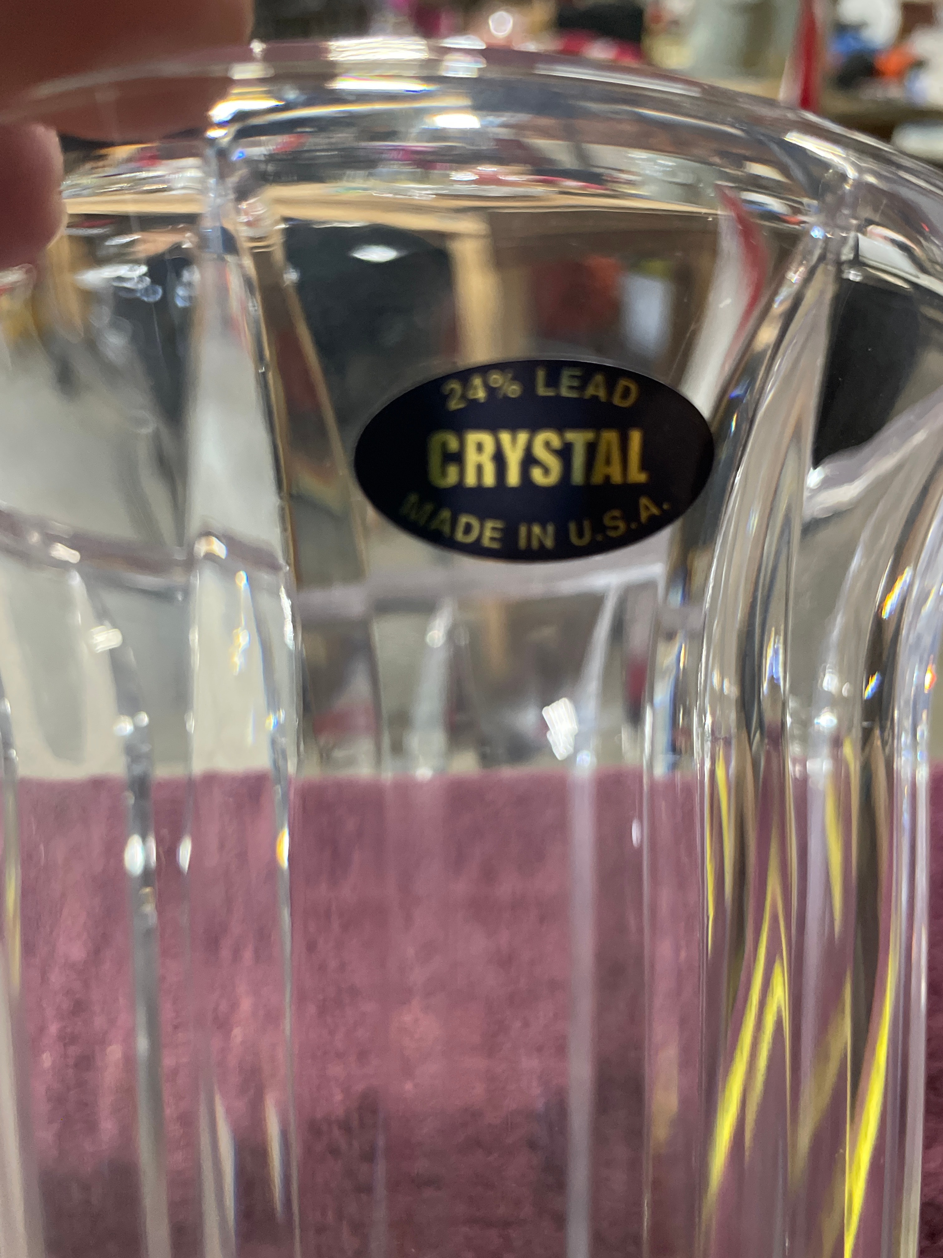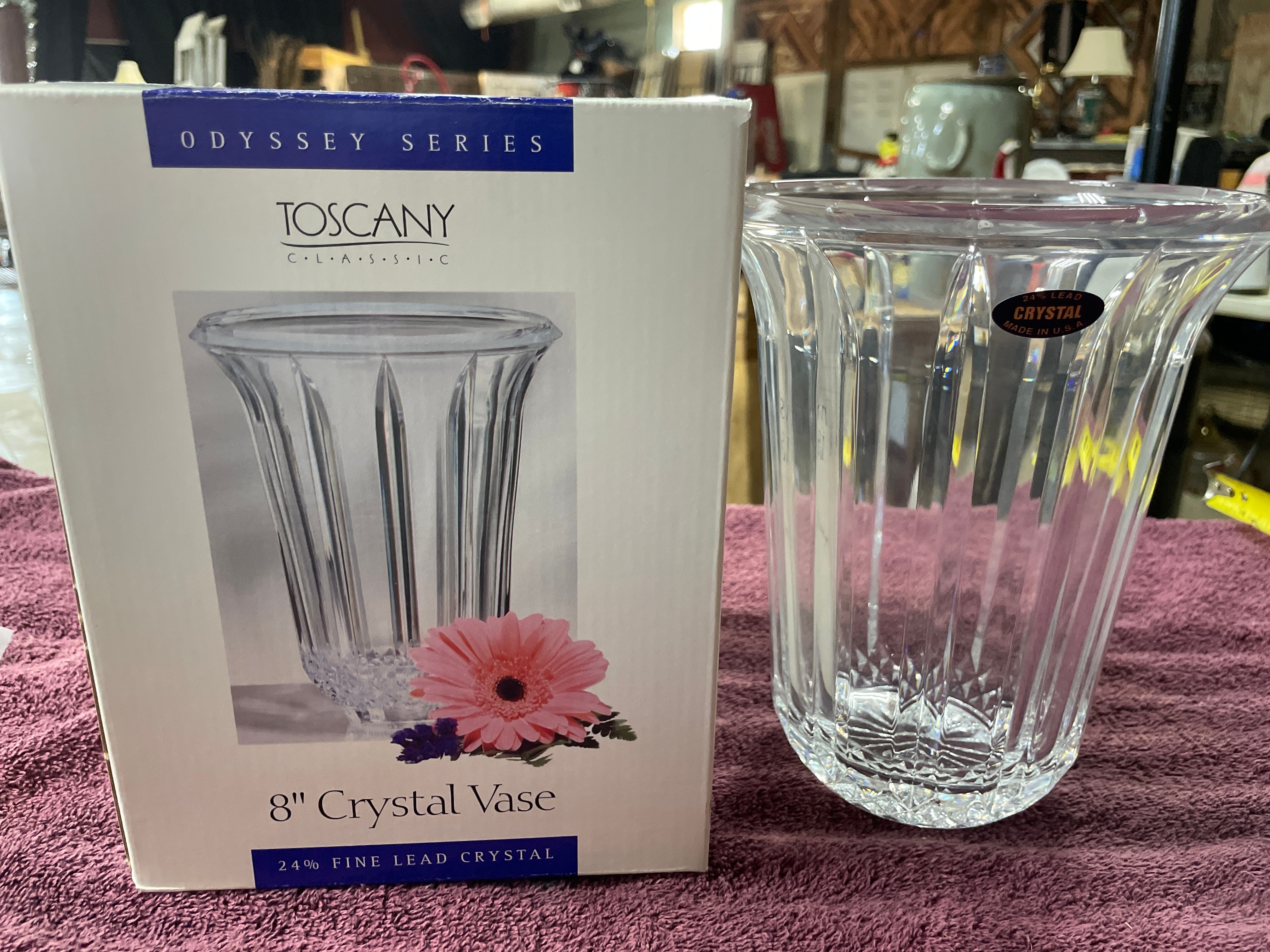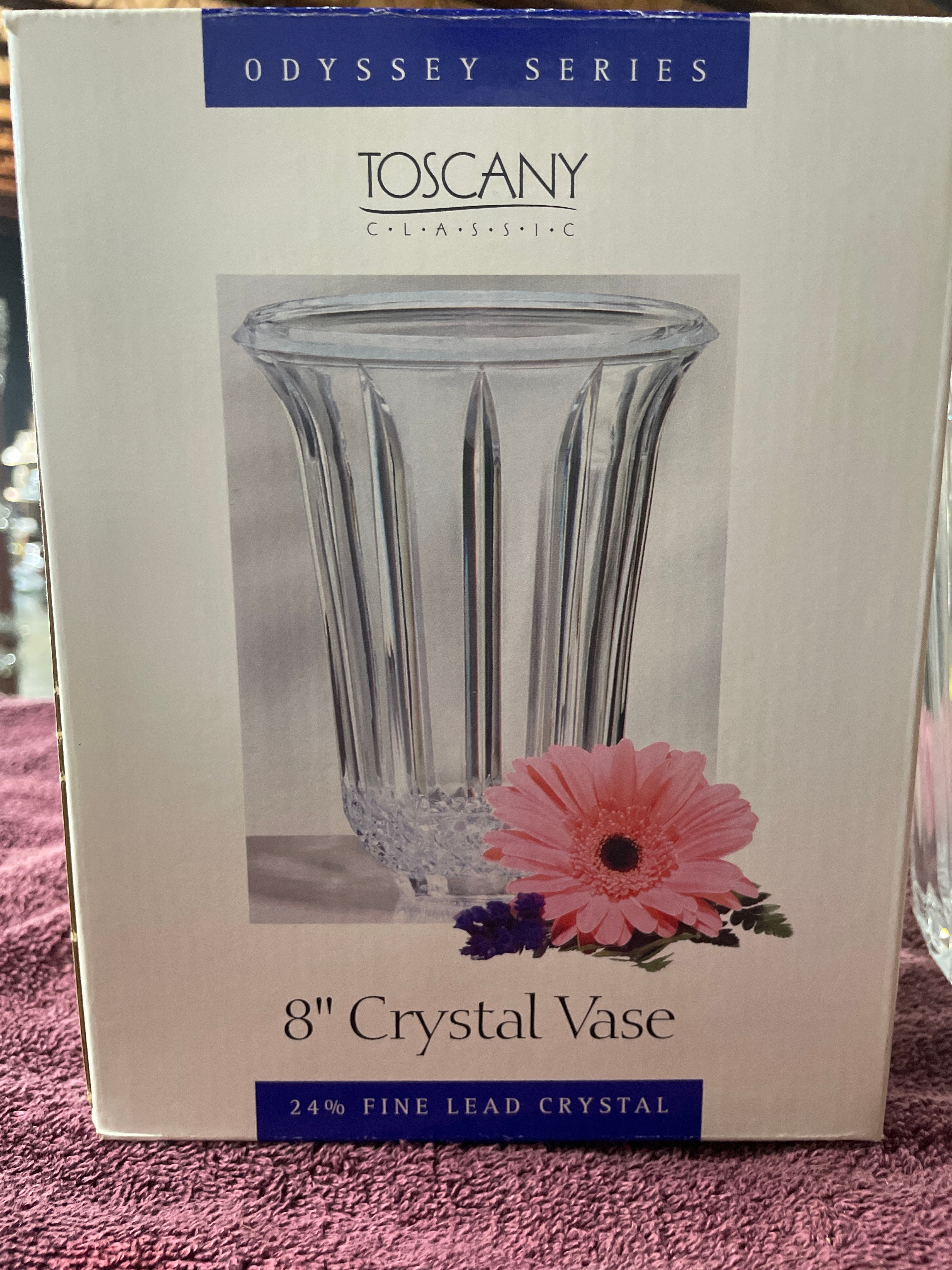 A Toscany ‘Odyssey Series Classic’ 24% Fine Lead Crystal vase, made in U.S.A. This piece, often associated with St. George crystal in the market, features a clear crystal body with a flared rim and vertical facets along its form. The base is adorned with a starburst design.
