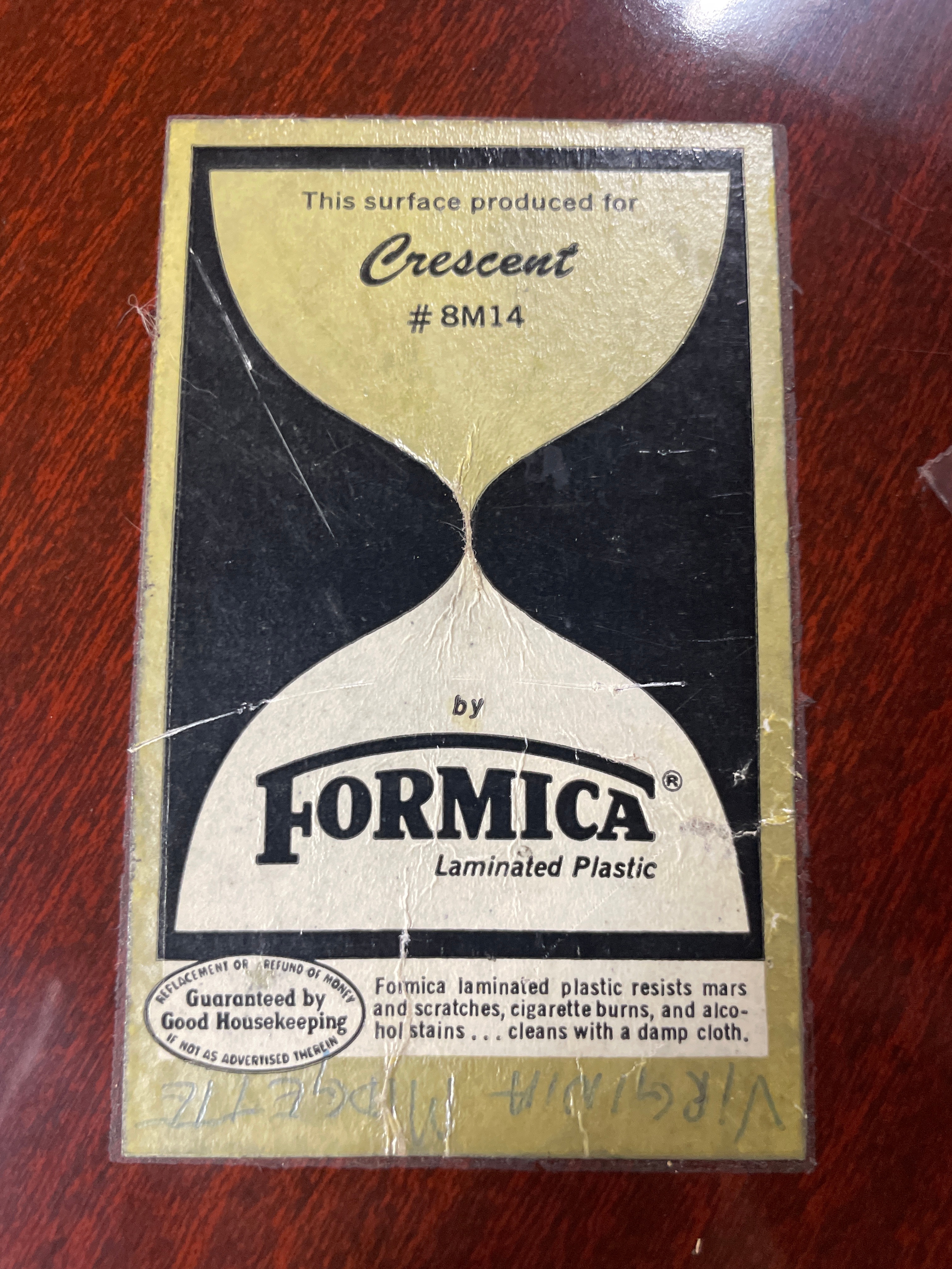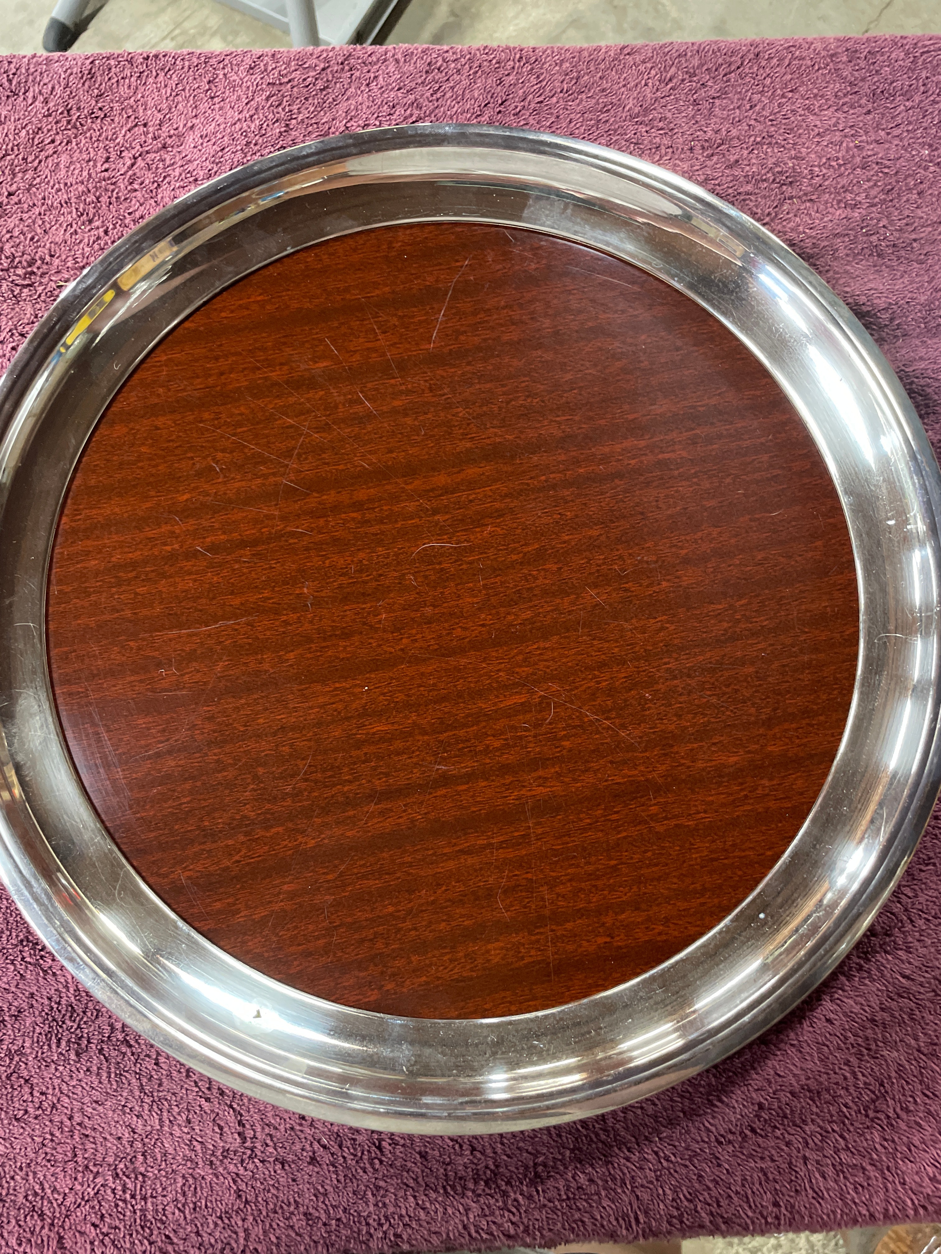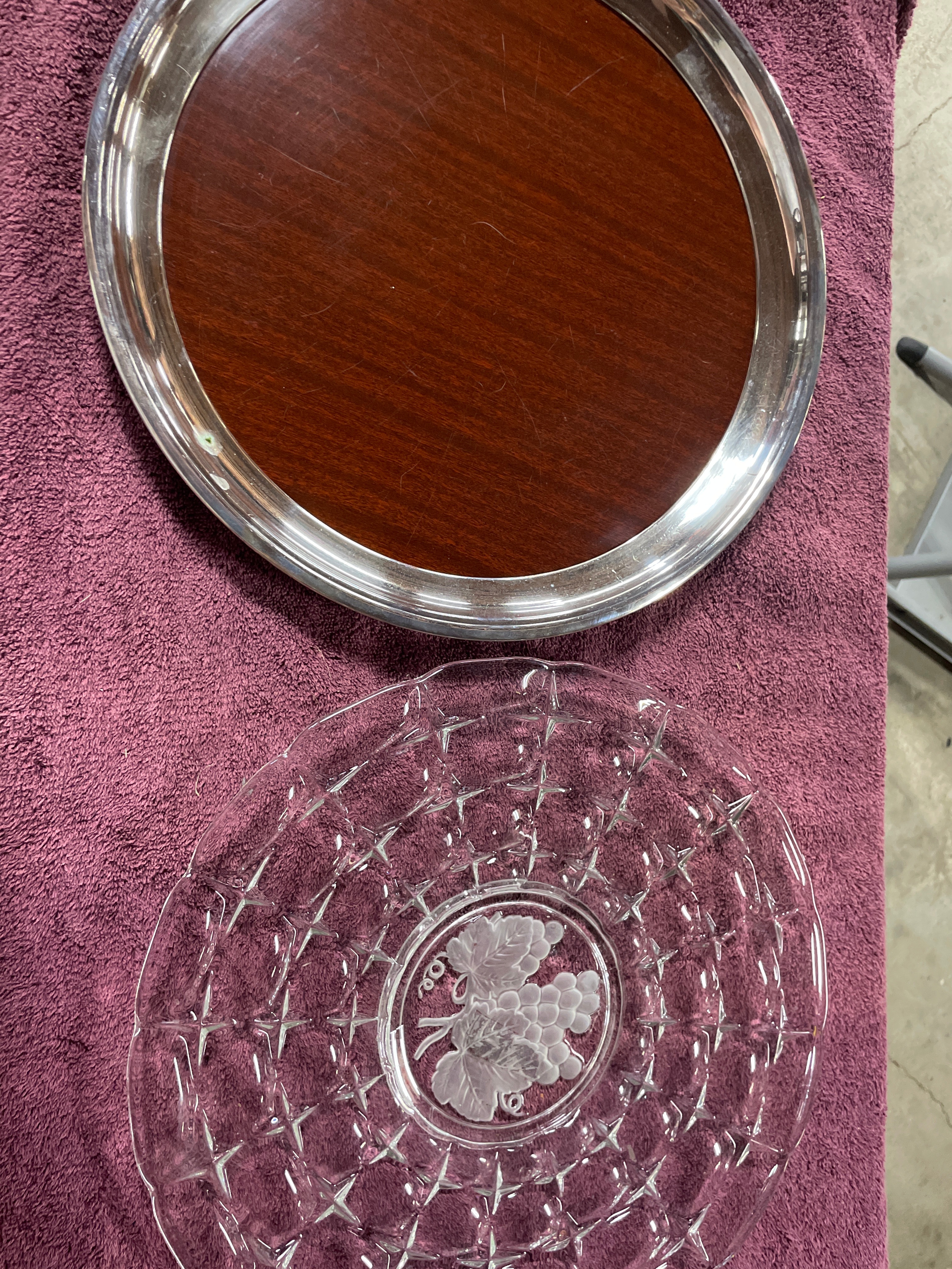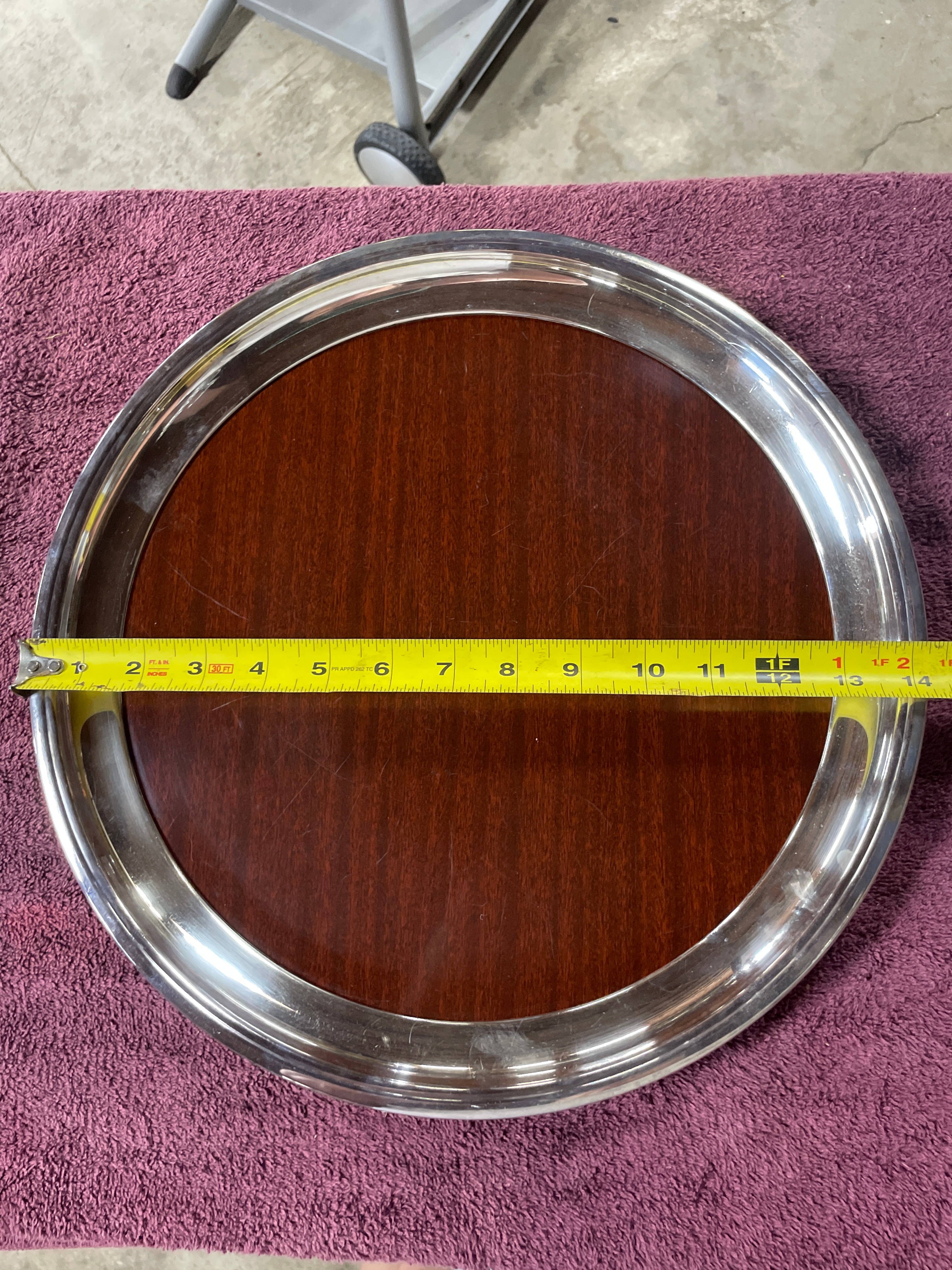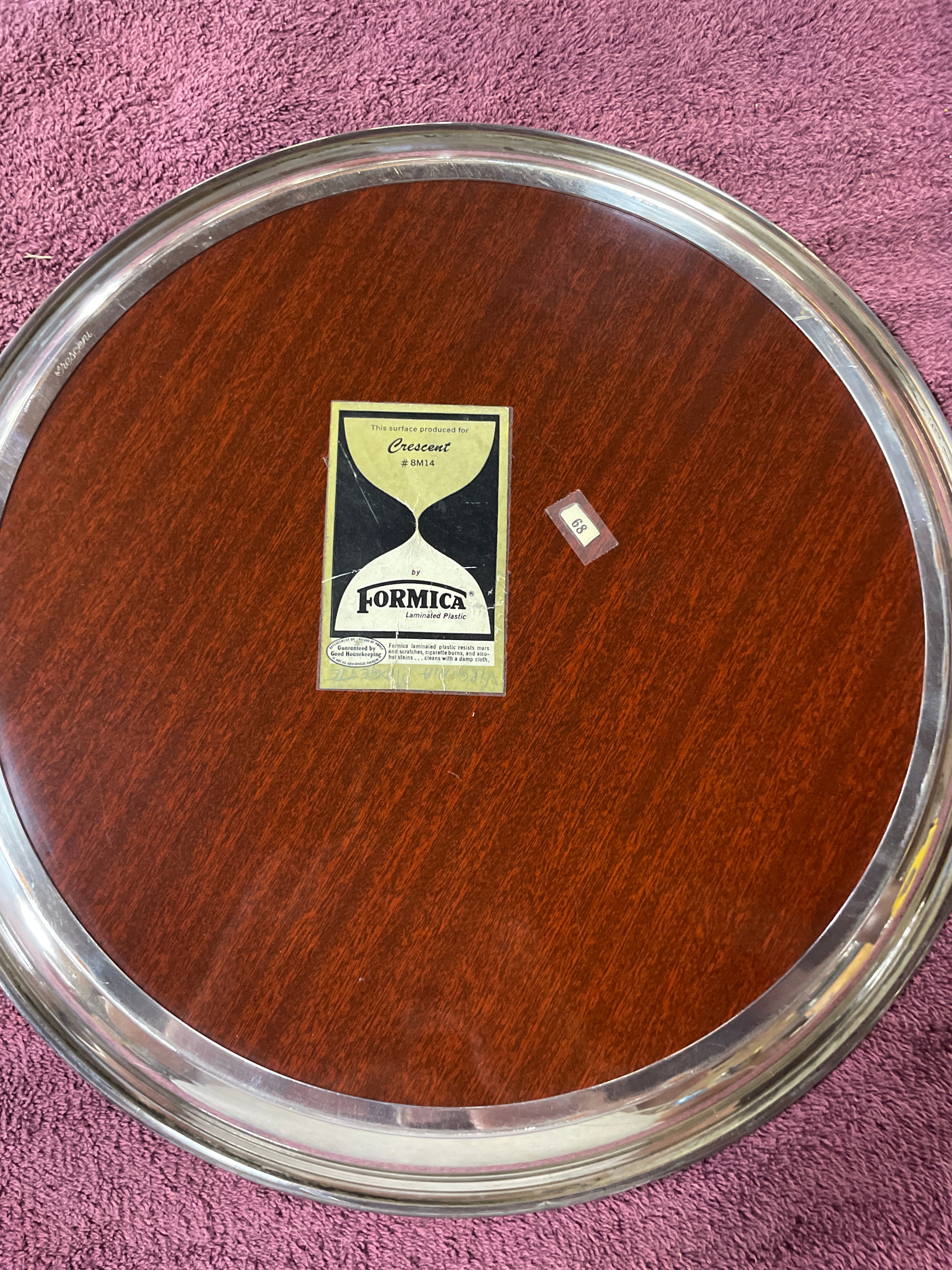 This lot comprises two circular serving items. The first is a vintage Crescent silver-plated metal-rimmed serving tray, featuring a reddish-brown woodgrain Formica laminate surface. A label on the underside identifies it as "This surface produced for Crescent #8M14 by FORMICA Laminated Plastic, " further stating it is "Guaranteed by Good Housekeeping" to resist mars, scratches, burns, and stains.