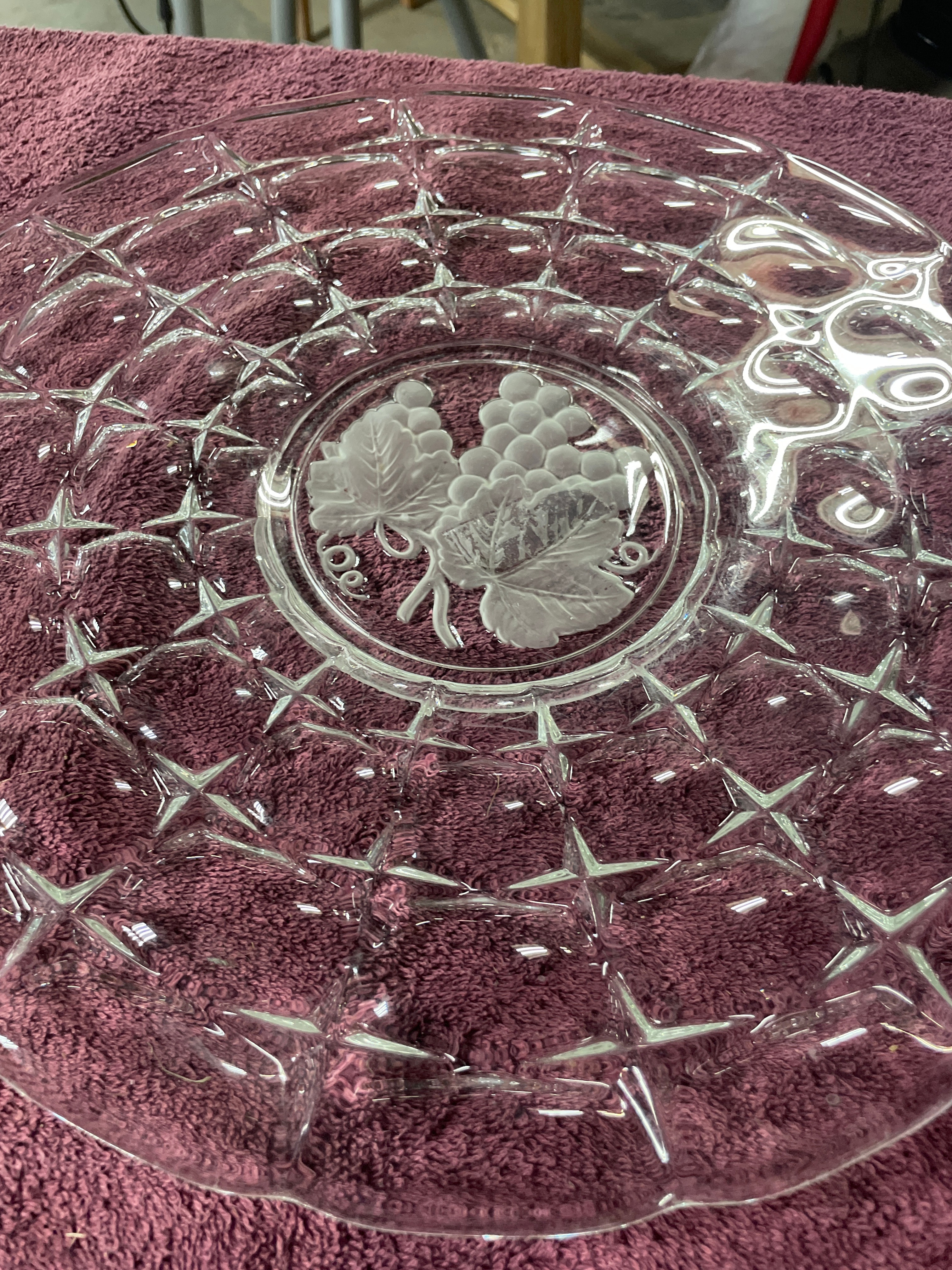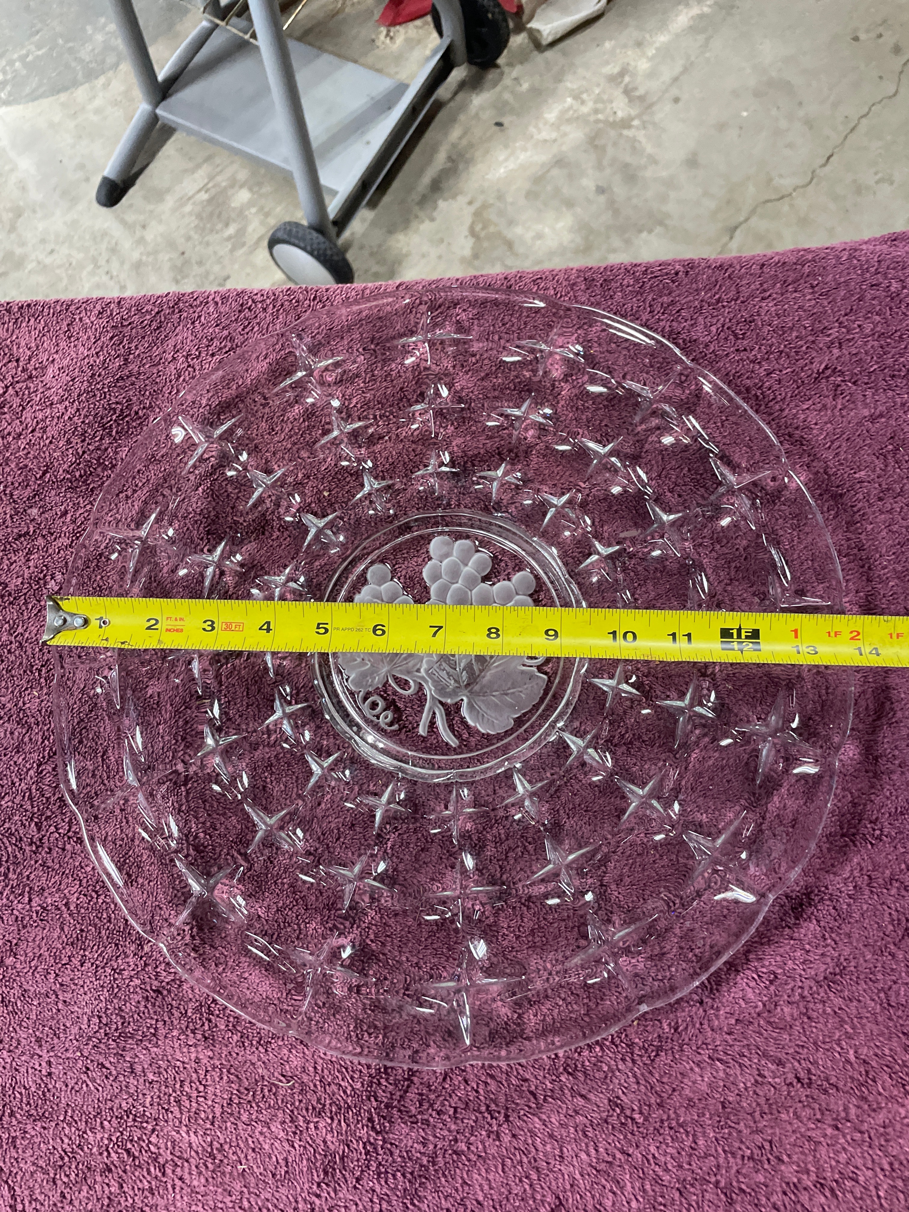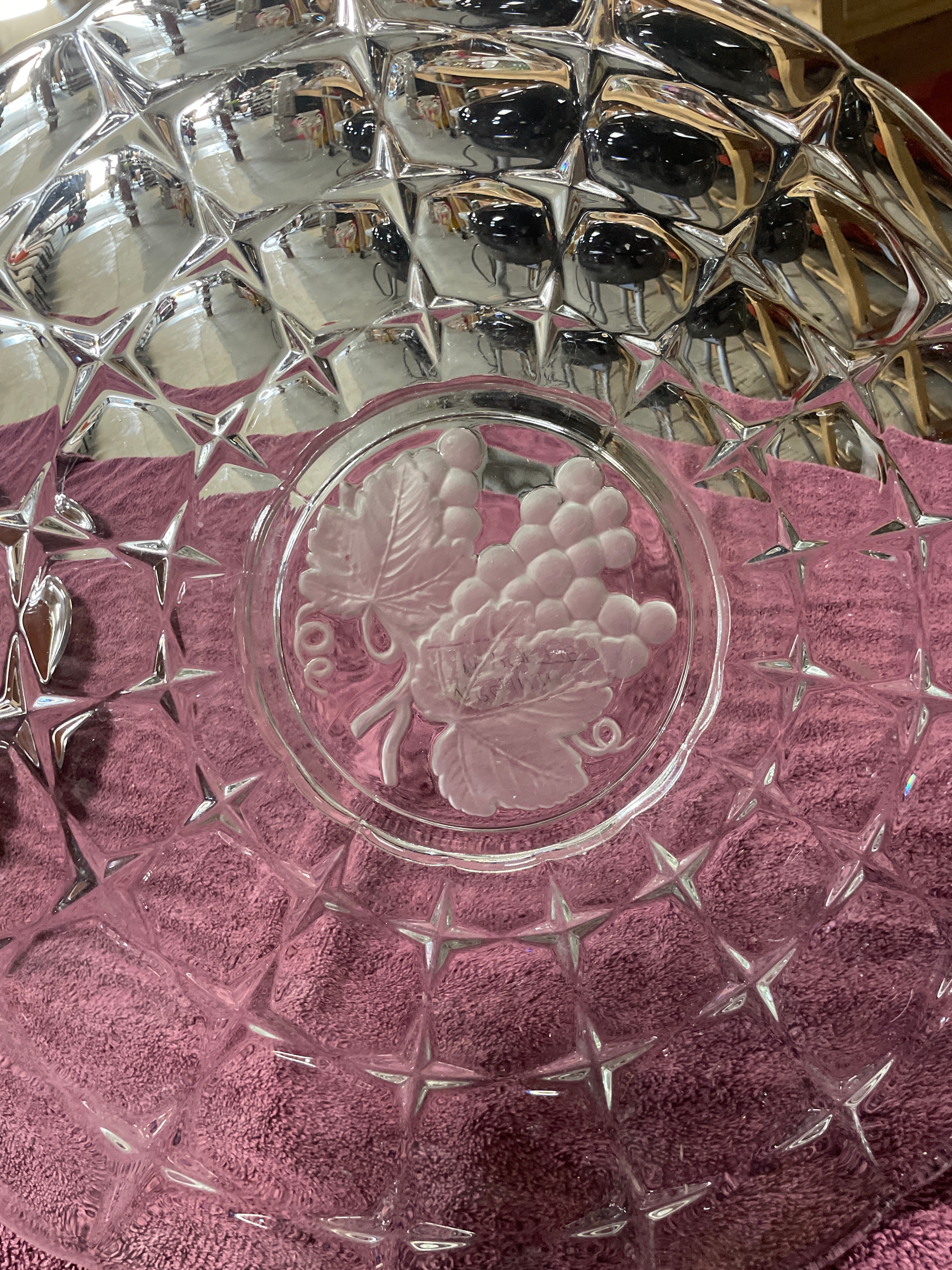 The second item is a clear pressed glass platter, featuring a central frosted etched design of a grape cluster and leaves, surrounded by a raised geometric starburst or diamond pattern.