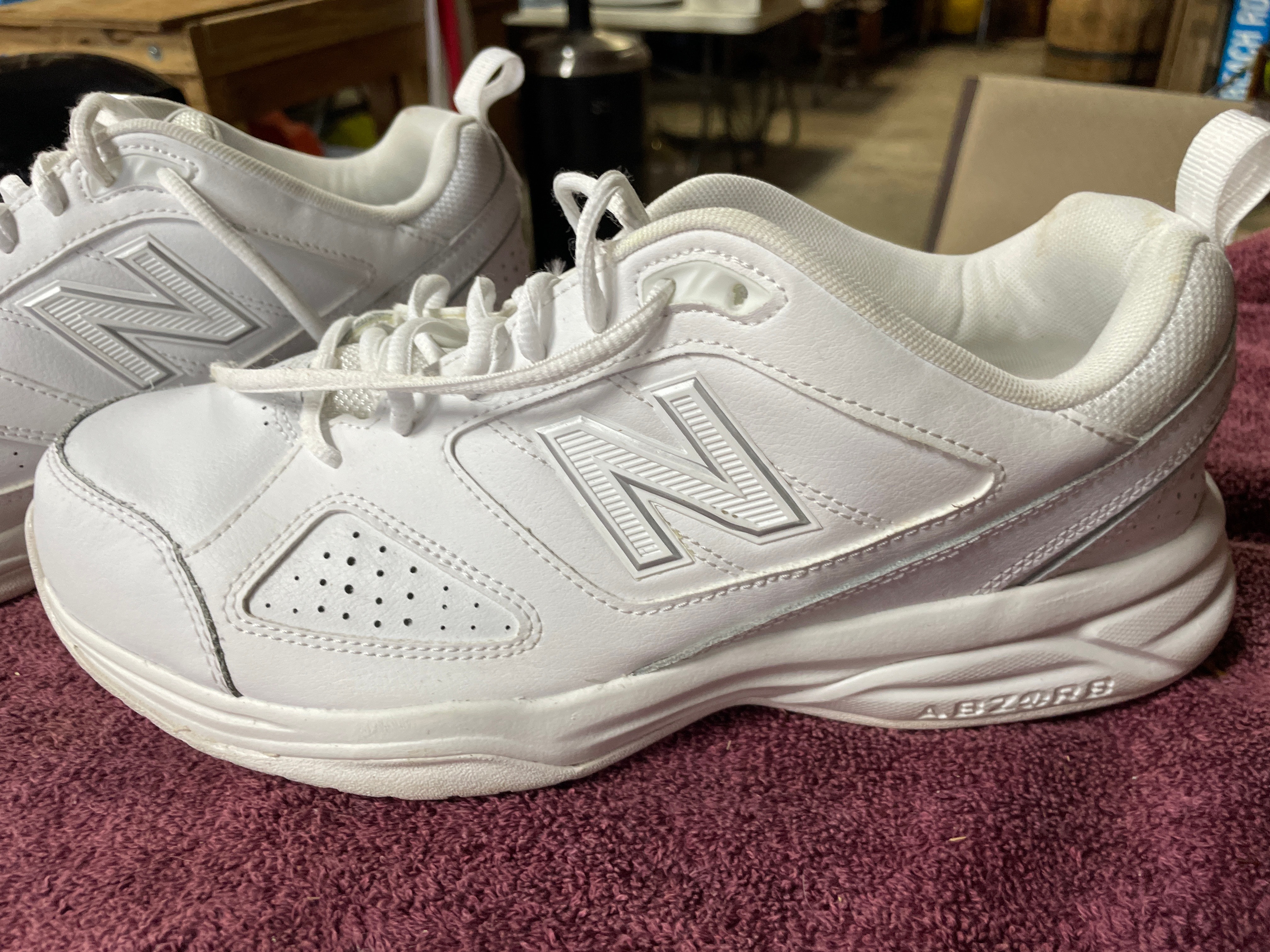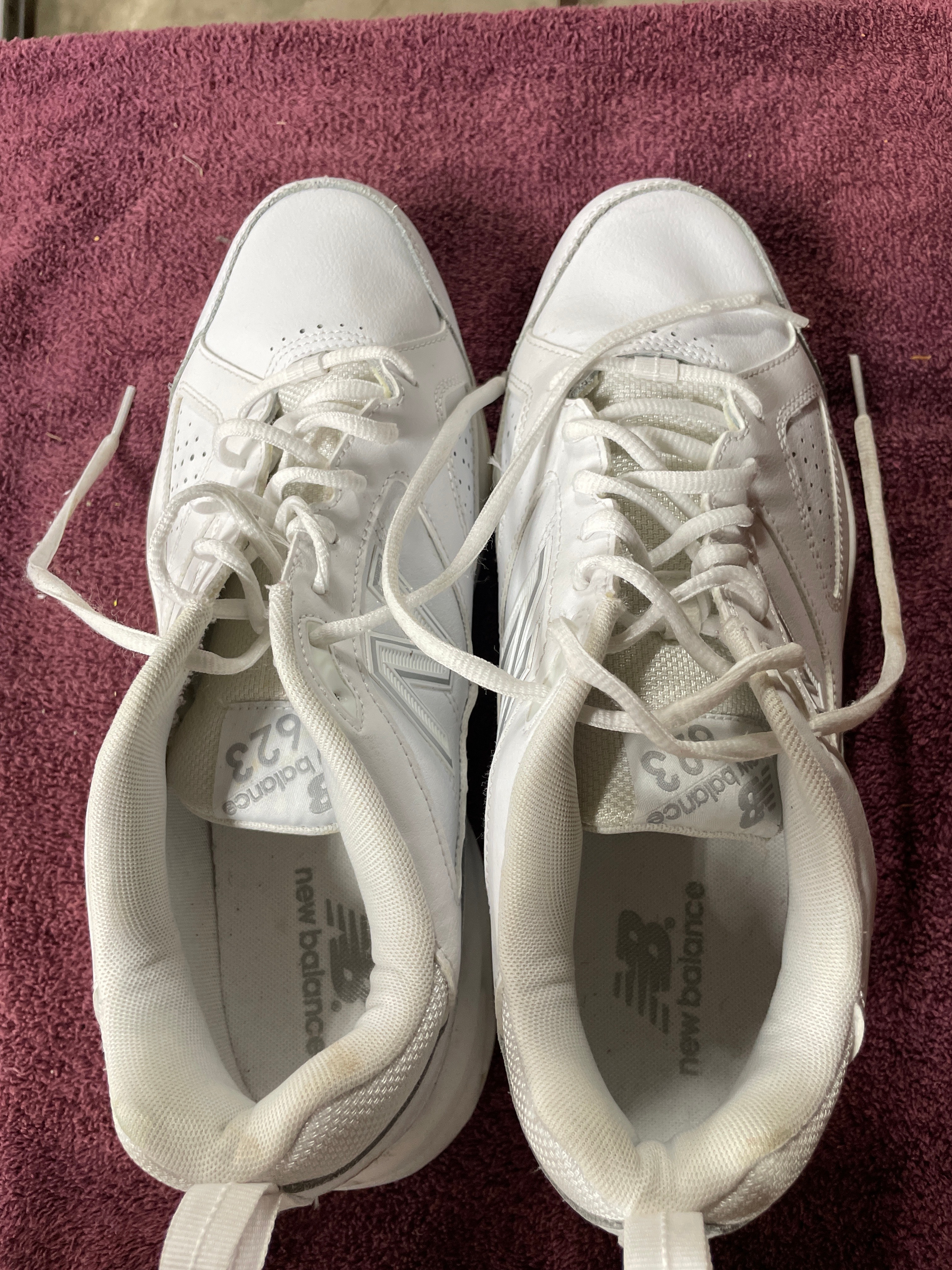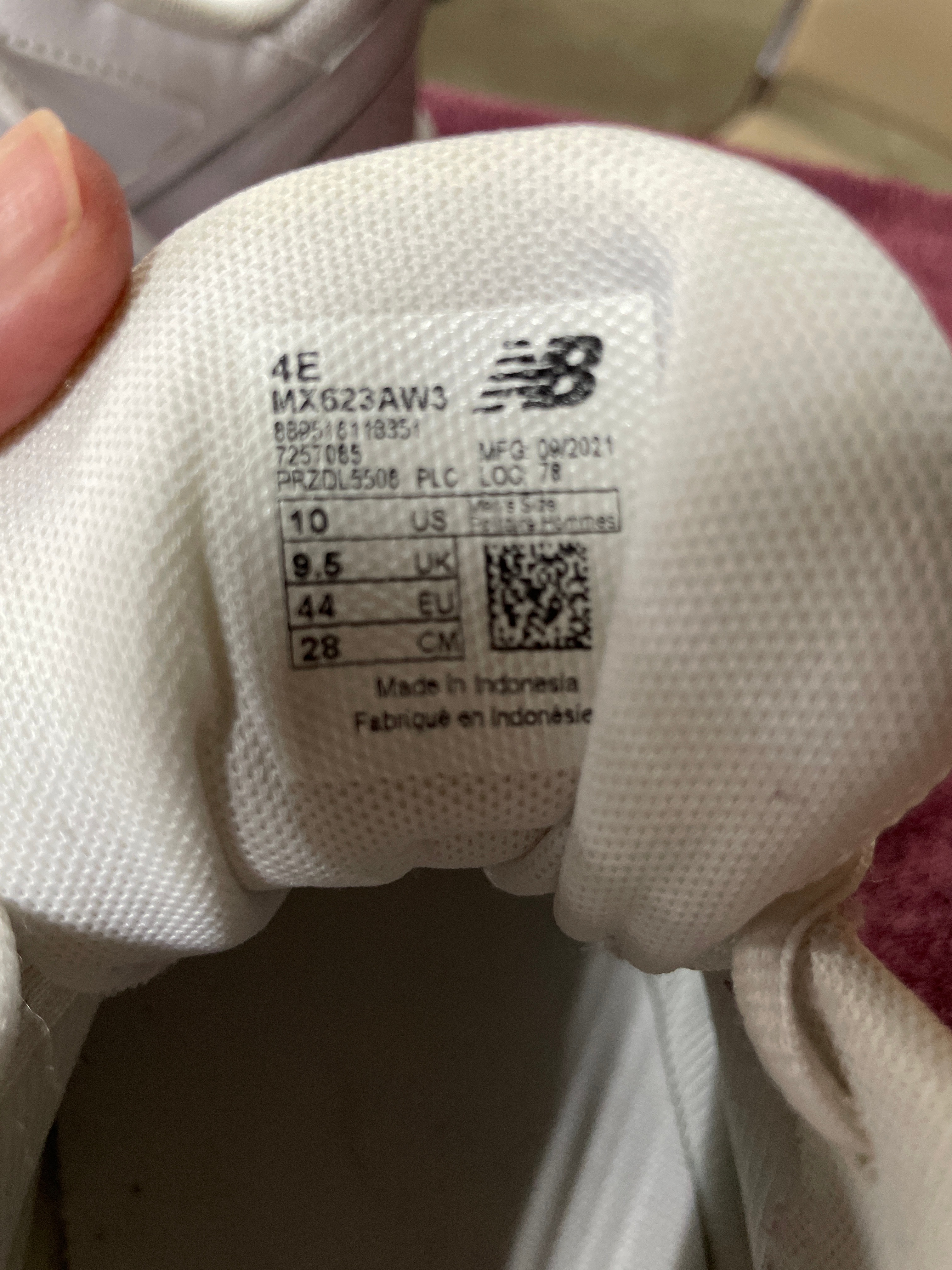 A pair of New Balance 623 (MX623AW3) men’s athletic sneakers. Featuring a white synthetic leather upper with perforated accents, white laces, and a white rubber sole. Prominent ‘New Balance’ logos are visible on the sides, tongue, insoles, and soles. The midsole incorporates ‘ABZORB’ technology. An internal label indicates a manufacturing date of September 2021, a US size 10 (UK 9.5, EU 44, CM 28), and states ‘Made in Indonesia’ (Fabrique en Indonésie).