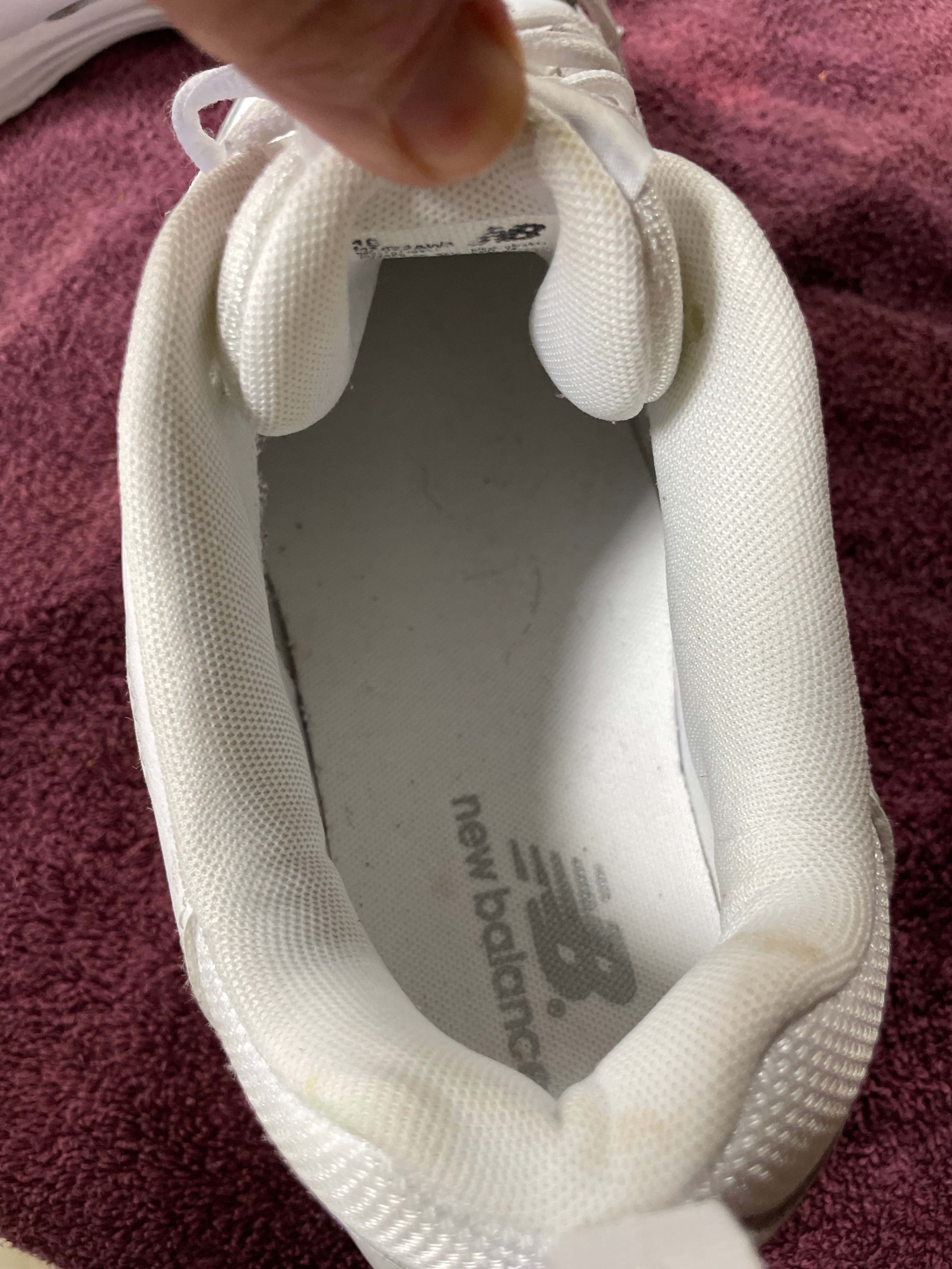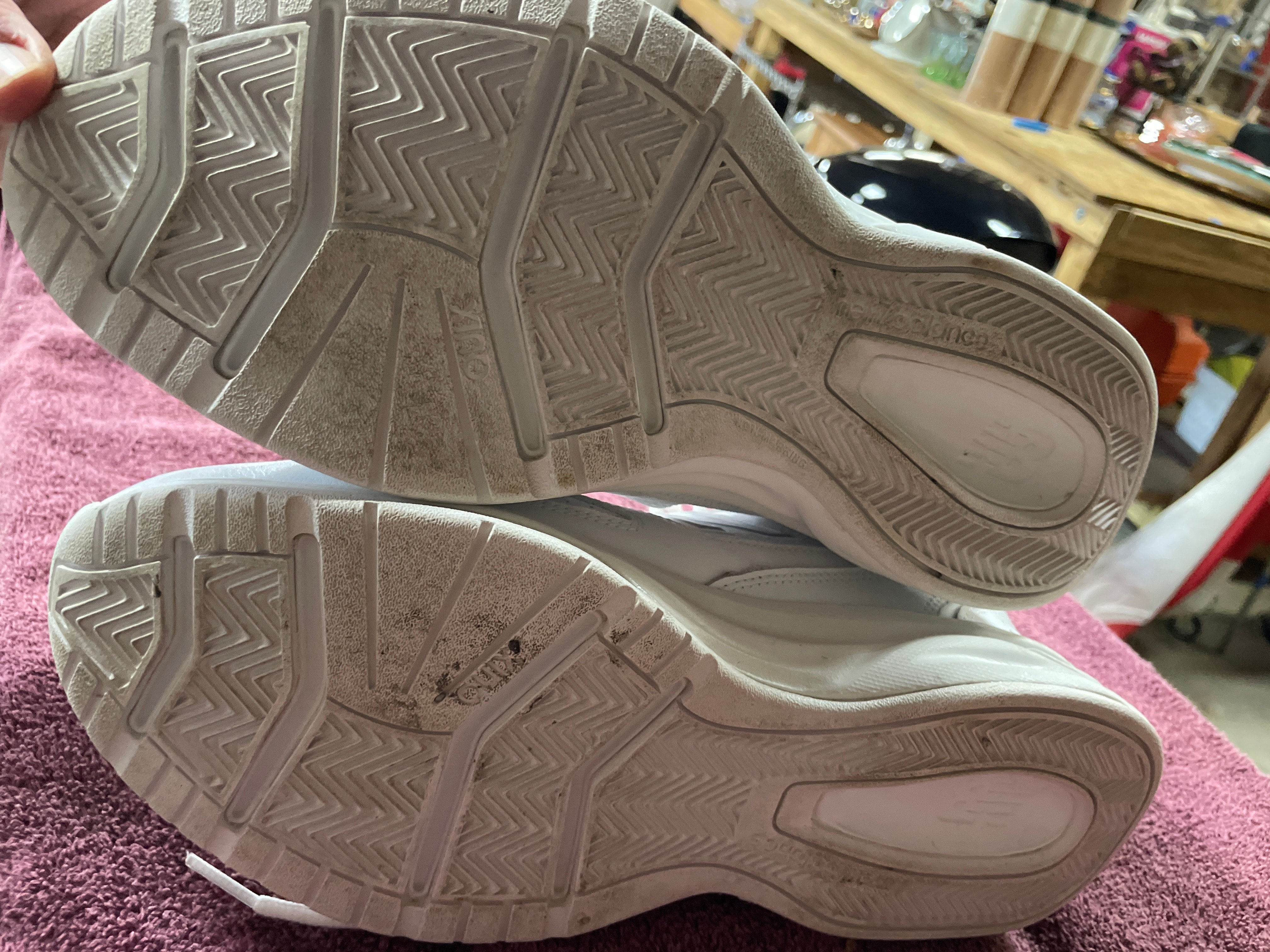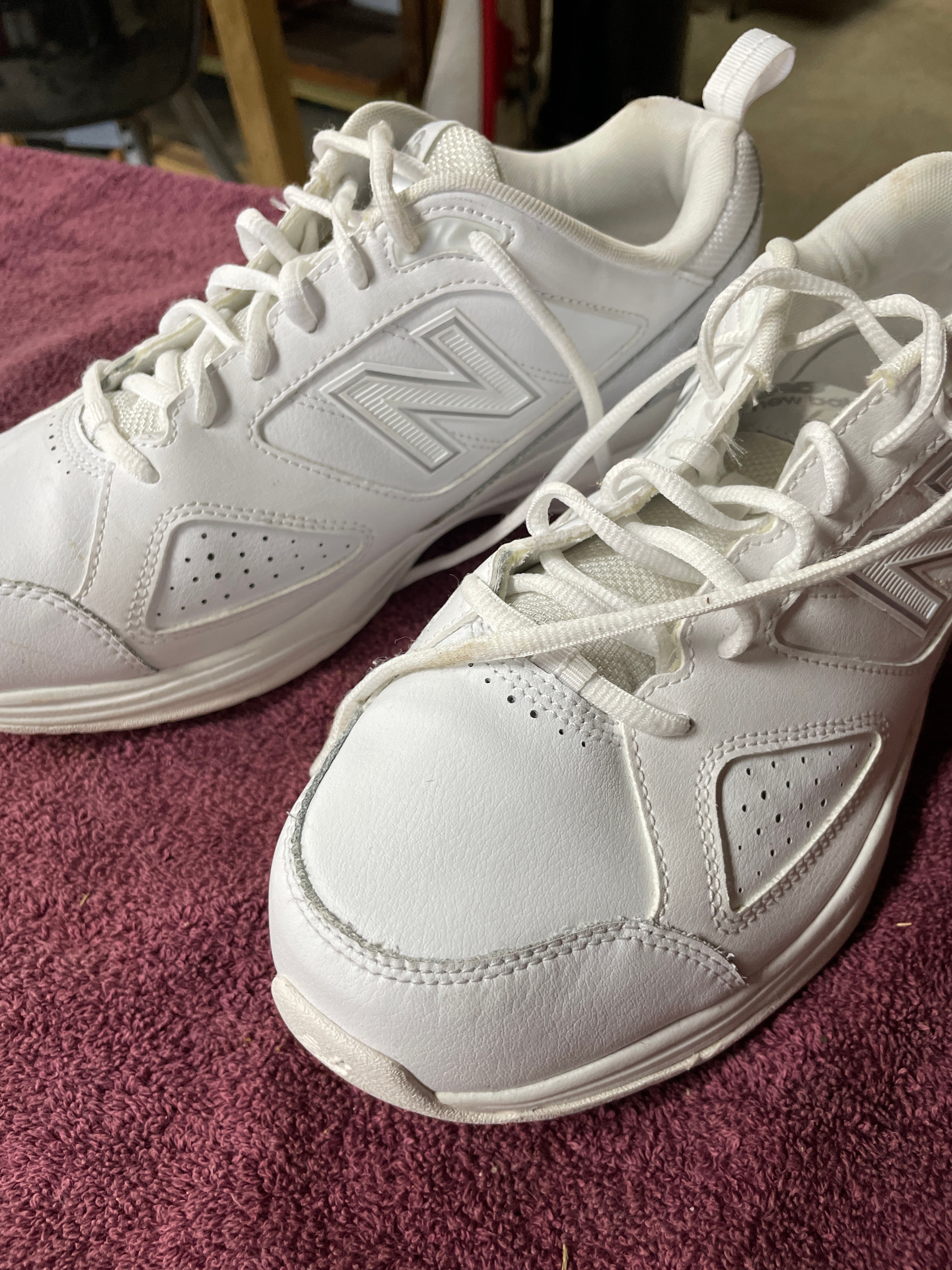 A pair of New Balance 623 (MX623AW3) men’s athletic sneakers. Featuring a white synthetic leather upper with perforated accents, white laces, and a white rubber sole. Prominent ‘New Balance’ logos are visible on the sides, tongue, insoles, and soles. The midsole incorporates ‘ABZORB’ technology. An internal label indicates a manufacturing date of September 2021, a US size 10 (UK 9.5, EU 44, CM 28), and states ‘Made in Indonesia’ (Fabrique en Indonésie).