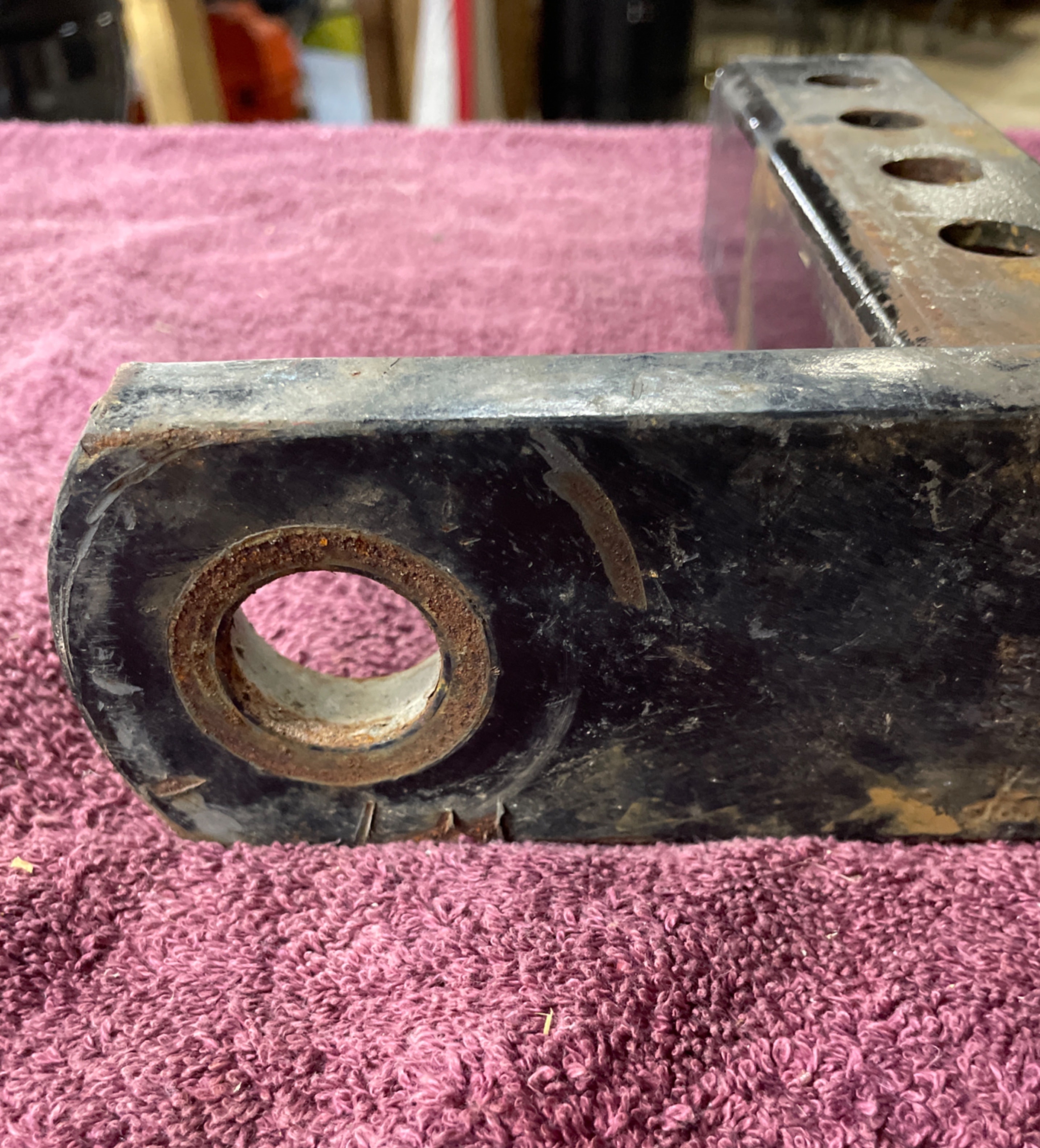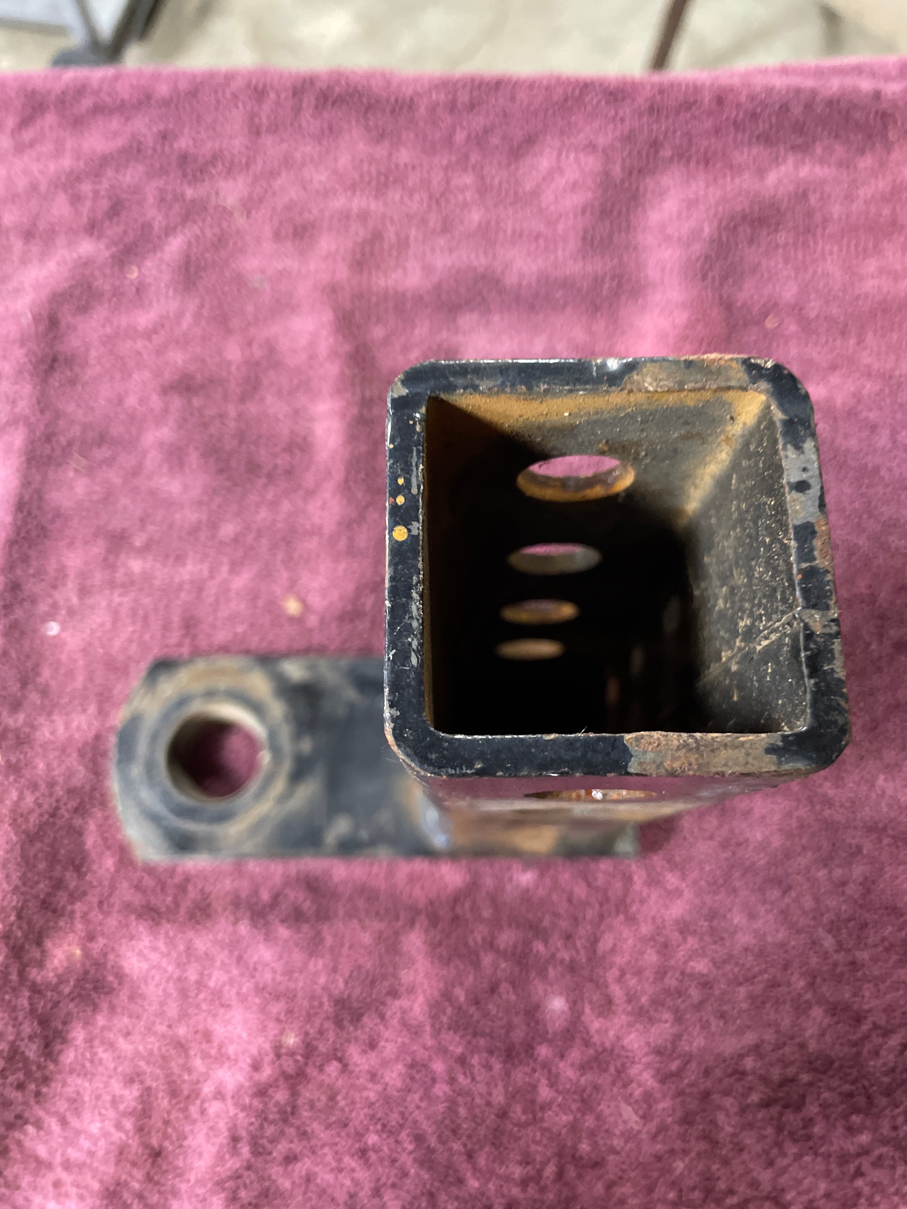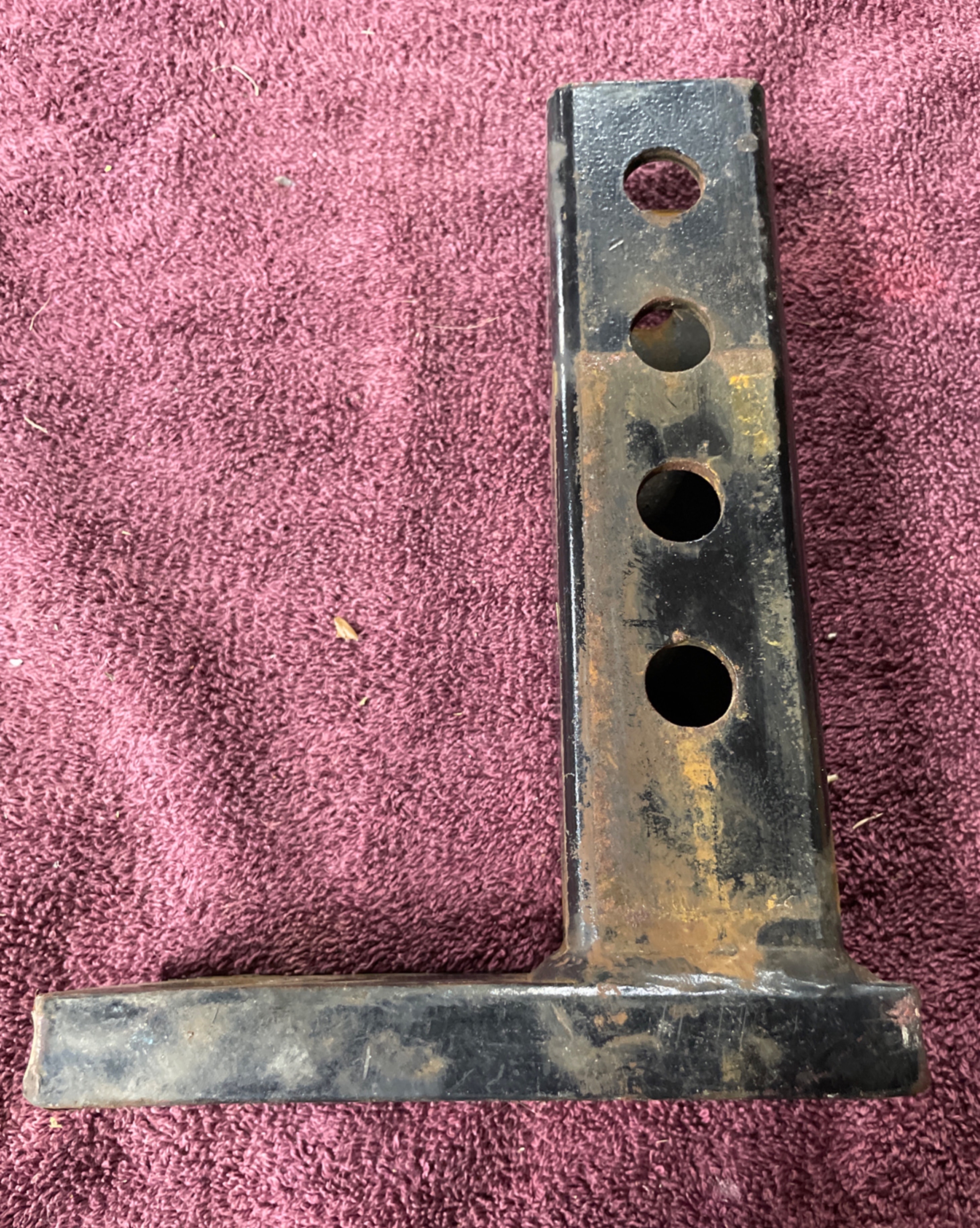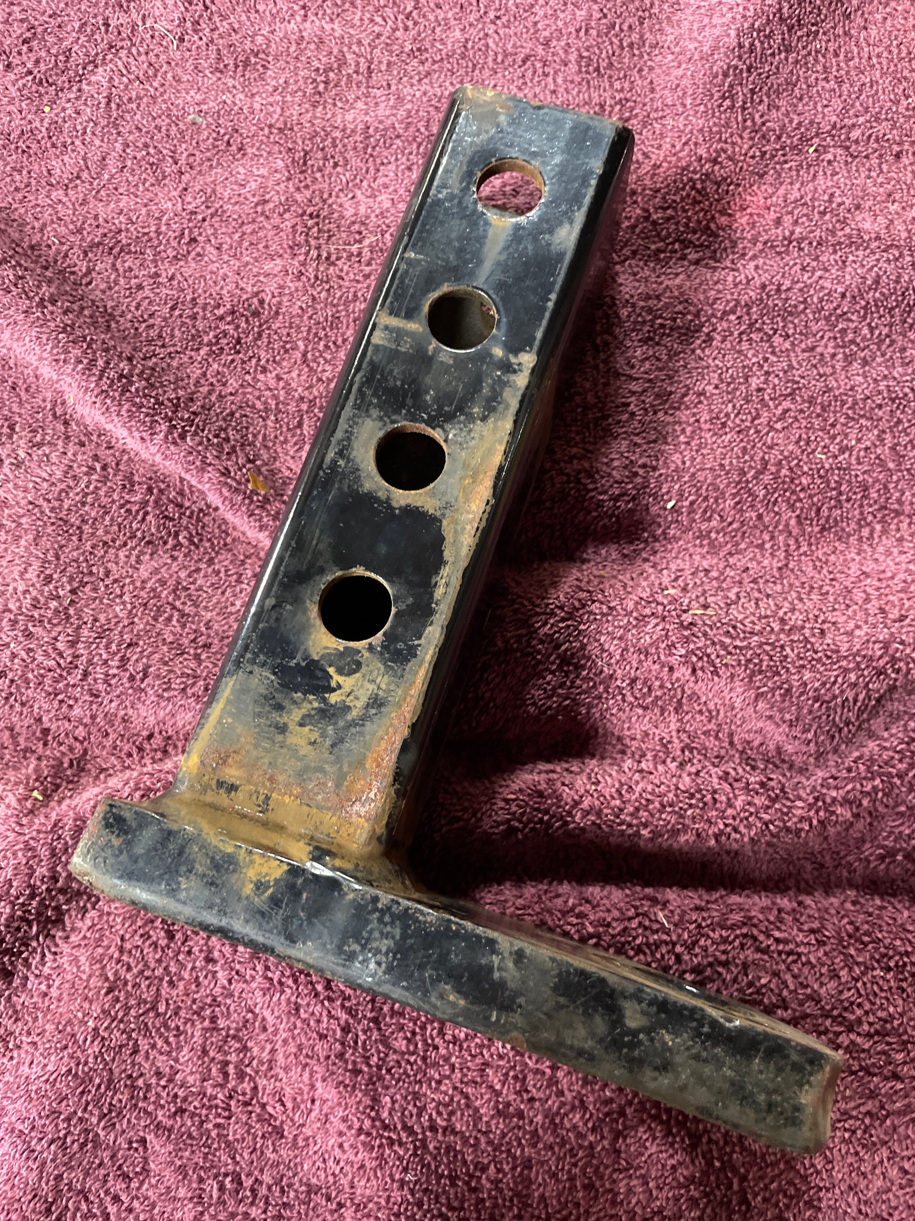 A utilitarian L-shaped metal component, identified through web intelligence as a Trailer Hitch Receiver Tube. Constructed from black-painted steel with visible weld marks, it features a square-section tubular shaft with four circular adjustment holes along one side, and a perpendicular flat arm terminating in a single large circular hole. No discernible manufacturer markings or text are visible.
