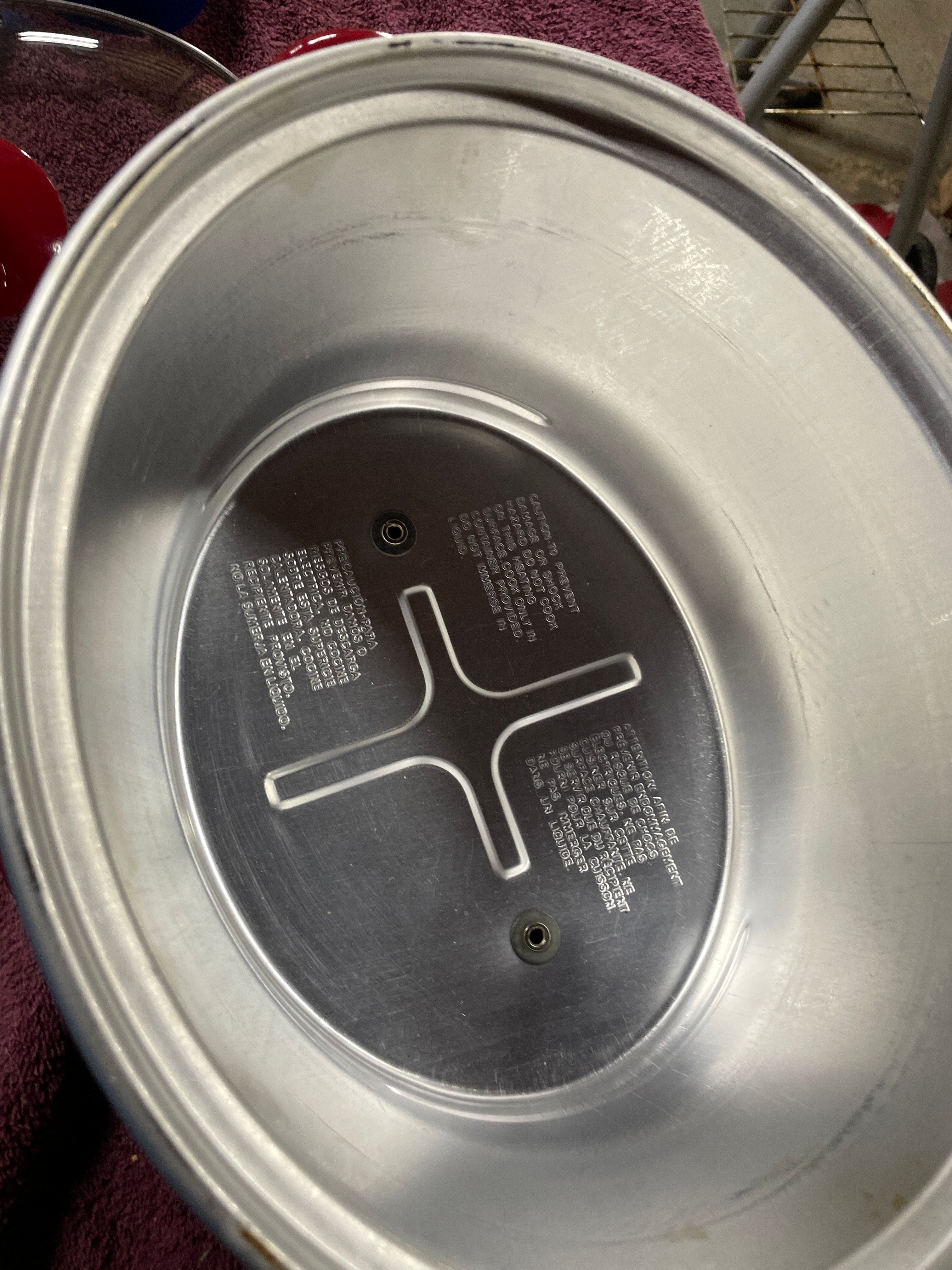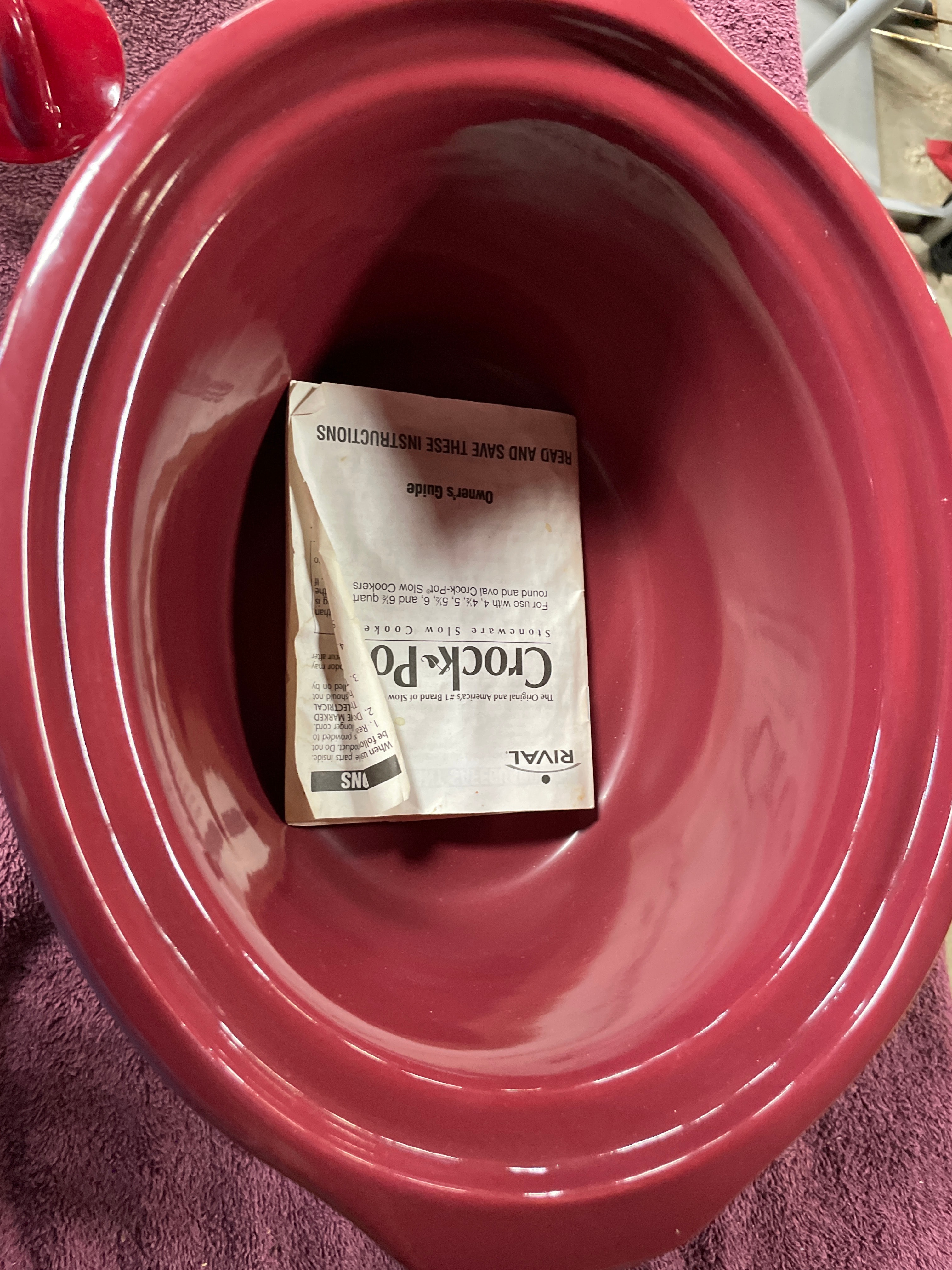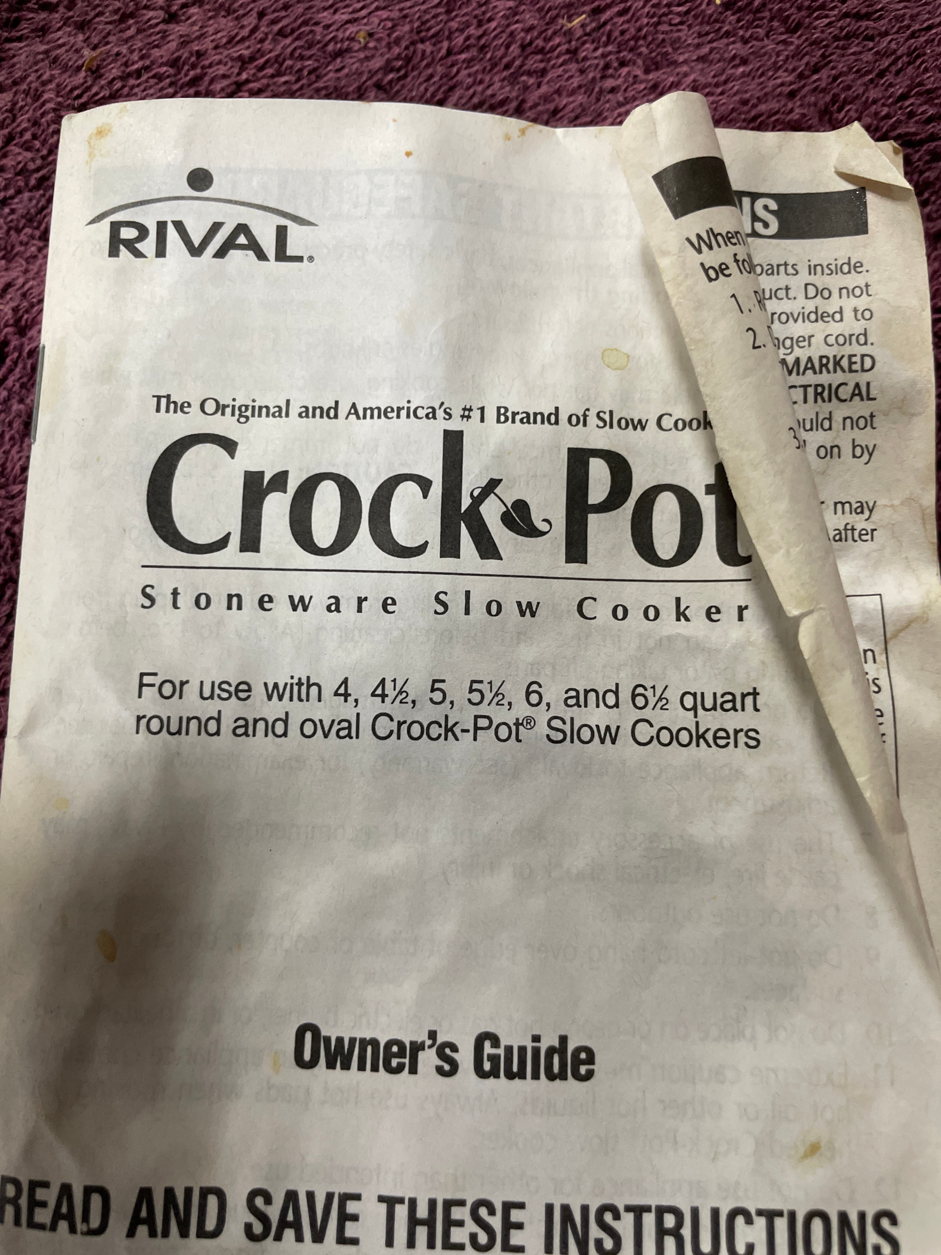 One red RIVAL Crock-Pot stoneware slow cooker with a glass lid, featuring “Off, ” “Low, ” “High, ” and “Warm” settings, identified as a 4-quart oval model SCV401-TR, and includes its Owner’s Guide.