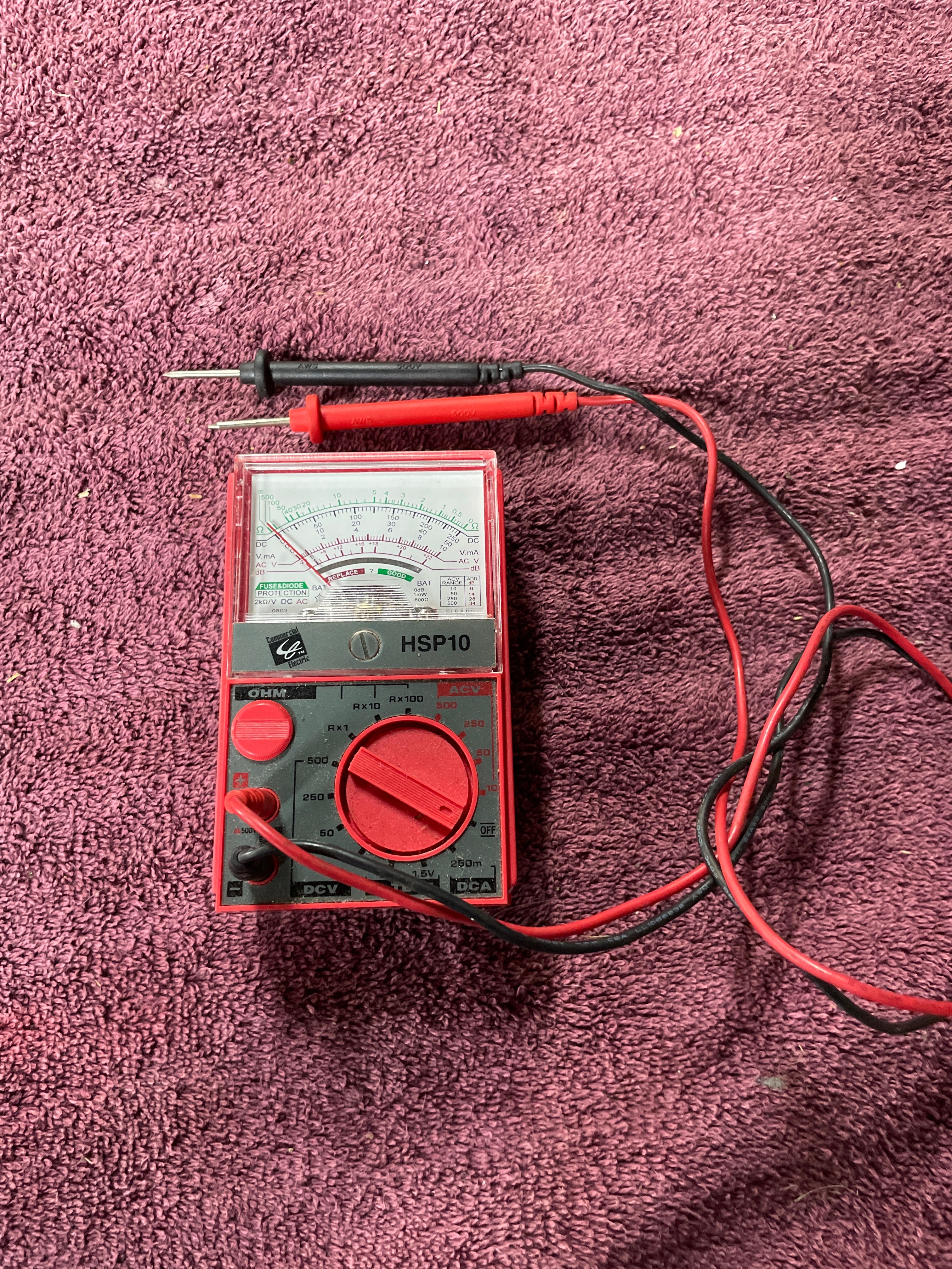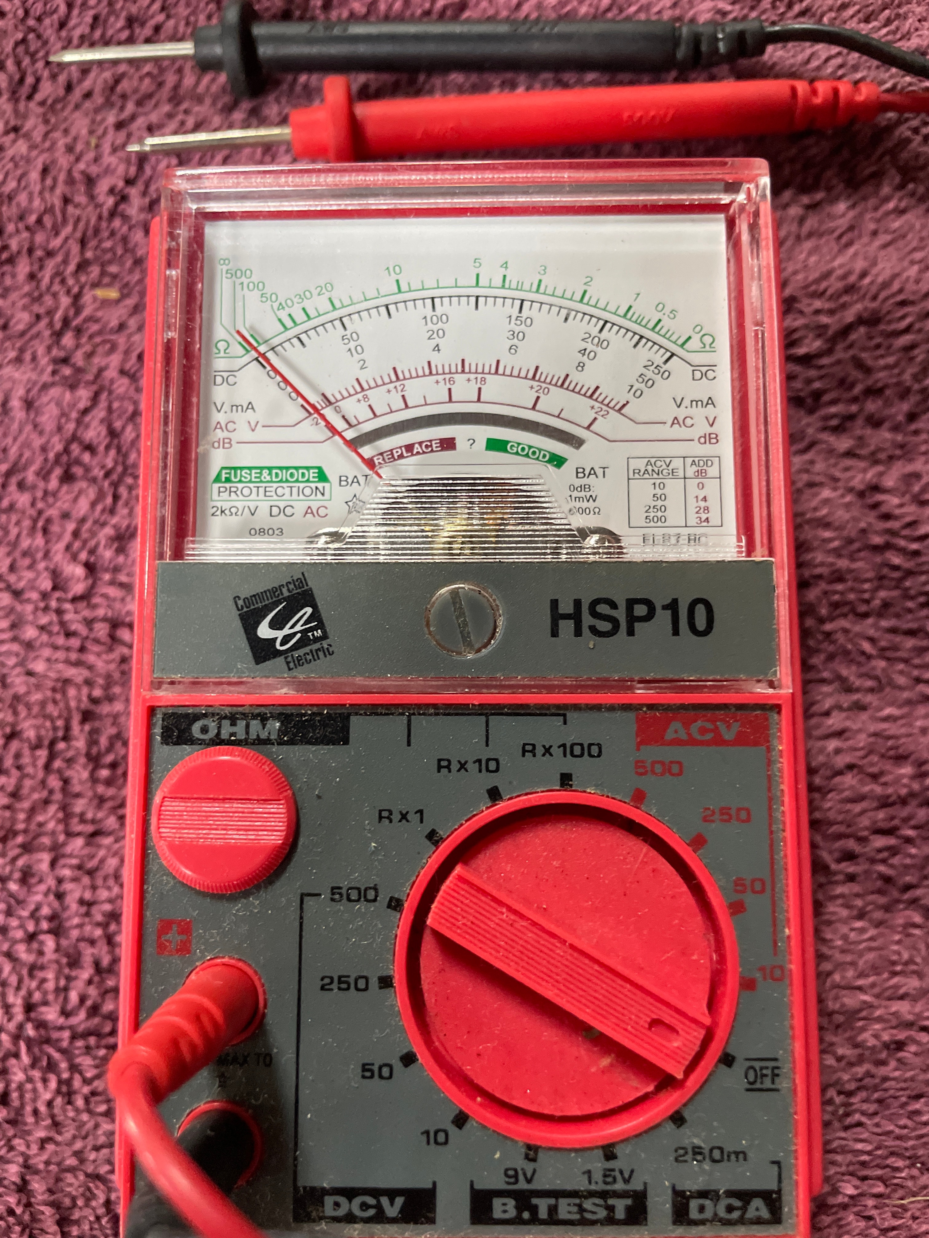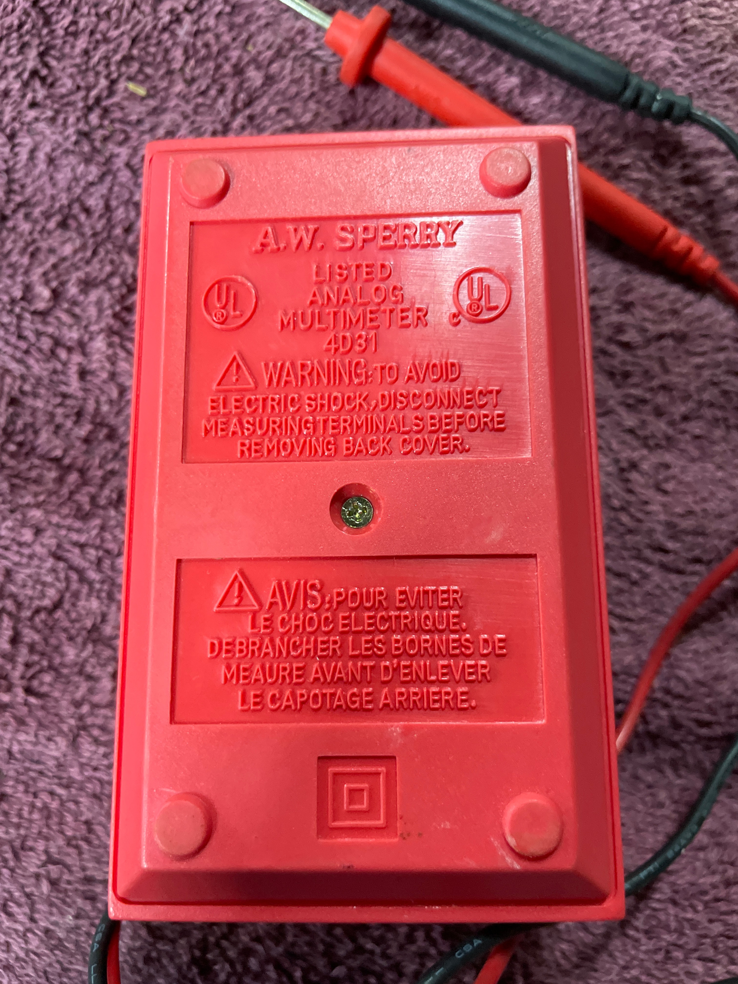 A red and grey/black Commercial Electric™ HSP10 analog multimeter with attached red and black test probes, marked on the back as A.W. SPERRY UL LISTED ANALOG MULTIMETER 4D31.