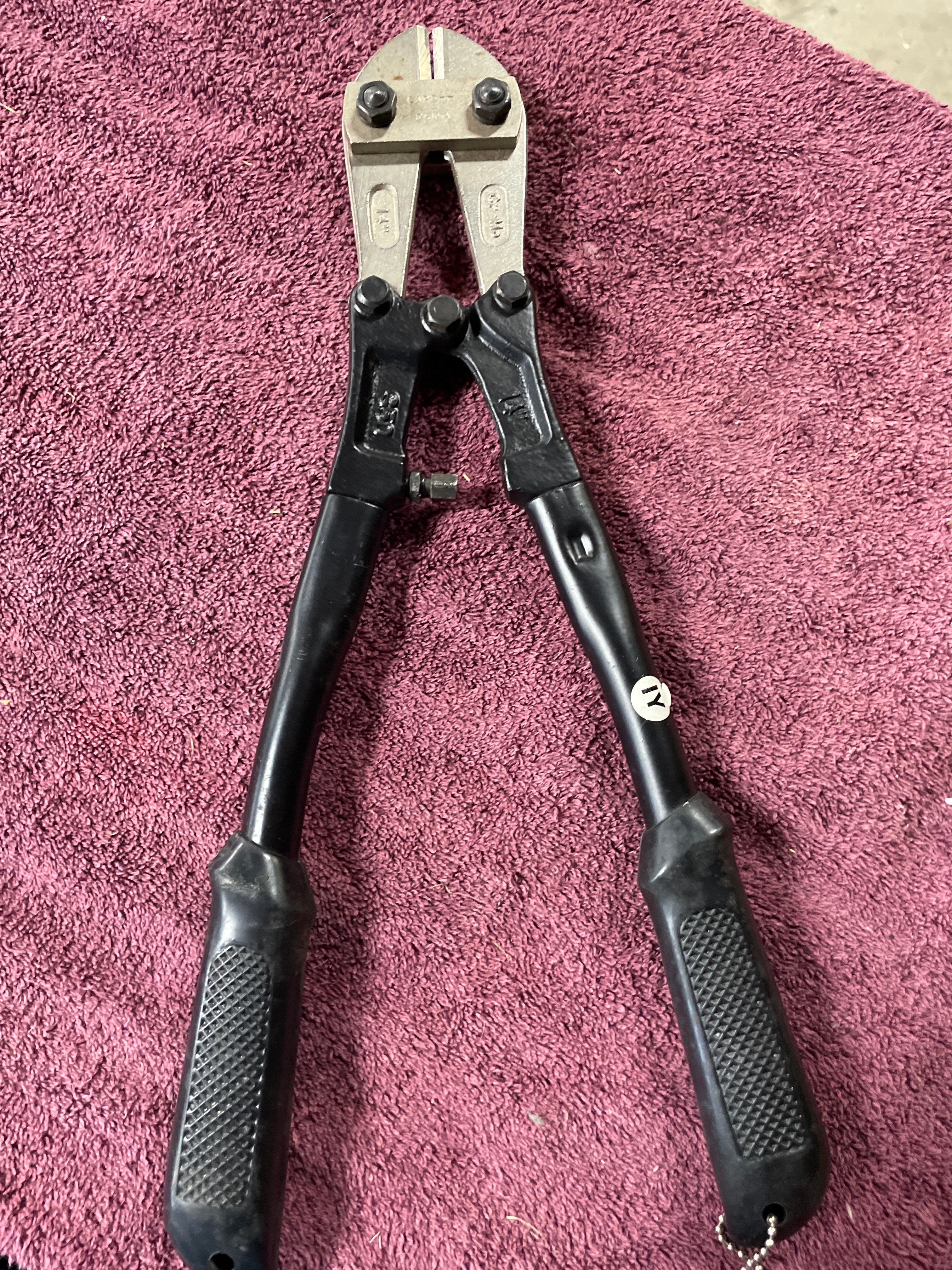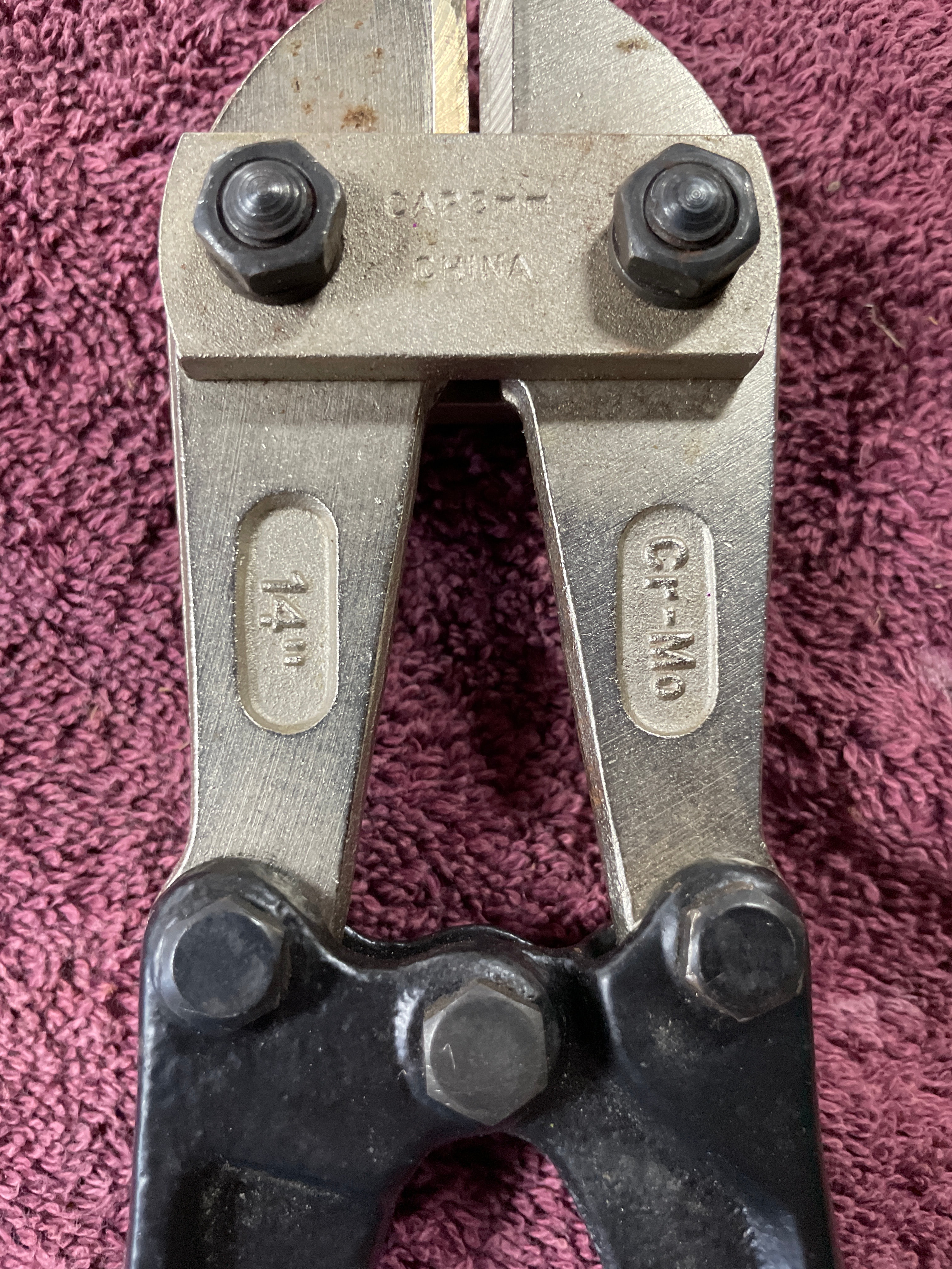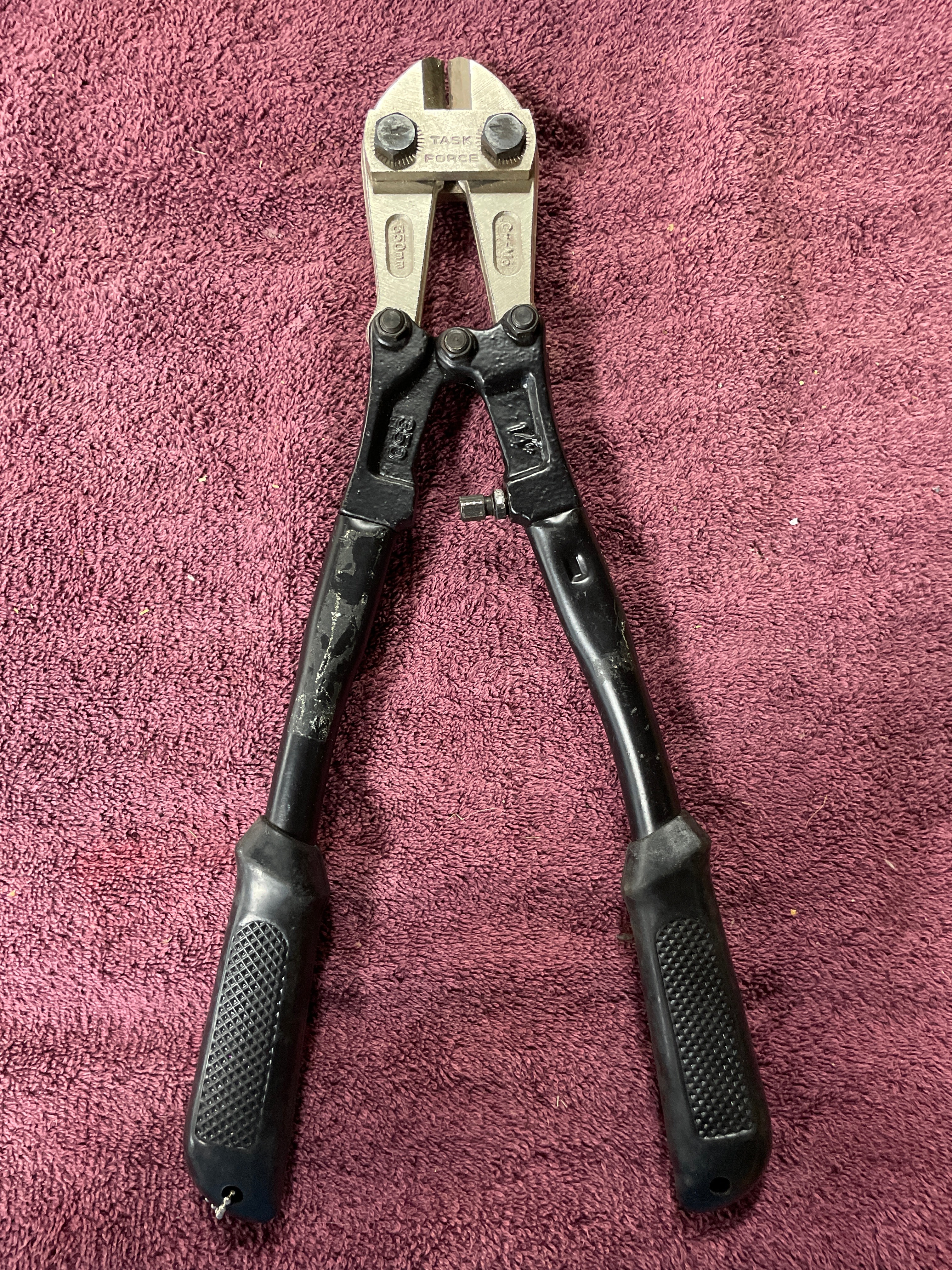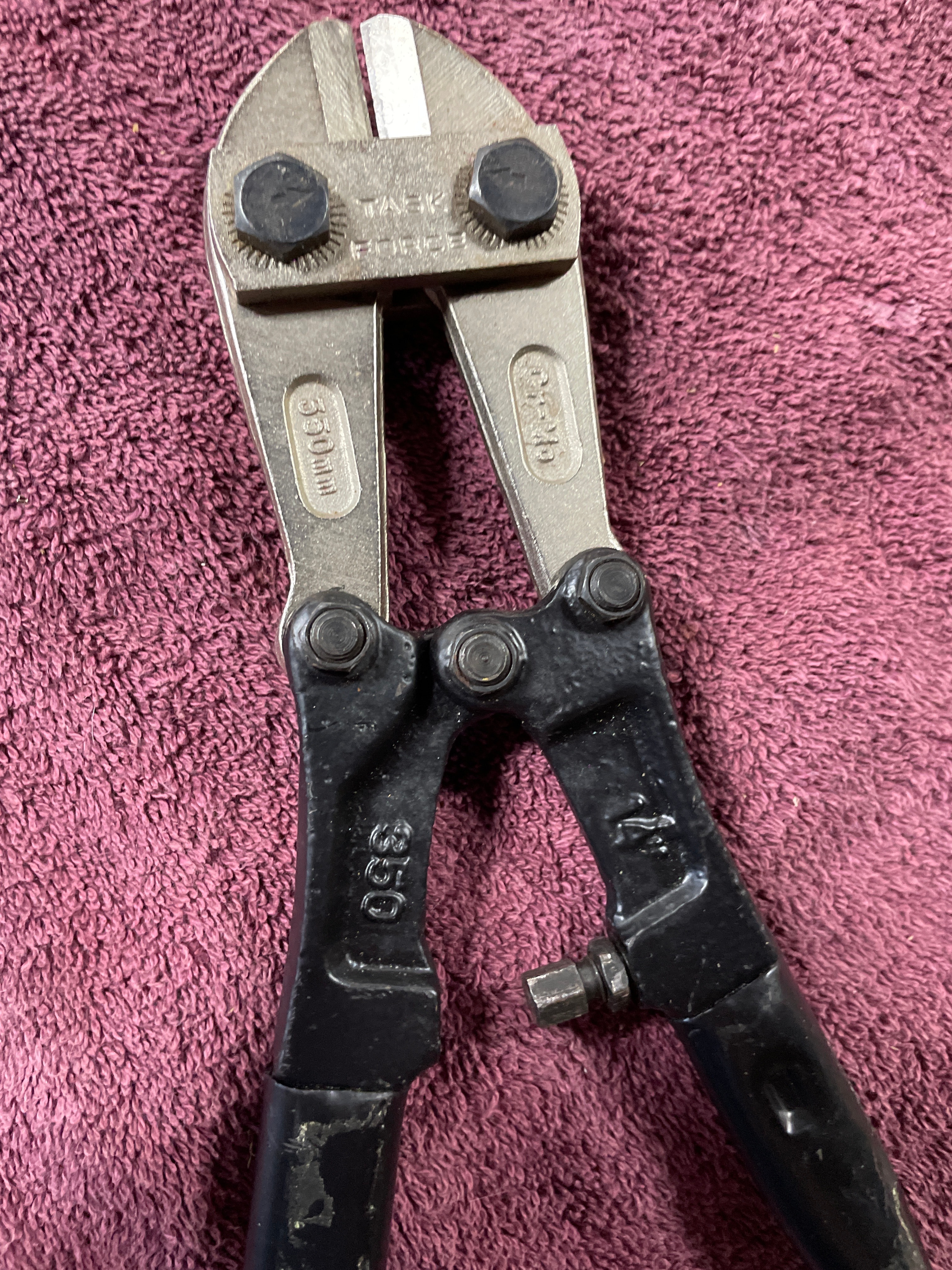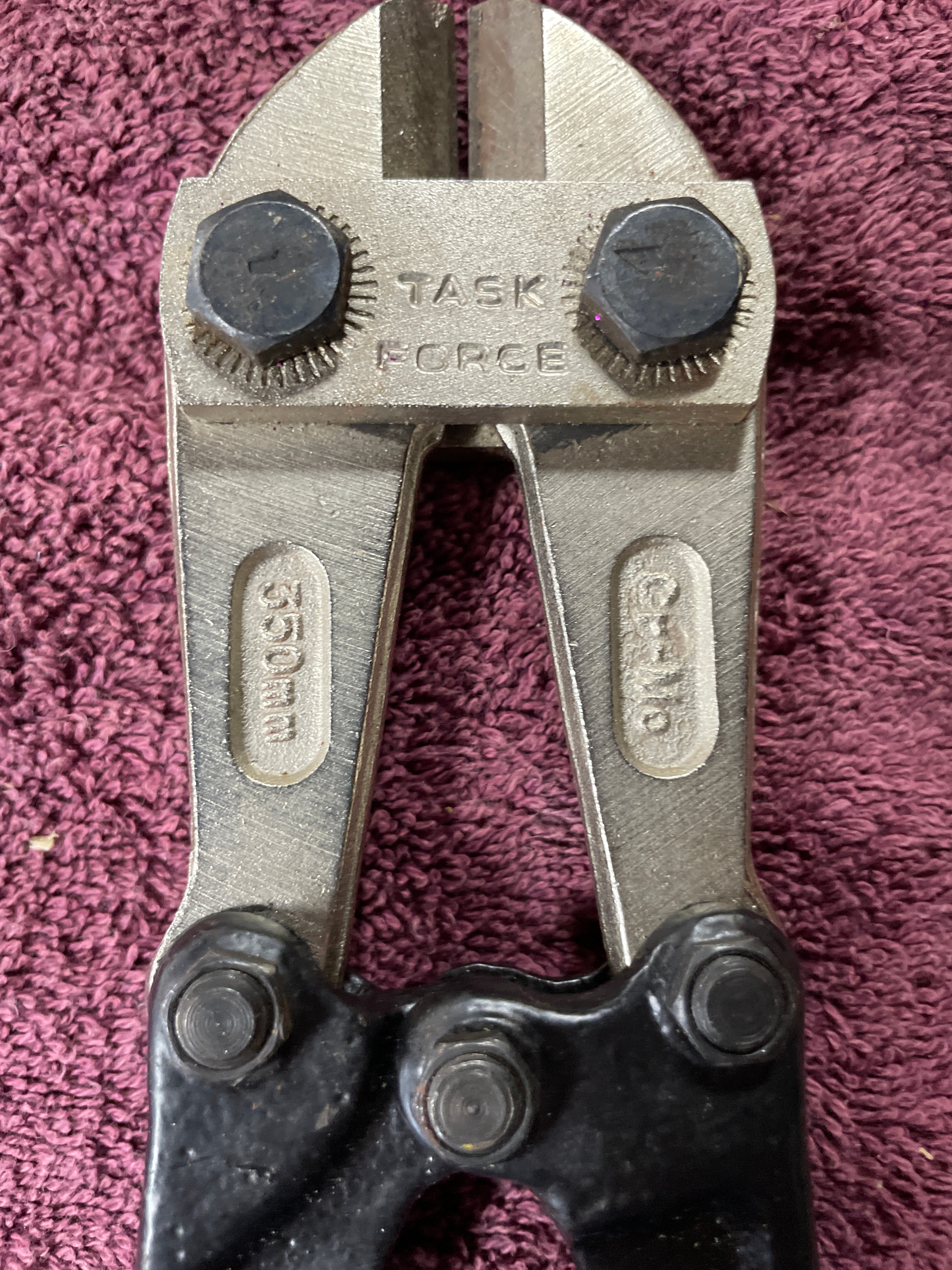 A black and silver-grey bolt cutter marked ‘TASK FORCE’, ‘550mm’, ‘CR-MO’, and ‘CHINA’.