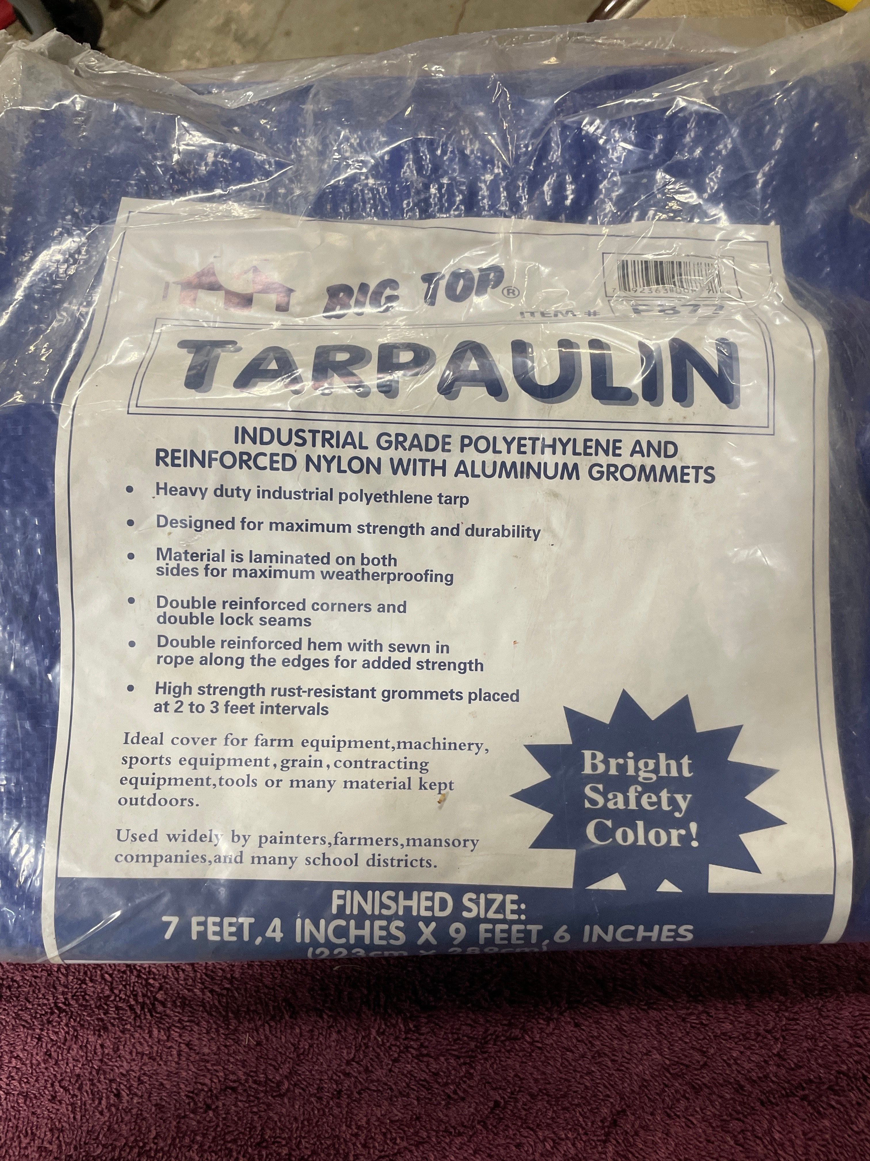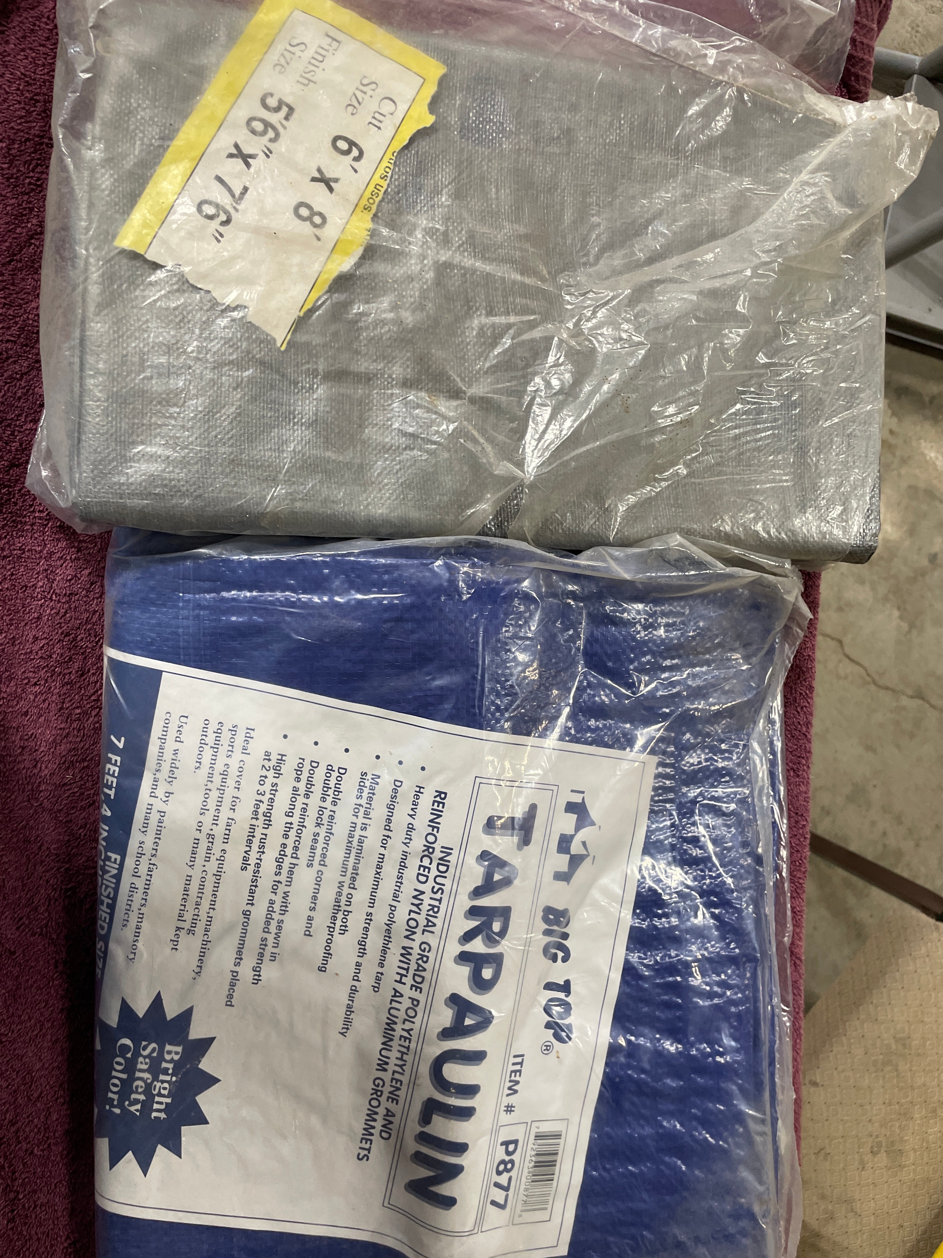 A pair of industrial grade polyethylene and reinforced nylon tarpaulins, one blue measuring 7 feet, 4 inches x 9 feet, 6 inches, and one grey measuring 5 feet, 6 inches x 7 feet, 6 inches.