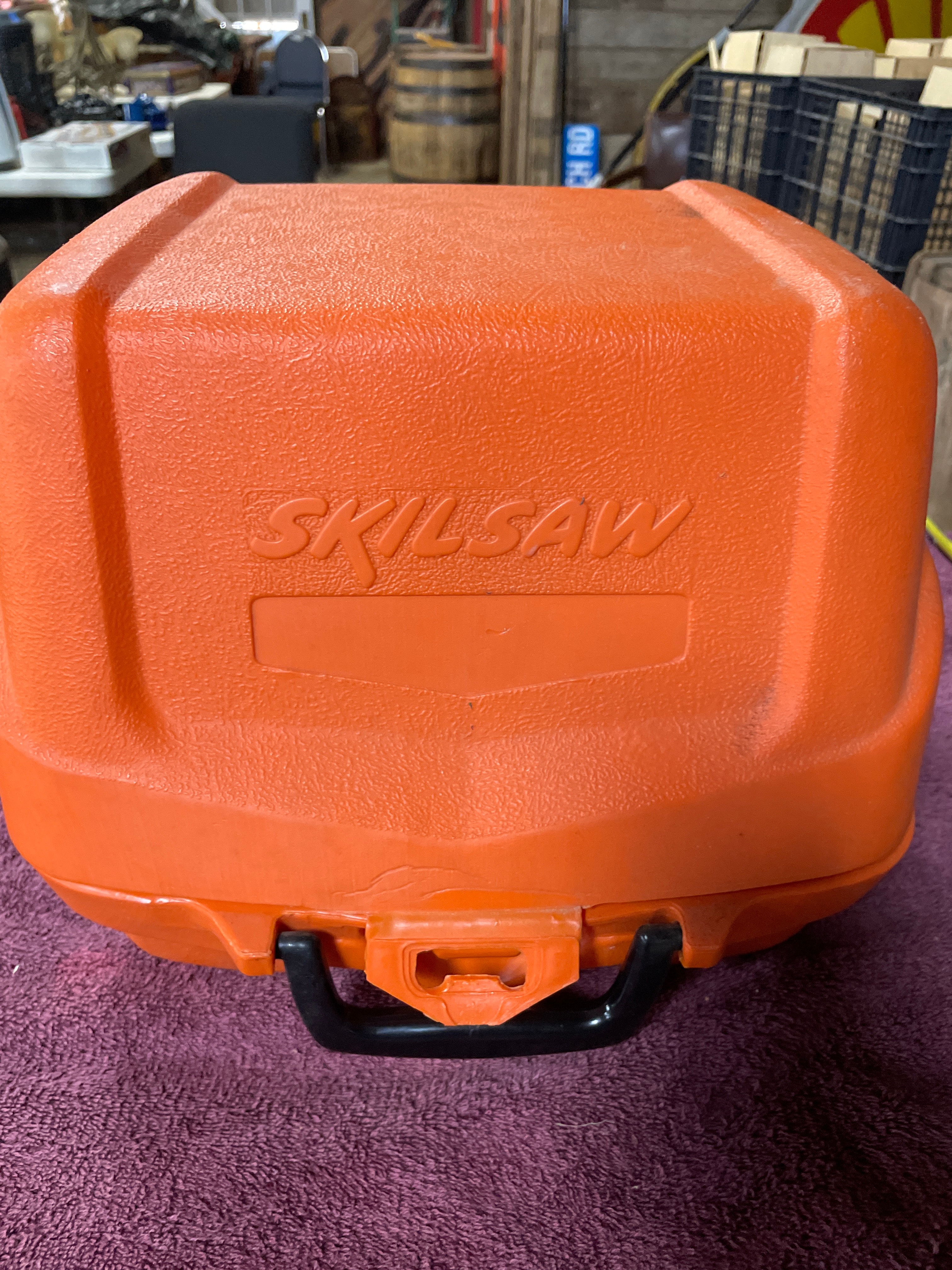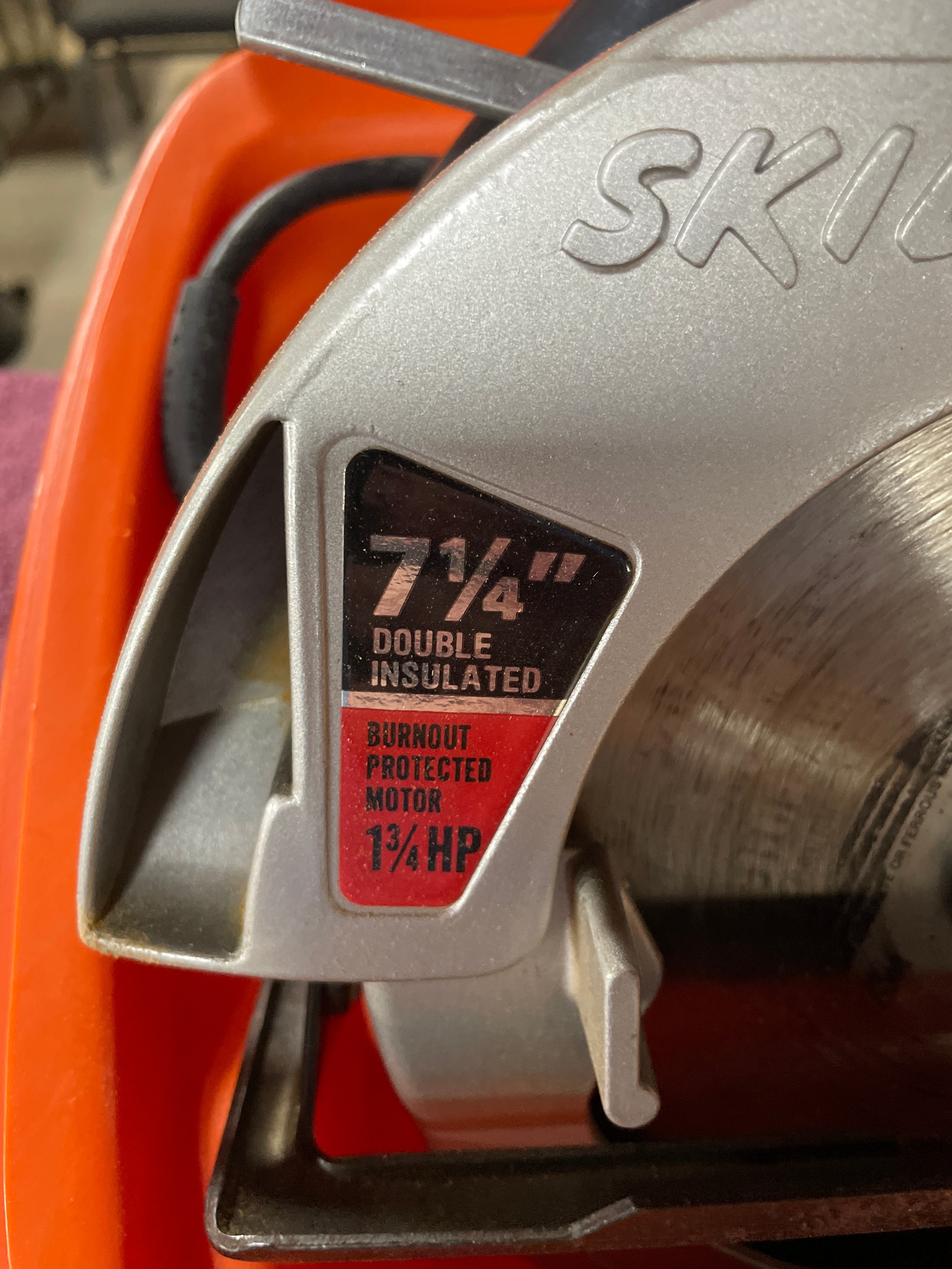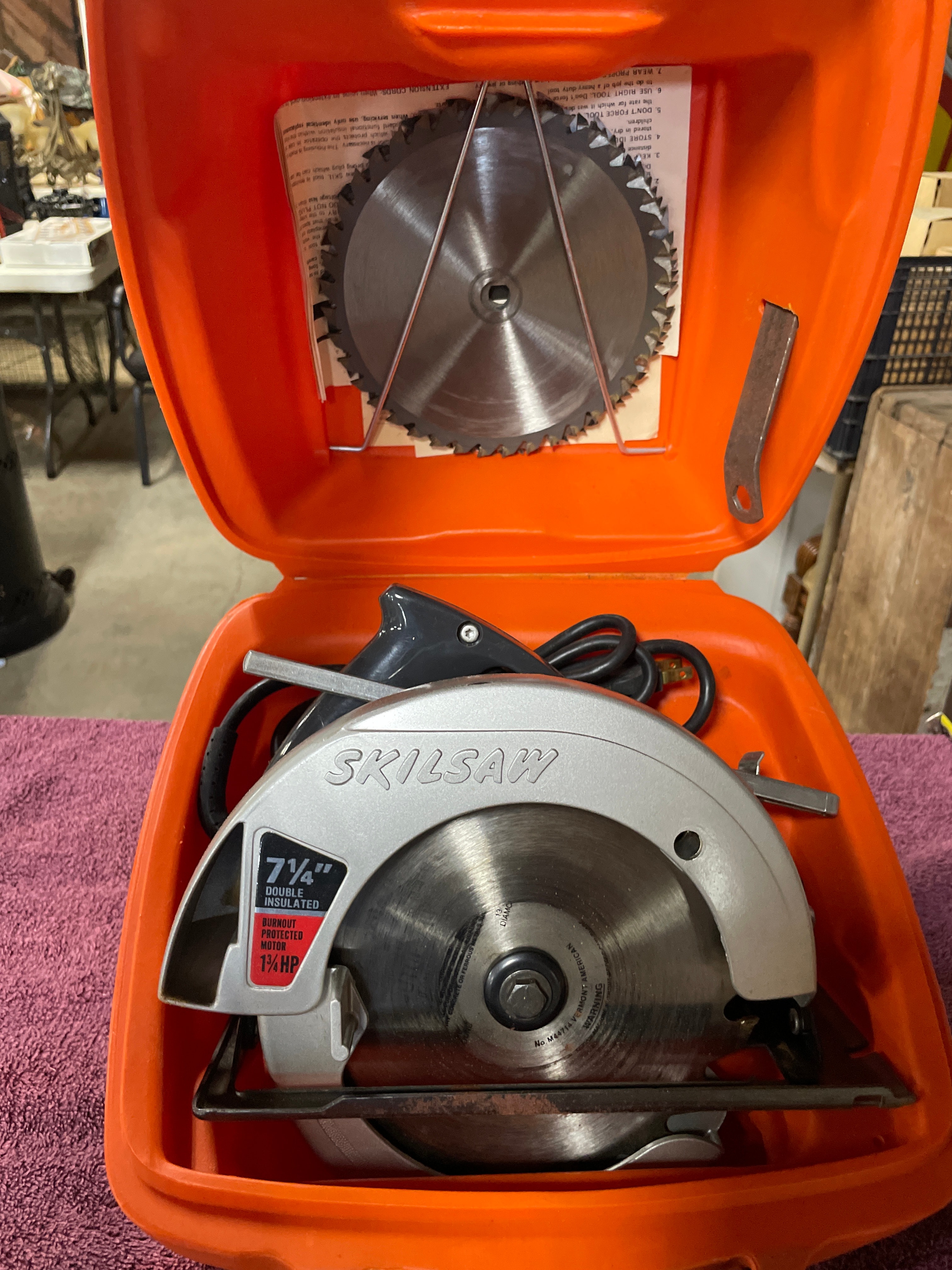 A silver-tone and black Skilsaw 7 1/4″ circular saw with a 1 3/4 HP ‘Burnout Protected Motor’ and ‘Double Insulated’ label, a spare metallic saw blade, and a metal rip fence, all housed within an orange ‘SKILSAW’ branded plastic carrying case.