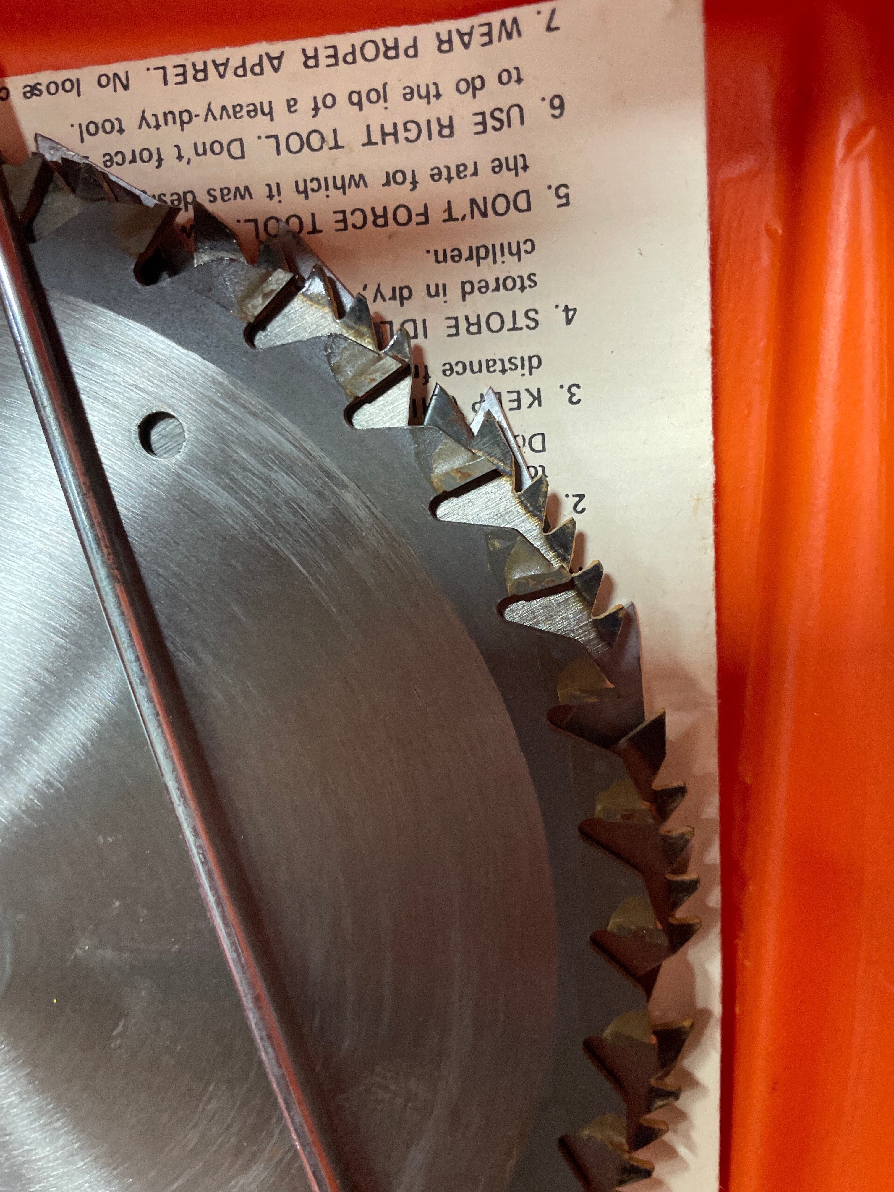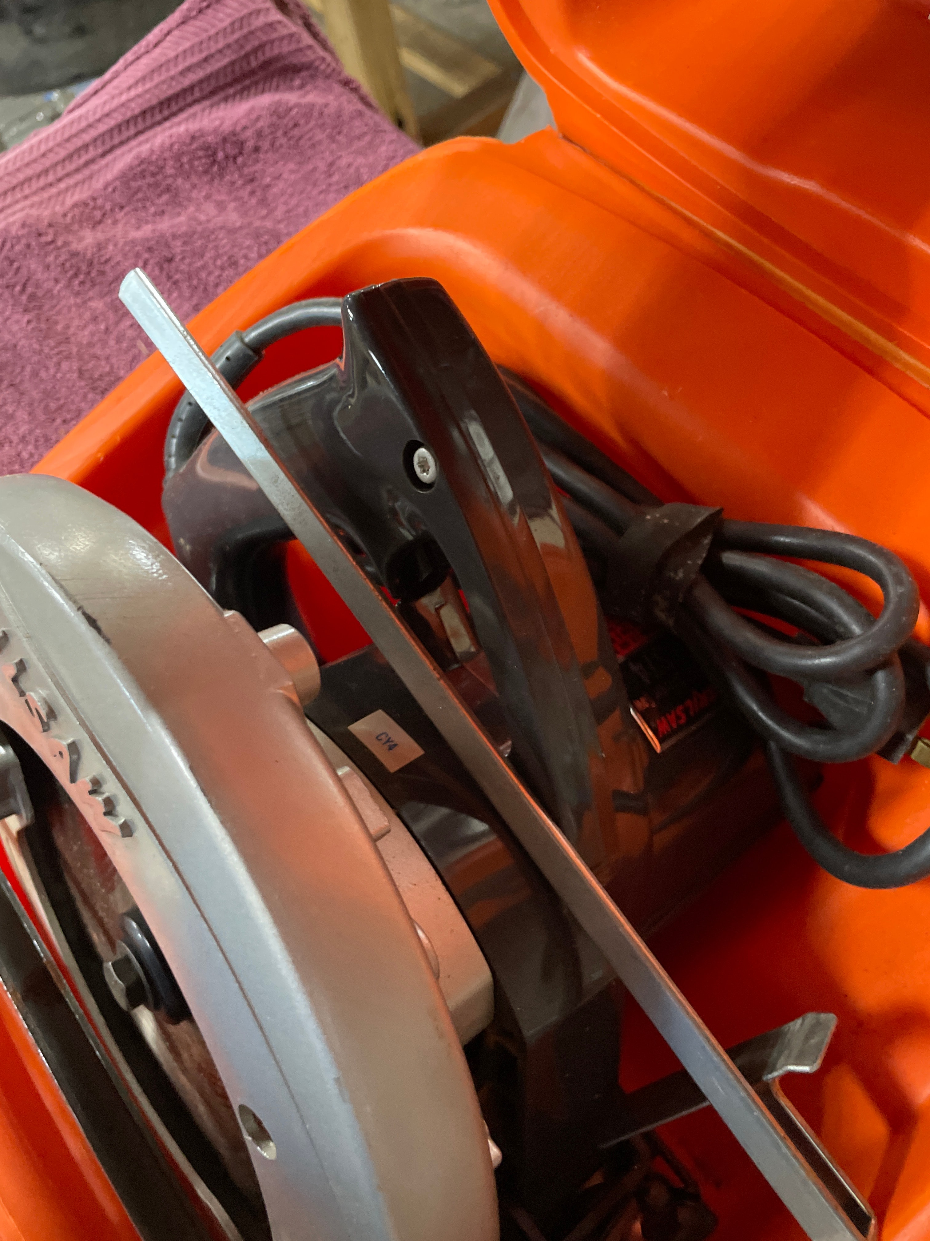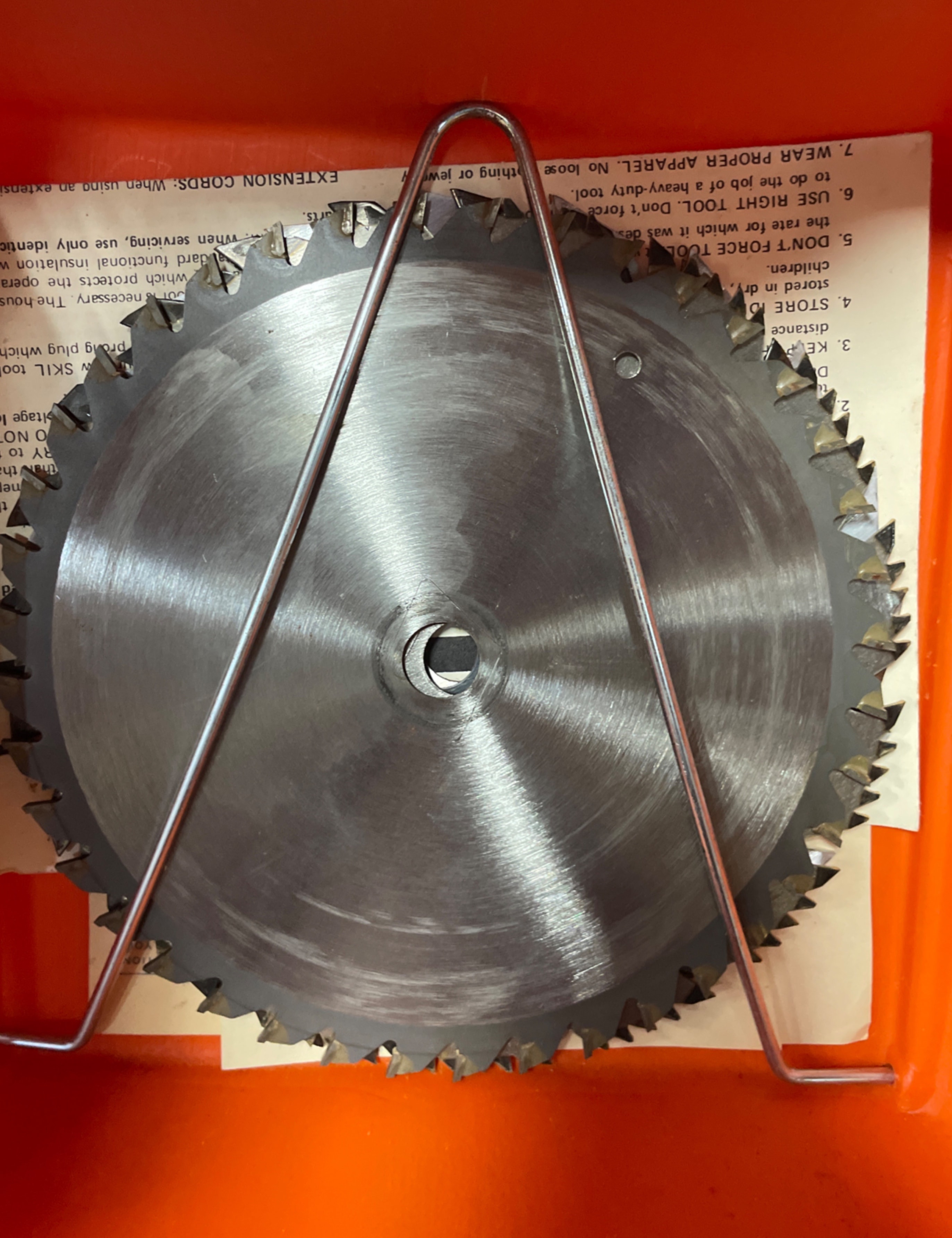 A silver-tone and black Skilsaw 7 1/4″ circular saw with a 1 3/4 HP ‘Burnout Protected Motor’ and ‘Double Insulated’ label, a spare metallic saw blade, and a metal rip fence, all housed within an orange ‘SKILSAW’ branded plastic carrying case.
