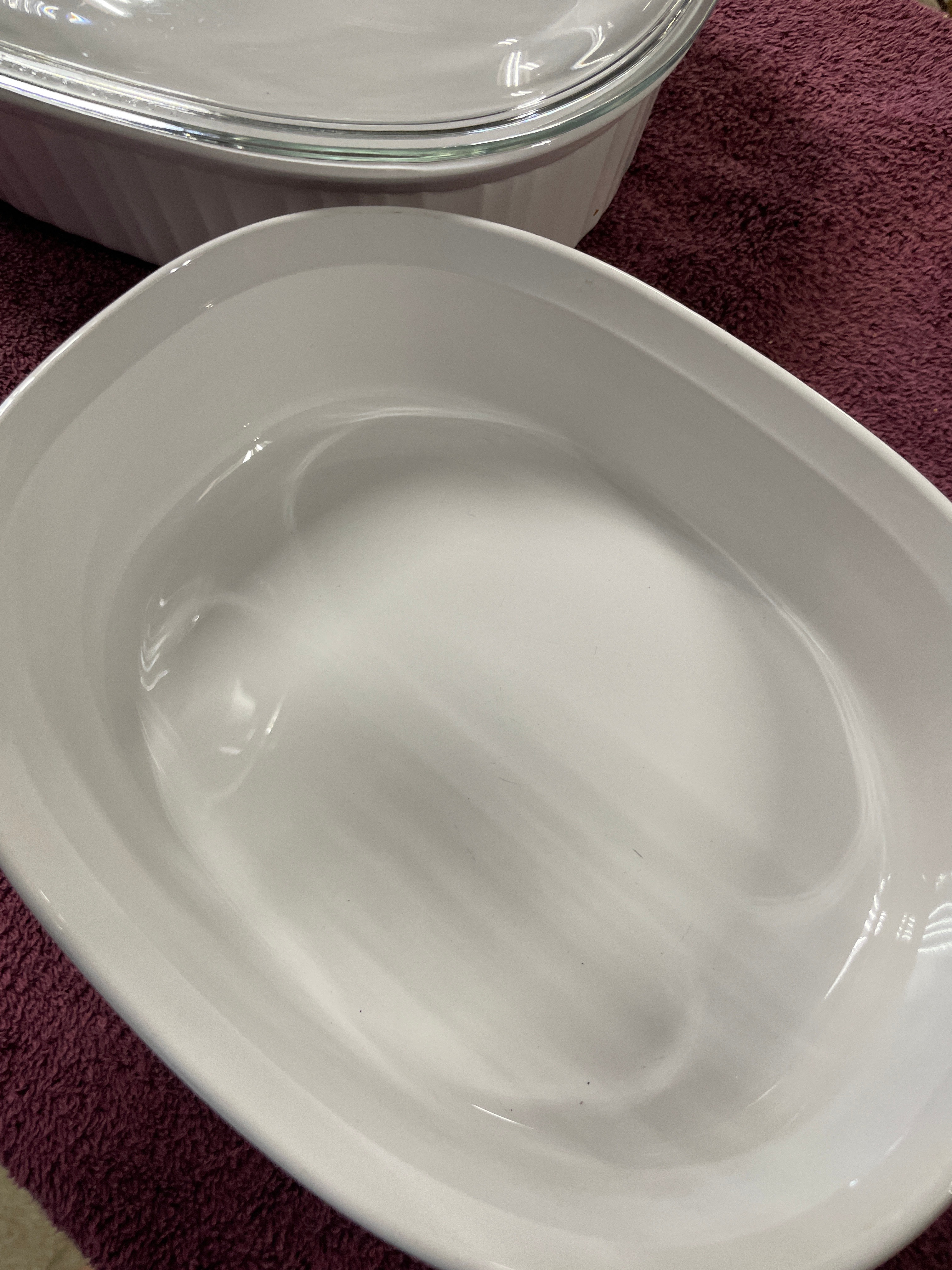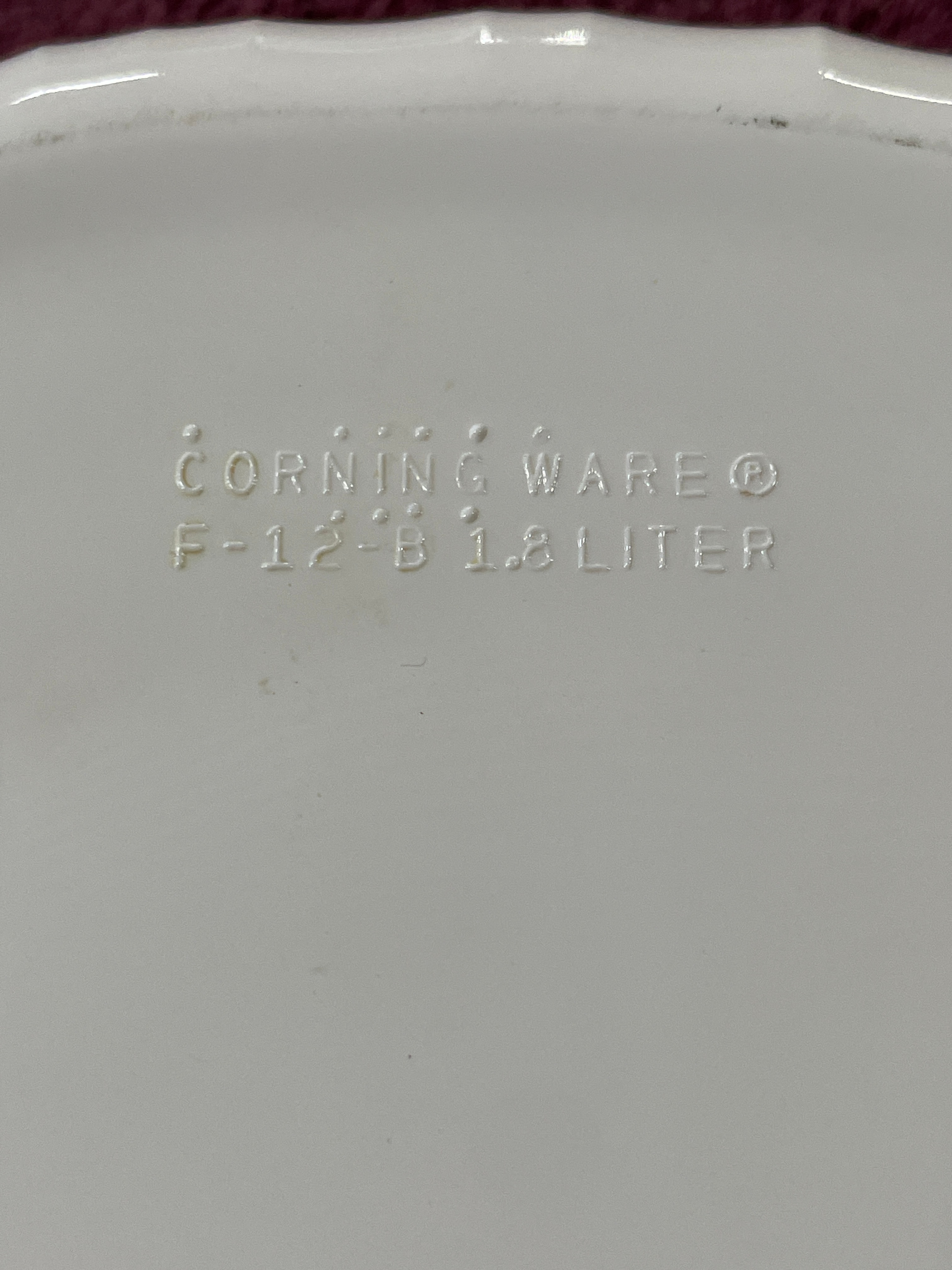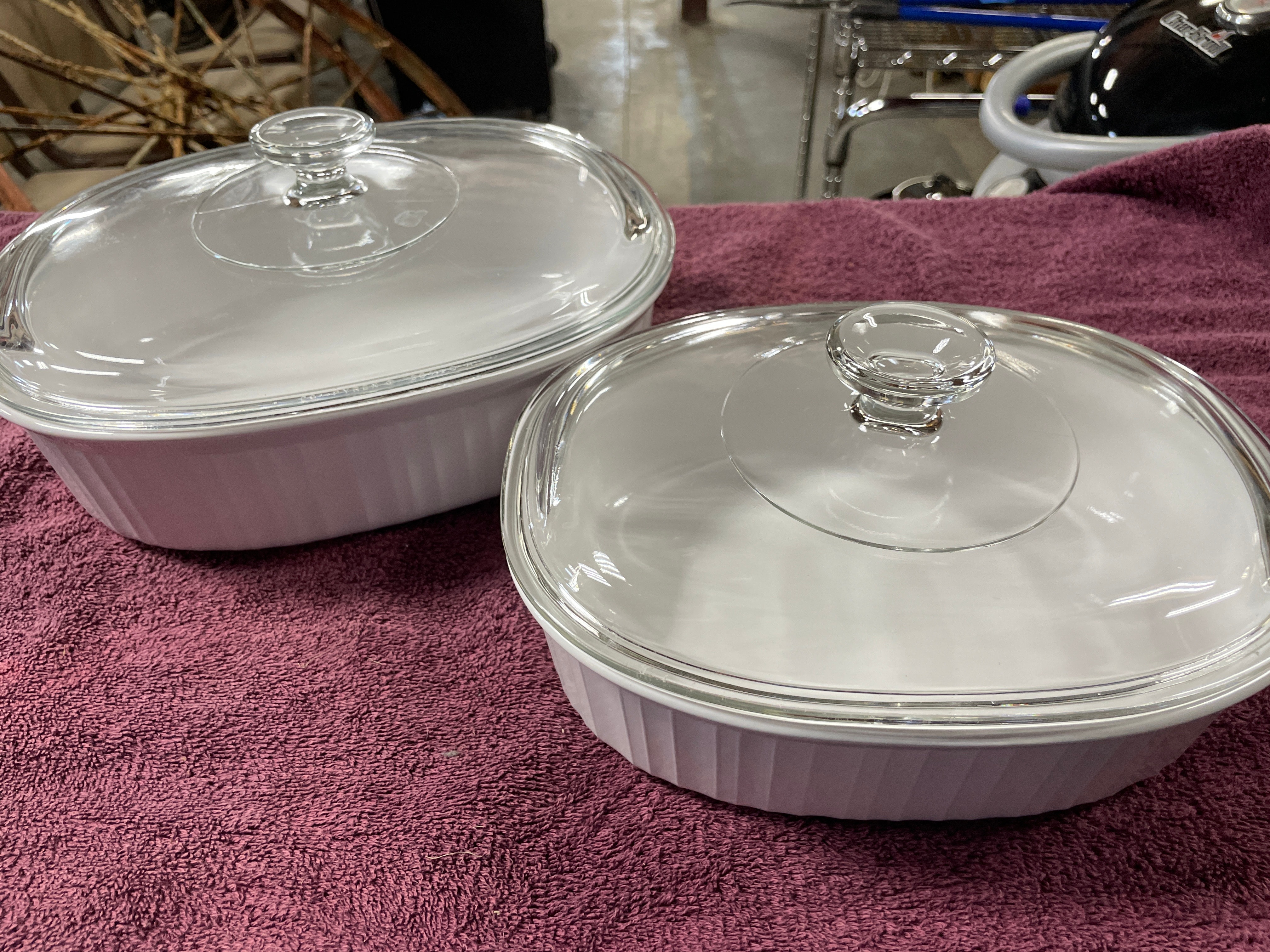 A pair of Corning Ware French White F-12-B oval covered casserole dishes. Each dish is crafted from white, opaque pyroceram with vertical fluting along its exterior sides. They are accompanied by clear glass lids, each featuring a central integrated glass knob handle. One dish base is clearly embossed ‘CORNING WARE® F-12-B 1.8 LITER’, and the glass lids bear partially obscured ‘PYREX’ markings along the rim. The 1.8-liter capacity is equivalent to approximately 1.9 quarts.