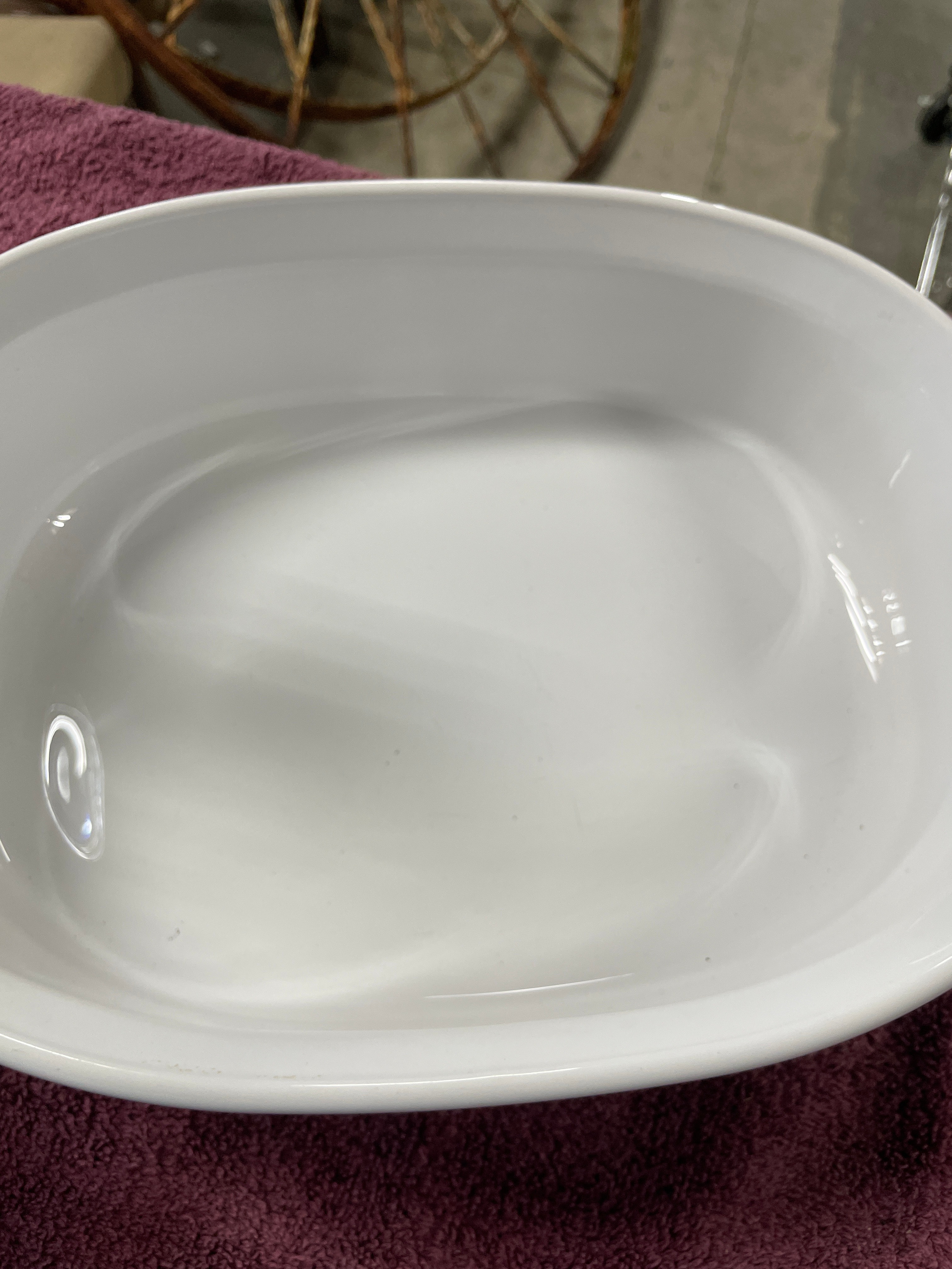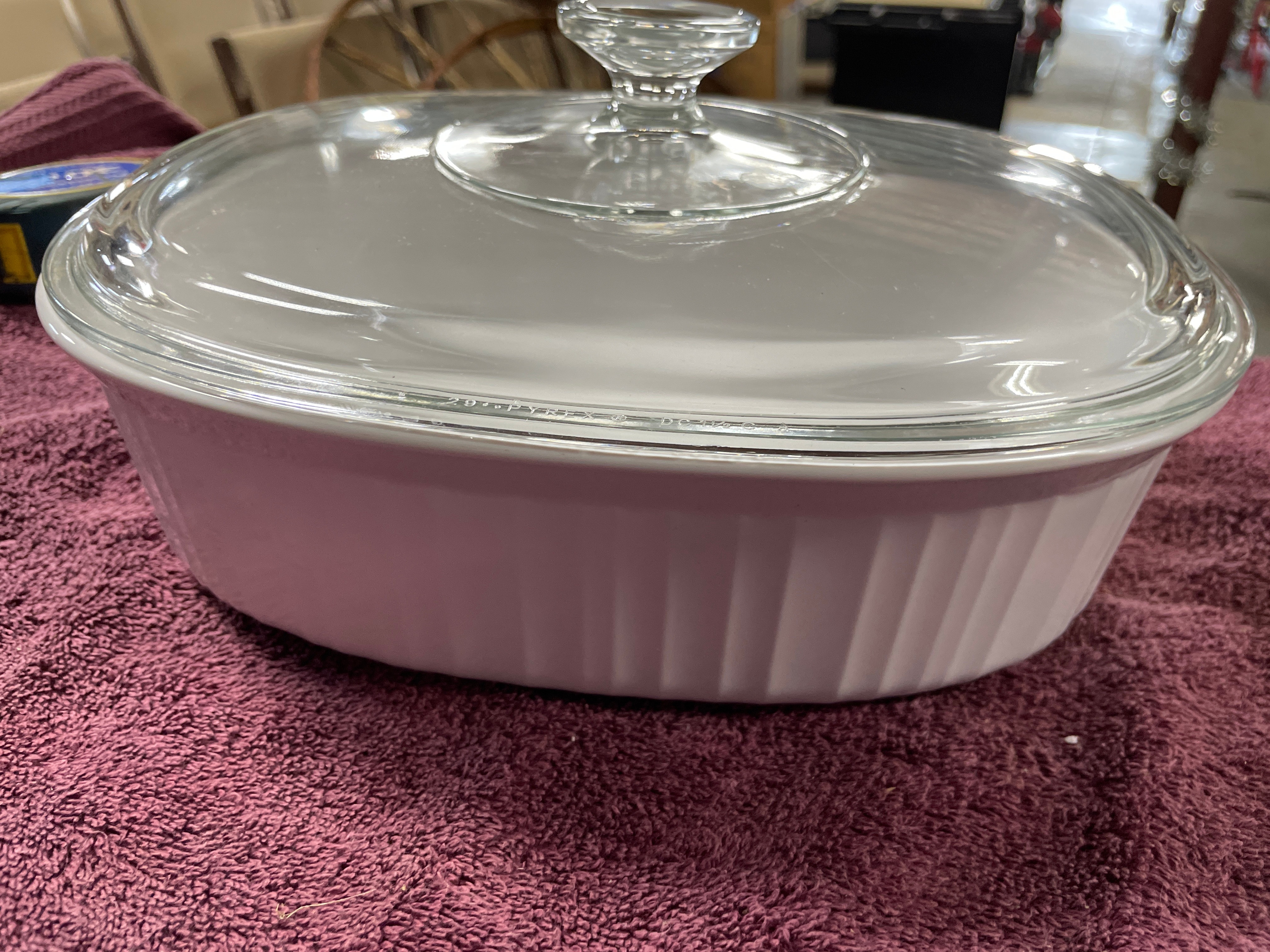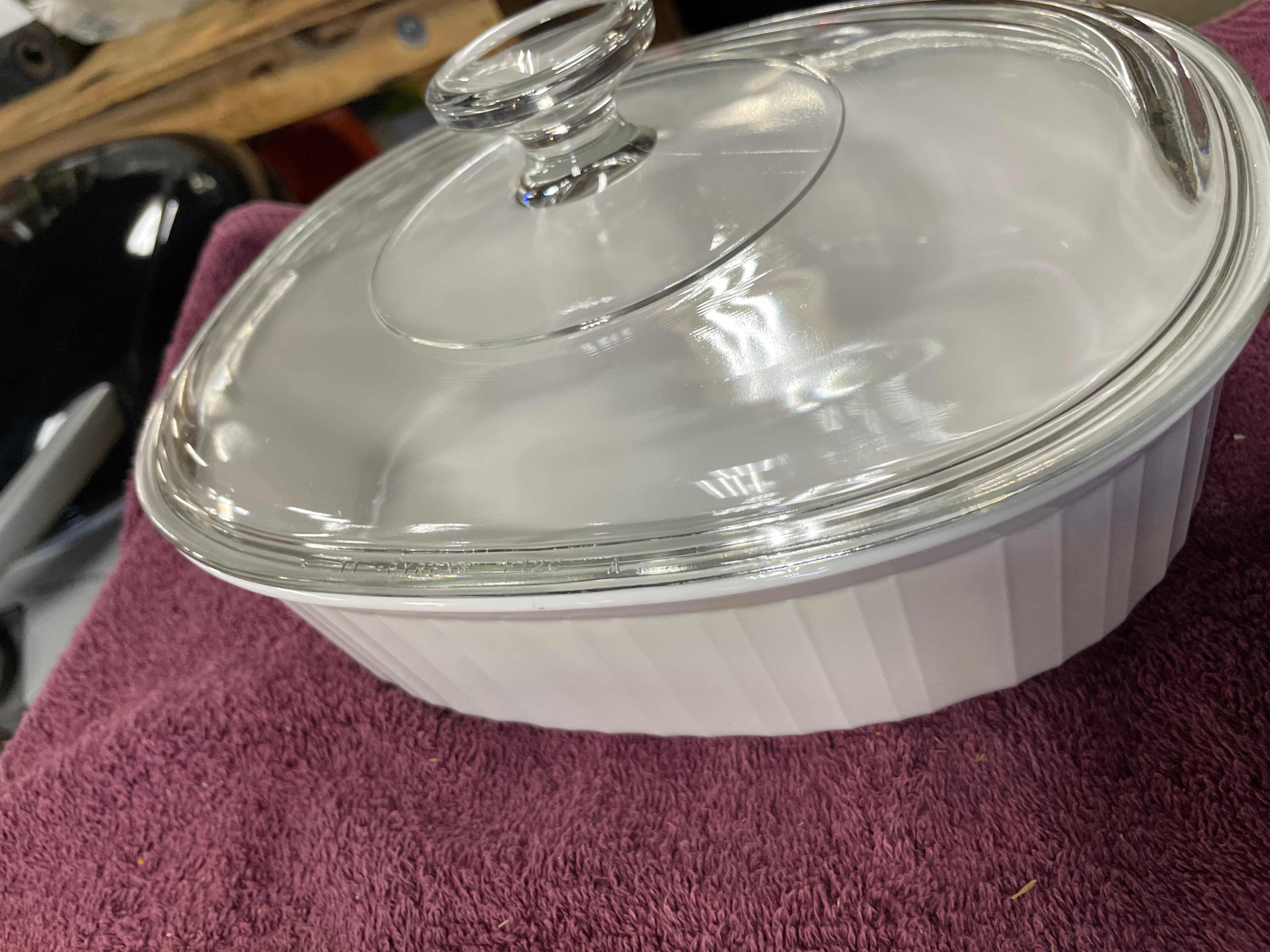 A pair of Corning Ware French White F-12-B oval covered casserole dishes. Each dish is crafted from white, opaque pyroceram with vertical fluting along its exterior sides. They are accompanied by clear glass lids, each featuring a central integrated glass knob handle. One dish base is clearly embossed ‘CORNING WARE® F-12-B 1.8 LITER’, and the glass lids bear partially obscured ‘PYREX’ markings along the rim. The 1.8-liter capacity is equivalent to approximately 1.9 quarts.